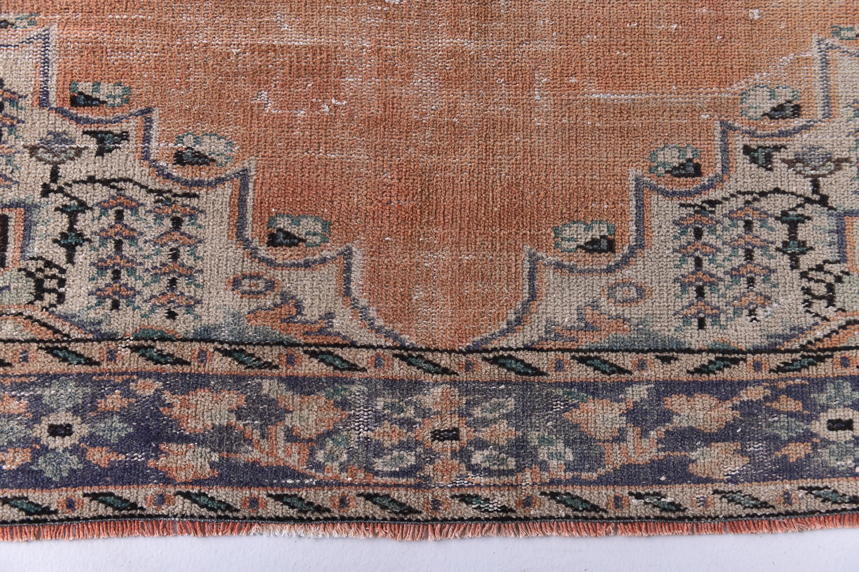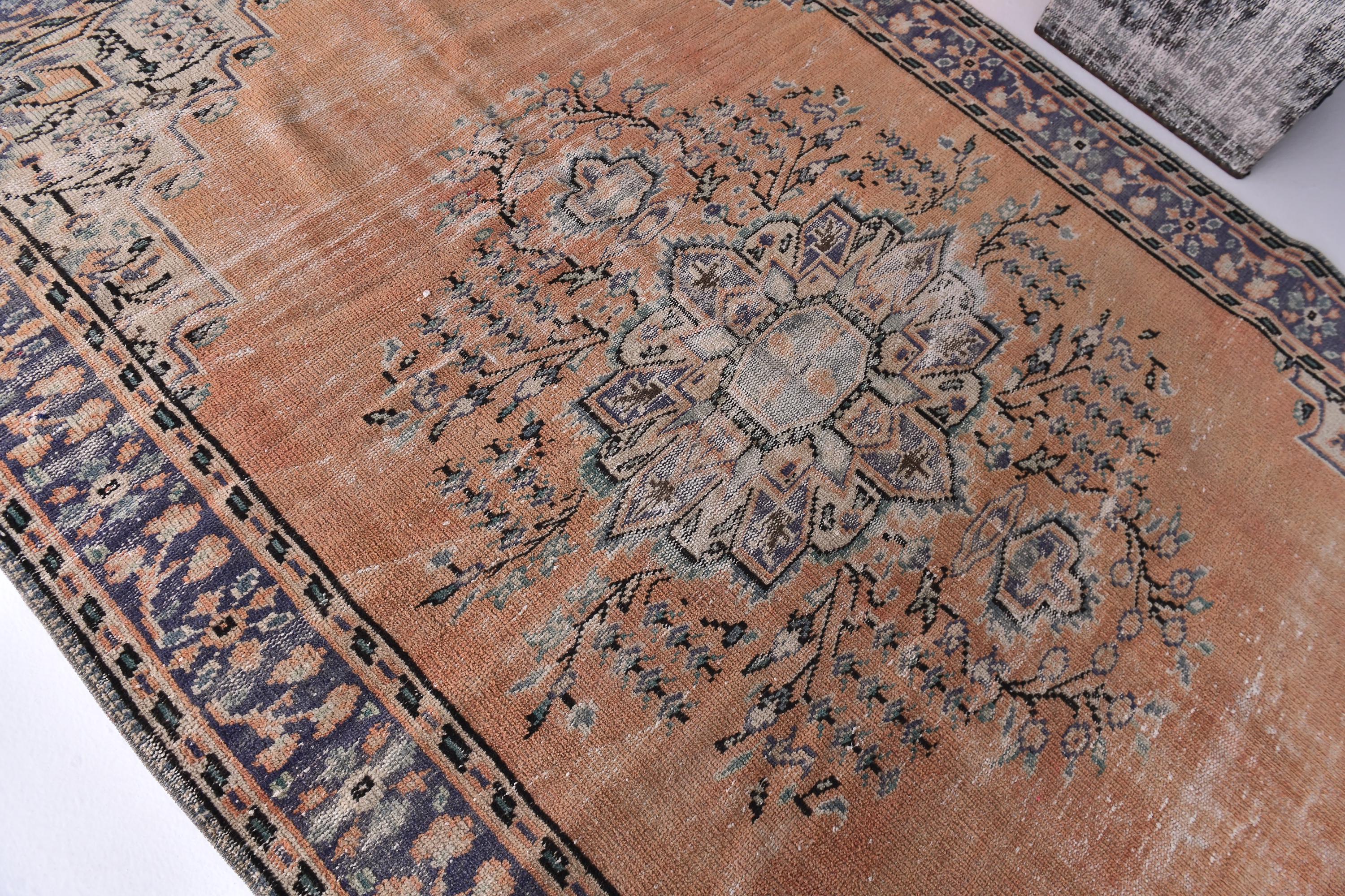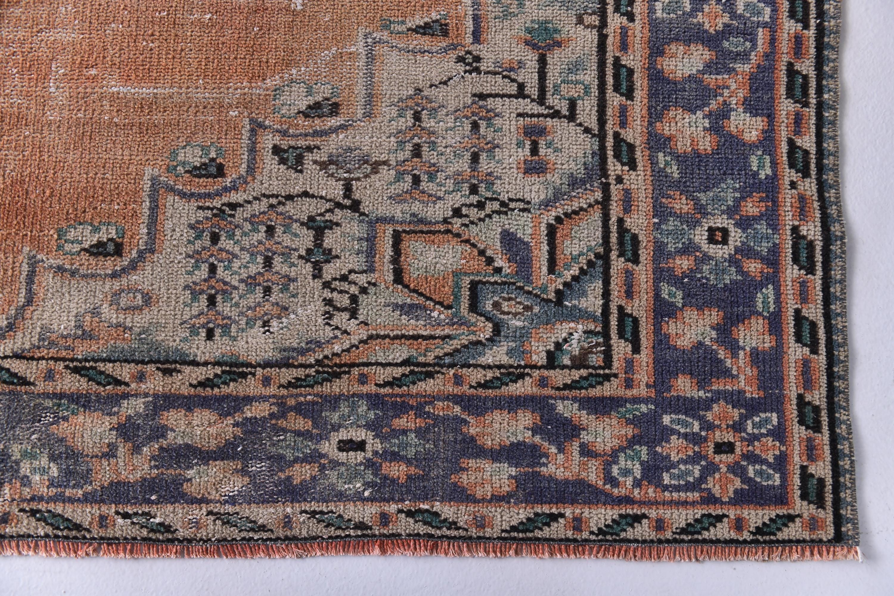 📜📌Antique Anatolian area rug in faded salmon and peach tones with central geometric medallion pattern in navy blue and cream. Hand-woven wool construction shows authentic vintage distressing and natural patina. Features traditional Turkish border designs with floral and geometric elements. Ideal statement piece for living rooms, bedrooms, or dining spaces with boho or vintage aesthetic.