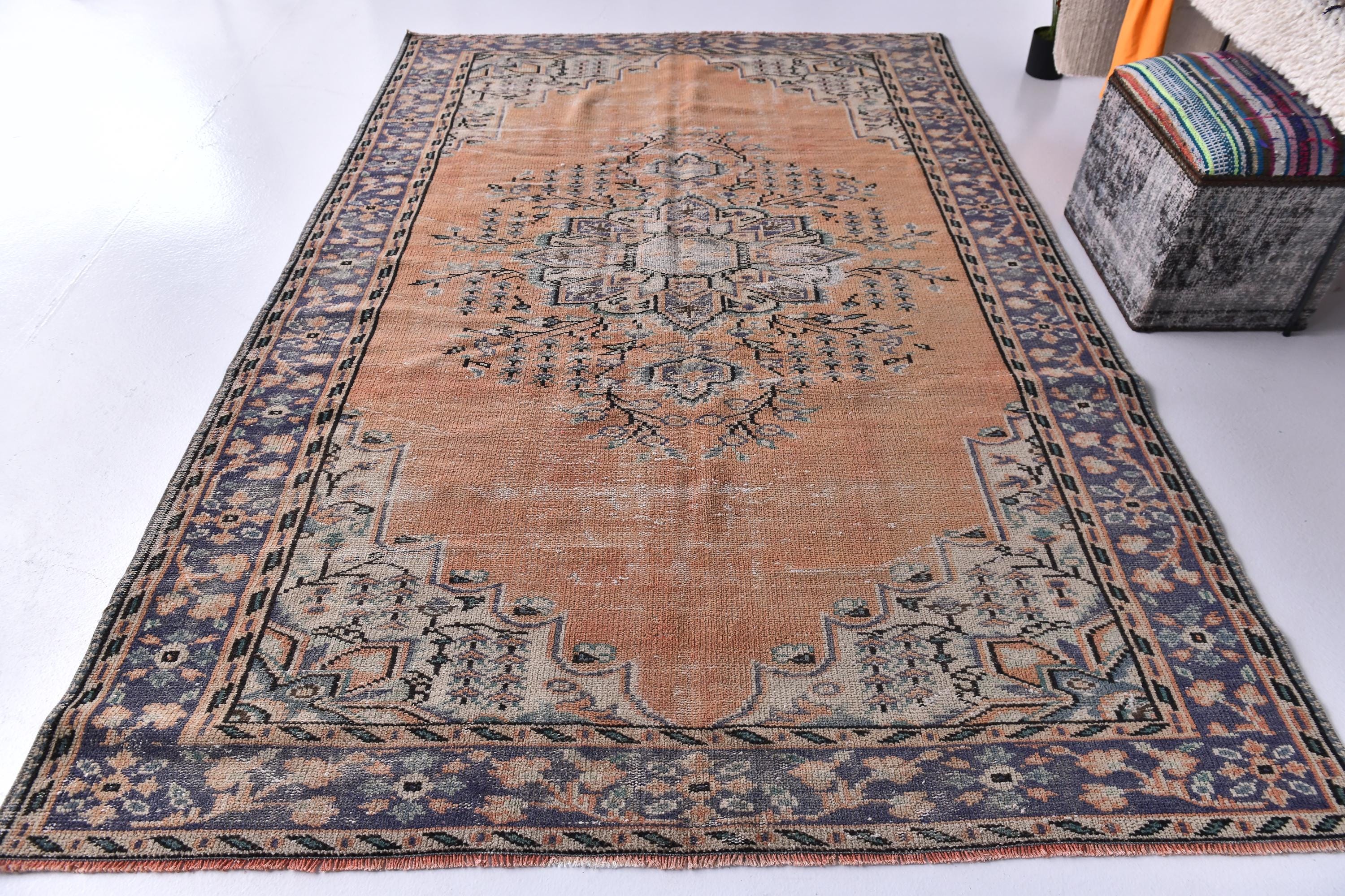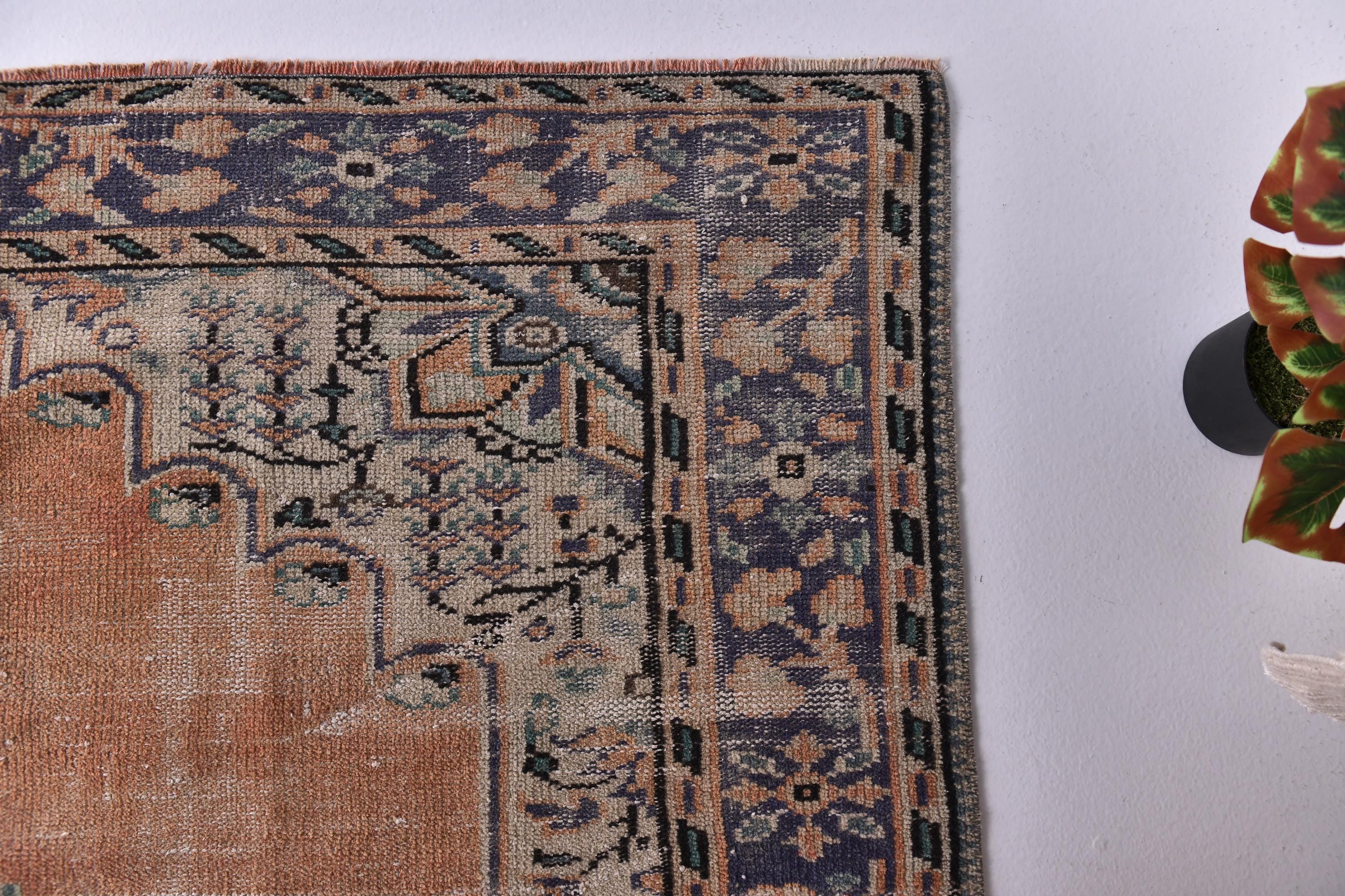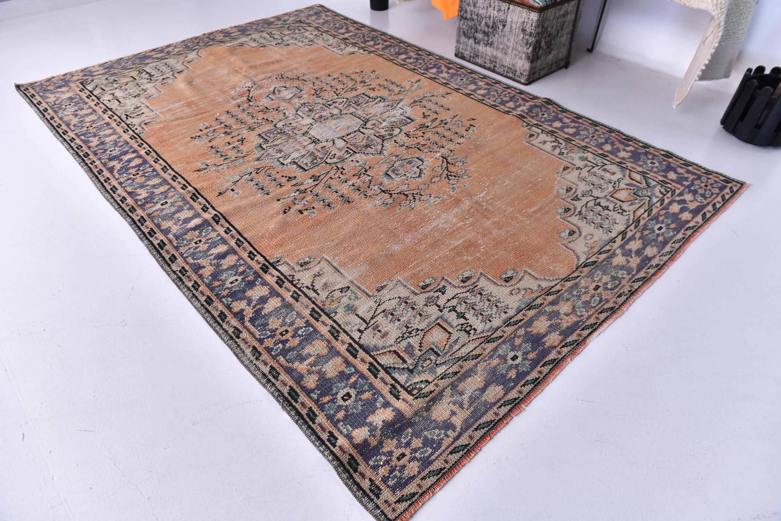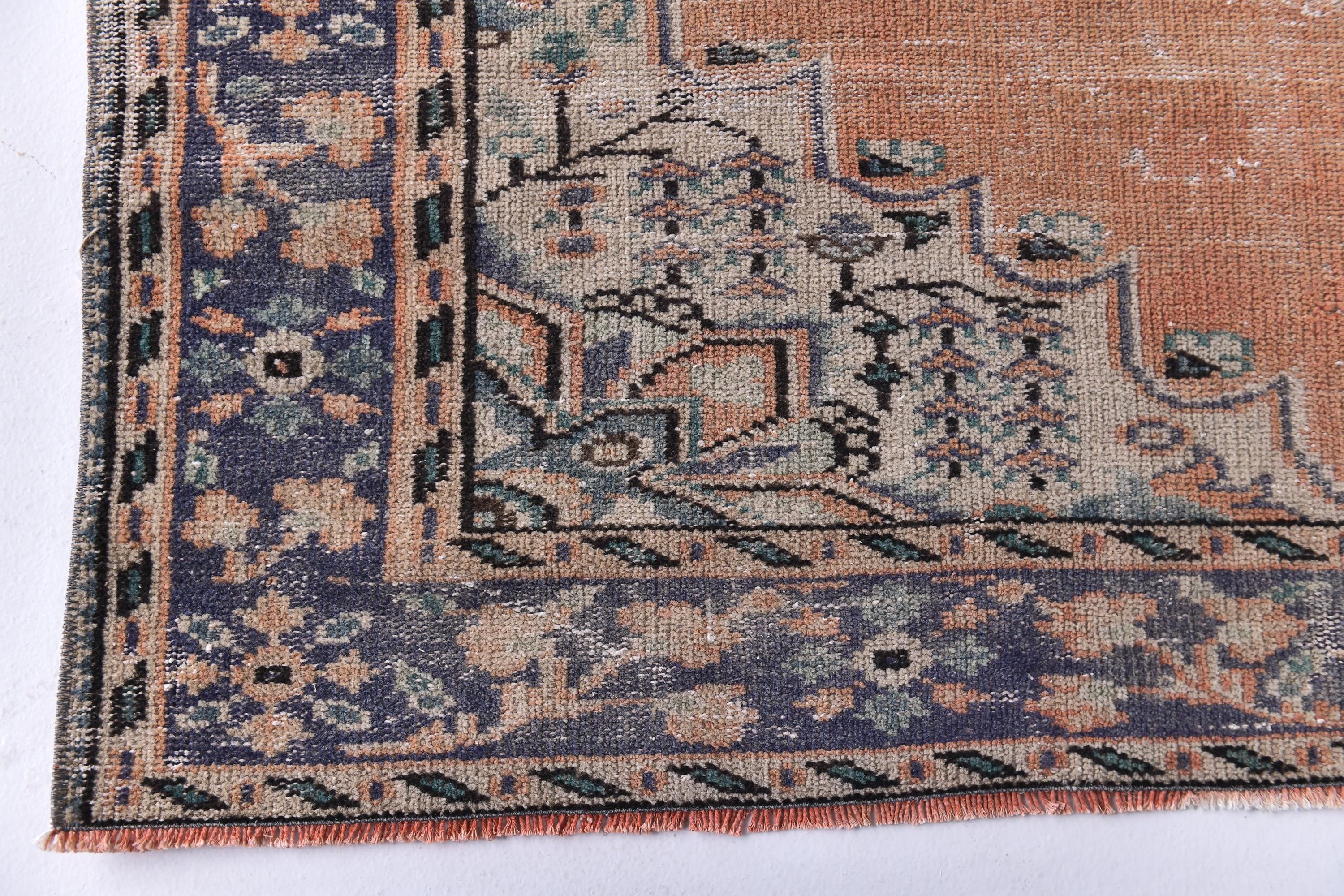 📜📌Antique Anatolian area rug in faded salmon and peach tones with central geometric medallion pattern in navy blue and cream. Hand-woven wool construction shows authentic vintage distressing and natural patina. Features traditional Turkish border designs with floral and geometric elements. Ideal statement piece for living rooms, bedrooms, or dining spaces with boho or vintage aesthetic.