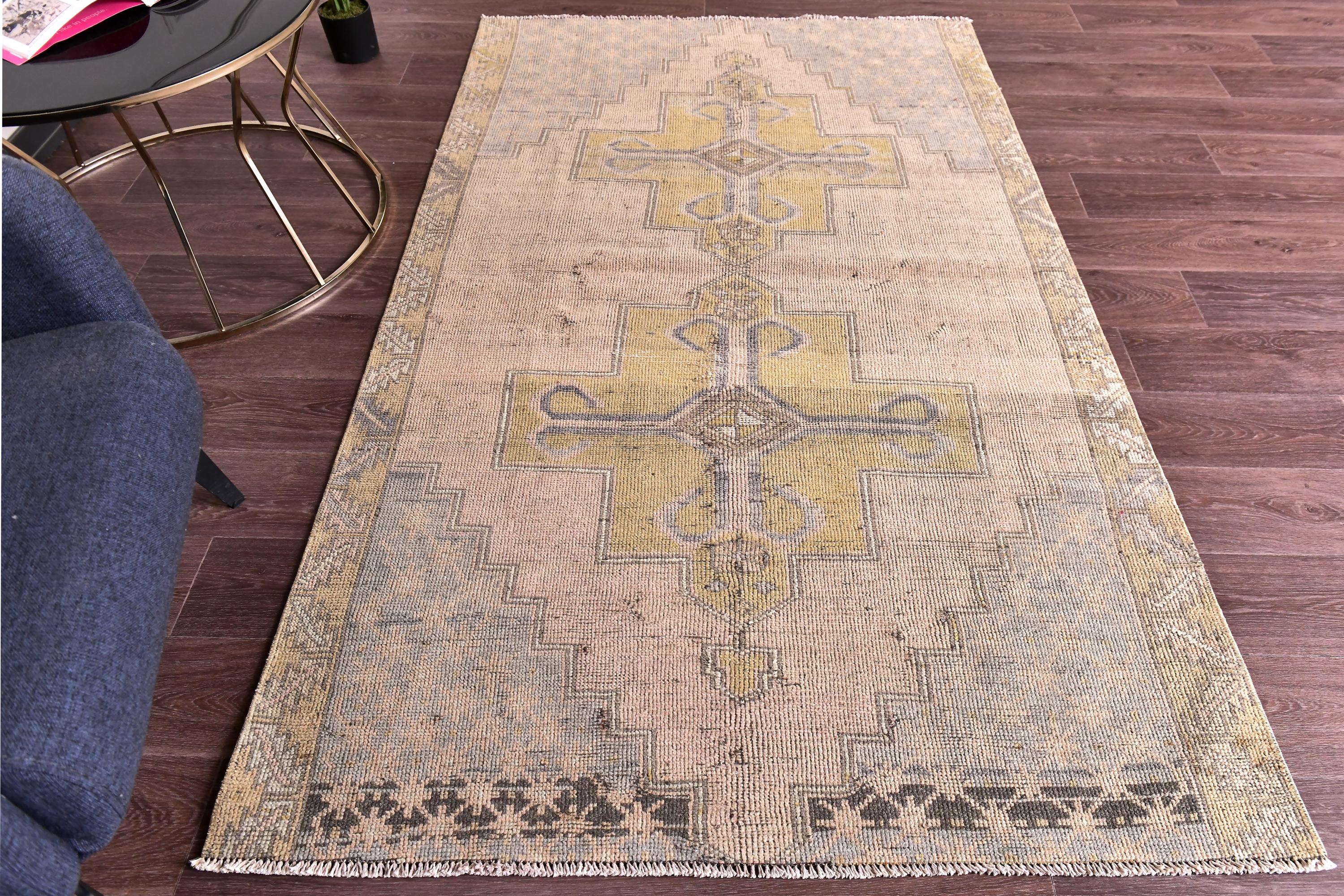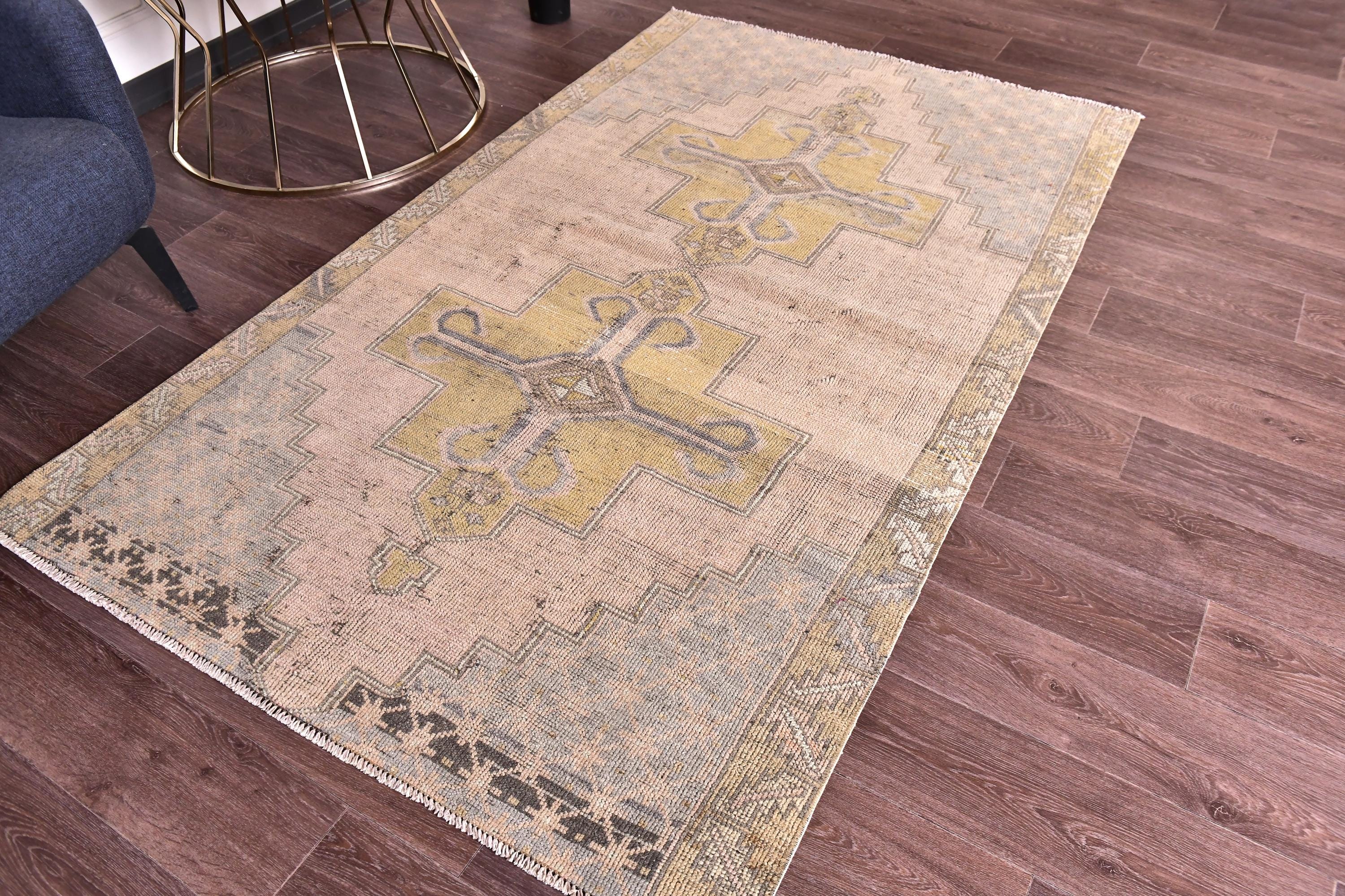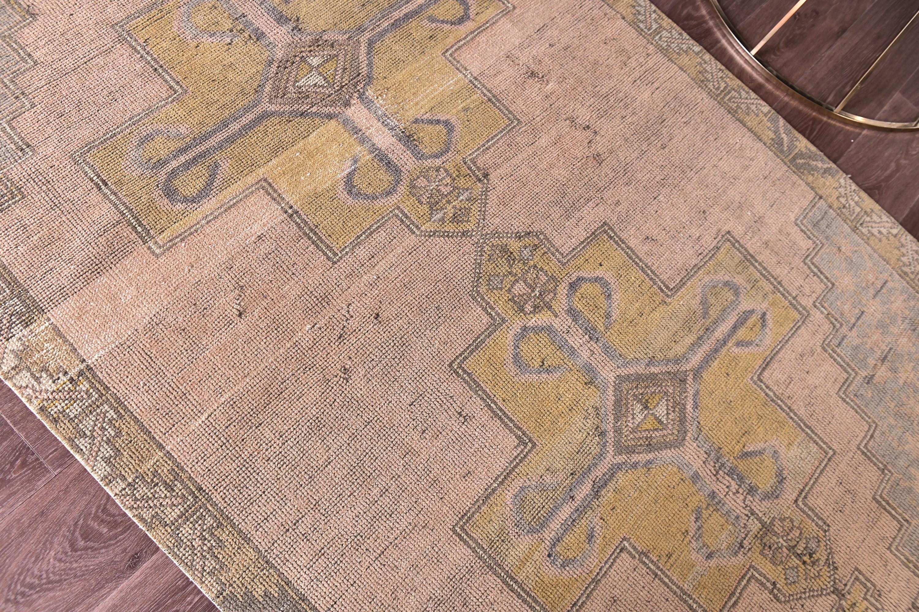 📜📌 Antique hand-woven Anatolian area rug in warm neutral palette of beige, tan, soft yellow, and gray tones. Features three geometric medallions aligned in traditional Turkish style with extremely faded, distressed appearance creating subtle pattern on light ground. Wool pile shows authentic vintage wear with low-profile texture ideal for layering or standalone statement. Versatile neutral colors complement contemporary, transitional, or eclectic décor styles while adding handcrafted character and warmth.