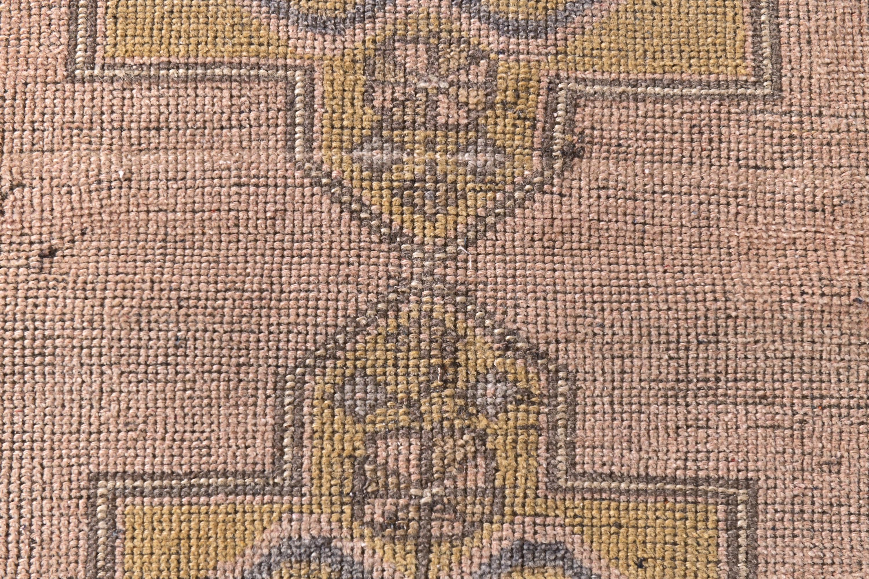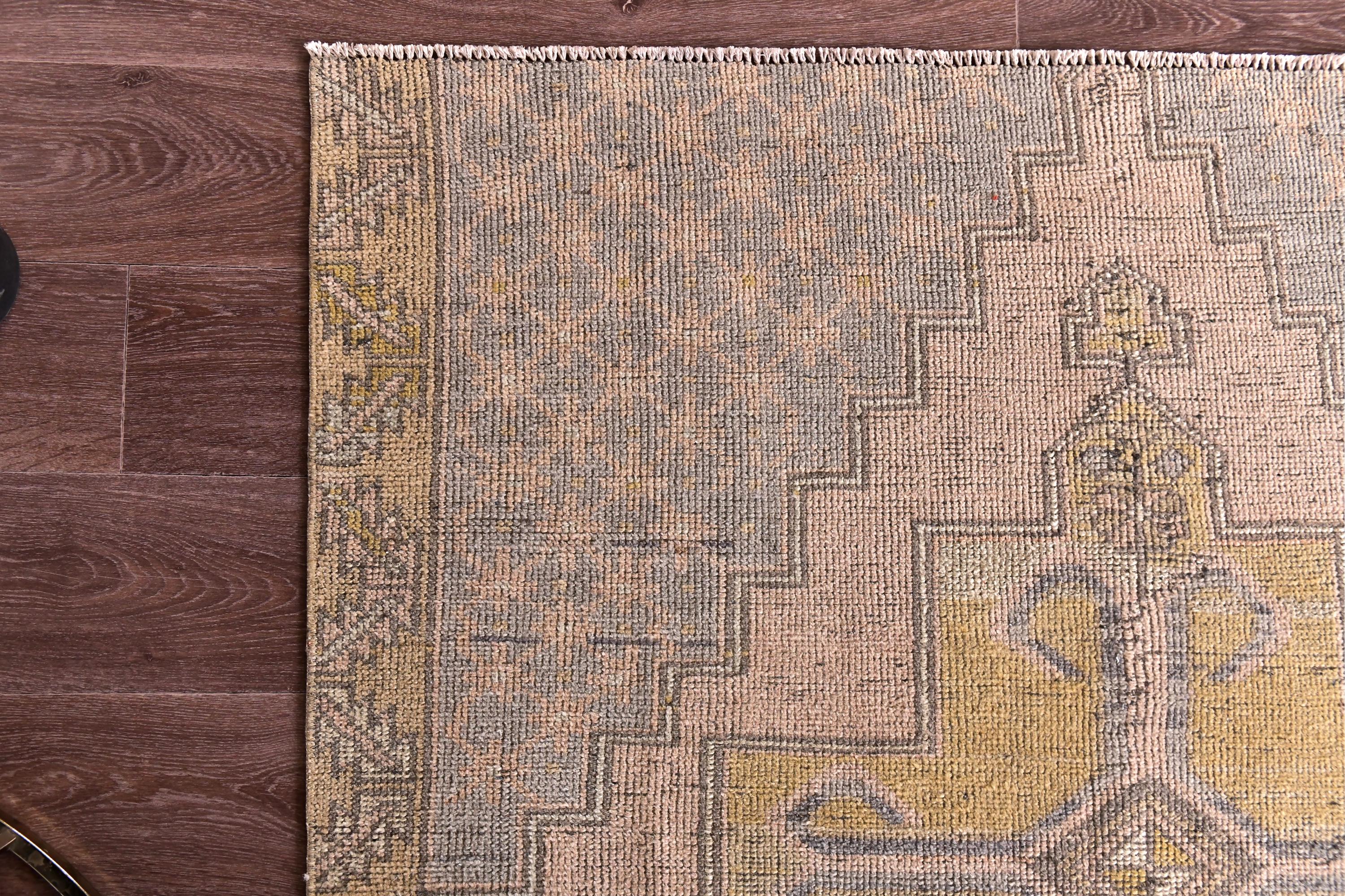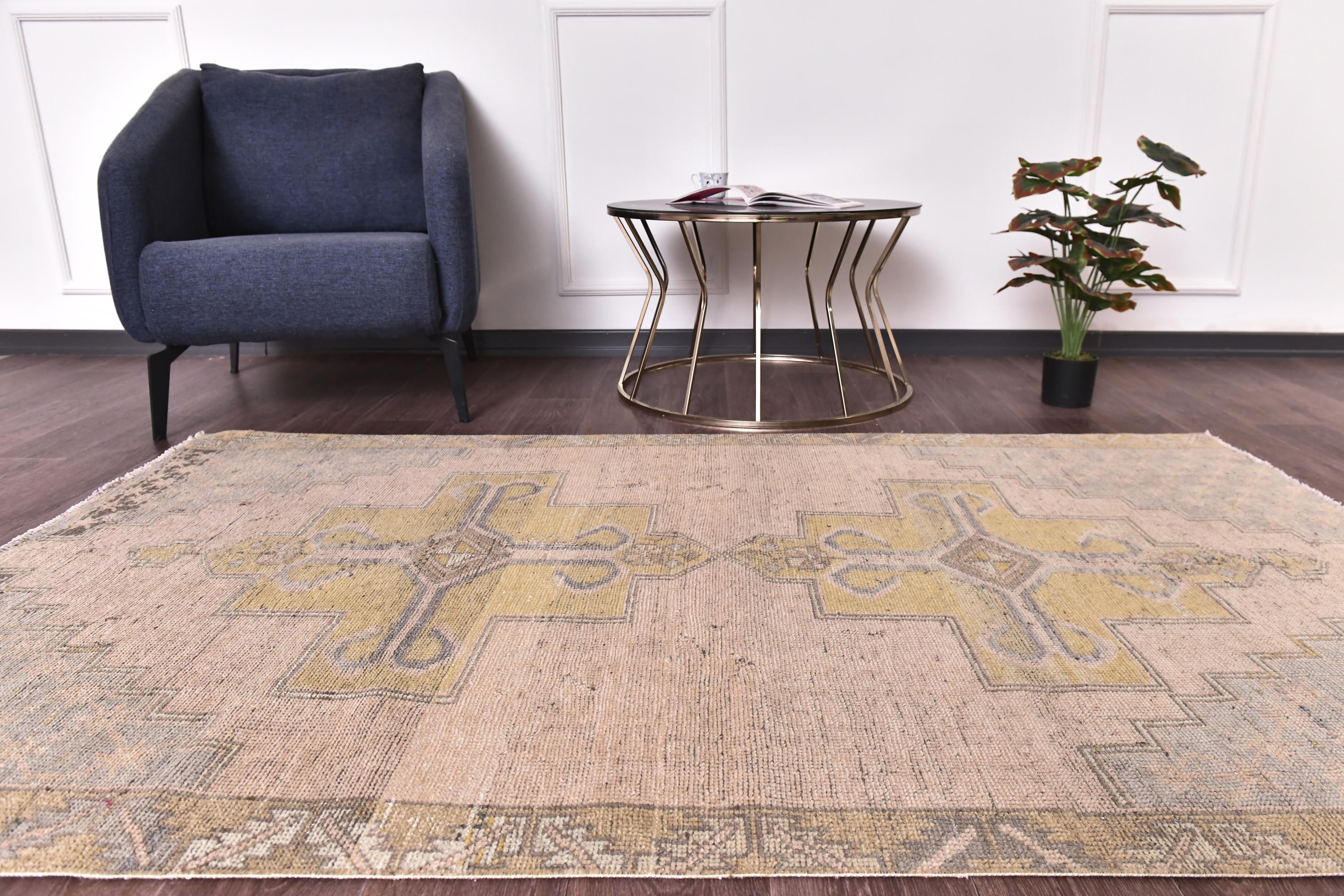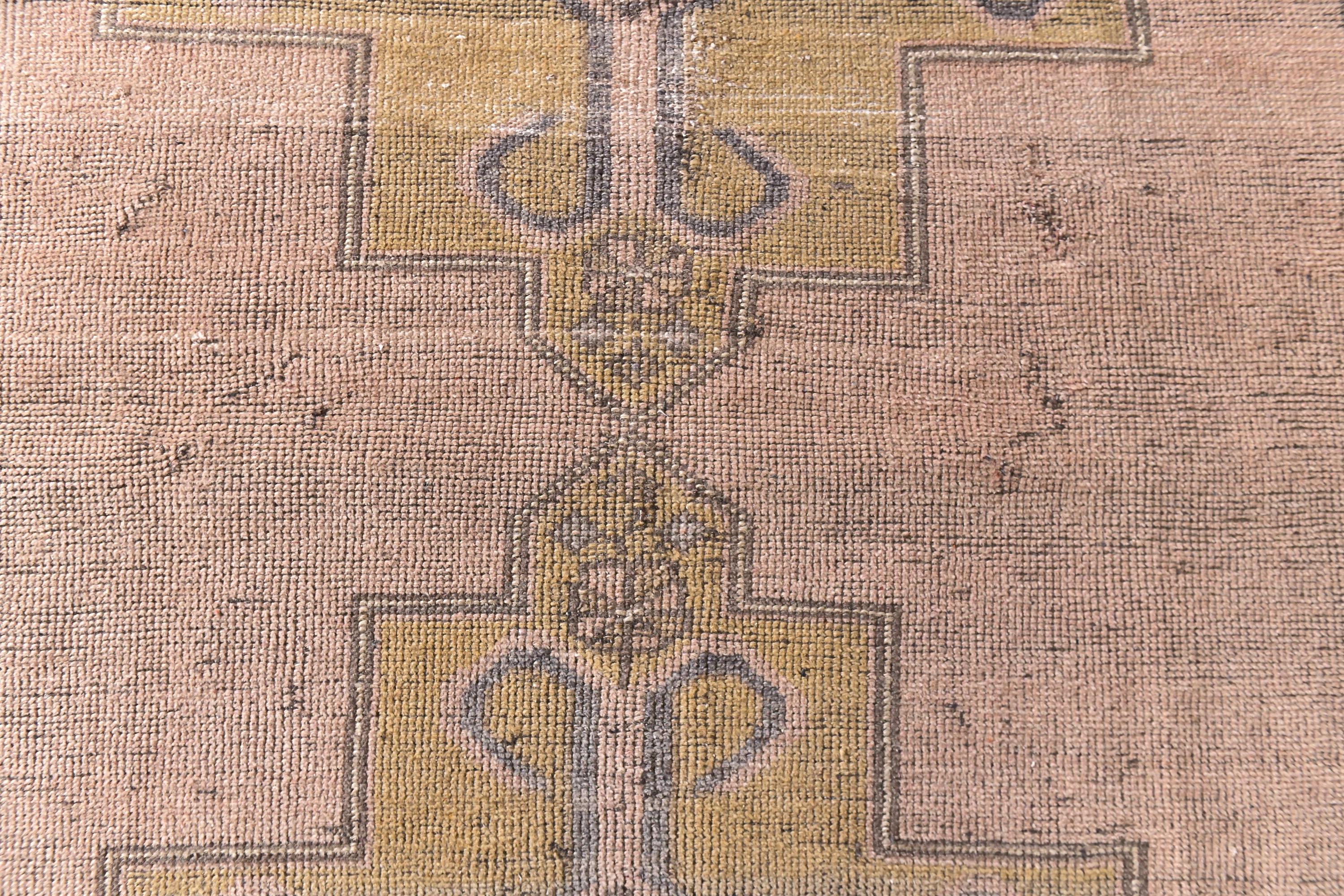 📜📌 Antique hand-woven Anatolian area rug in warm neutral palette of beige, tan, soft yellow, and gray tones. Features three geometric medallions aligned in traditional Turkish style with extremely faded, distressed appearance creating subtle pattern on light ground. Wool pile shows authentic vintage wear with low-profile texture ideal for layering or standalone statement. Versatile neutral colors complement contemporary, transitional, or eclectic décor styles while adding handcrafted character and warmth.