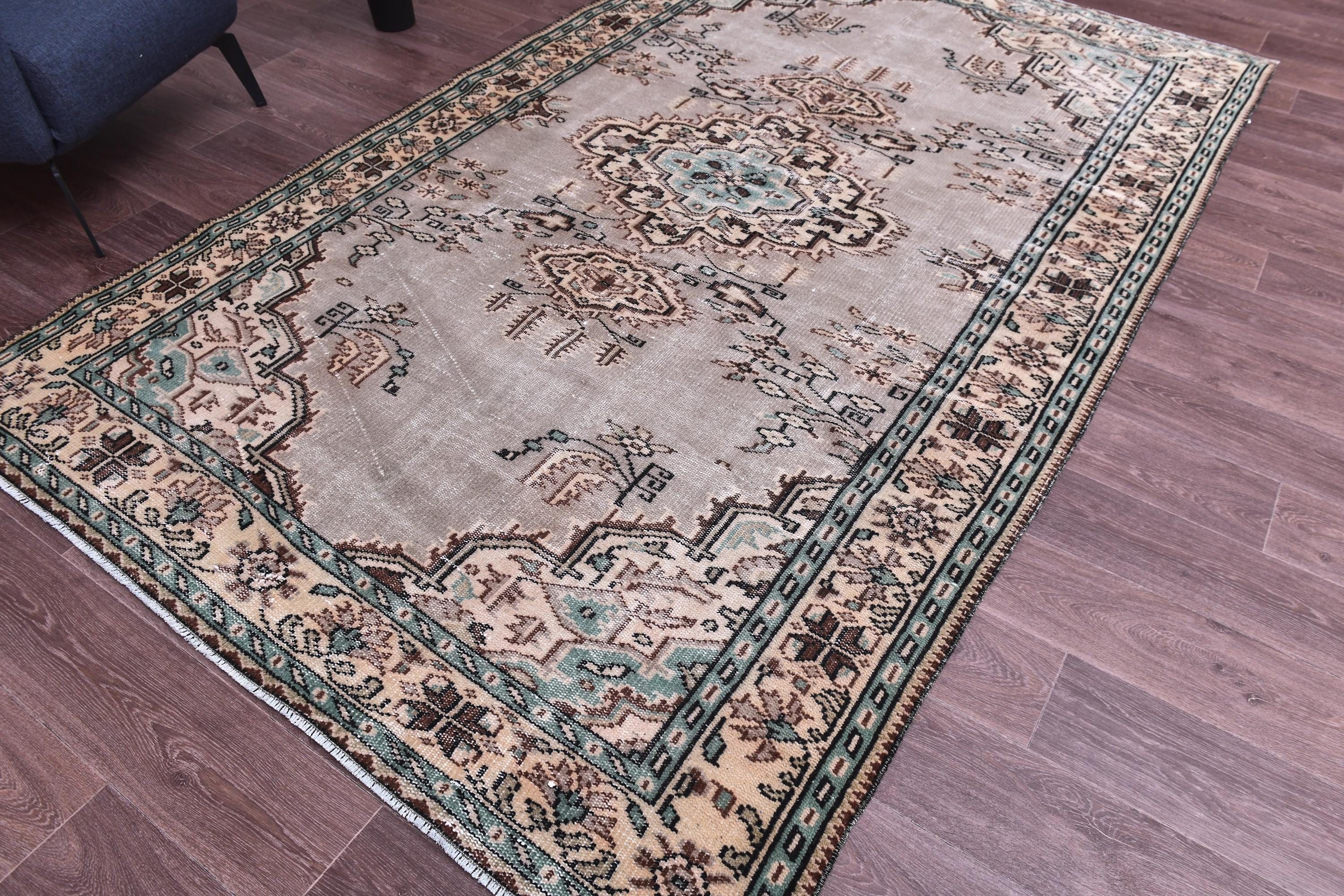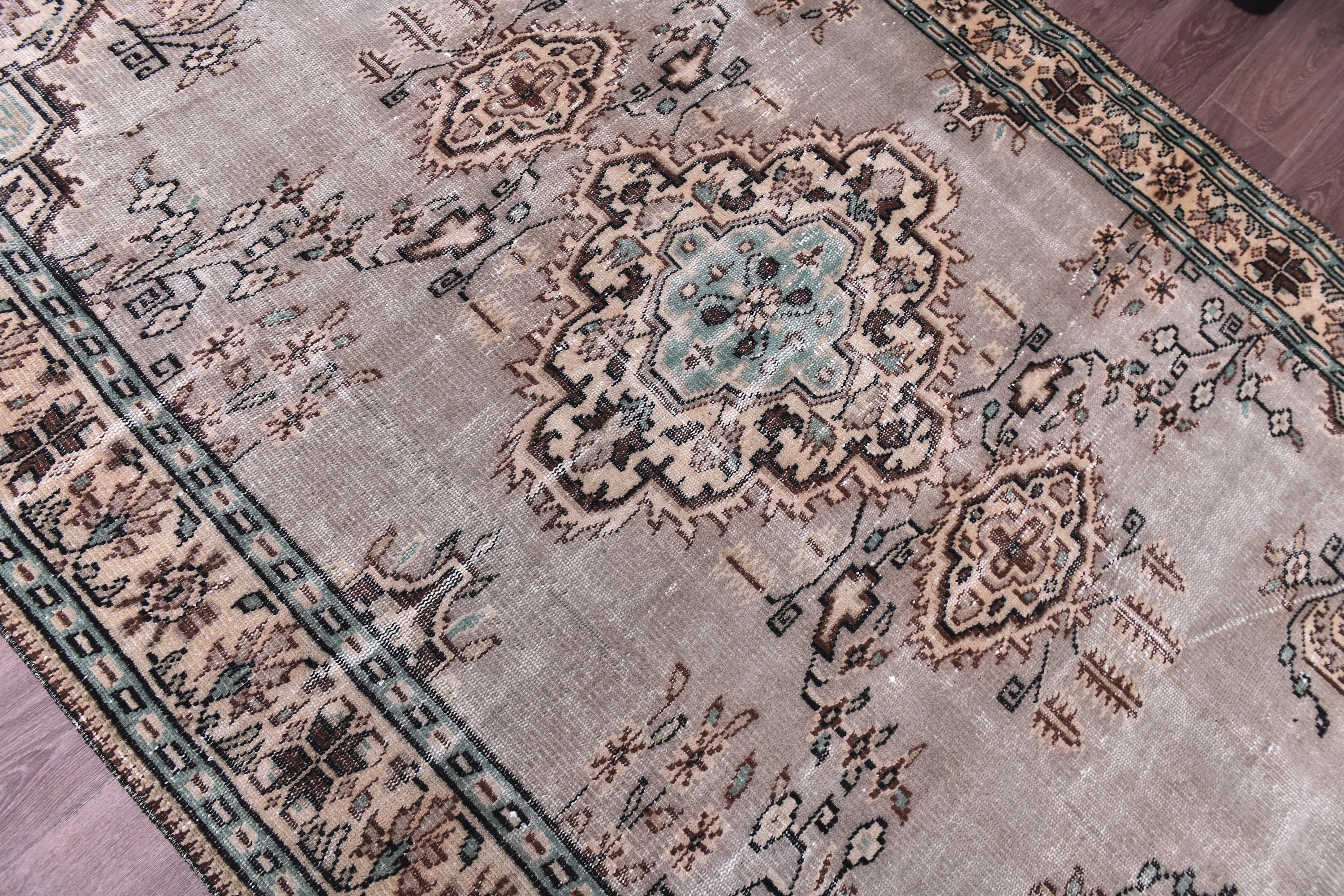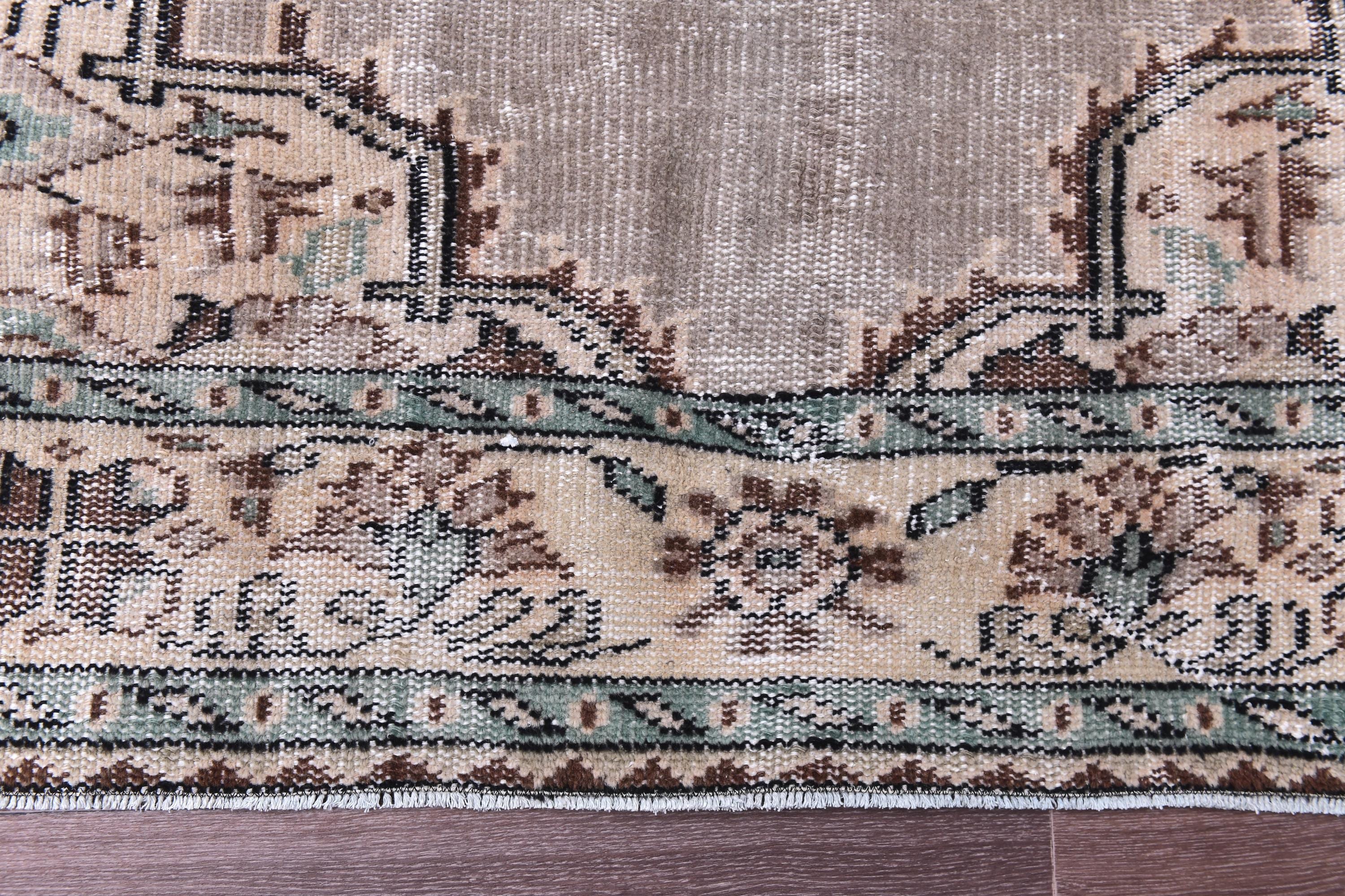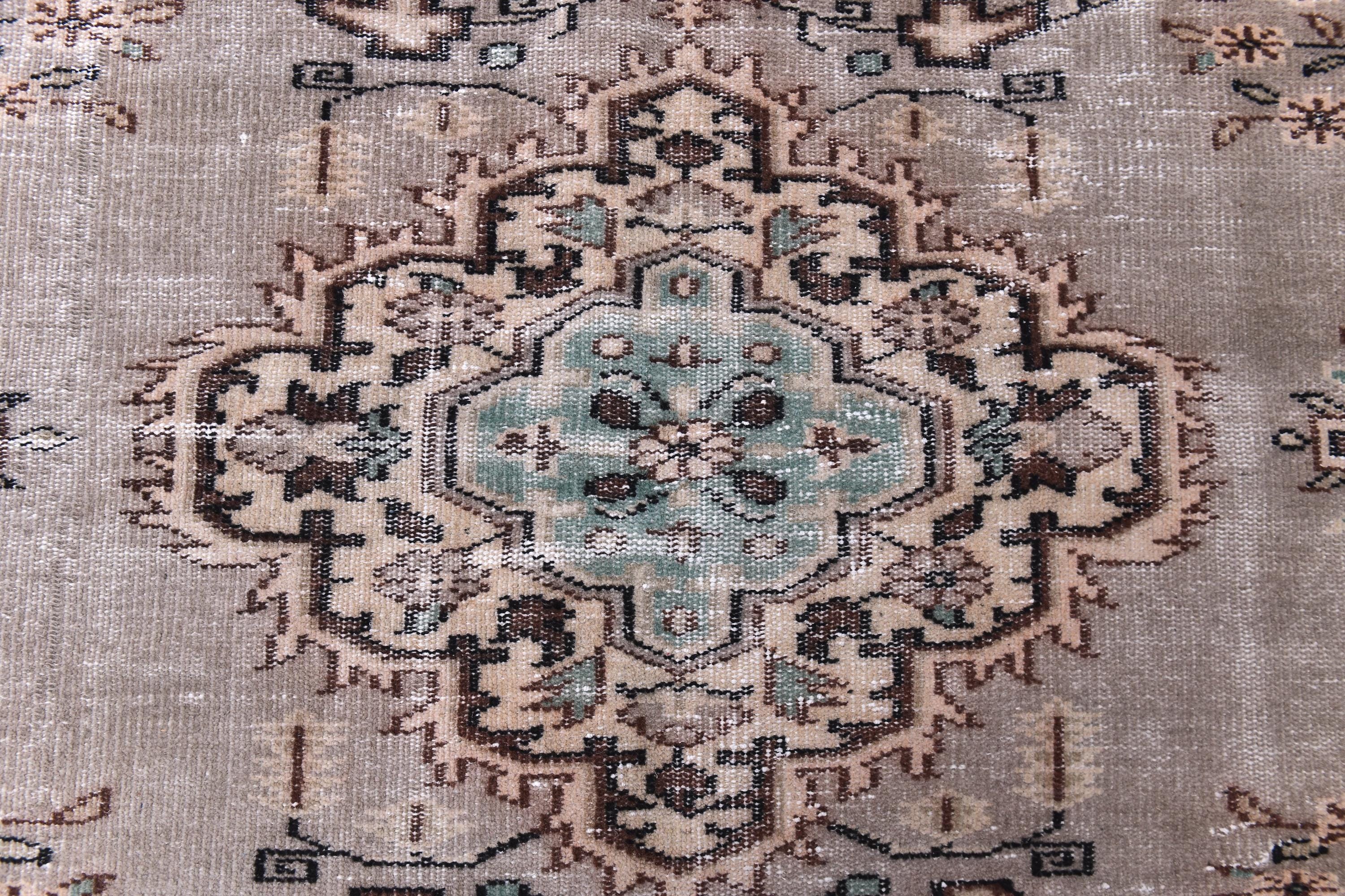 📜📌 Hand-knotted Turkish wool area rug showcasing muted beige-gray field with central geometric medallions in brown and aqua. Vintage Oushak carpet with low pile construction features distressed finish, delicate floral corner spandrels, and decorative border in peach, turquoise, and cream. Fringed edges complete this authentic 5x8 feet antique-style floor covering.