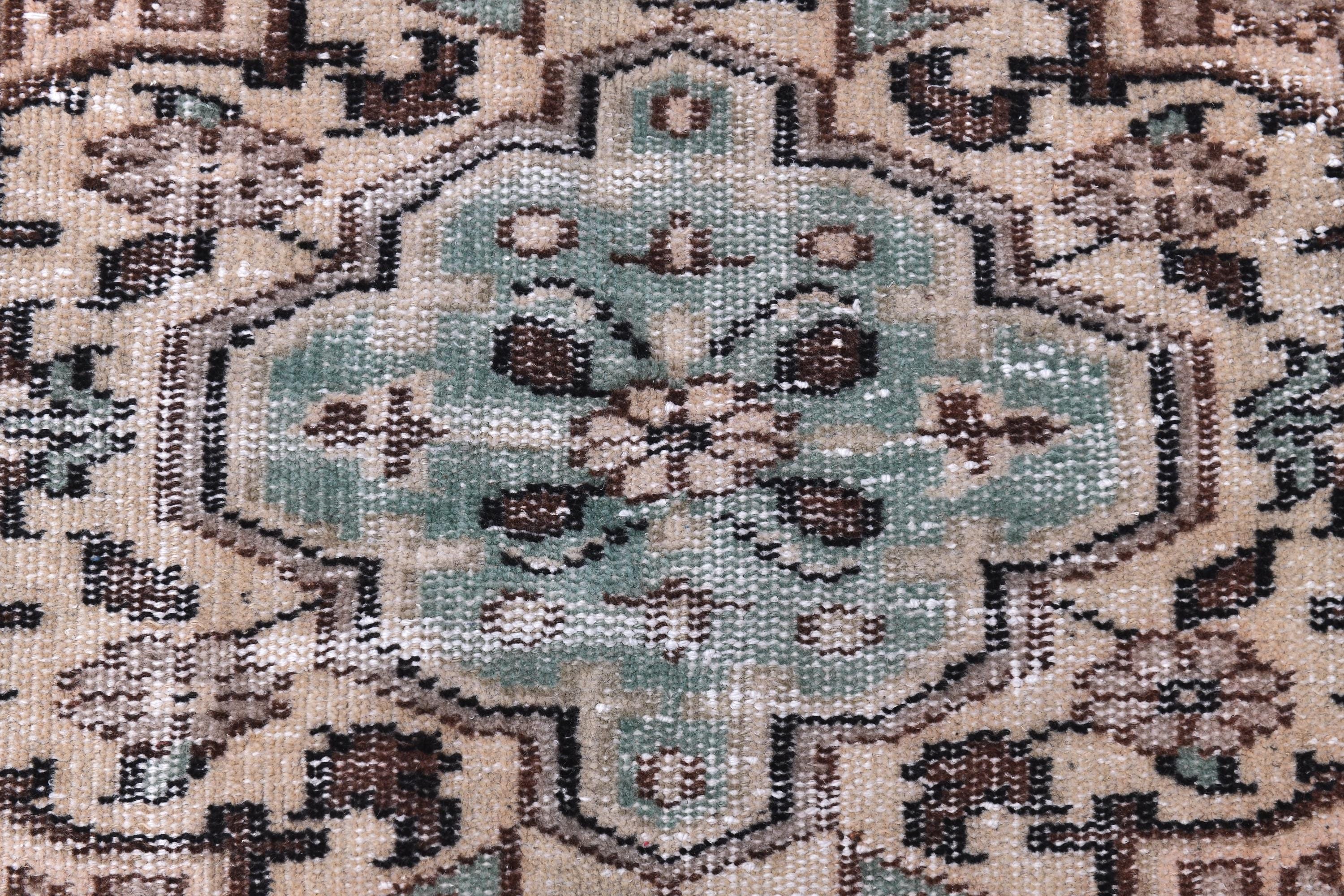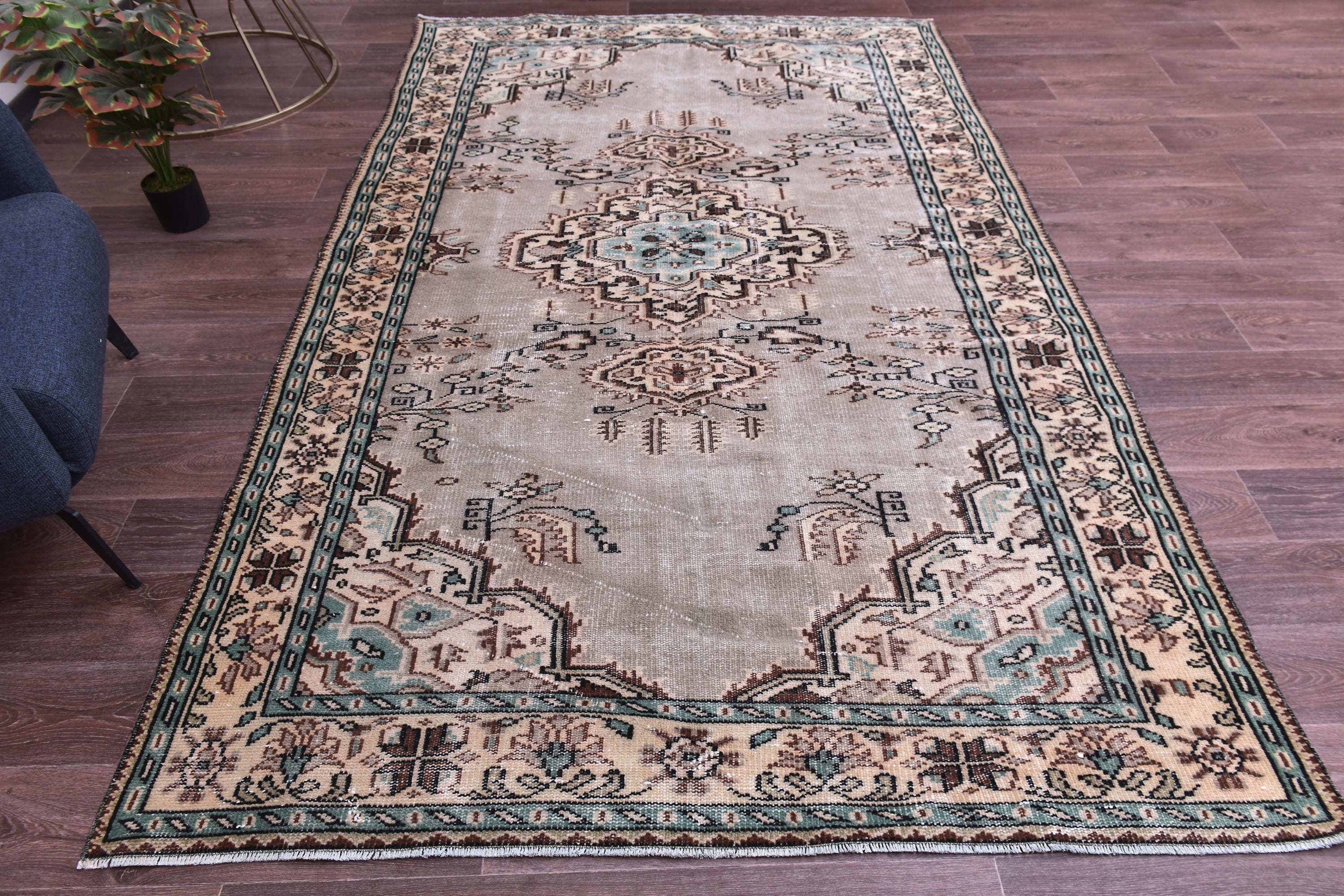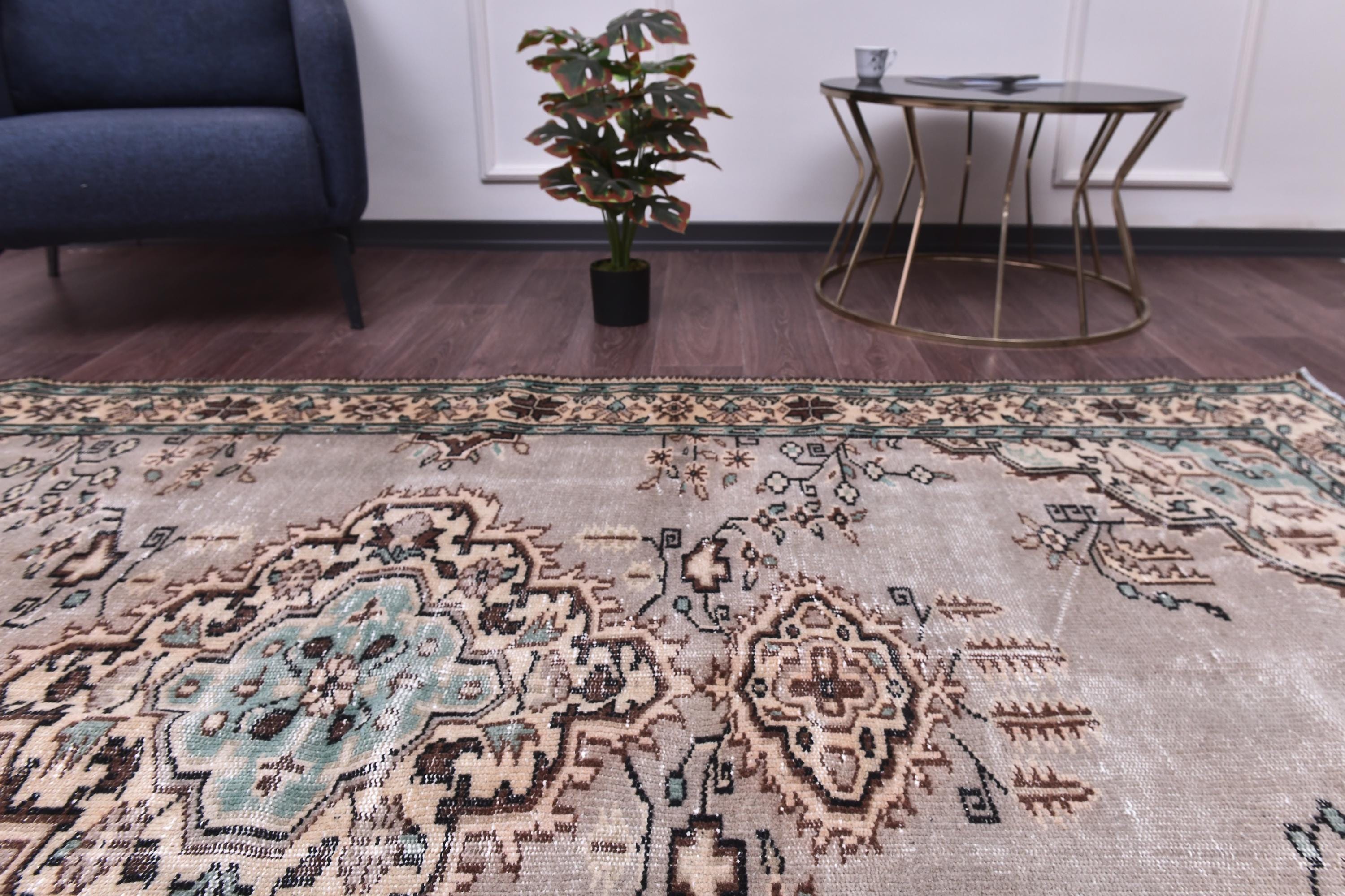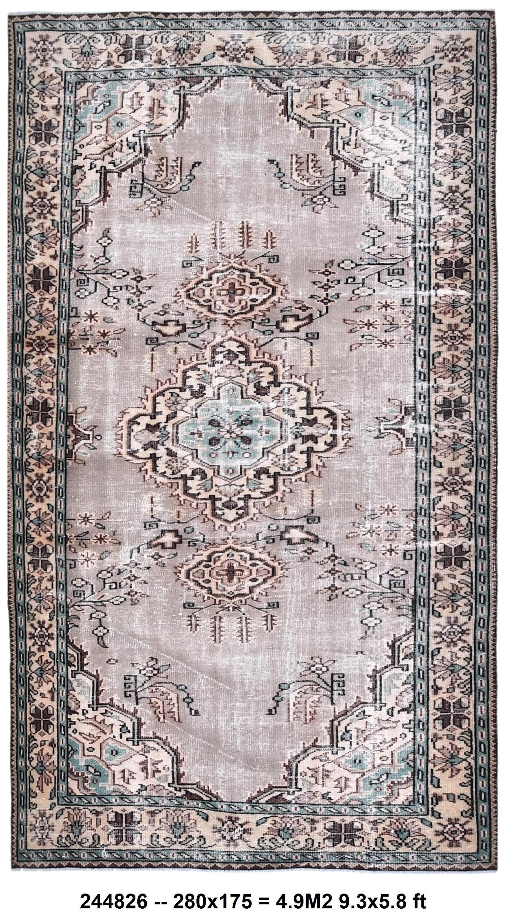 📜📌 Hand-knotted Turkish wool area rug showcasing muted beige-gray field with central geometric medallions in brown and aqua. Vintage Oushak carpet with low pile construction features distressed finish, delicate floral corner spandrels, and decorative border in peach, turquoise, and cream. Fringed edges complete this authentic 5x8 feet antique-style floor covering.