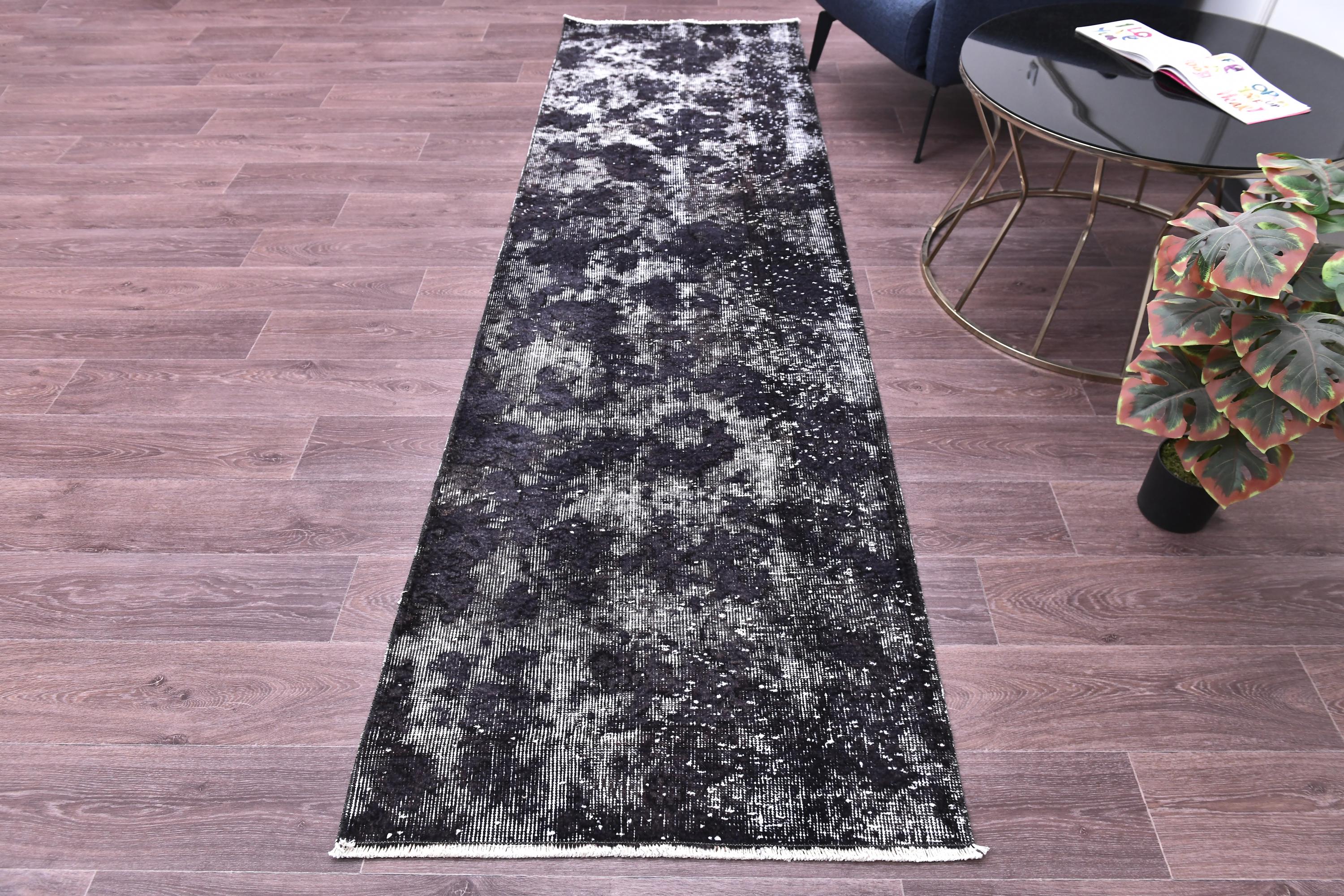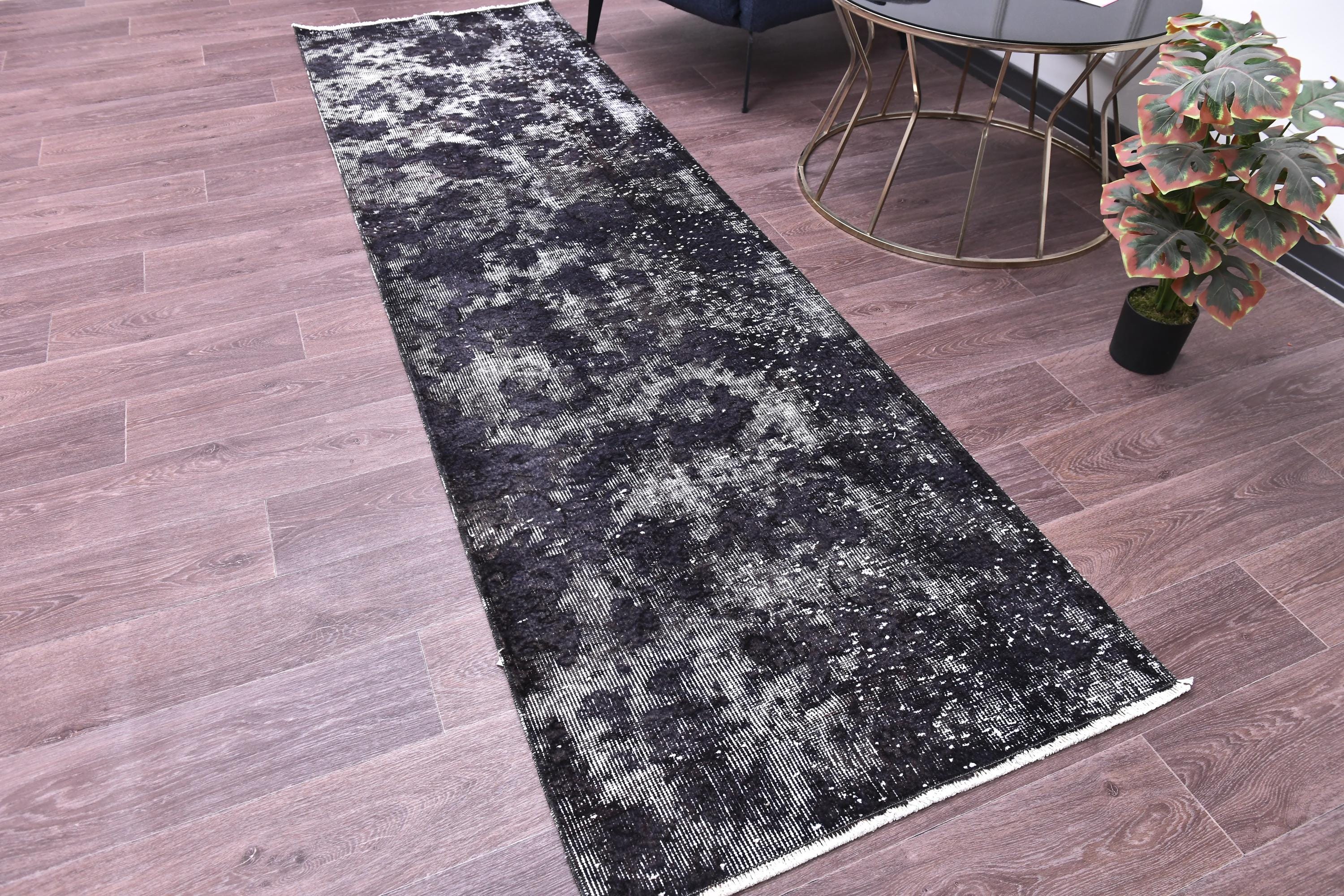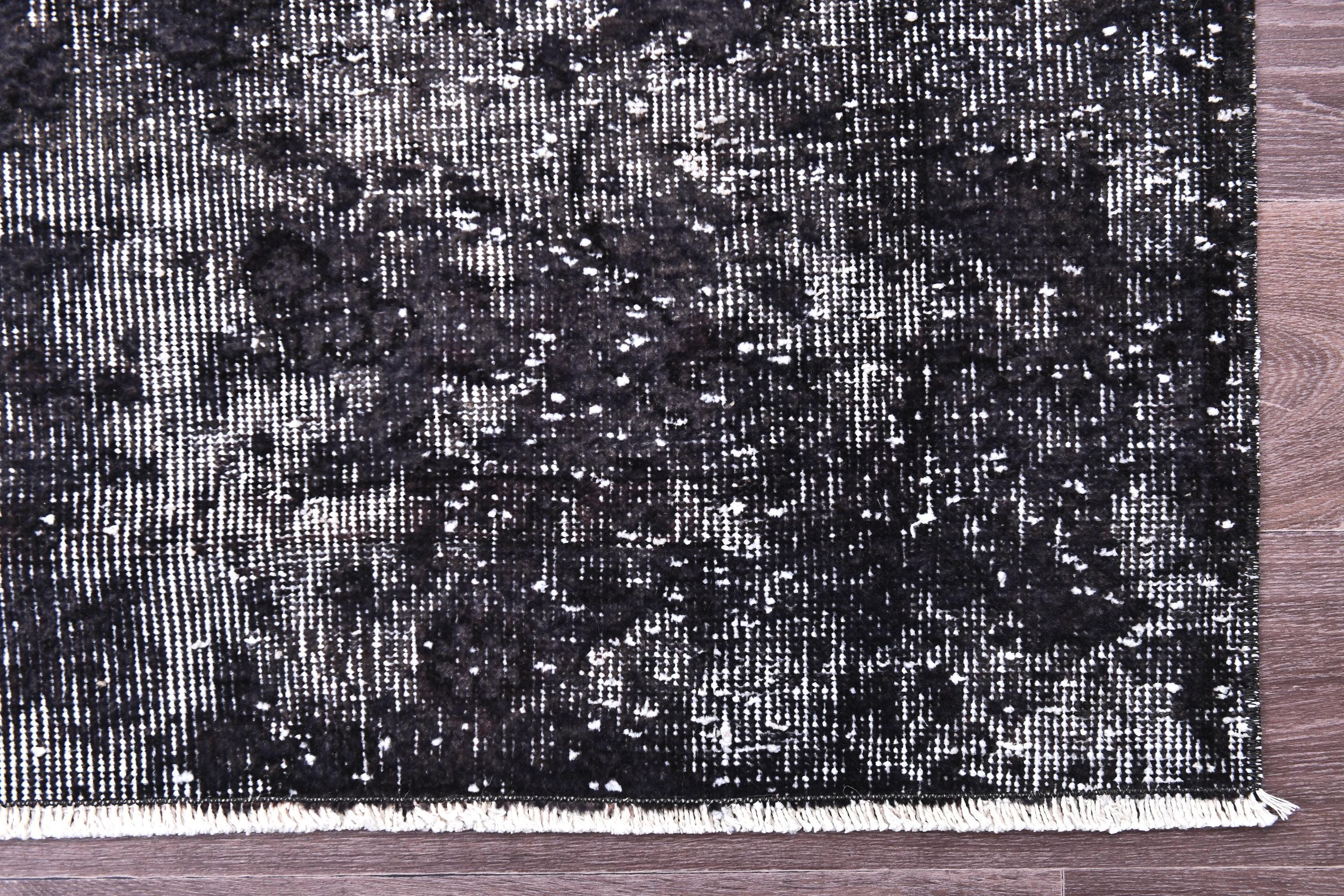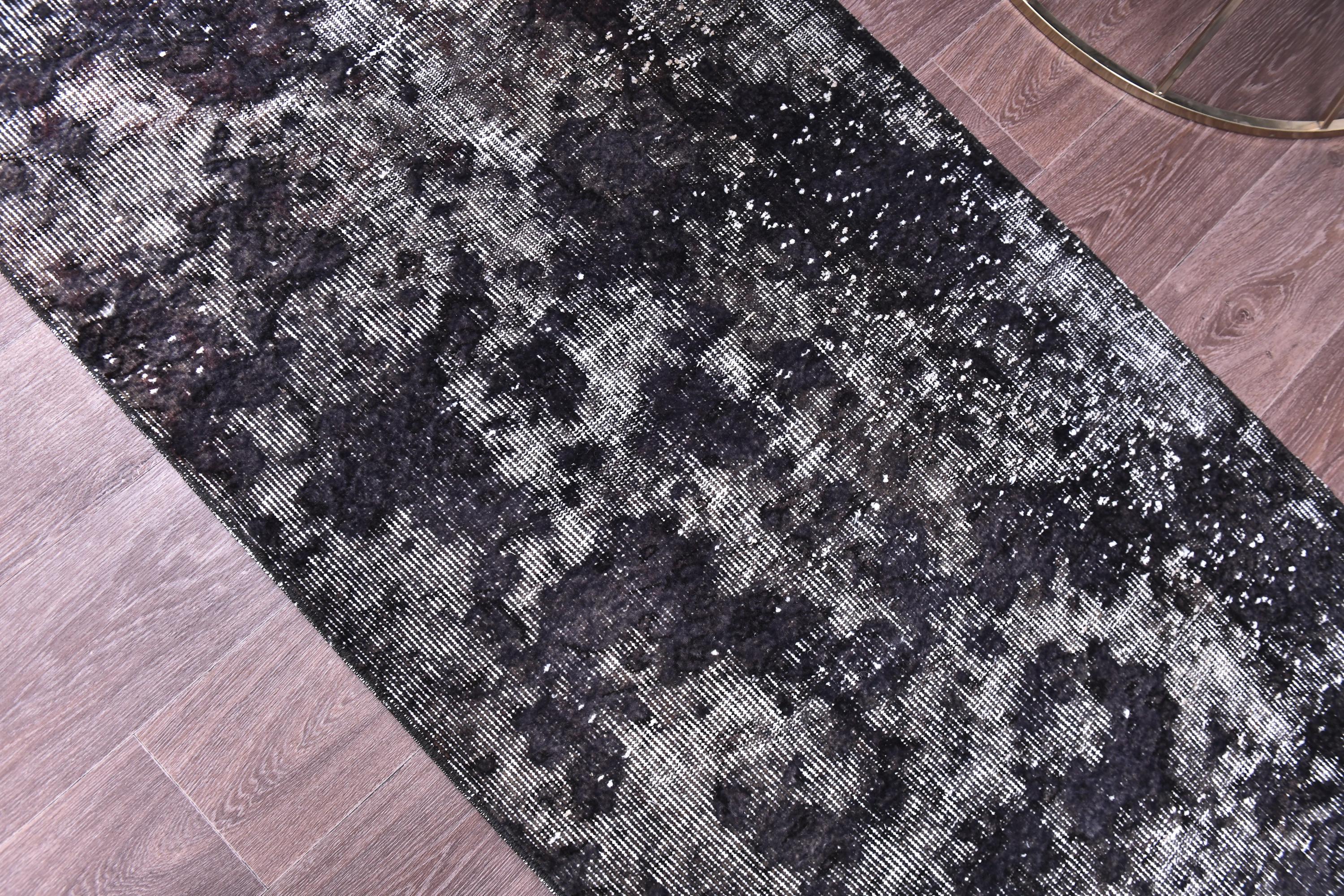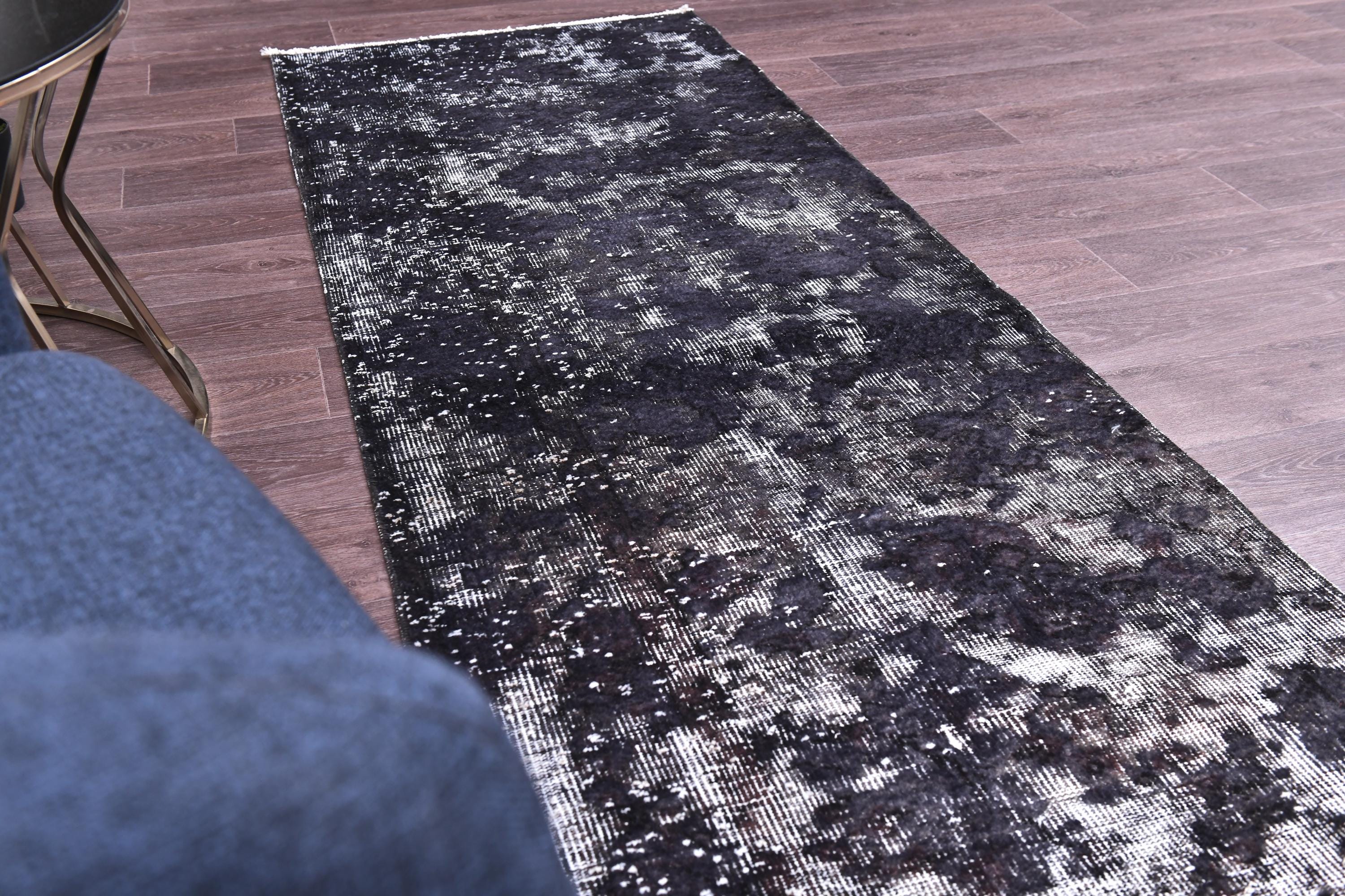 📜📌 Hand-knotted Turkish wool runner carpet transformed with black overdye process, revealing hints of gray and silver undertones. The 2x6 feet long hallway rug displays heavily distressed vintage patterns emerging through the dark surface, creating unique textured depth. Fringed edges and authentic aged patina make this modern black runner ideal for contemporary homes, offices, and minimalist interiors.