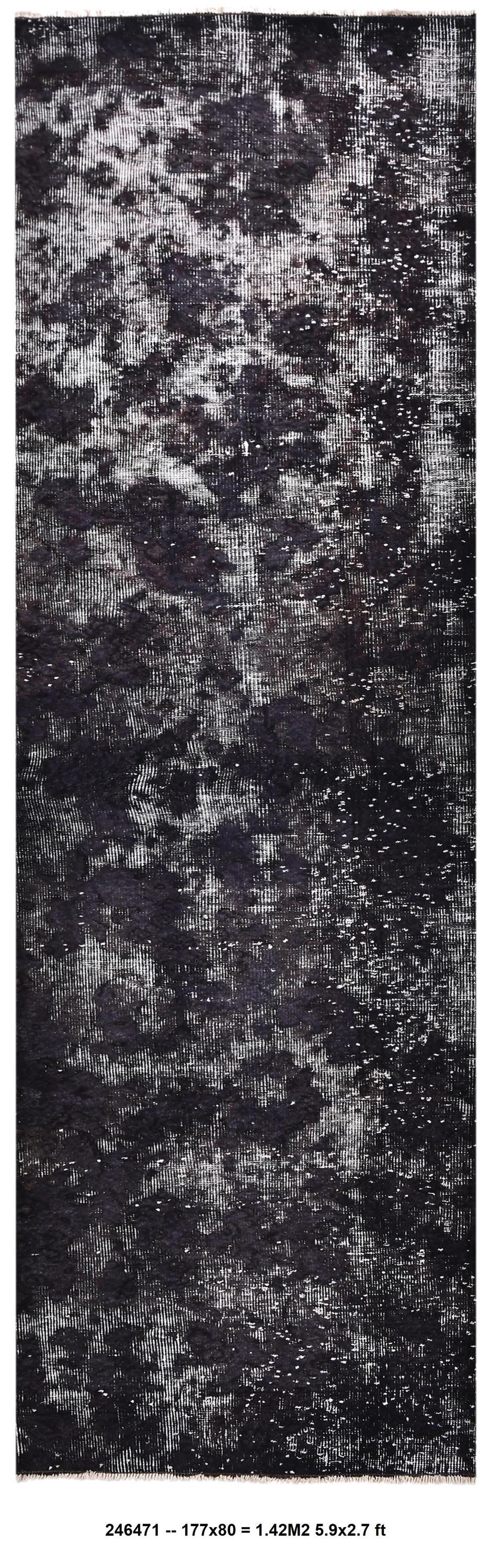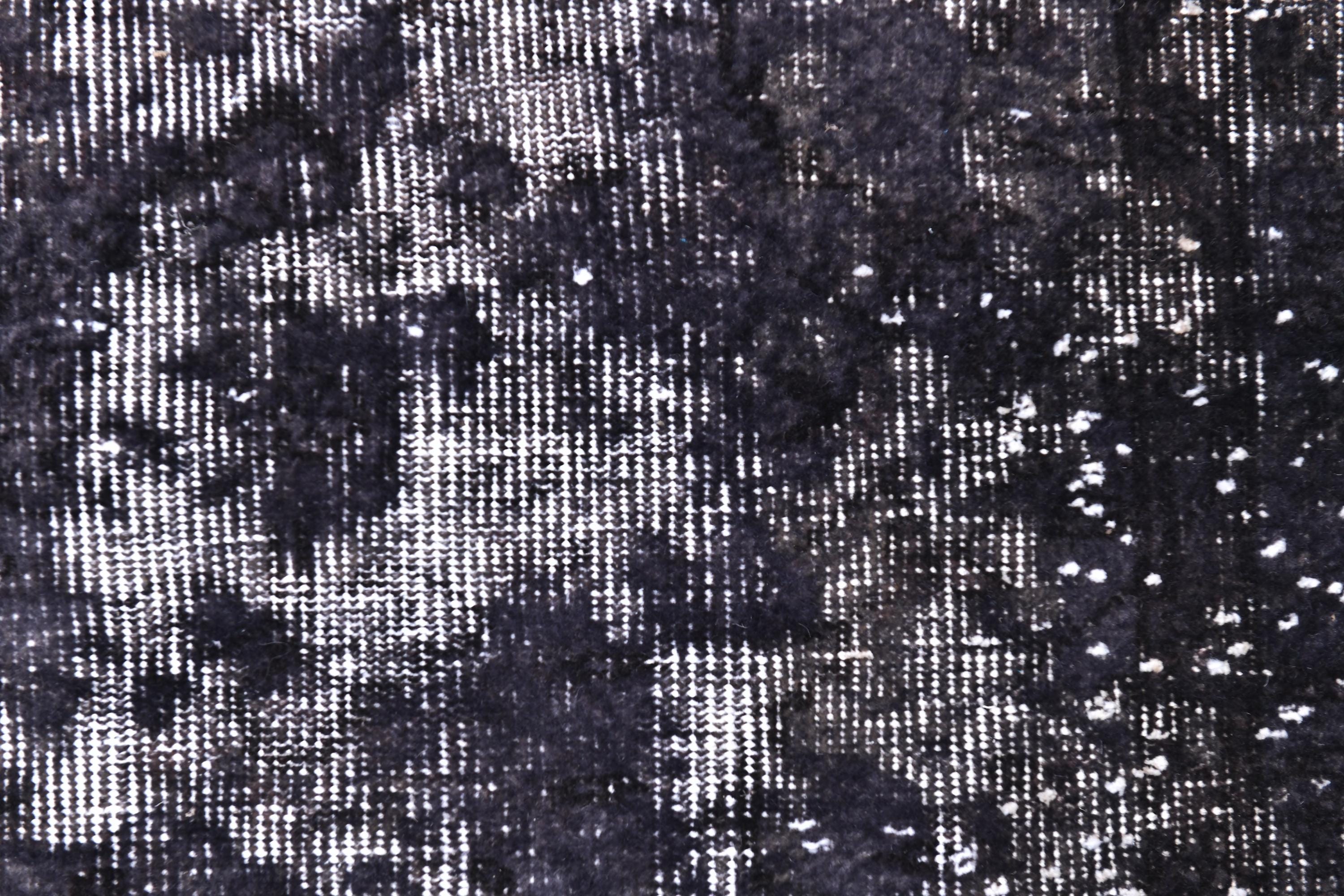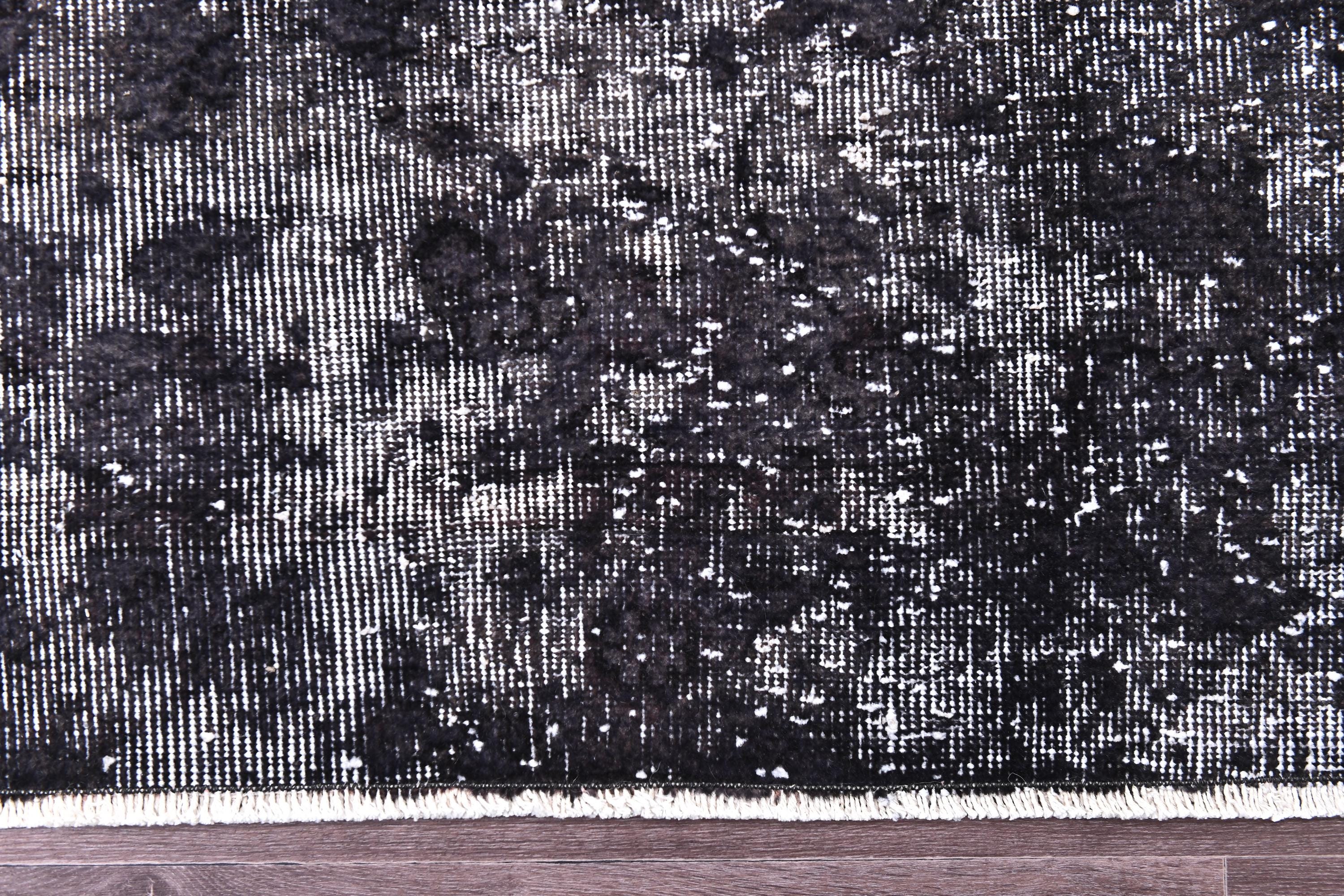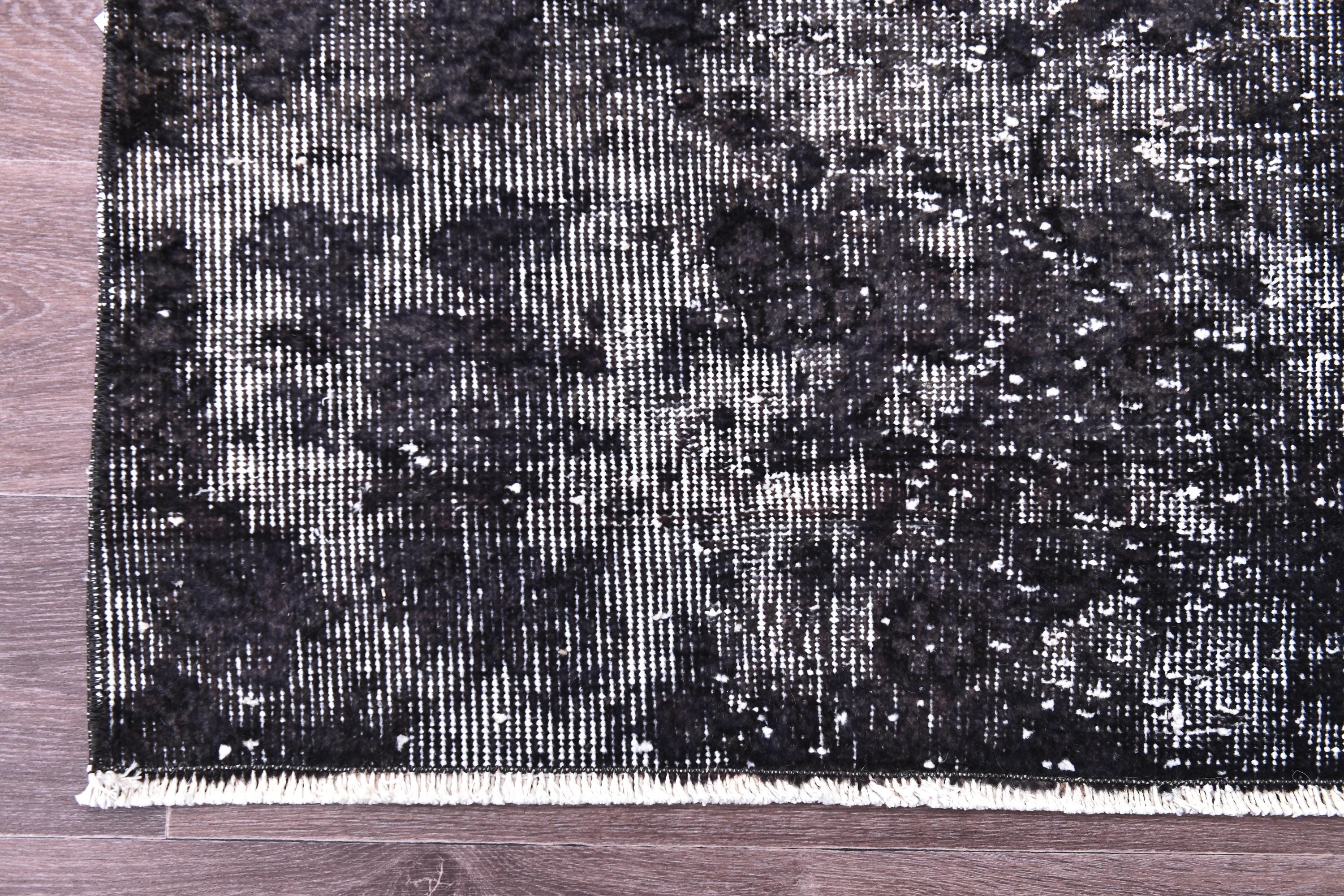 📜📌 Hand-knotted Turkish wool runner carpet transformed with black overdye process, revealing hints of gray and silver undertones. The 2x6 feet long hallway rug displays heavily distressed vintage patterns emerging through the dark surface, creating unique textured depth. Fringed edges and authentic aged patina make this modern black runner ideal for contemporary homes, offices, and minimalist interiors.