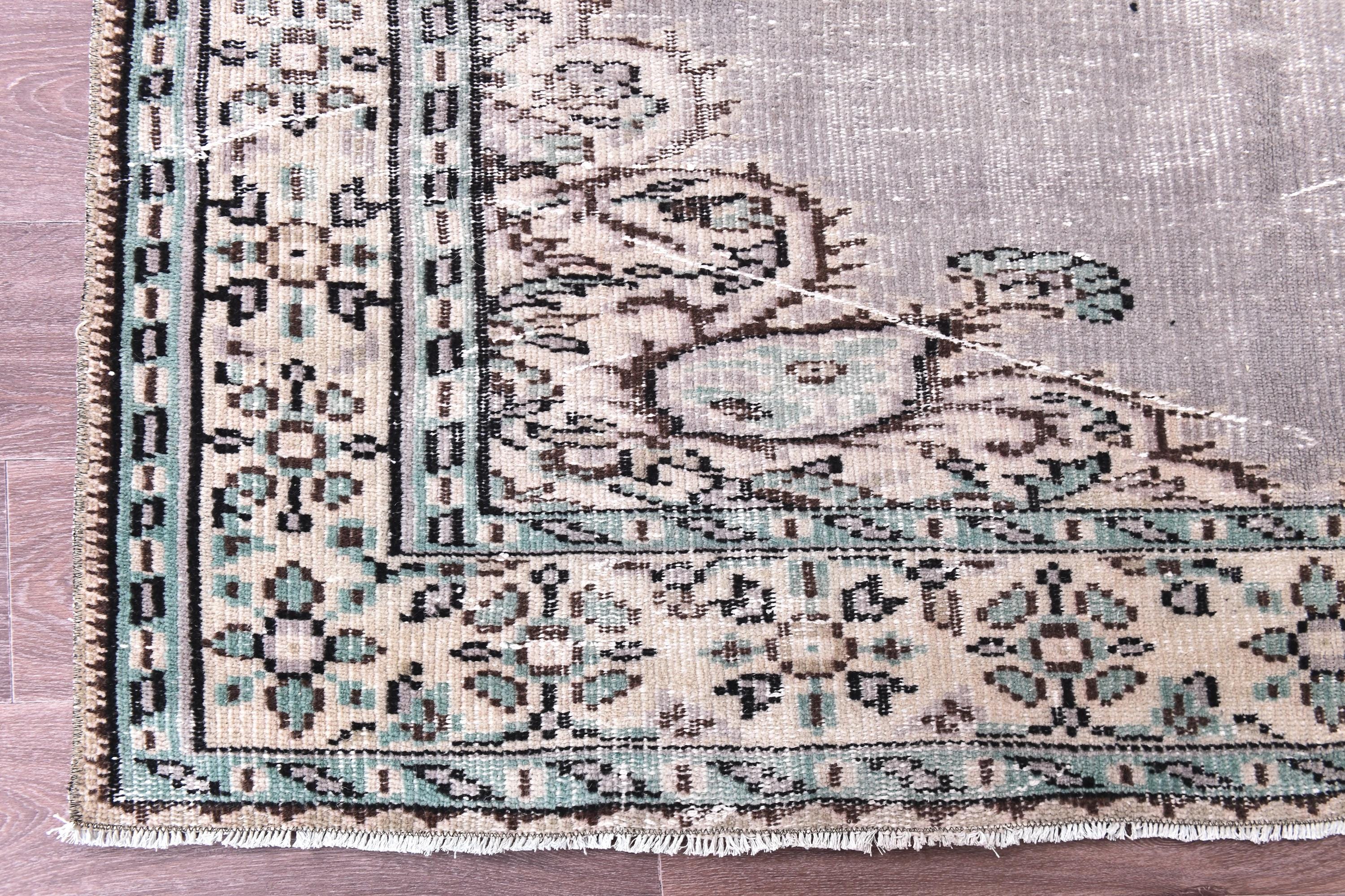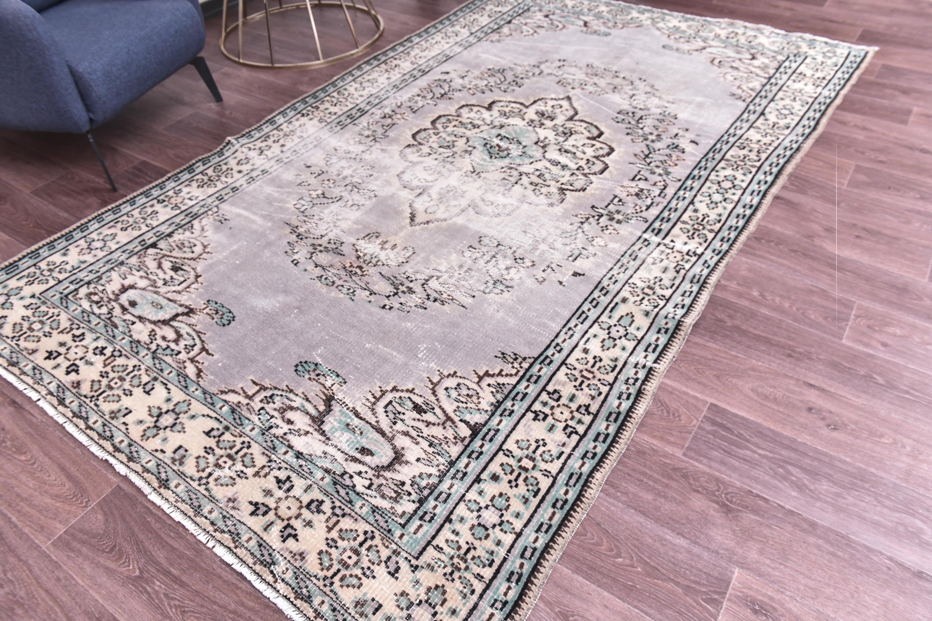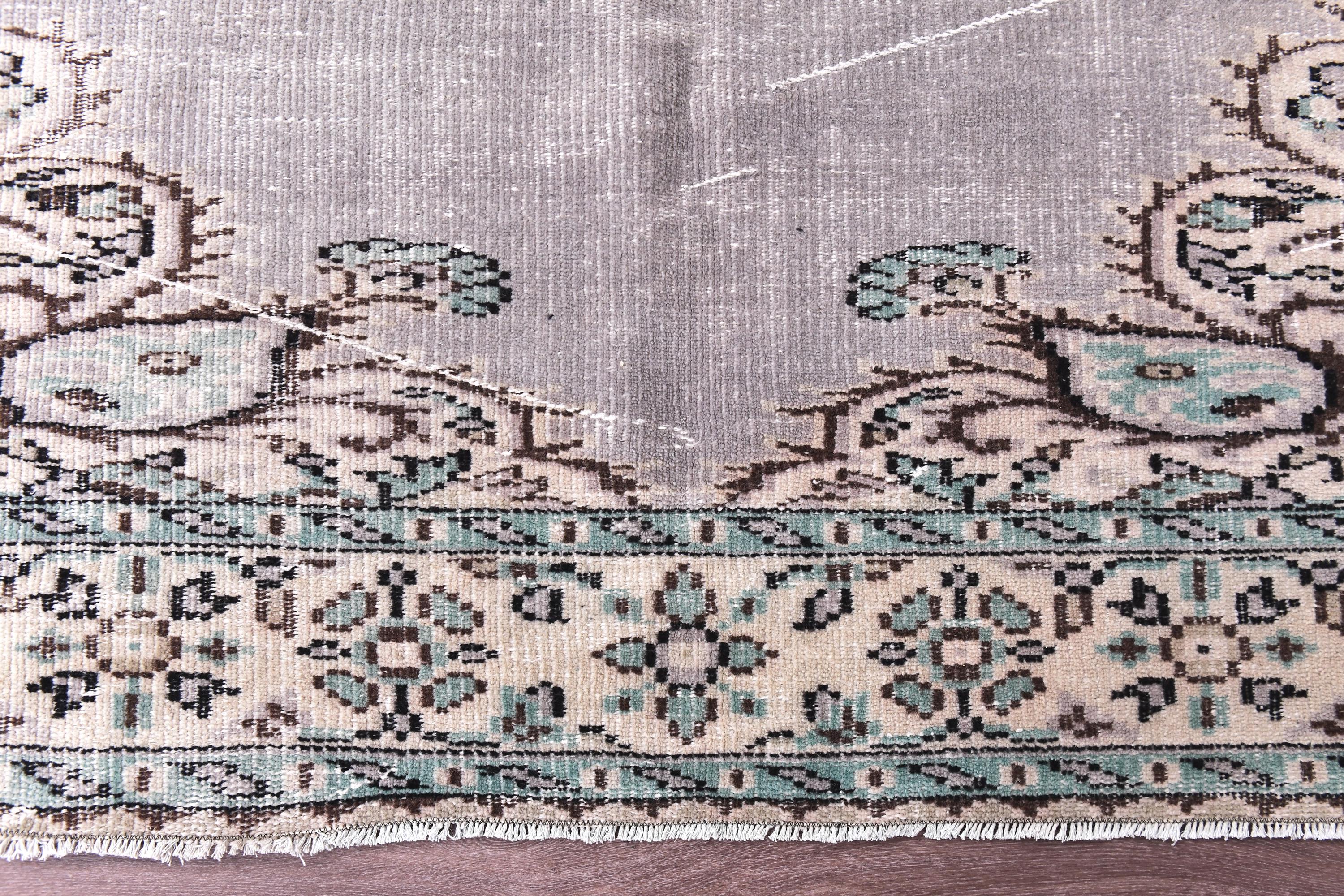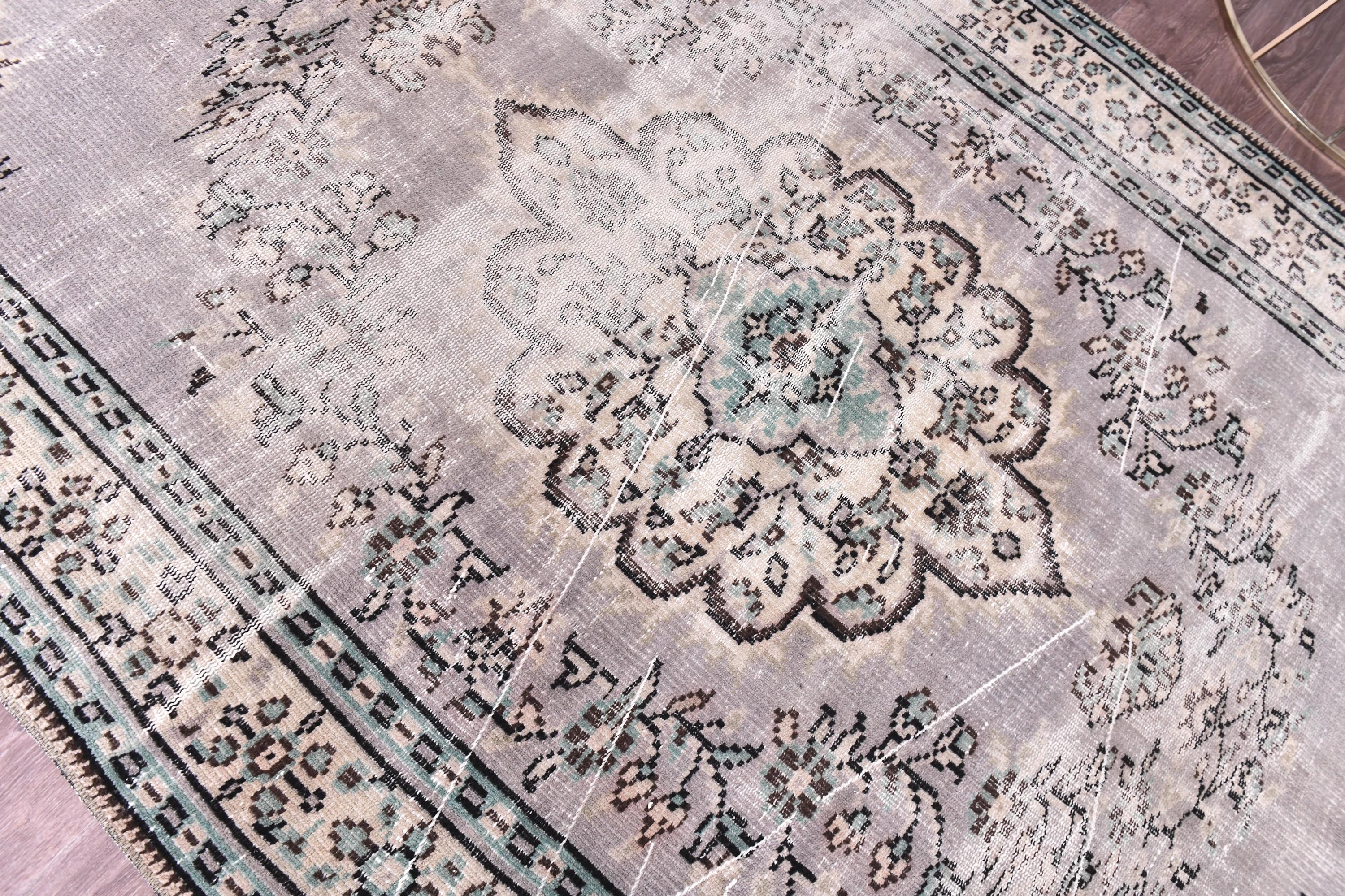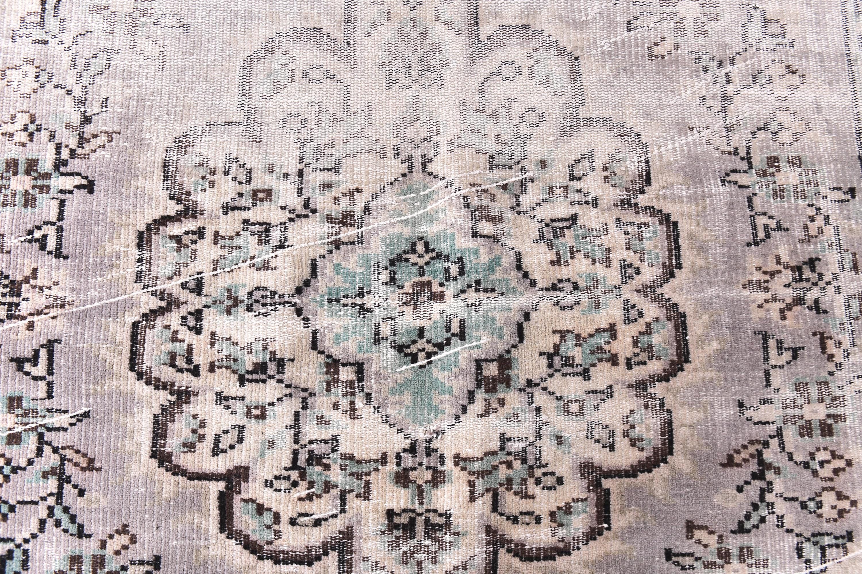 📜📌 Vintage Turkish Oushak area rug with soft gray field, large ornate floral medallion center, distressed muted beige and cream border with botanical motifs, hand-knotted wool construction, faded neutral palette, perfect for living room or bedroom