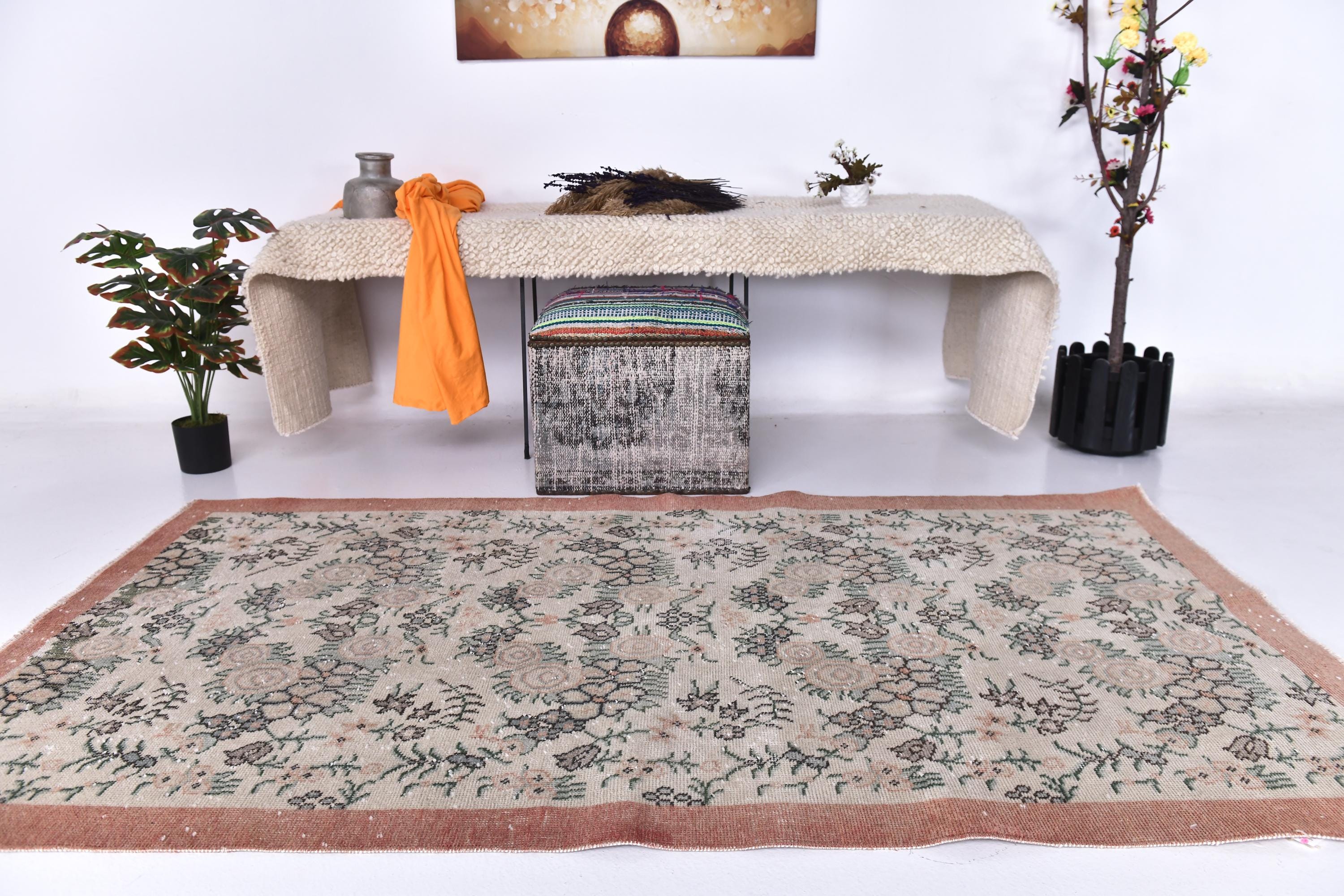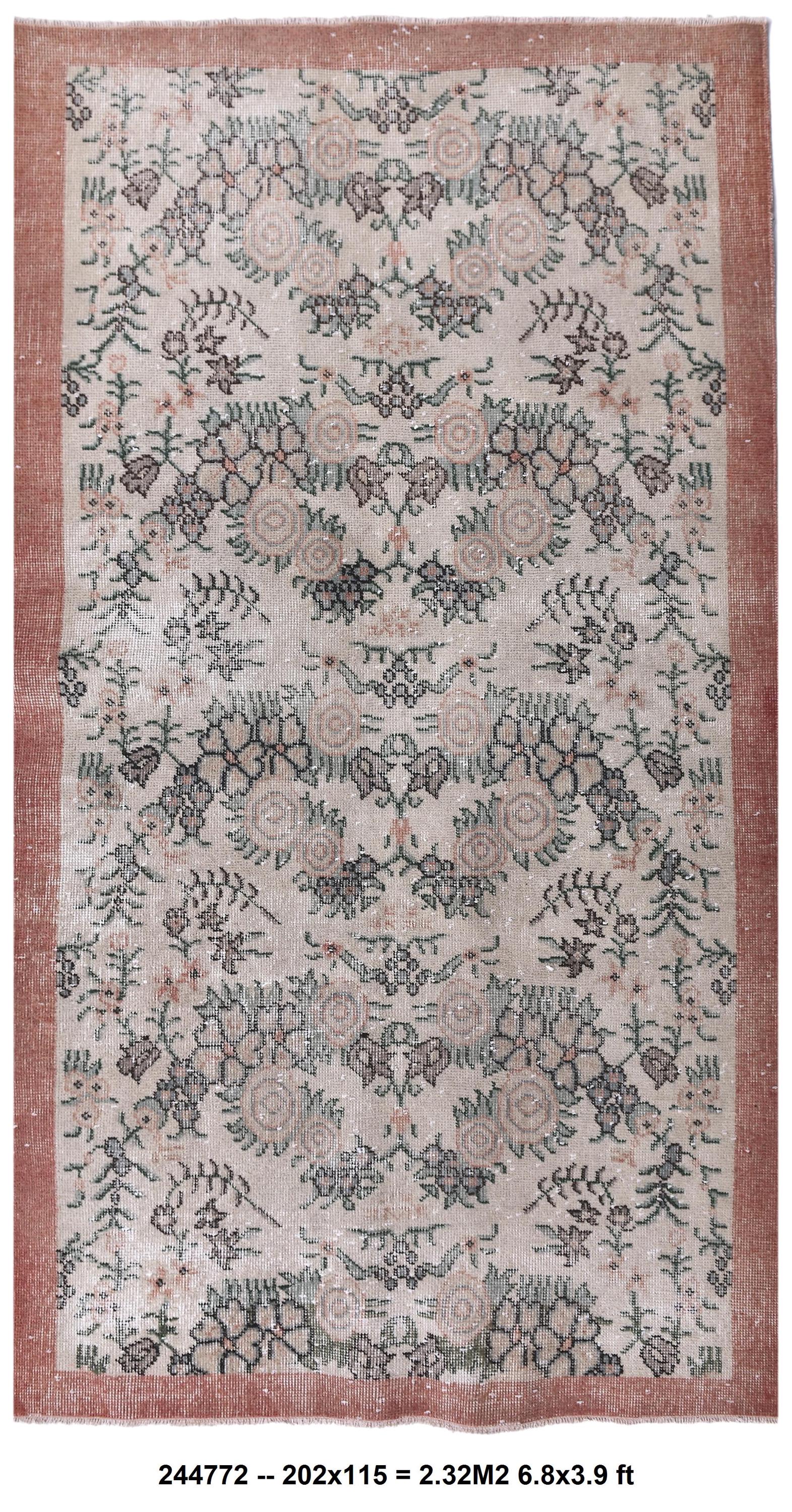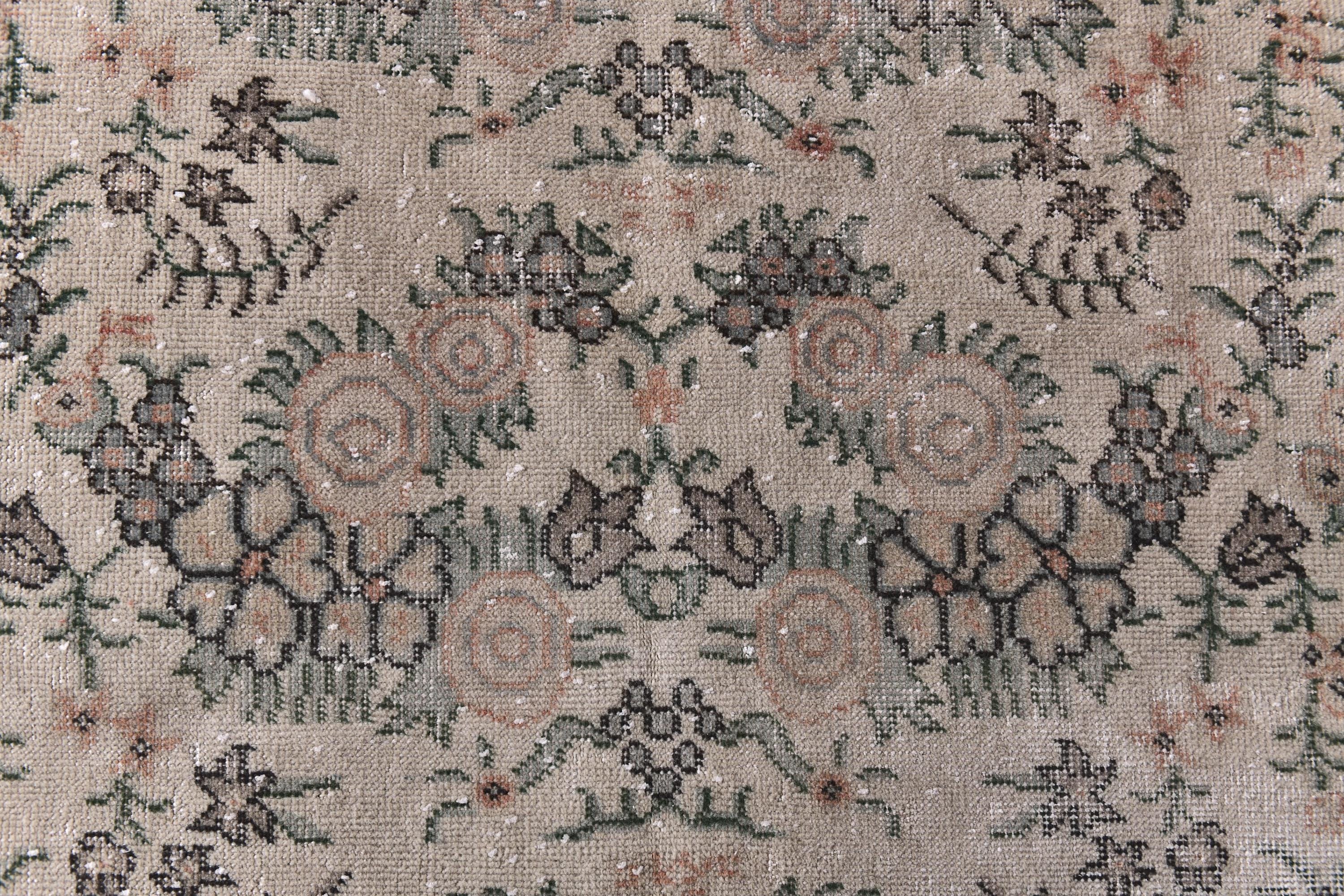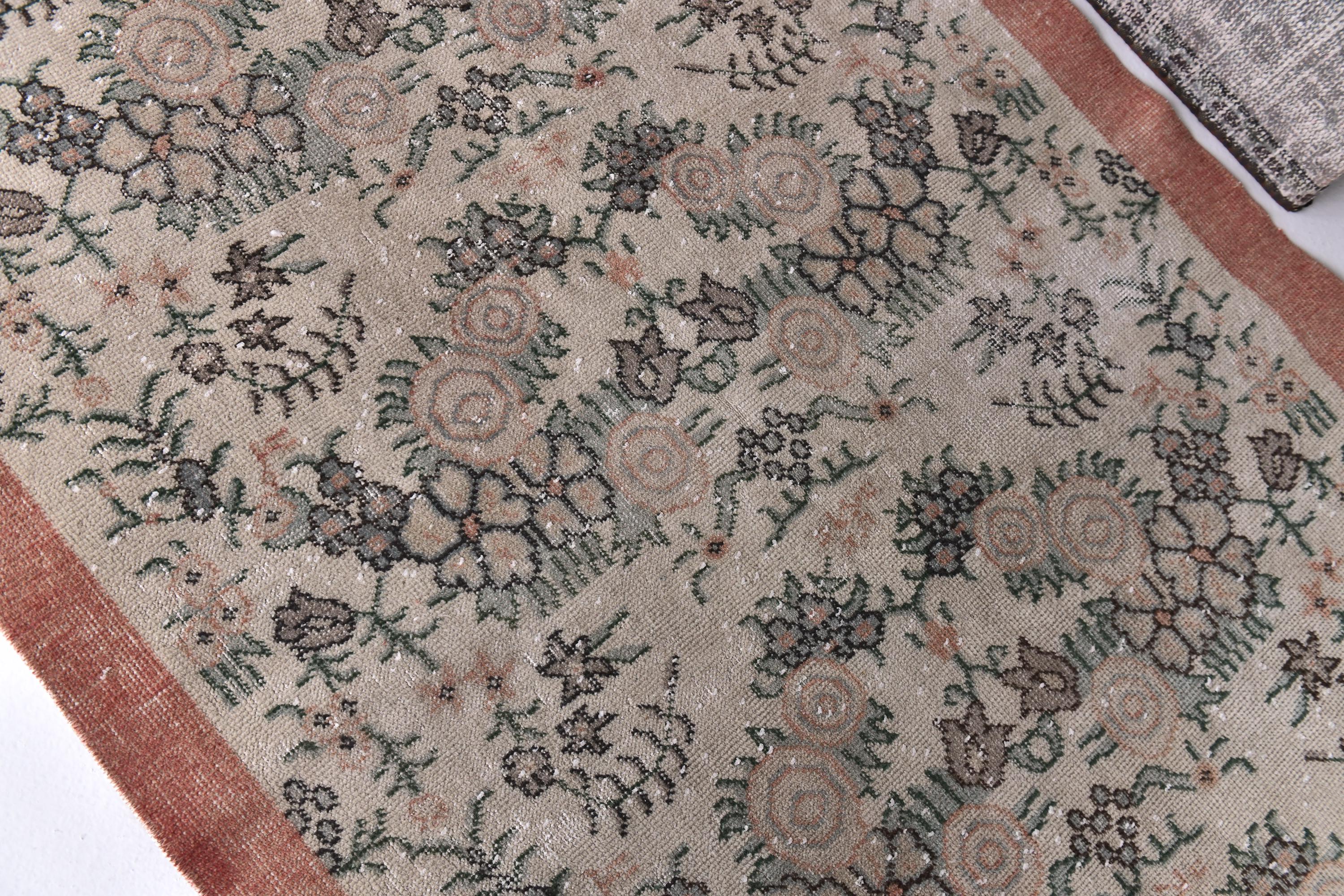 📜📌 Vintage distressed Turkish area rug featuring intricate floral and botanical motifs in faded sage green, beige, and charcoal tones on a neutral field, framed by a terracotta rust-colored border with traditional Oriental patterns