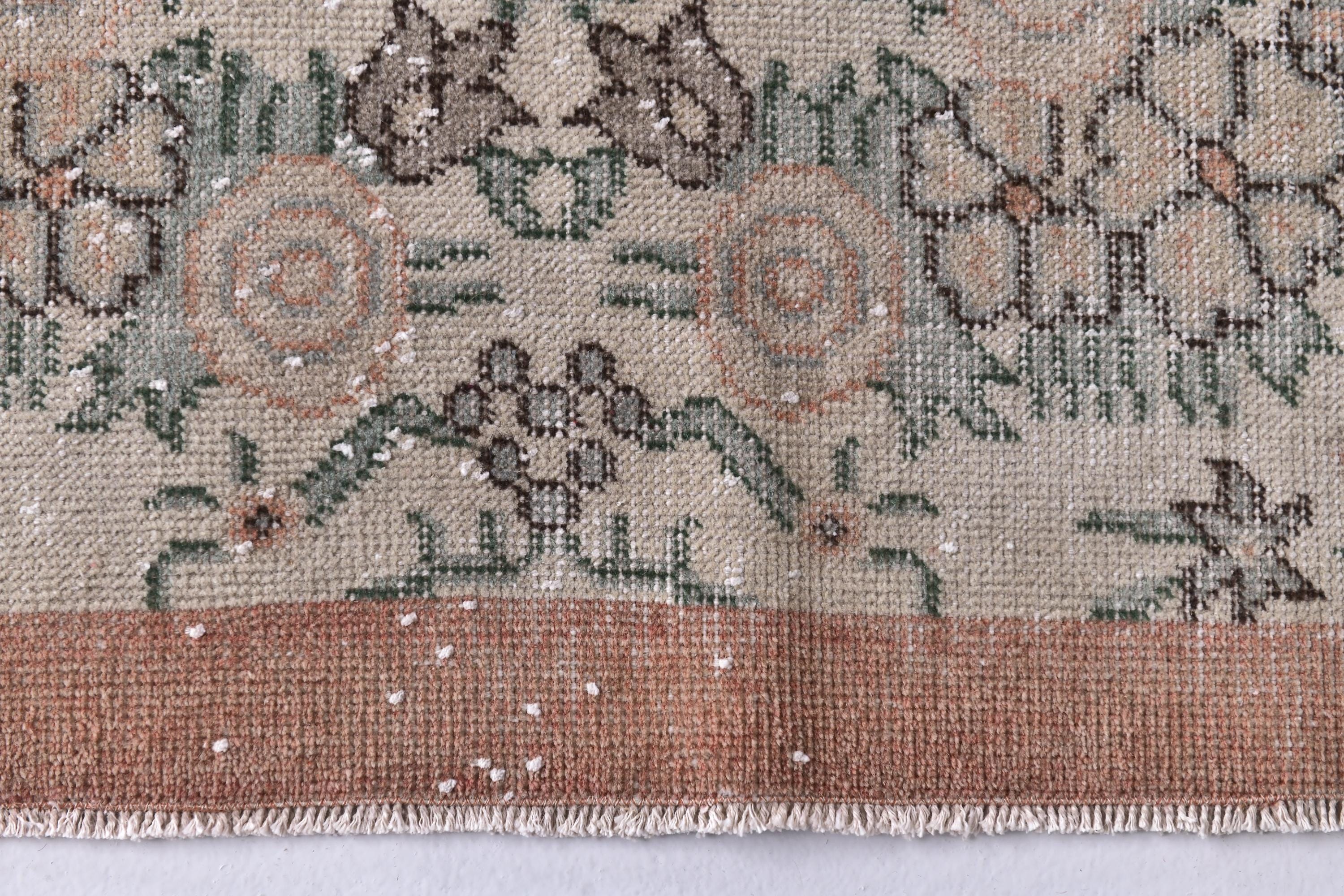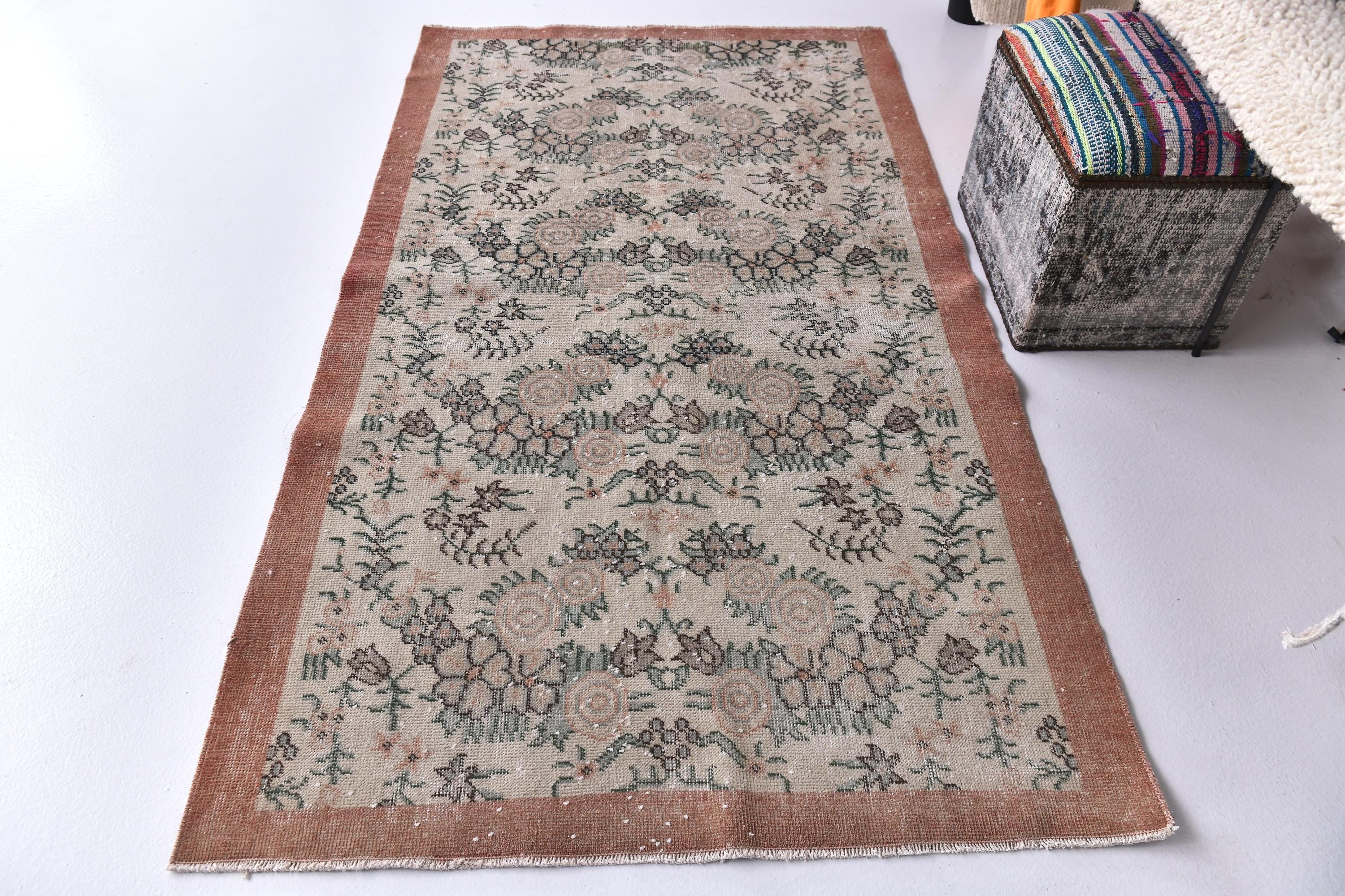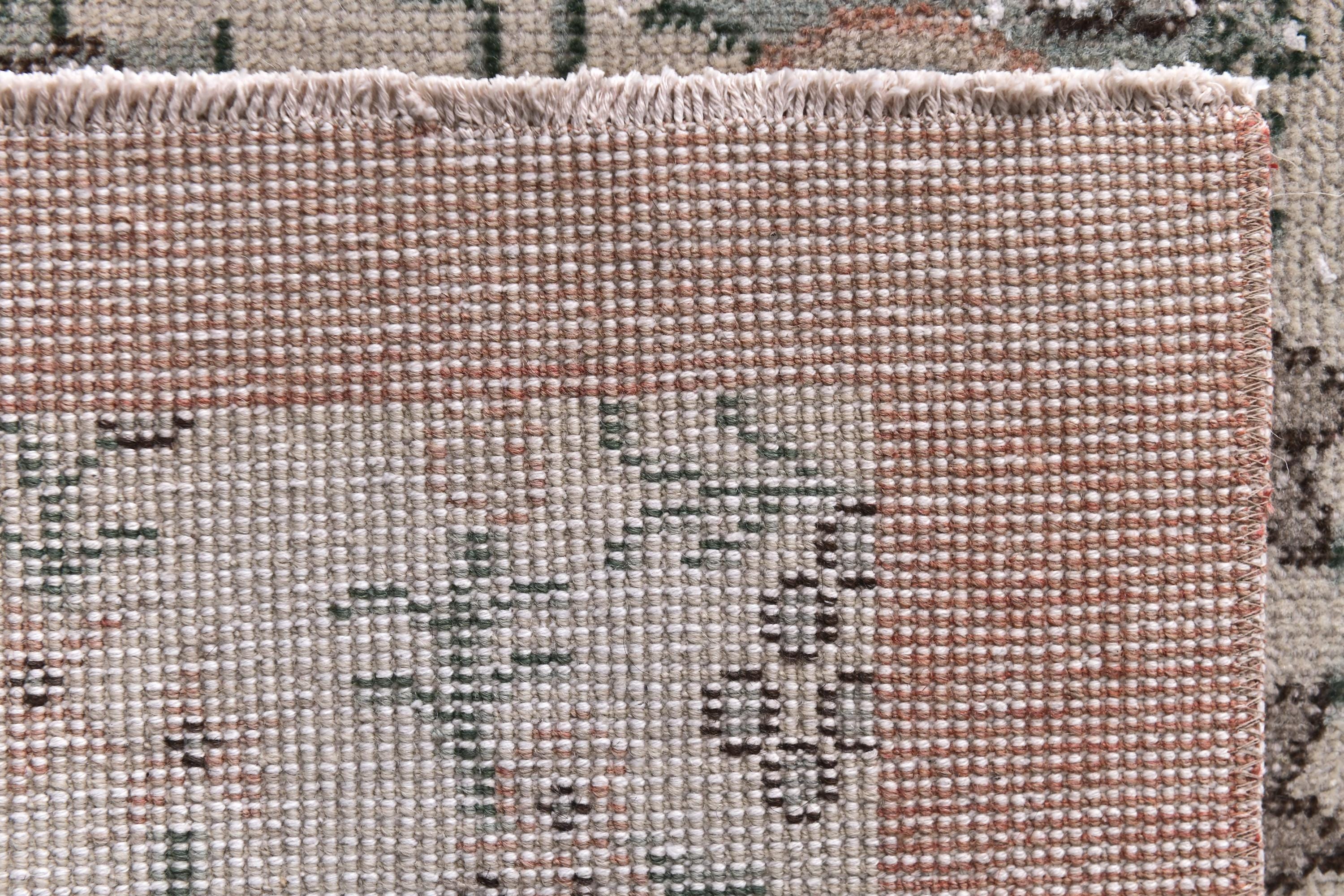 📜📌 Vintage distressed Turkish area rug featuring intricate floral and botanical motifs in faded sage green, beige, and charcoal tones on a neutral field, framed by a terracotta rust-colored border with traditional Oriental patterns