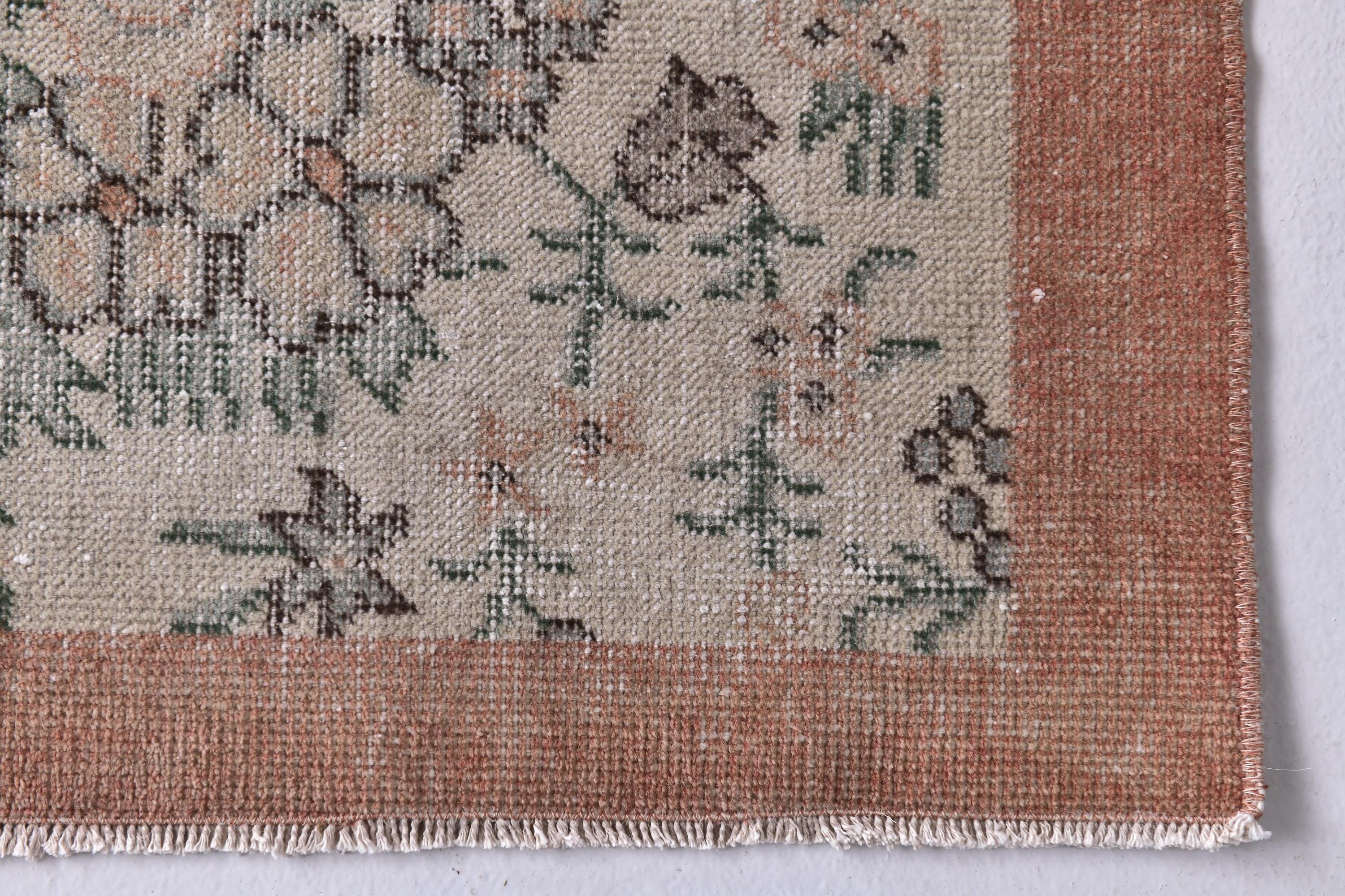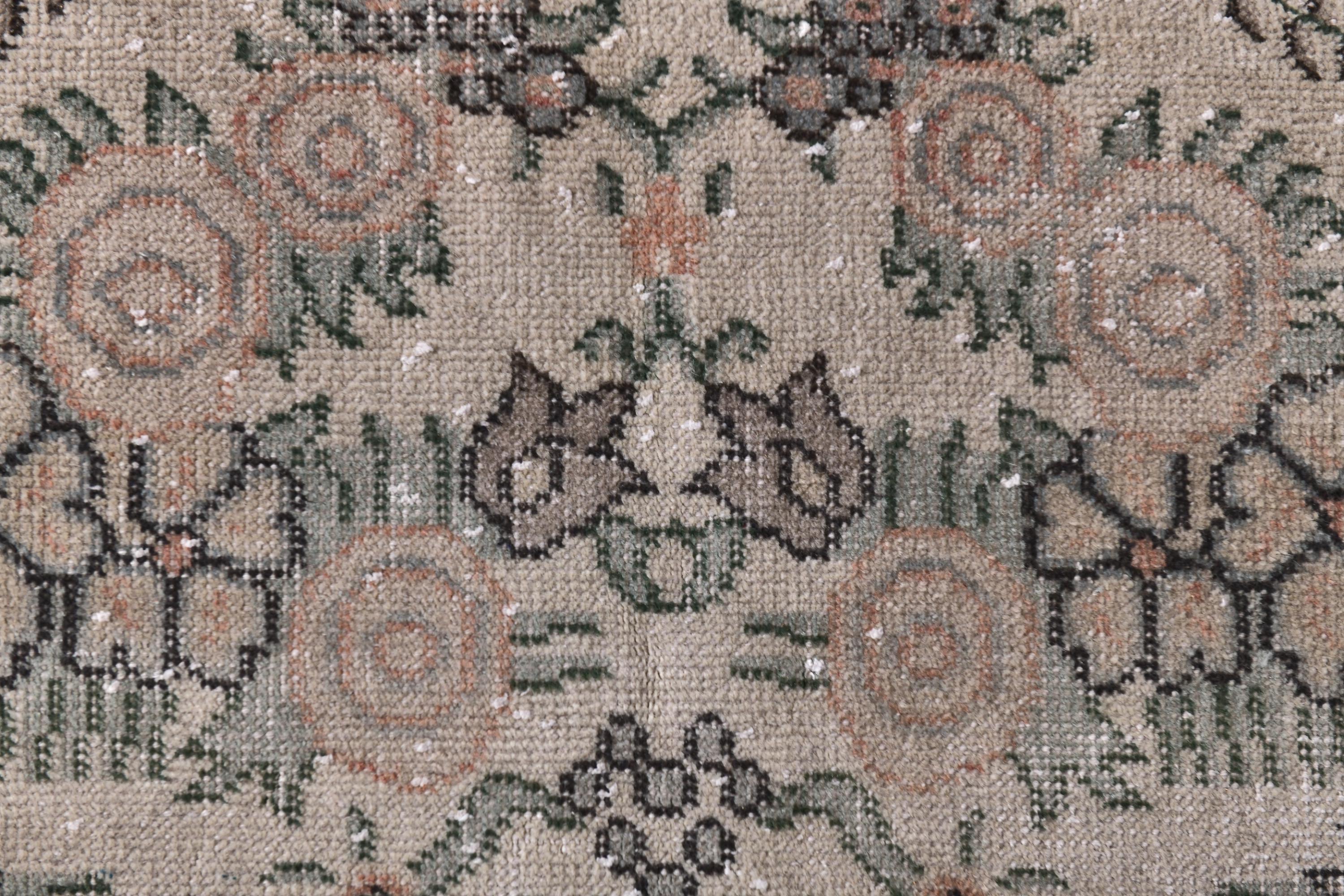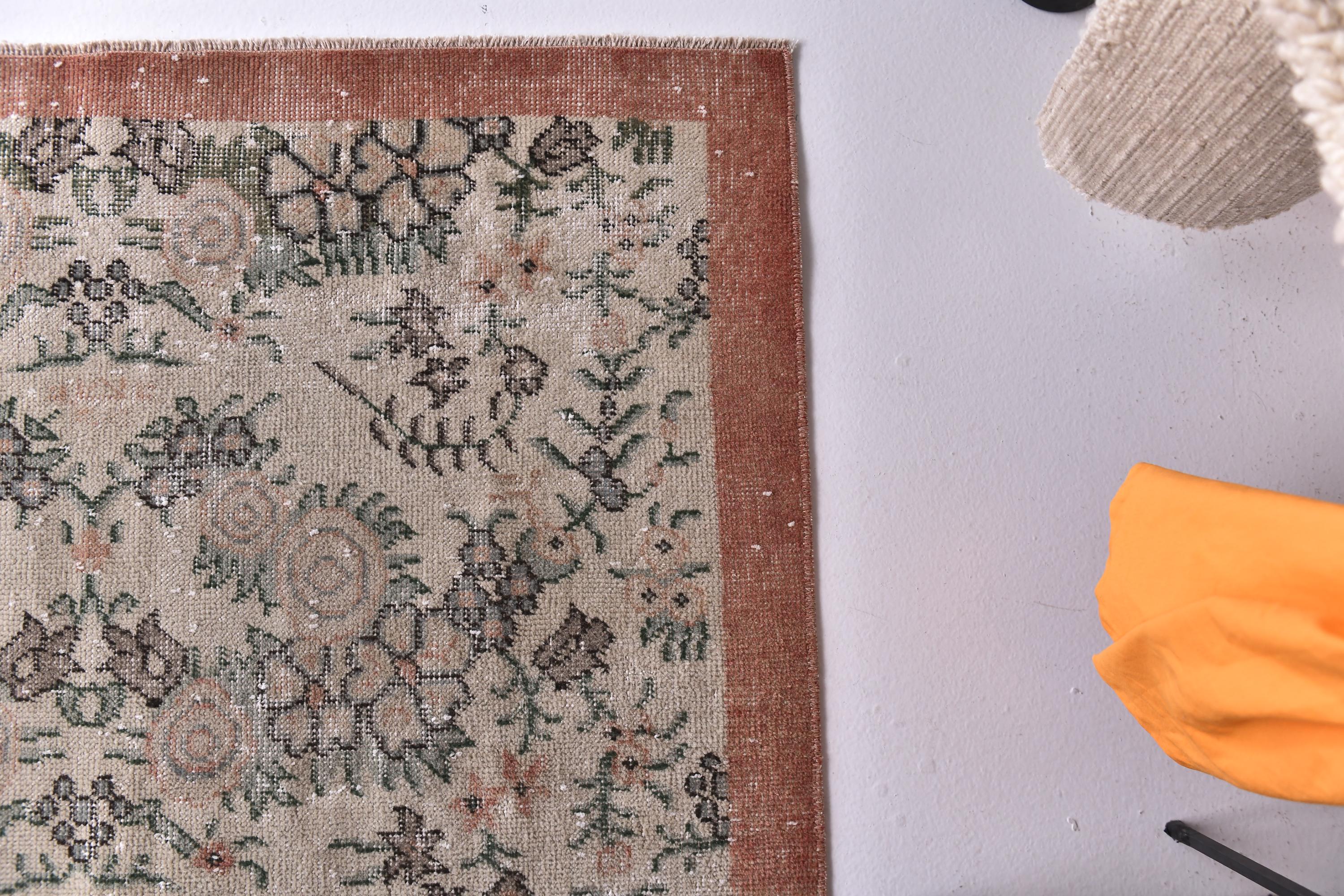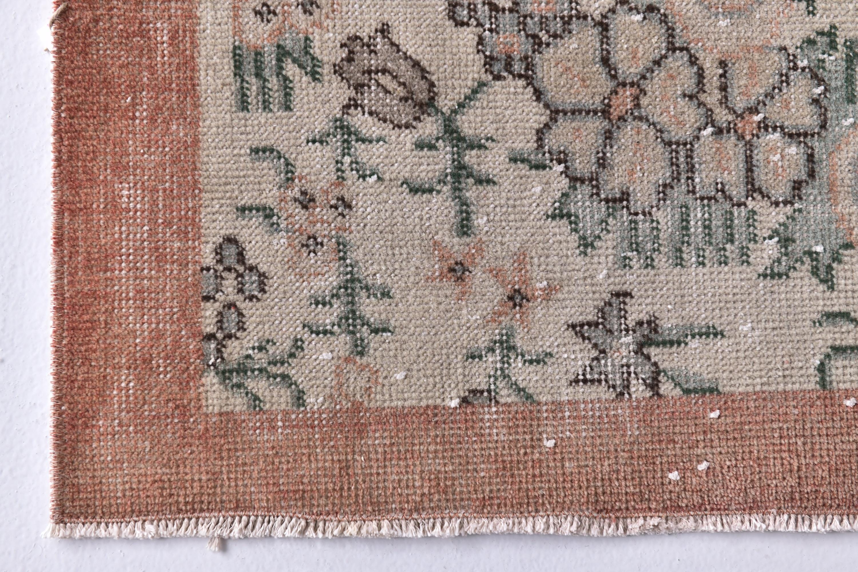 📜📌 Vintage distressed Turkish area rug featuring intricate floral and botanical motifs in faded sage green, beige, and charcoal tones on a neutral field, framed by a terracotta rust-colored border with traditional Oriental patterns