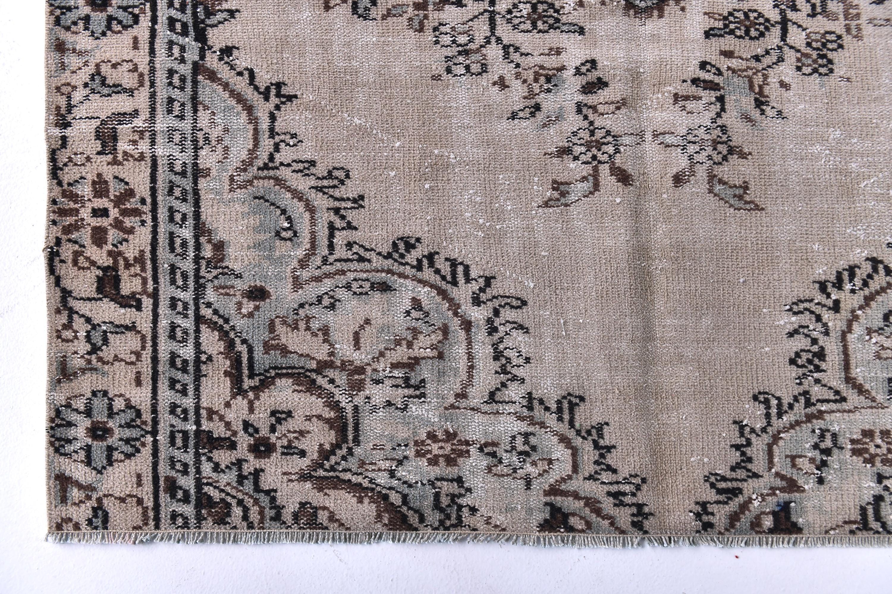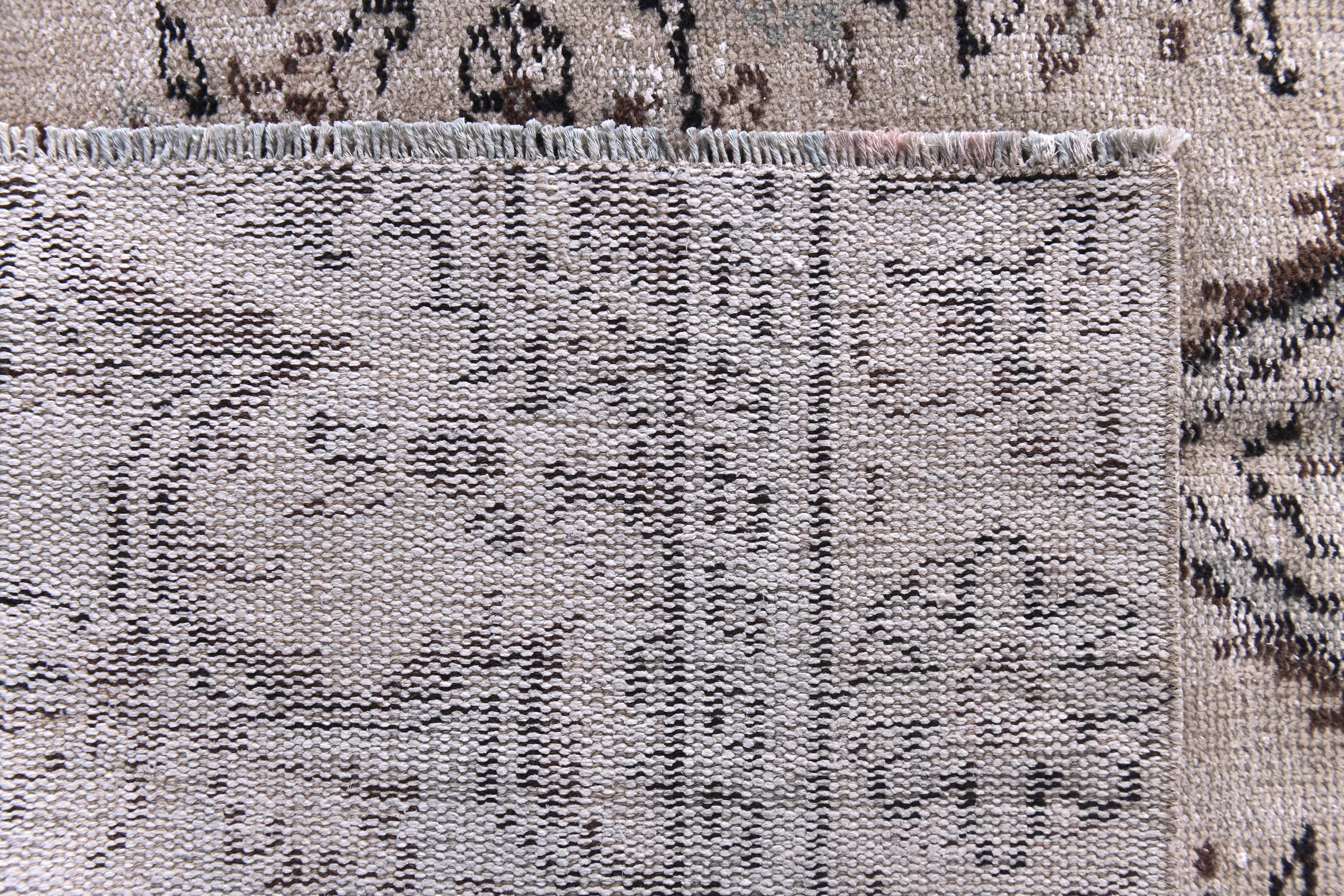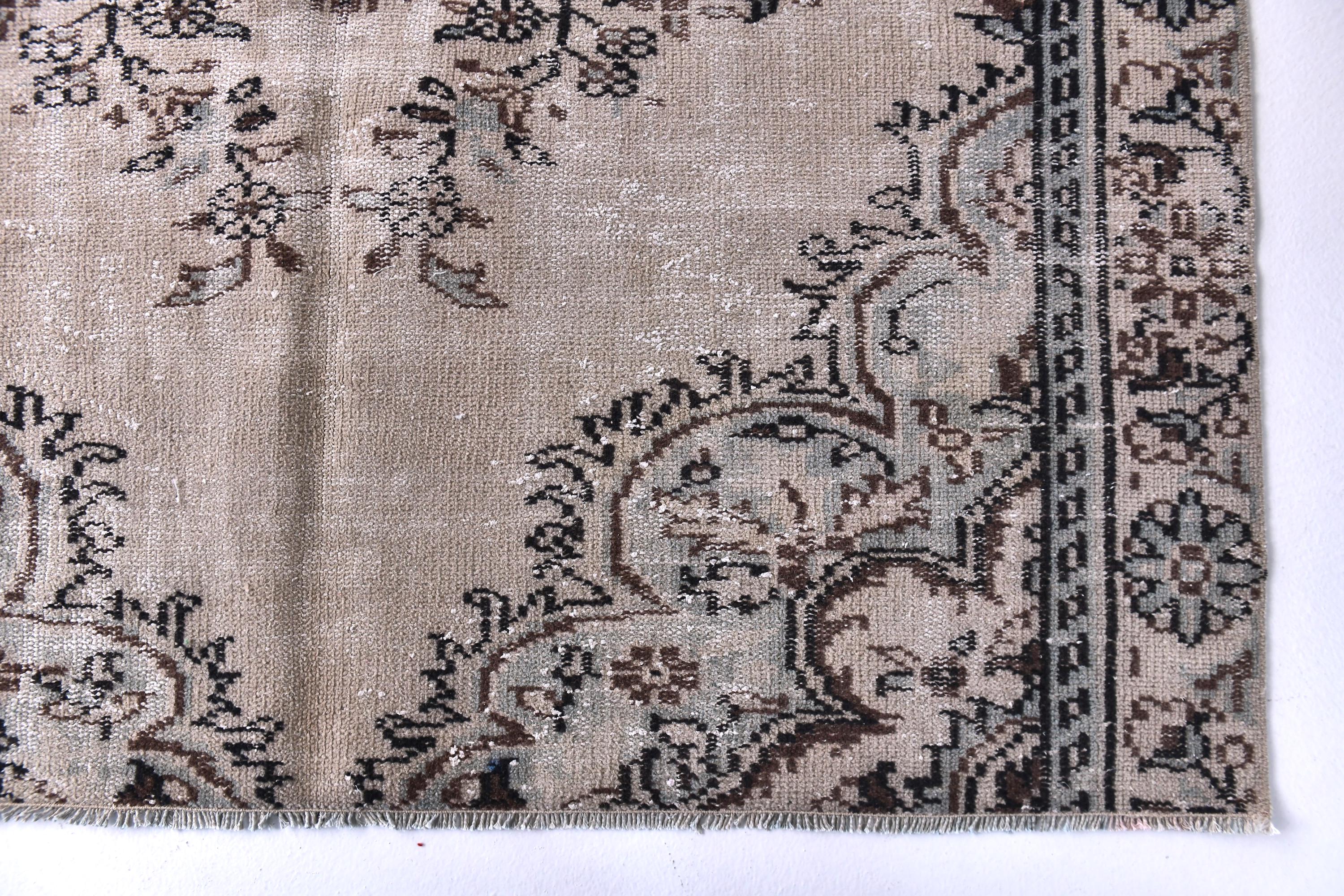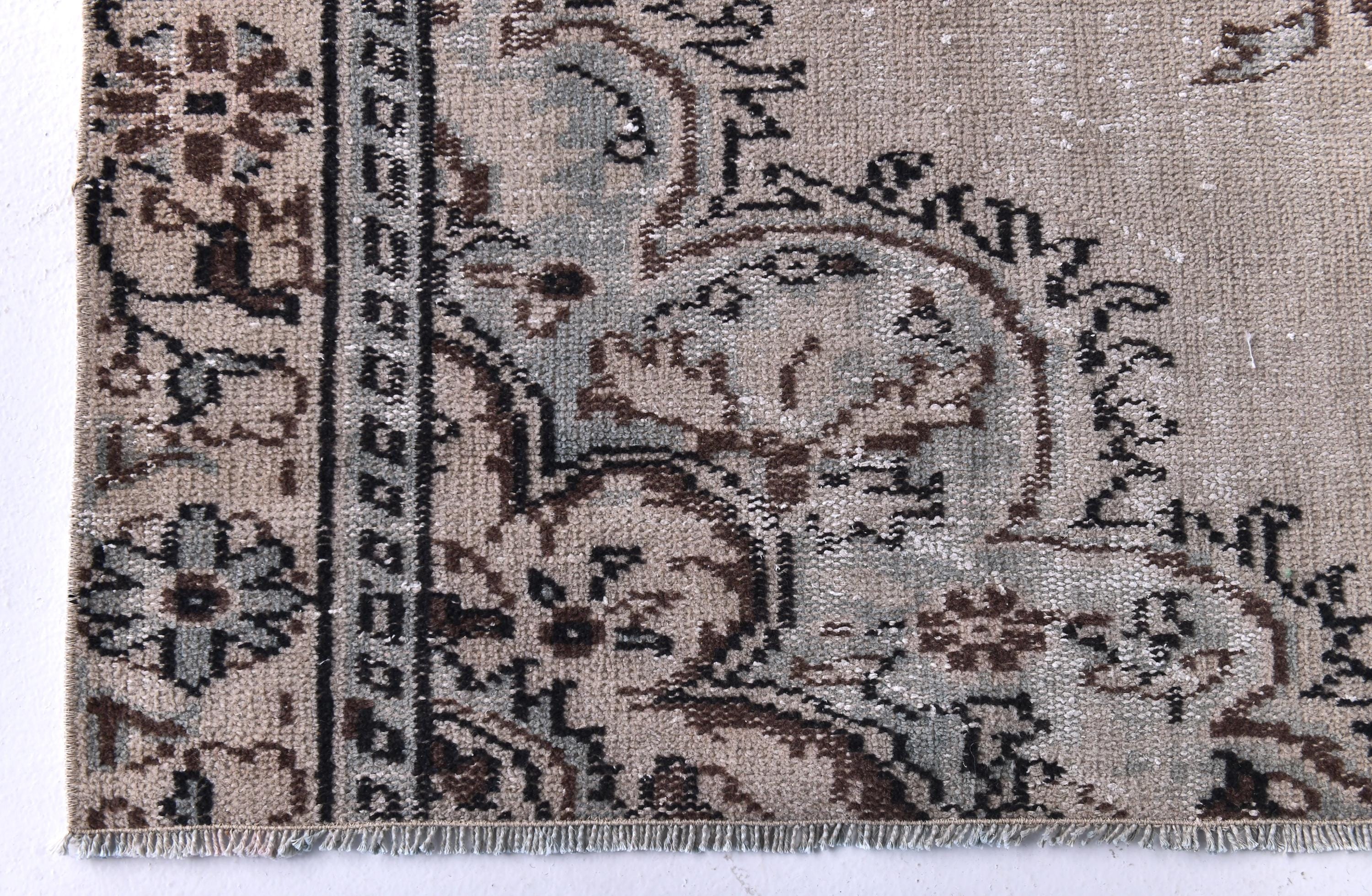 📜📌 Distressed gray vintage Turkish rug with faded beige tones, showcasing elaborate floral medallions and scrollwork motifs with decorative border, hand-knotted oriental rug with worn patina finish for modern bohemian interior design