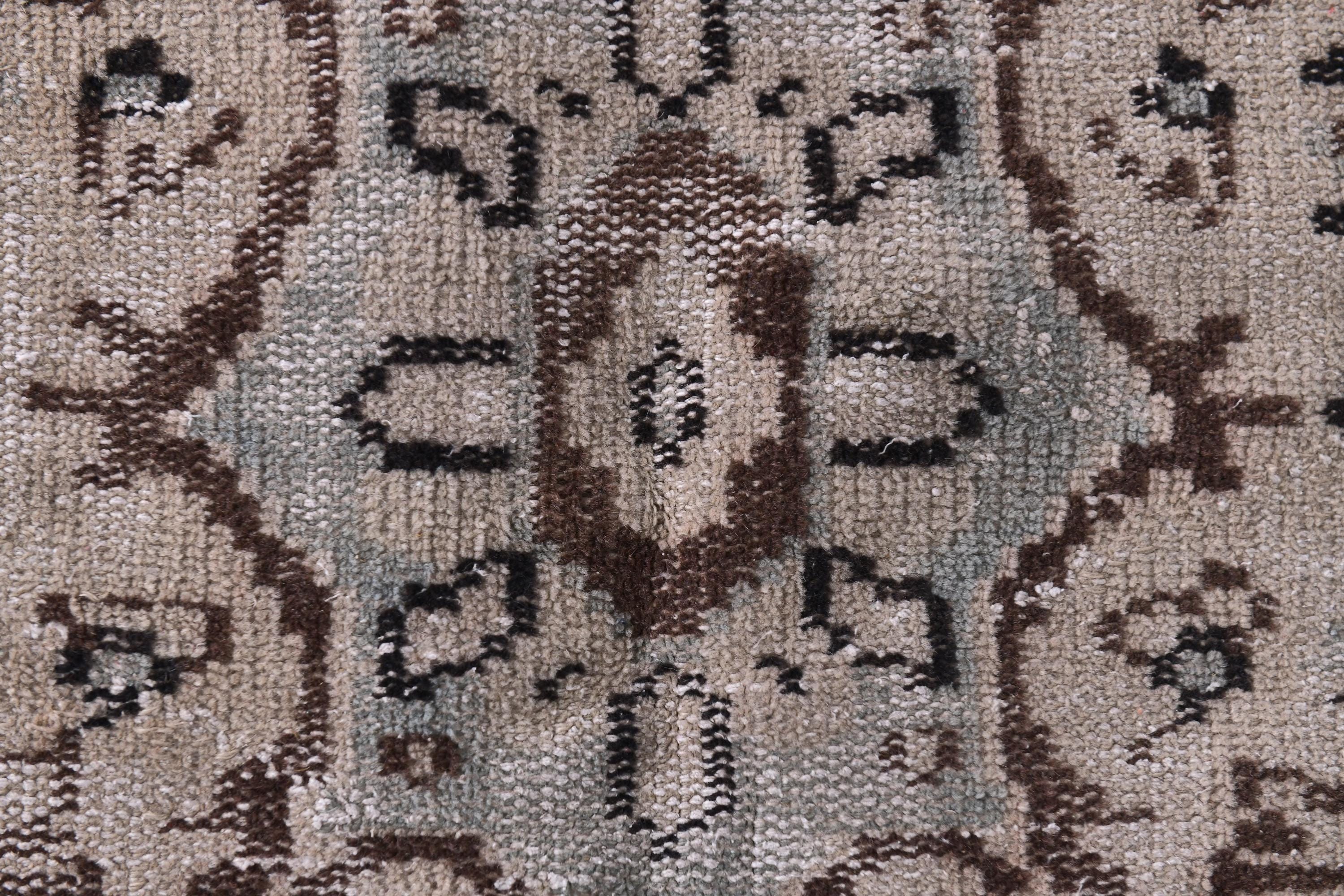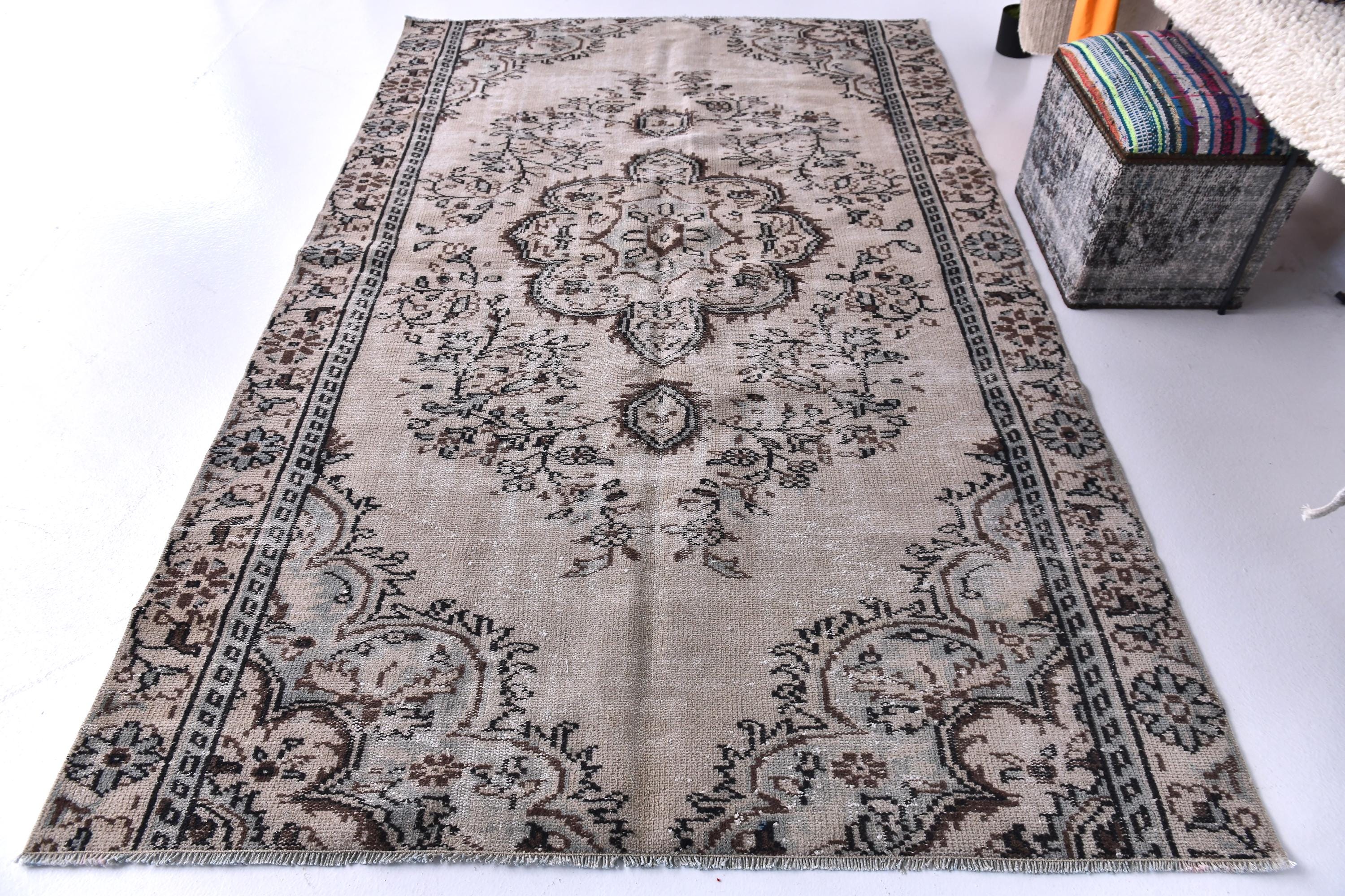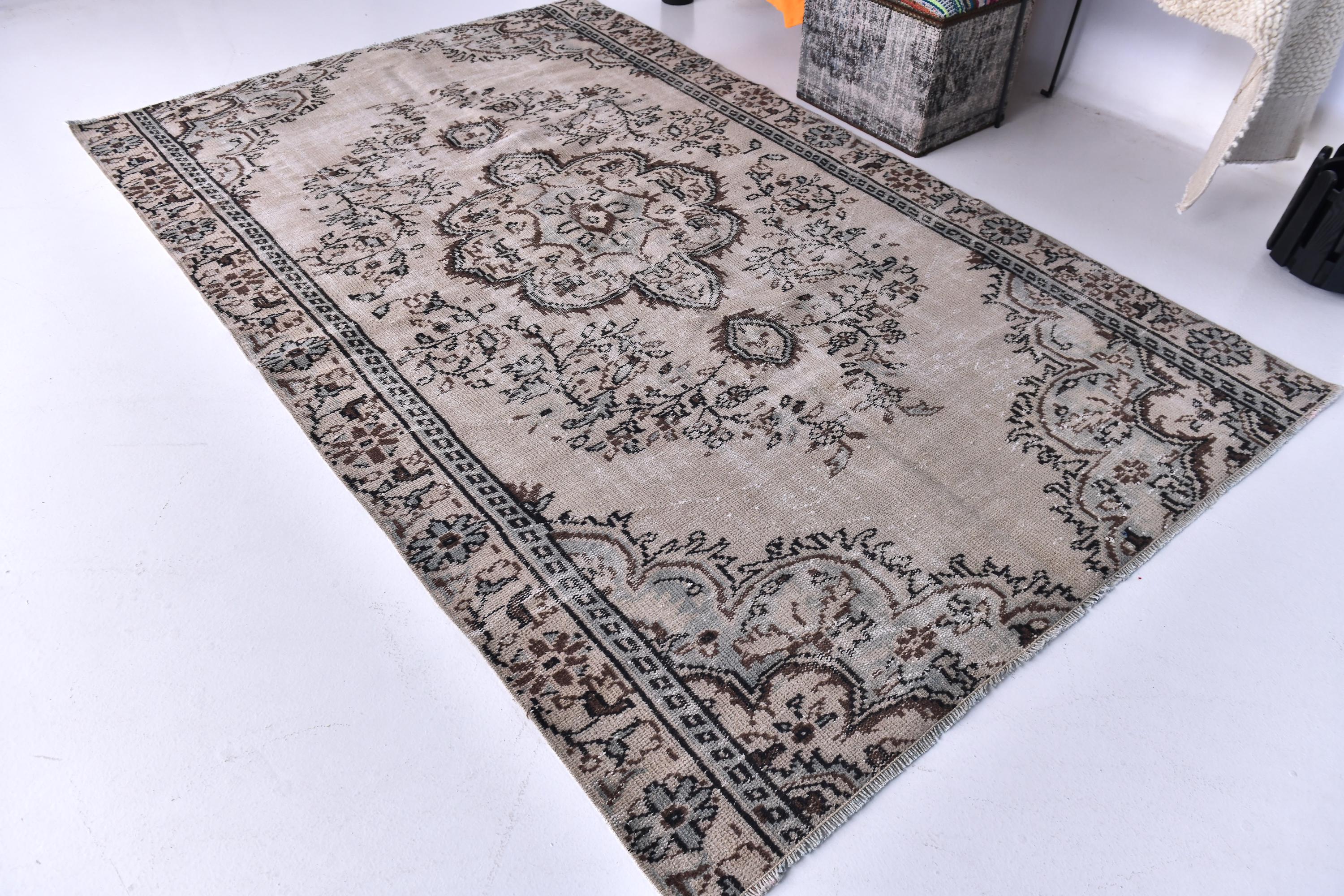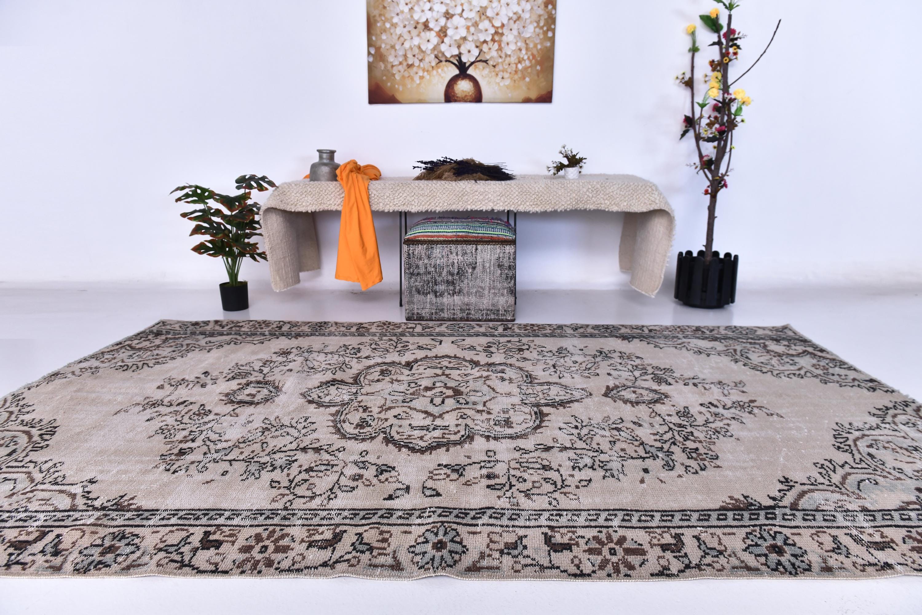 📜📌 Distressed gray vintage Turkish rug with faded beige tones, showcasing elaborate floral medallions and scrollwork motifs with decorative border, hand-knotted oriental rug with worn patina finish for modern bohemian interior design
