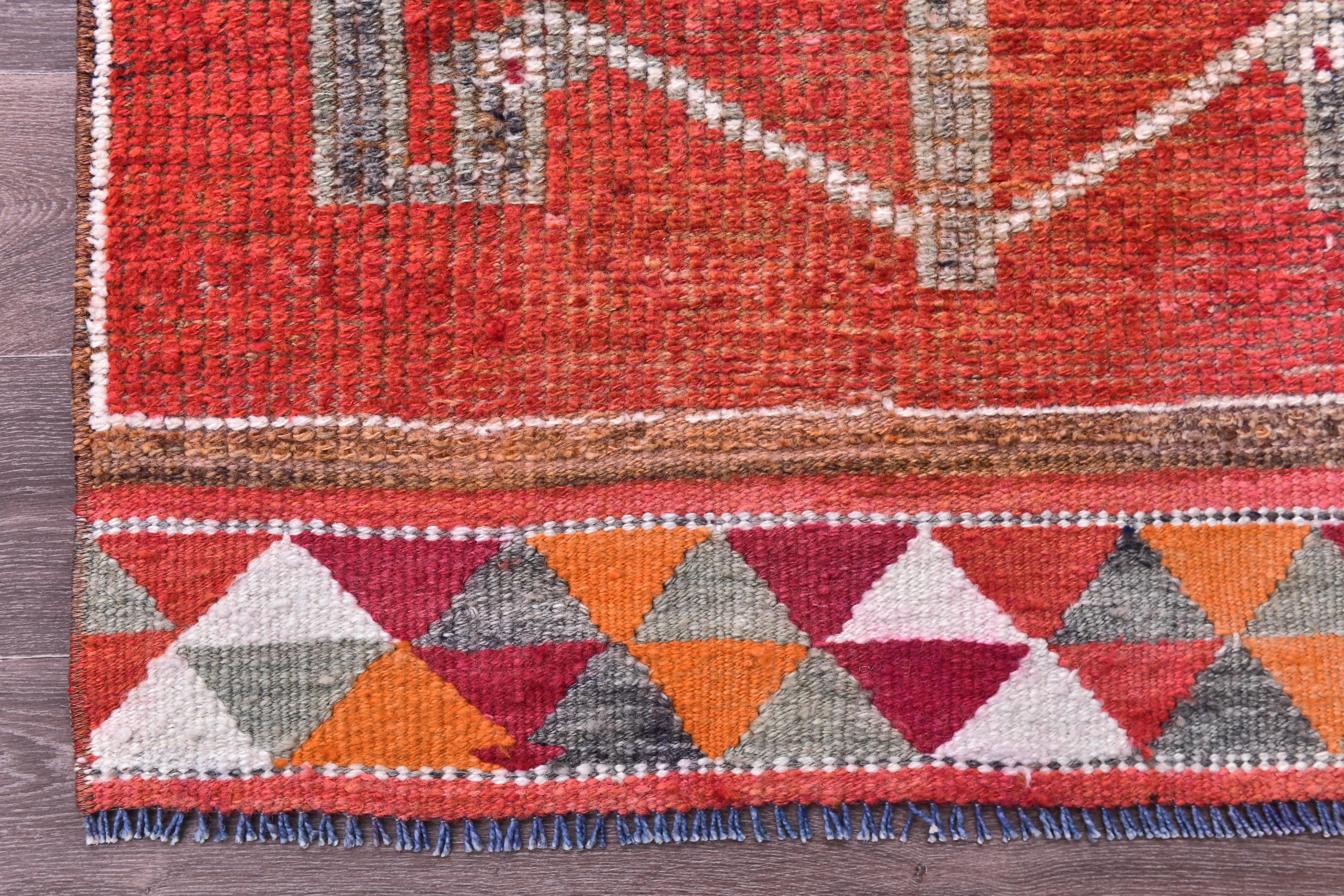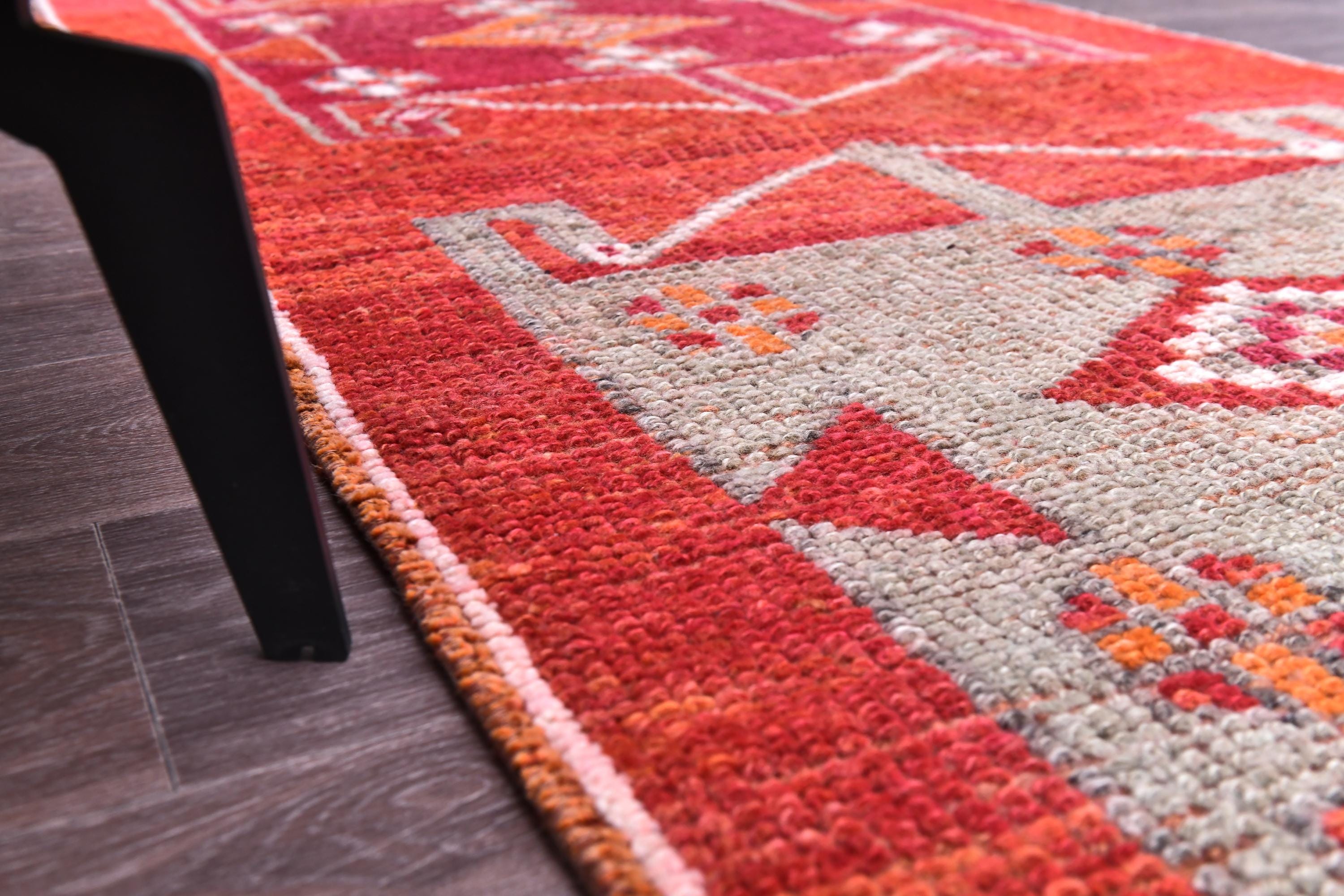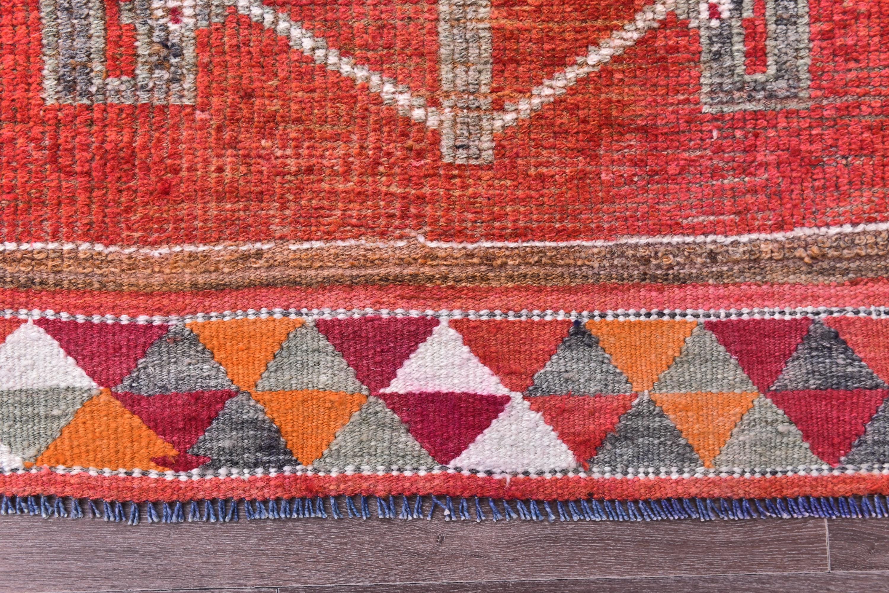 📜📌 Handmade Anatolian runner rug with vibrant red-orange field, three geometric medallion sections in gray and magenta, white outlined diamond motifs, colorful triangular kilim-style border, blue knotted fringe, placed in modern living room setting