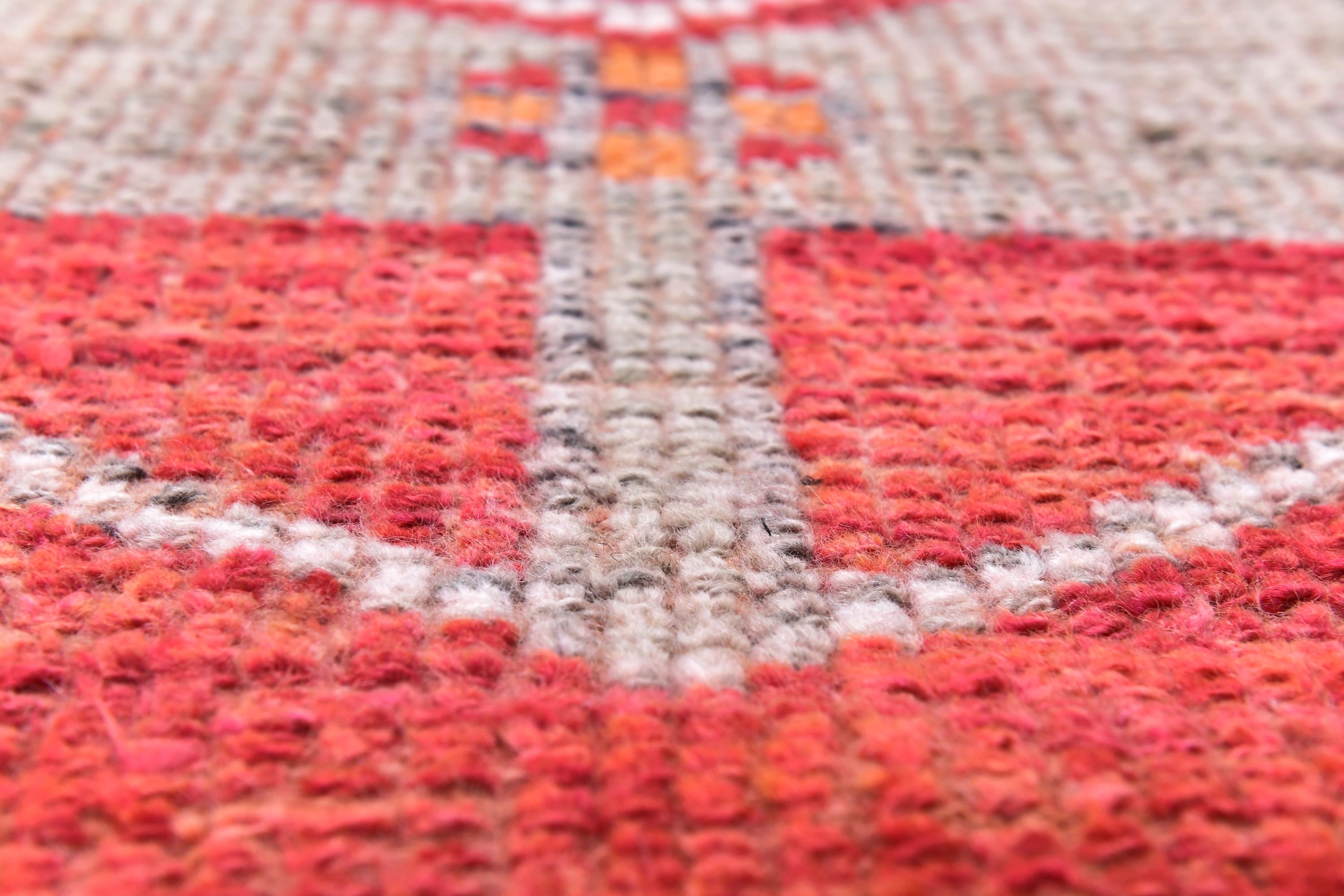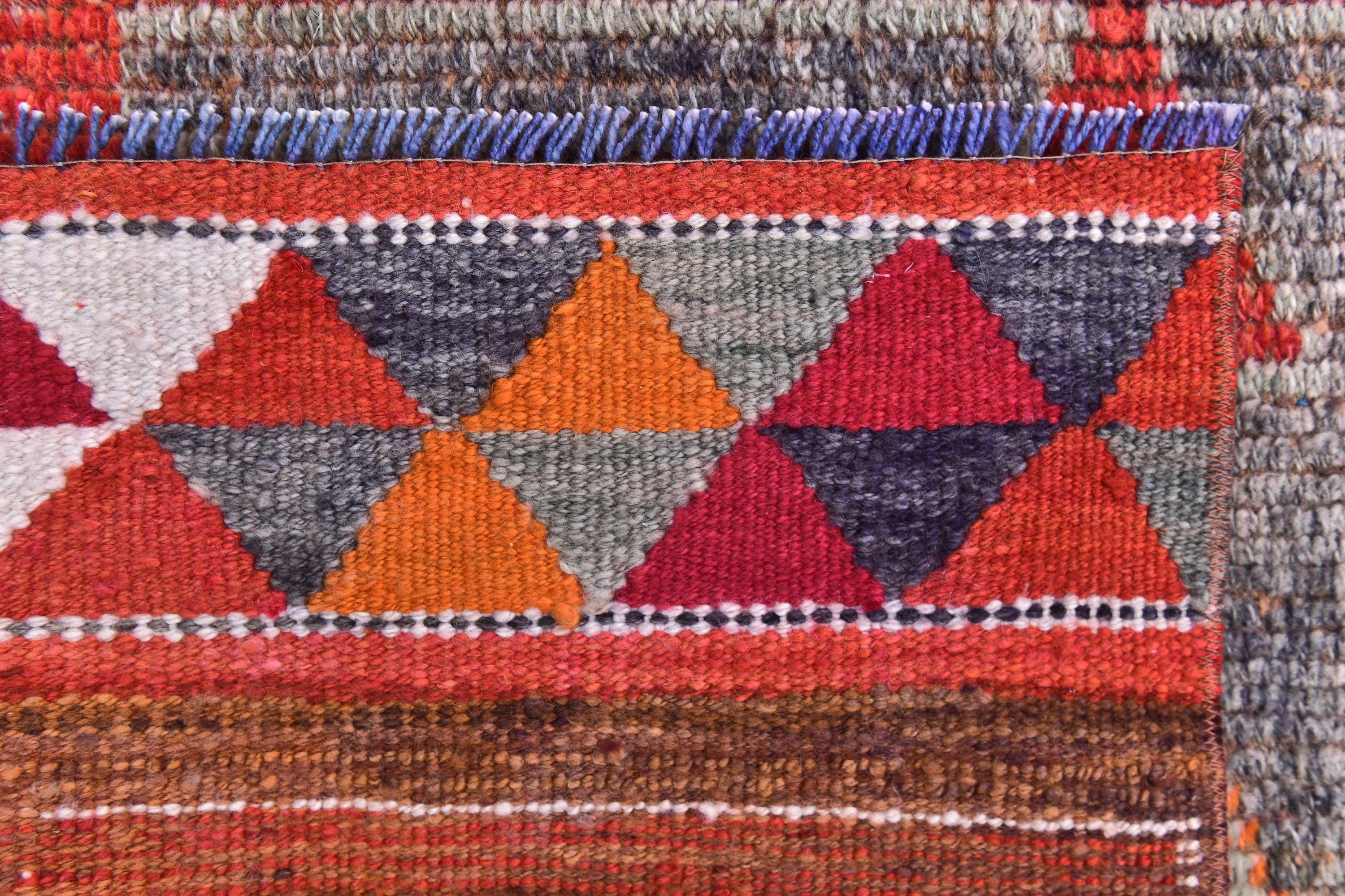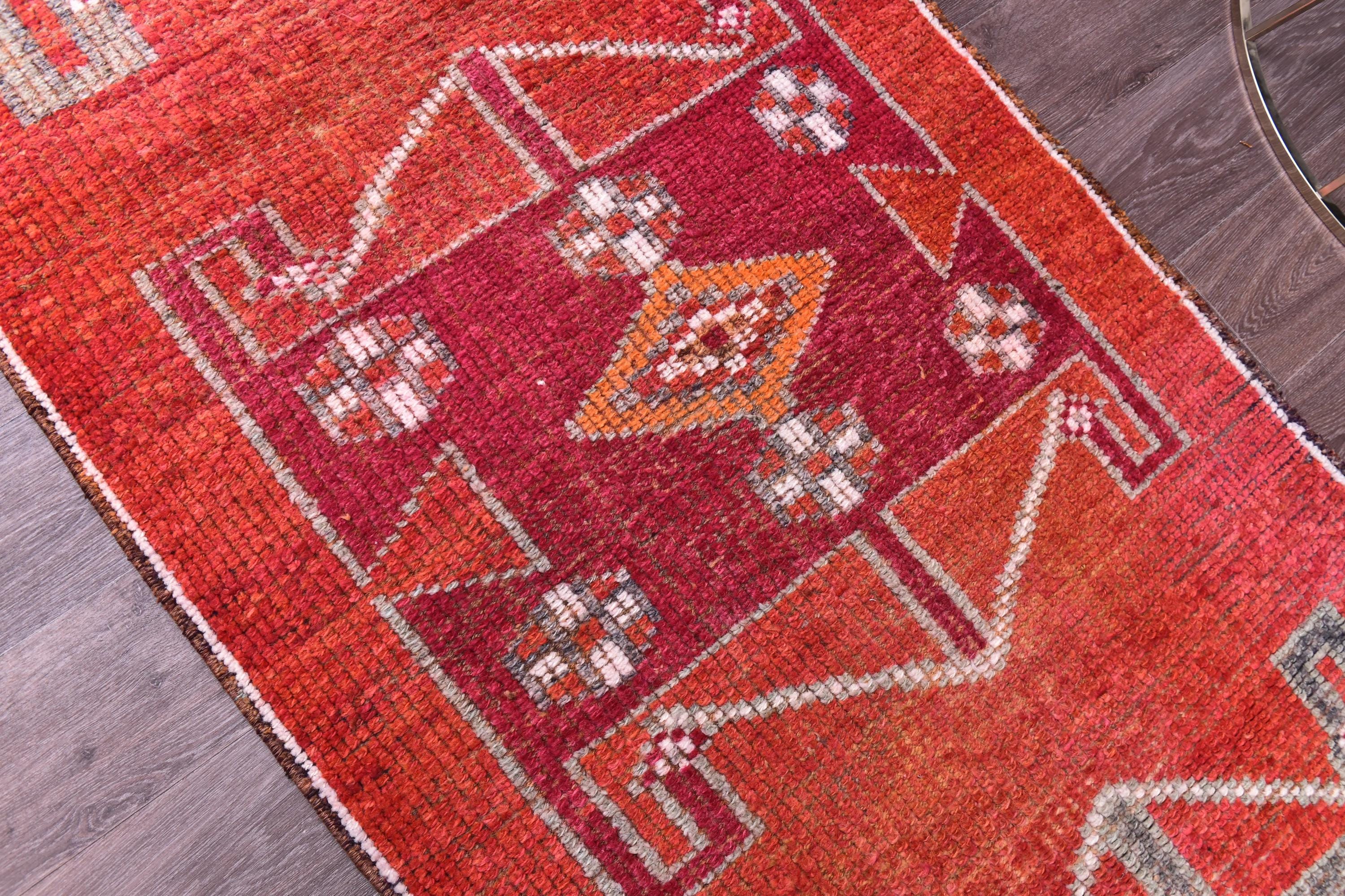 📜📌 Handmade Anatolian runner rug with vibrant red-orange field, three geometric medallion sections in gray and magenta, white outlined diamond motifs, colorful triangular kilim-style border, blue knotted fringe, placed in modern living room setting