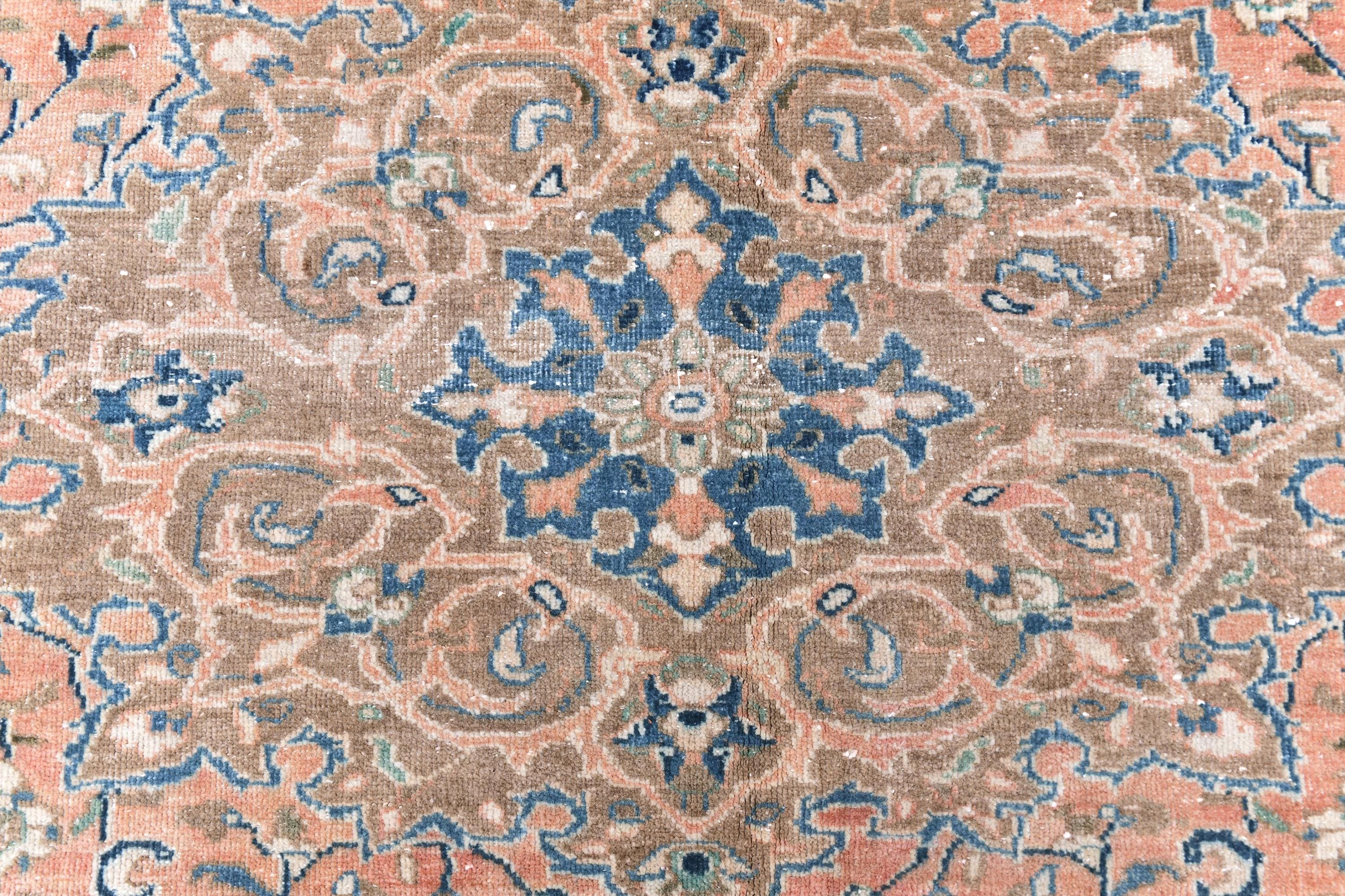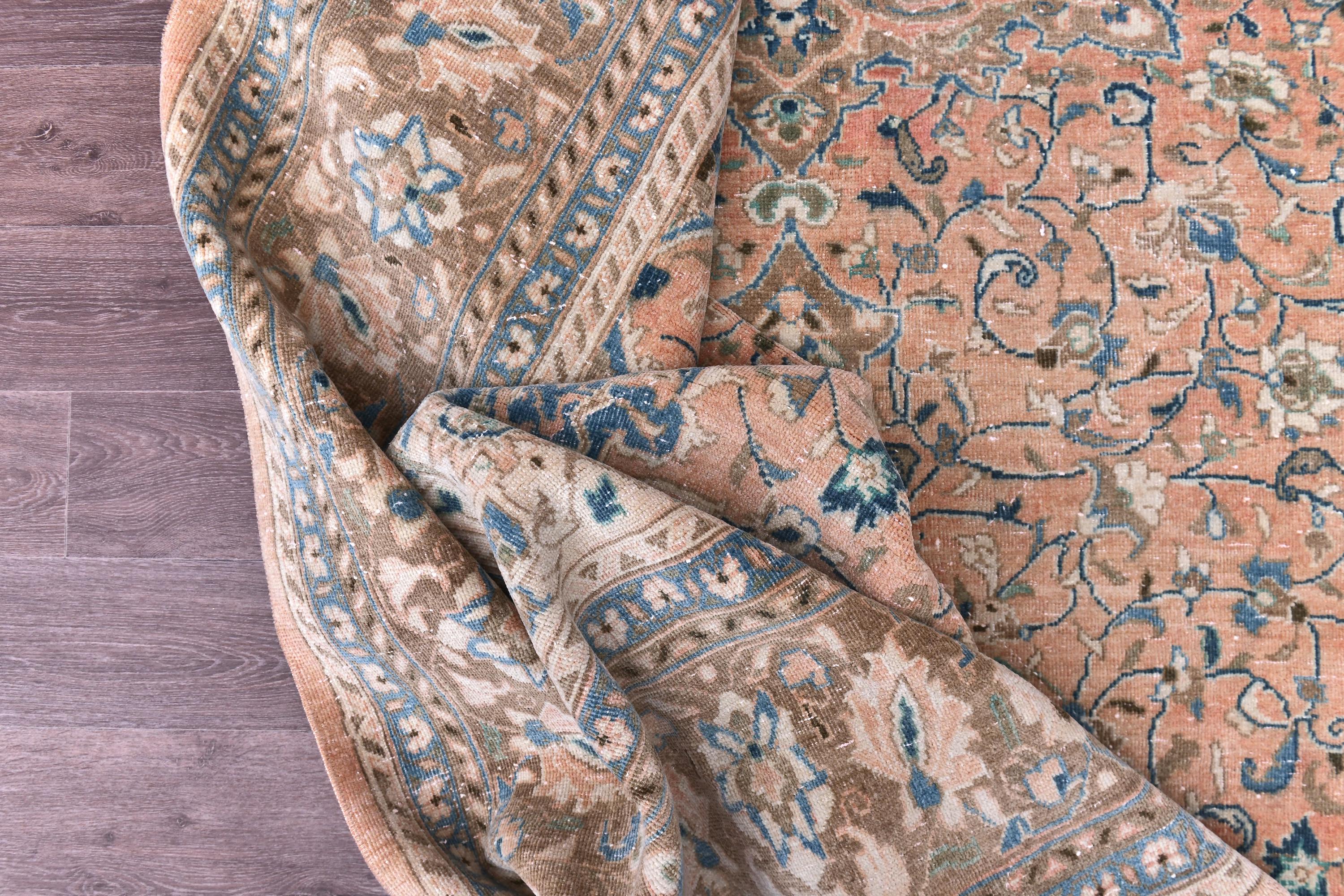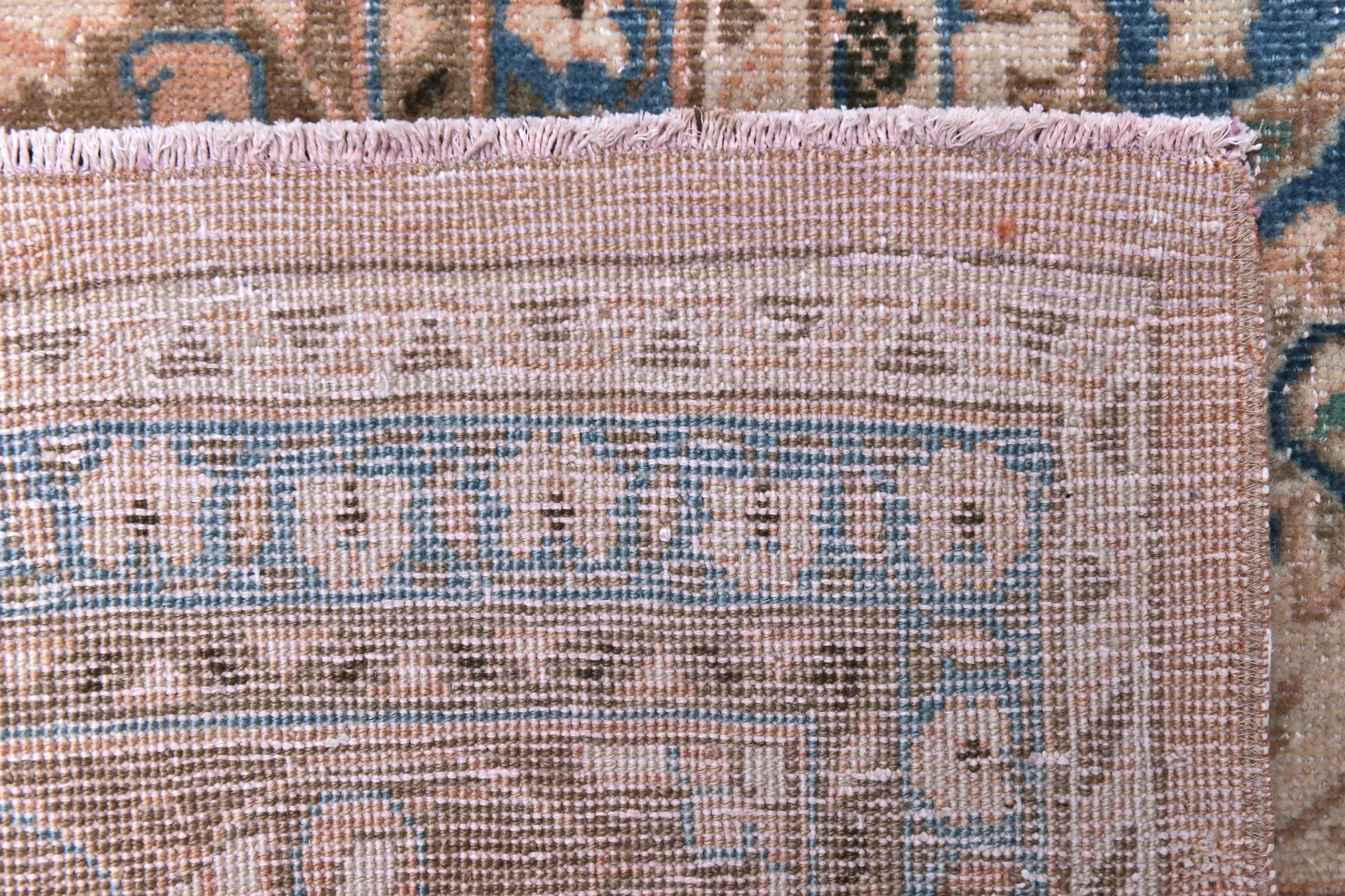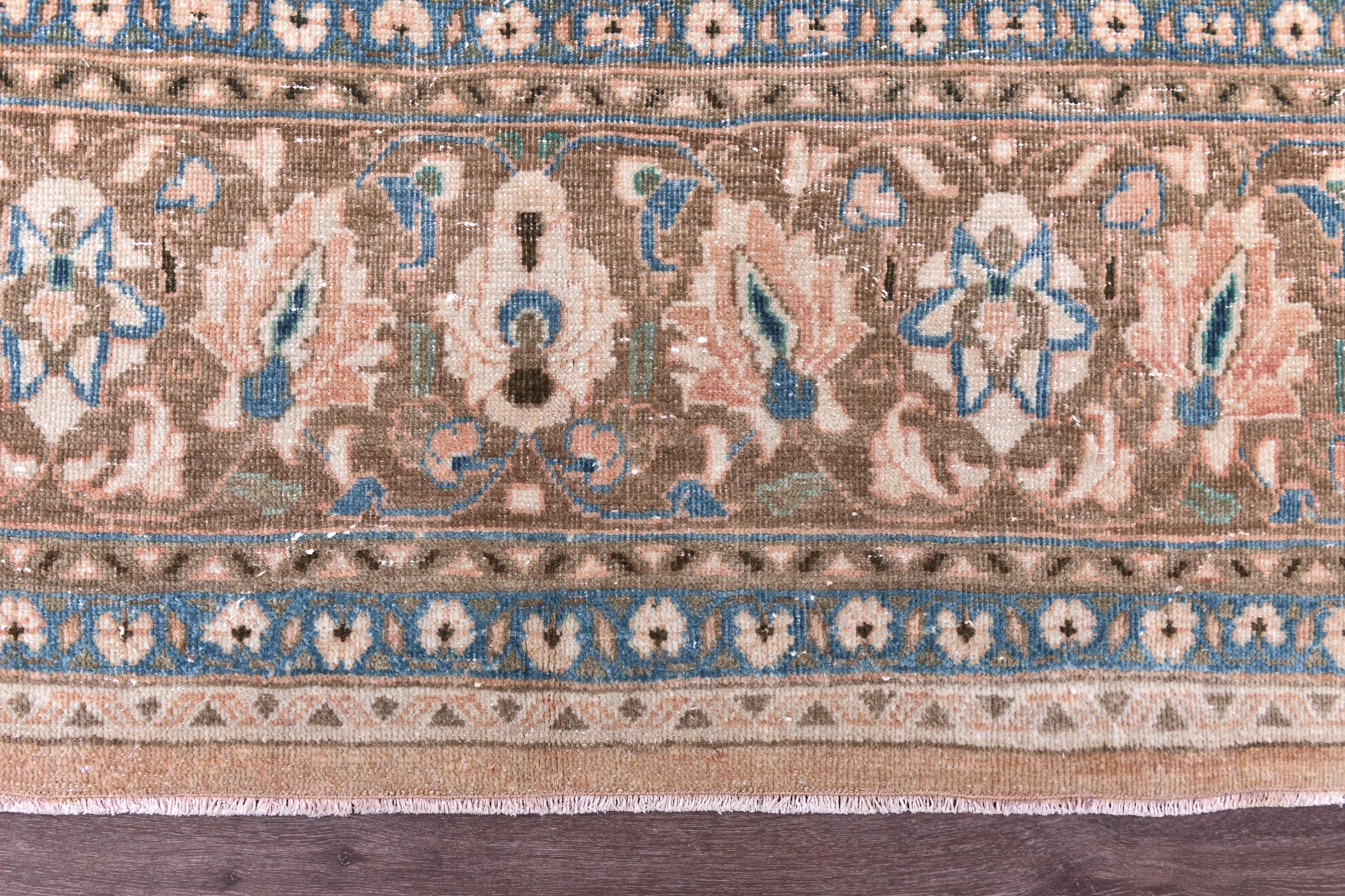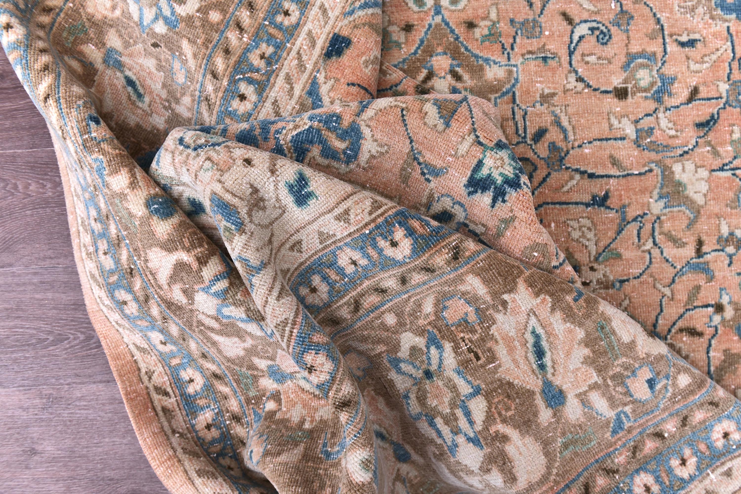 📜📌 Antique handmade Persian wool rug with warm peach salmon field covered in intricate blue and ivory floral scroll design, central medallion-style all-over botanical pattern, wide decorative border in taupe and cream with repeating floral and palmette motifs, sky blue guard stripes, faded vintage character