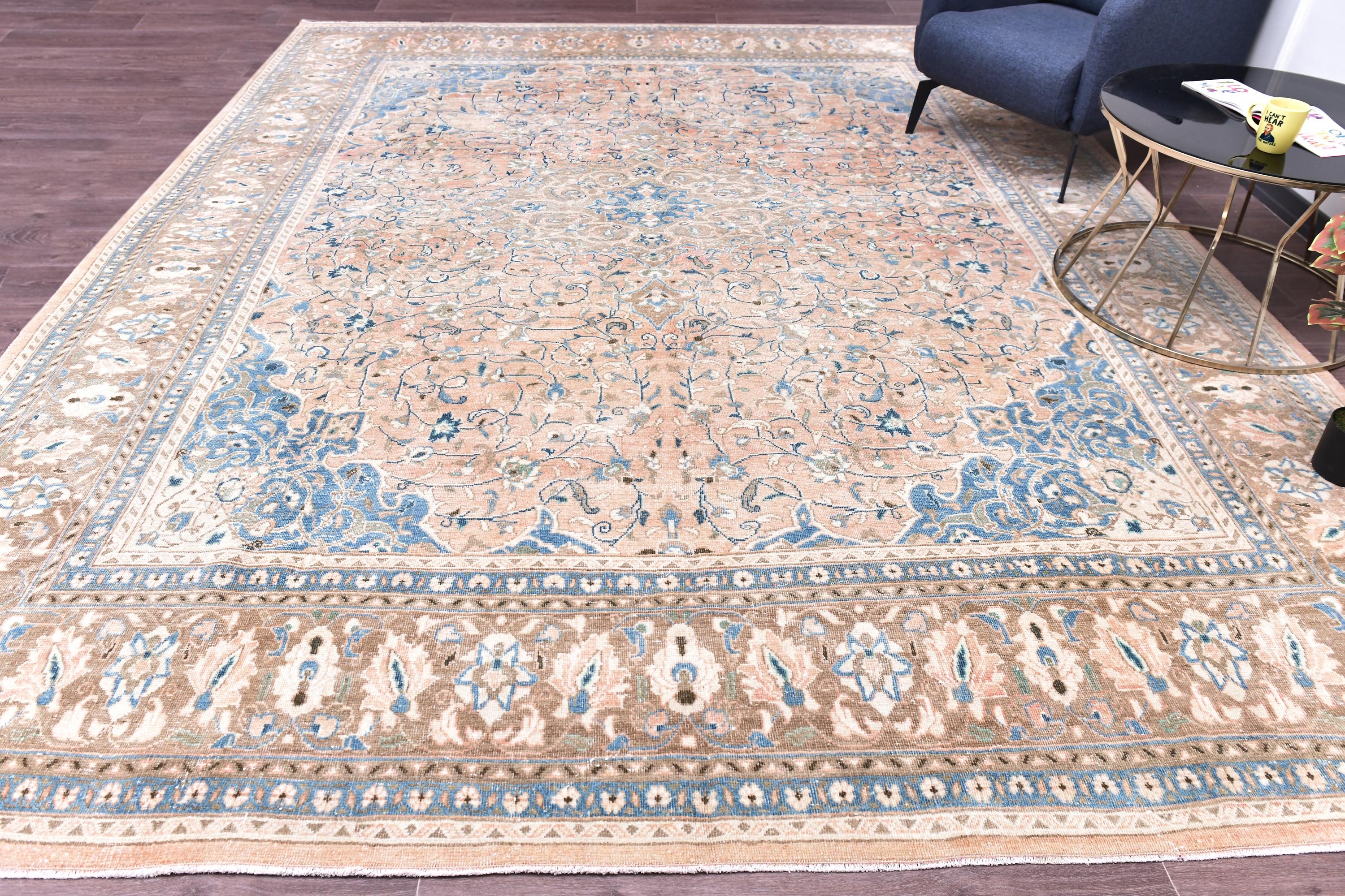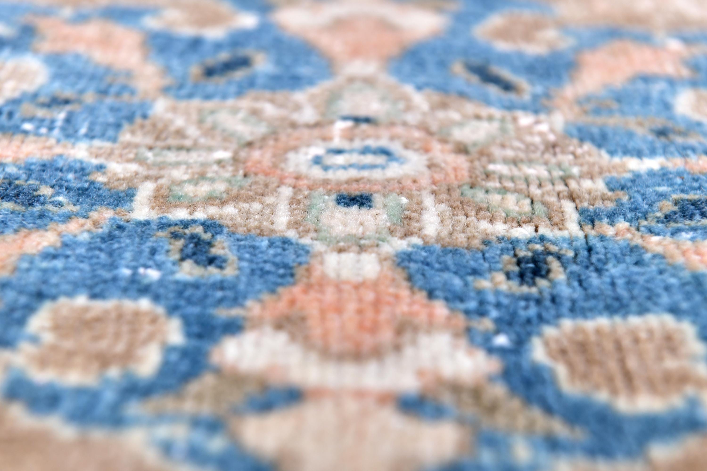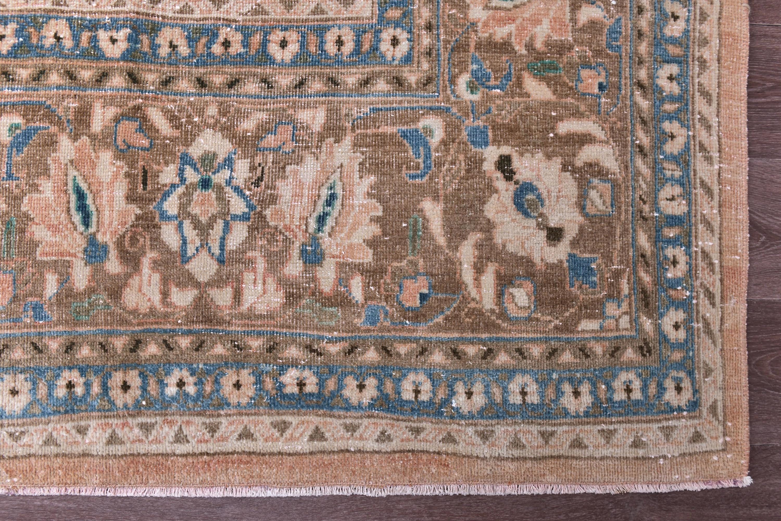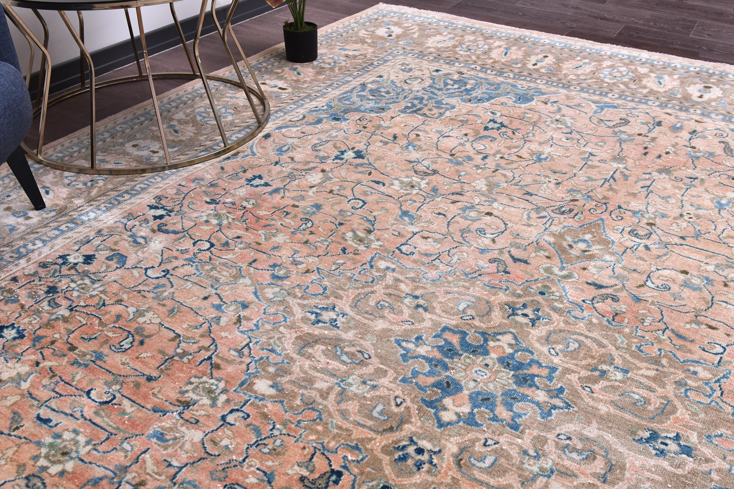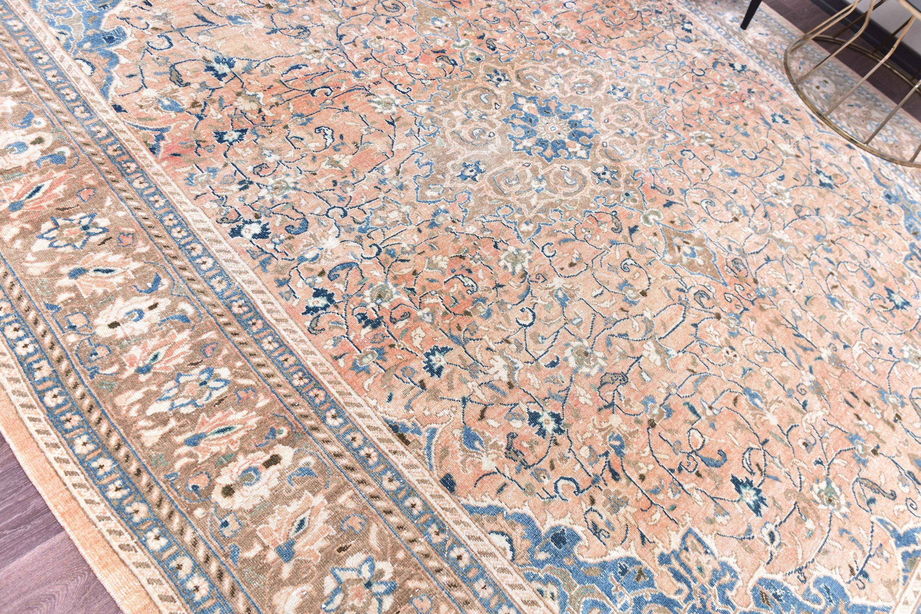 📜📌 Antique handmade Persian wool rug with warm peach salmon field covered in intricate blue and ivory floral scroll design, central medallion-style all-over botanical pattern, wide decorative border in taupe and cream with repeating floral and palmette motifs, sky blue guard stripes, faded vintage character