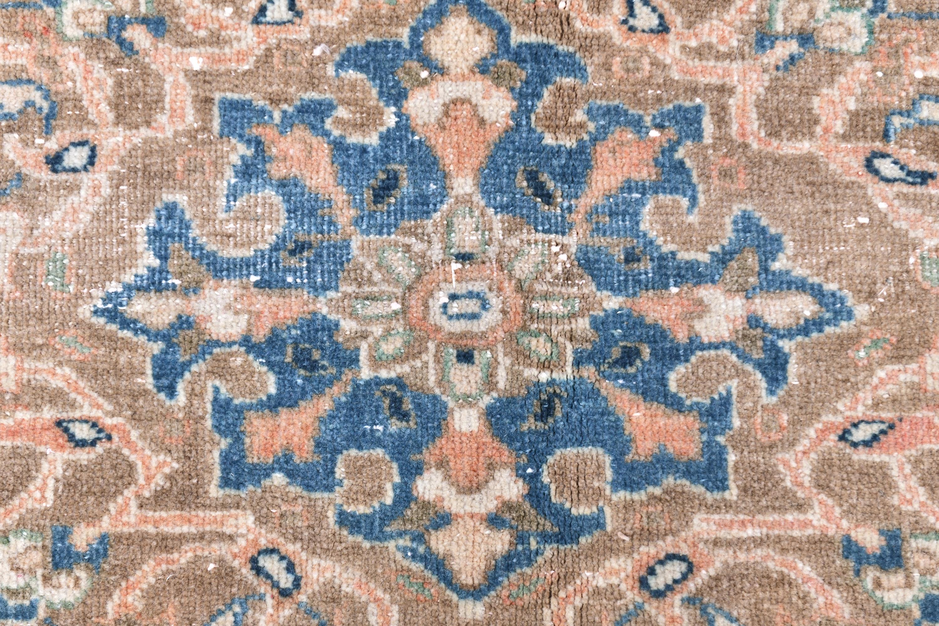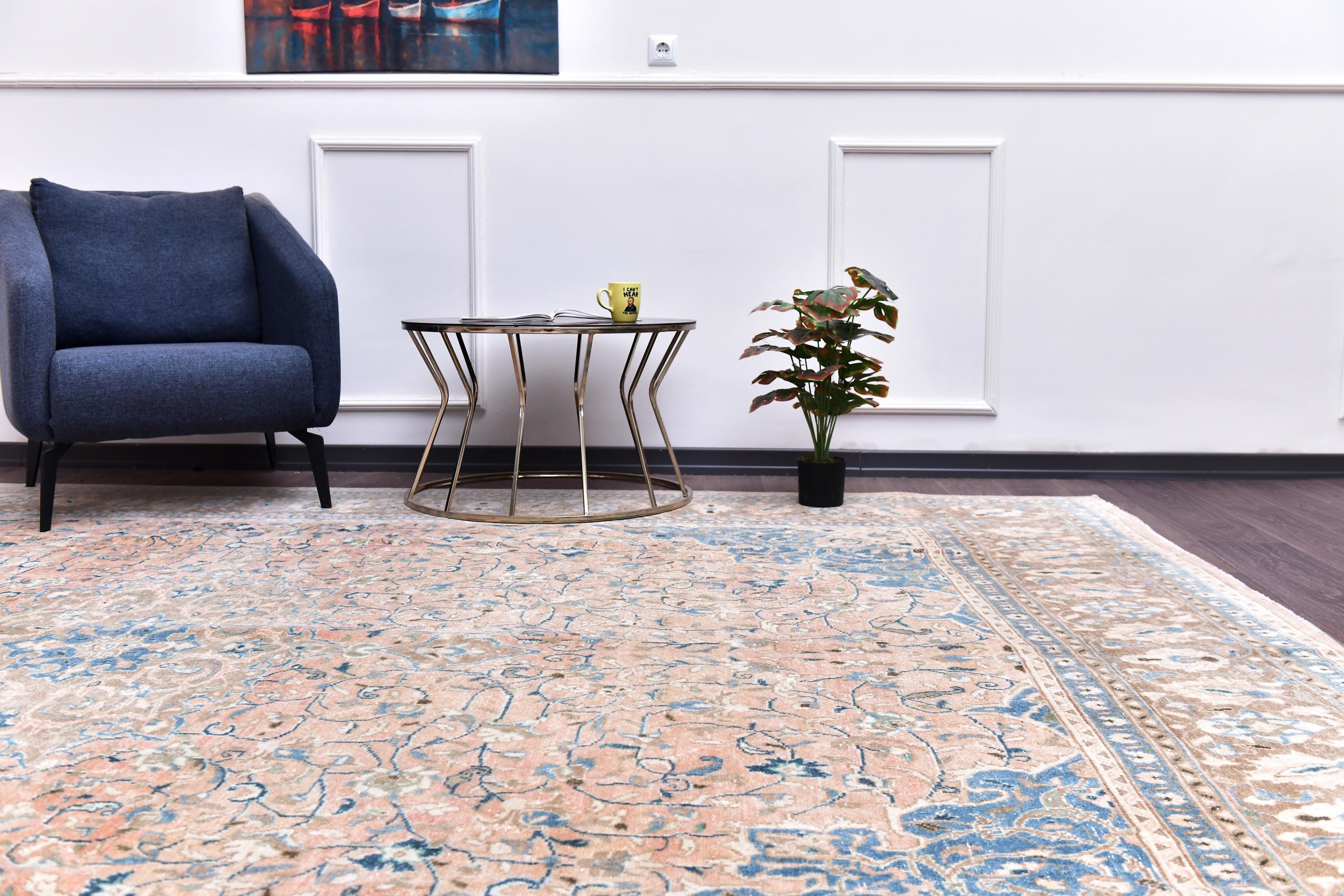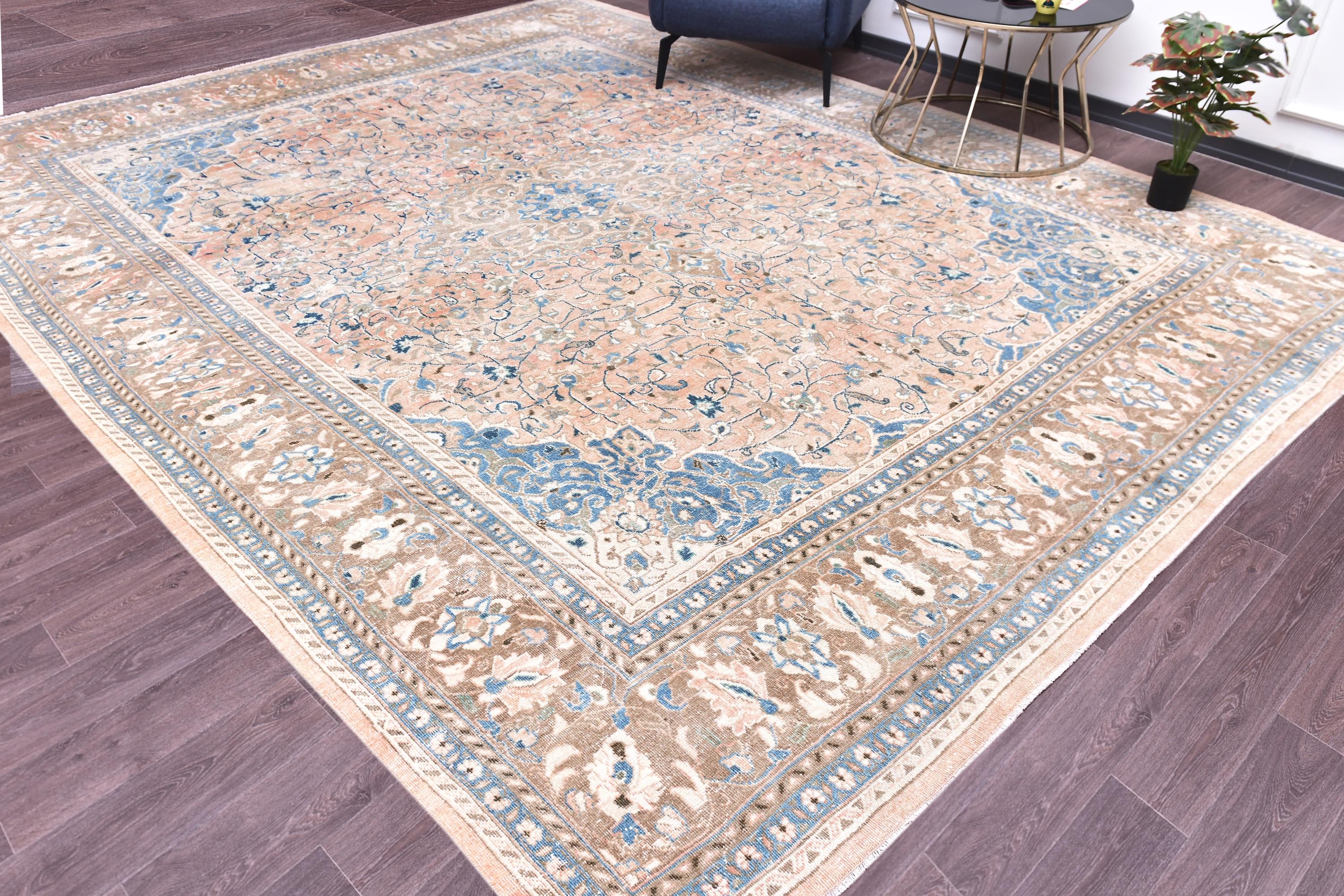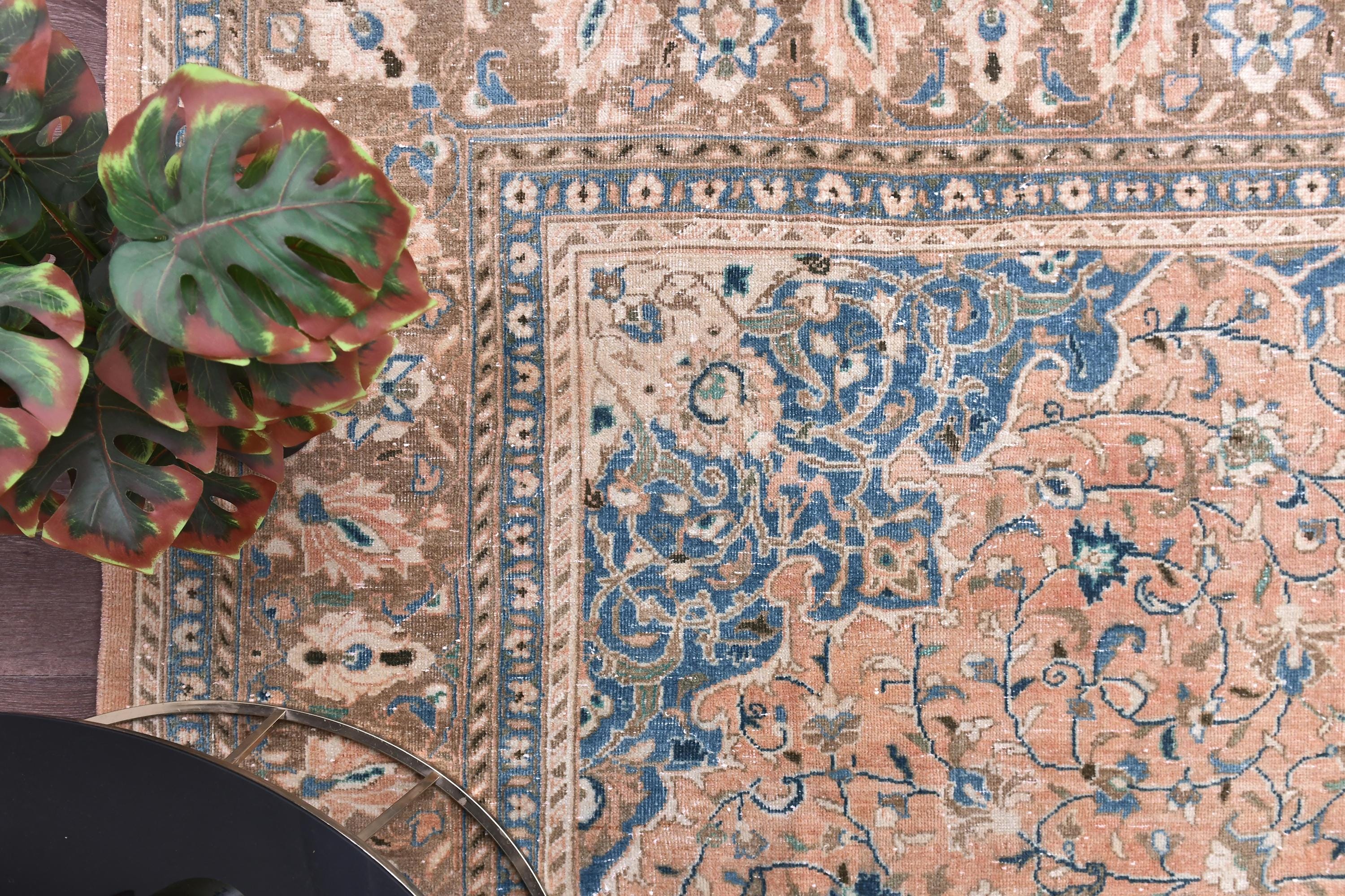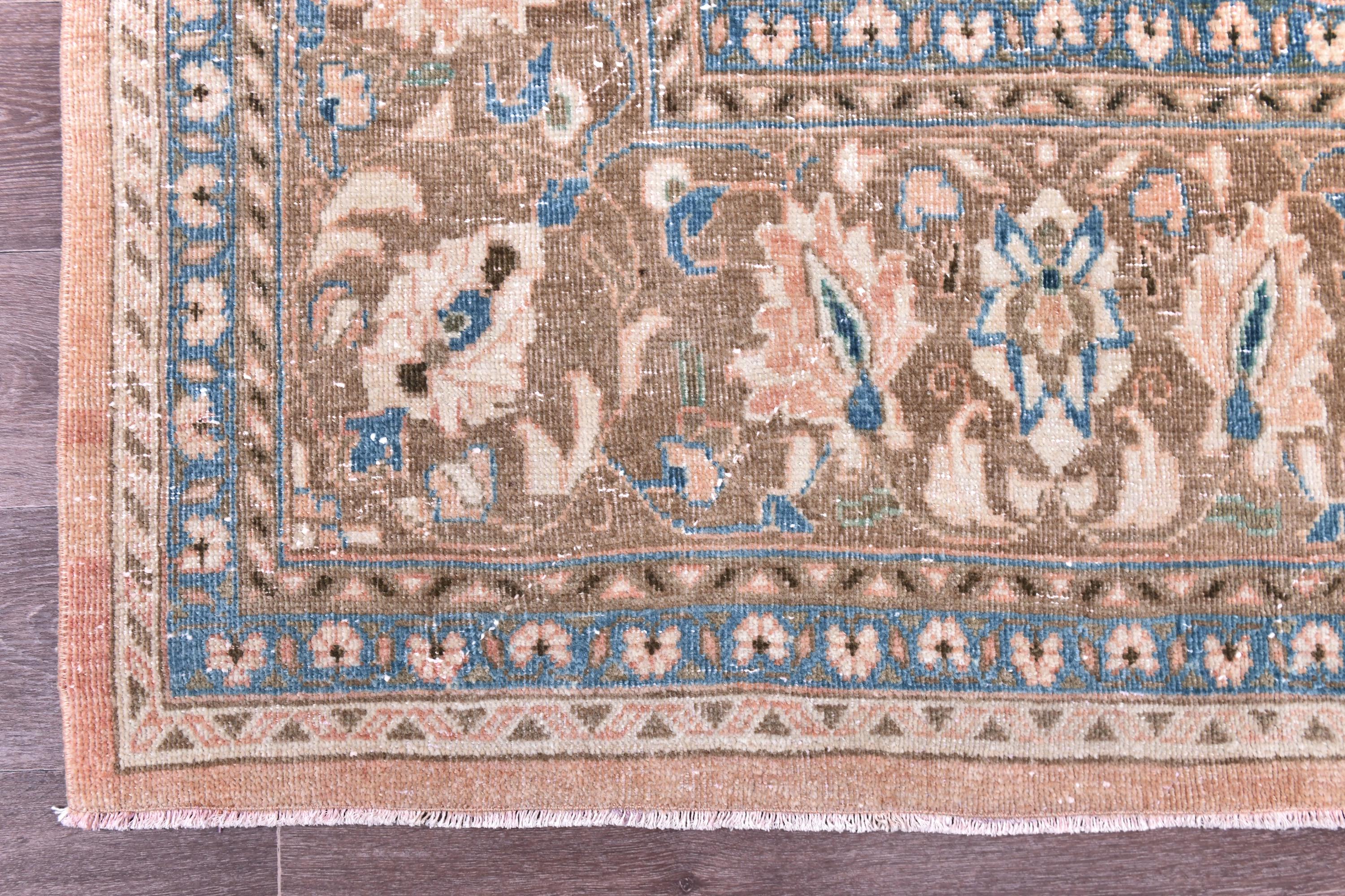 📜📌 Antique handmade Persian wool rug with warm peach salmon field covered in intricate blue and ivory floral scroll design, central medallion-style all-over botanical pattern, wide decorative border in taupe and cream with repeating floral and palmette motifs, sky blue guard stripes, faded vintage character