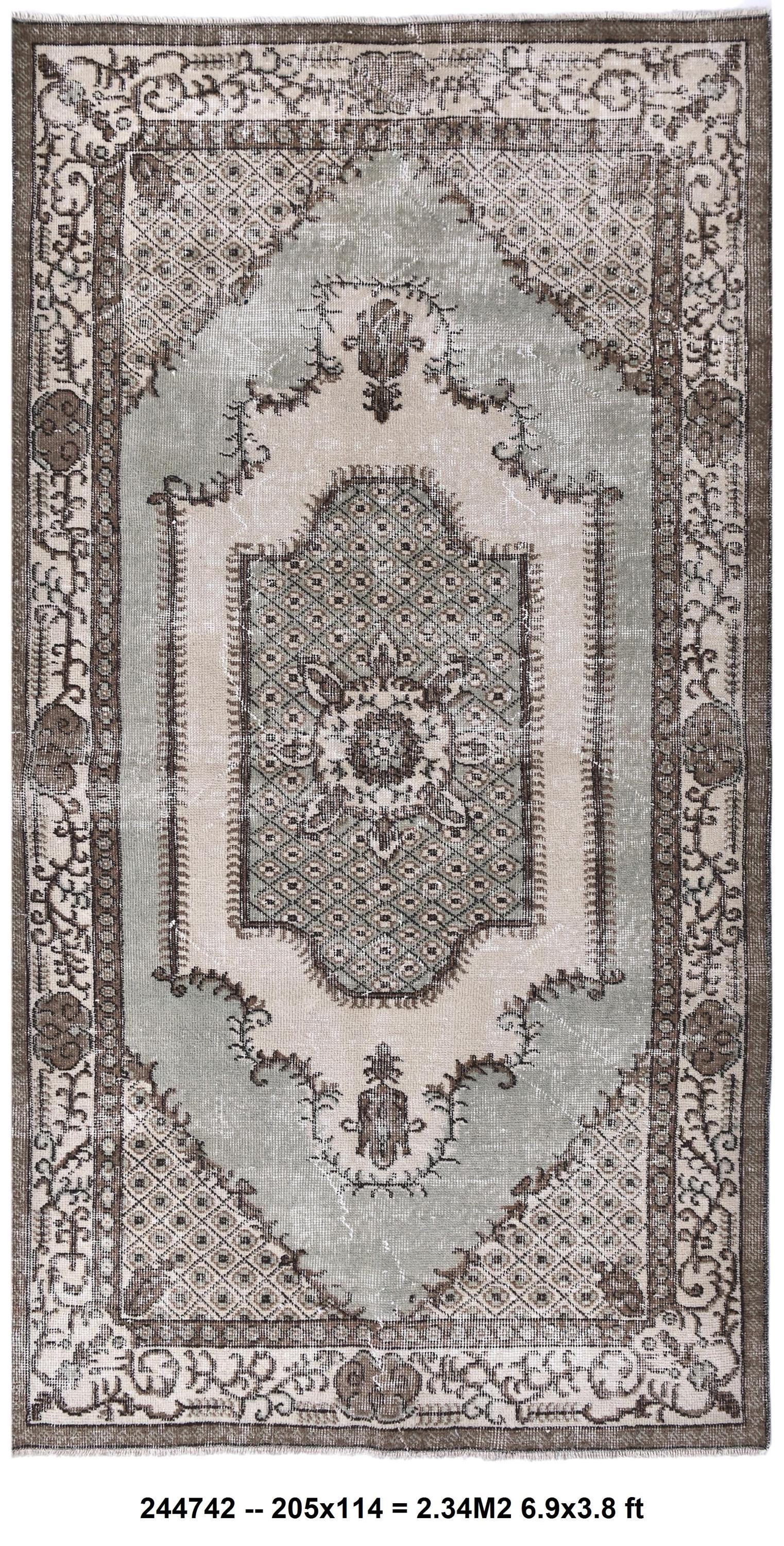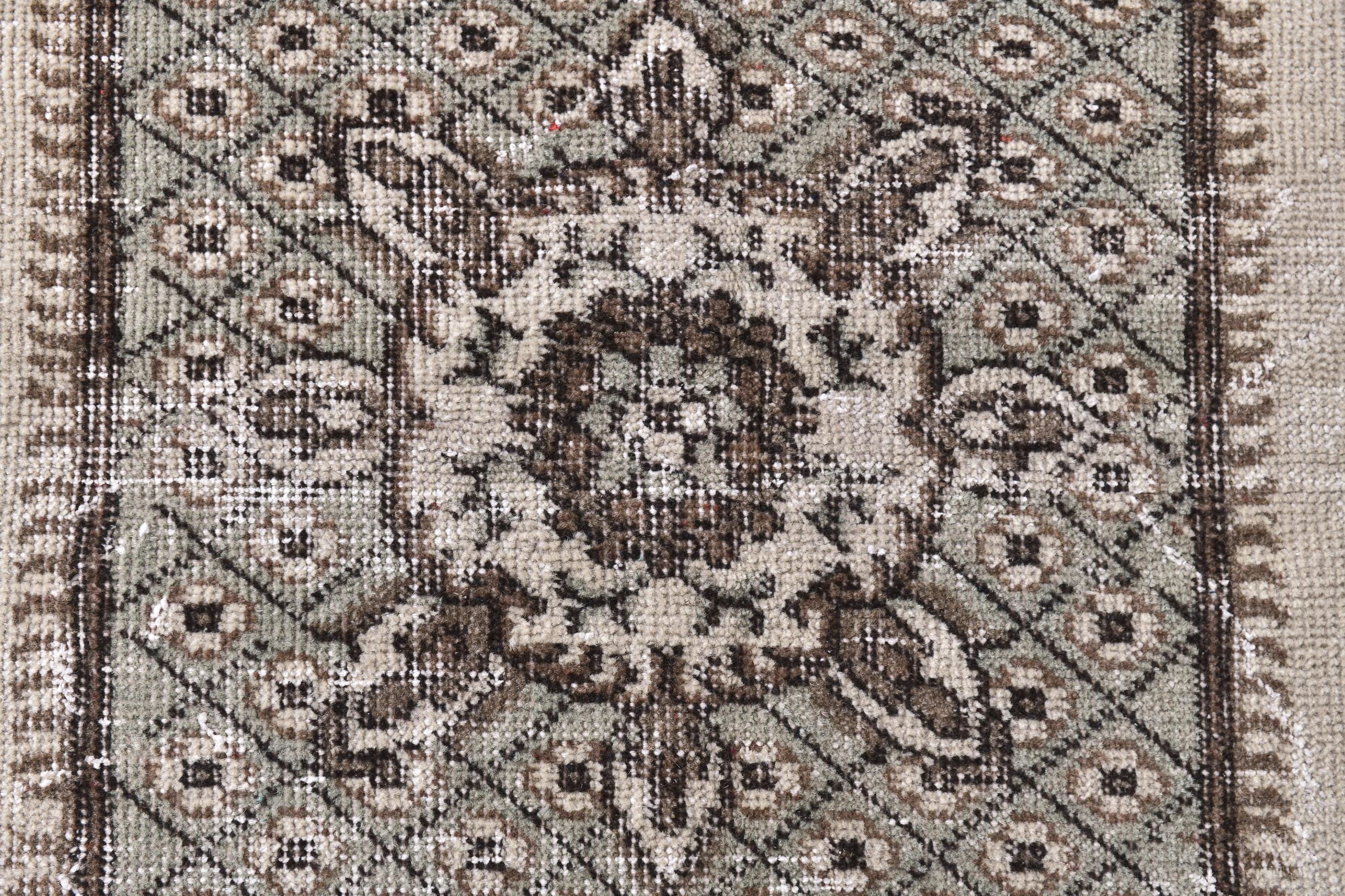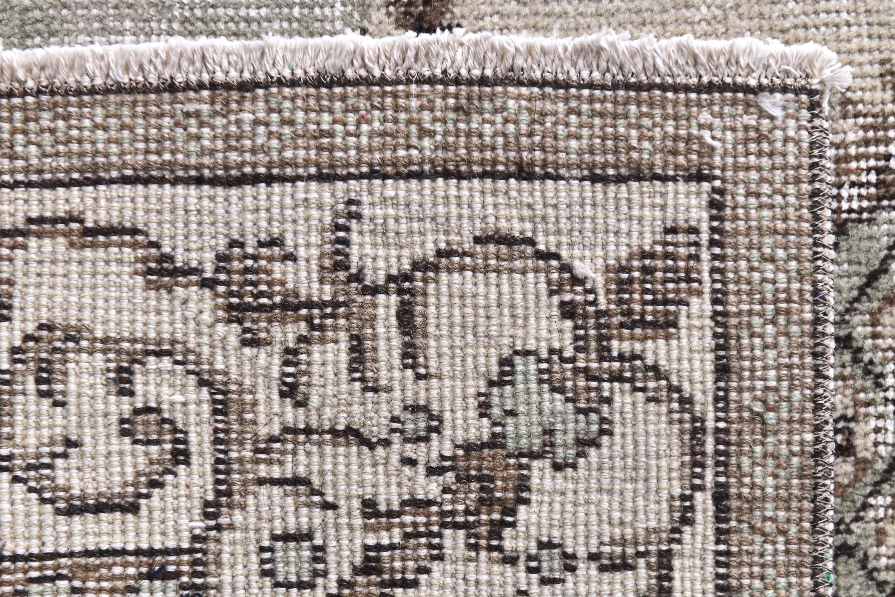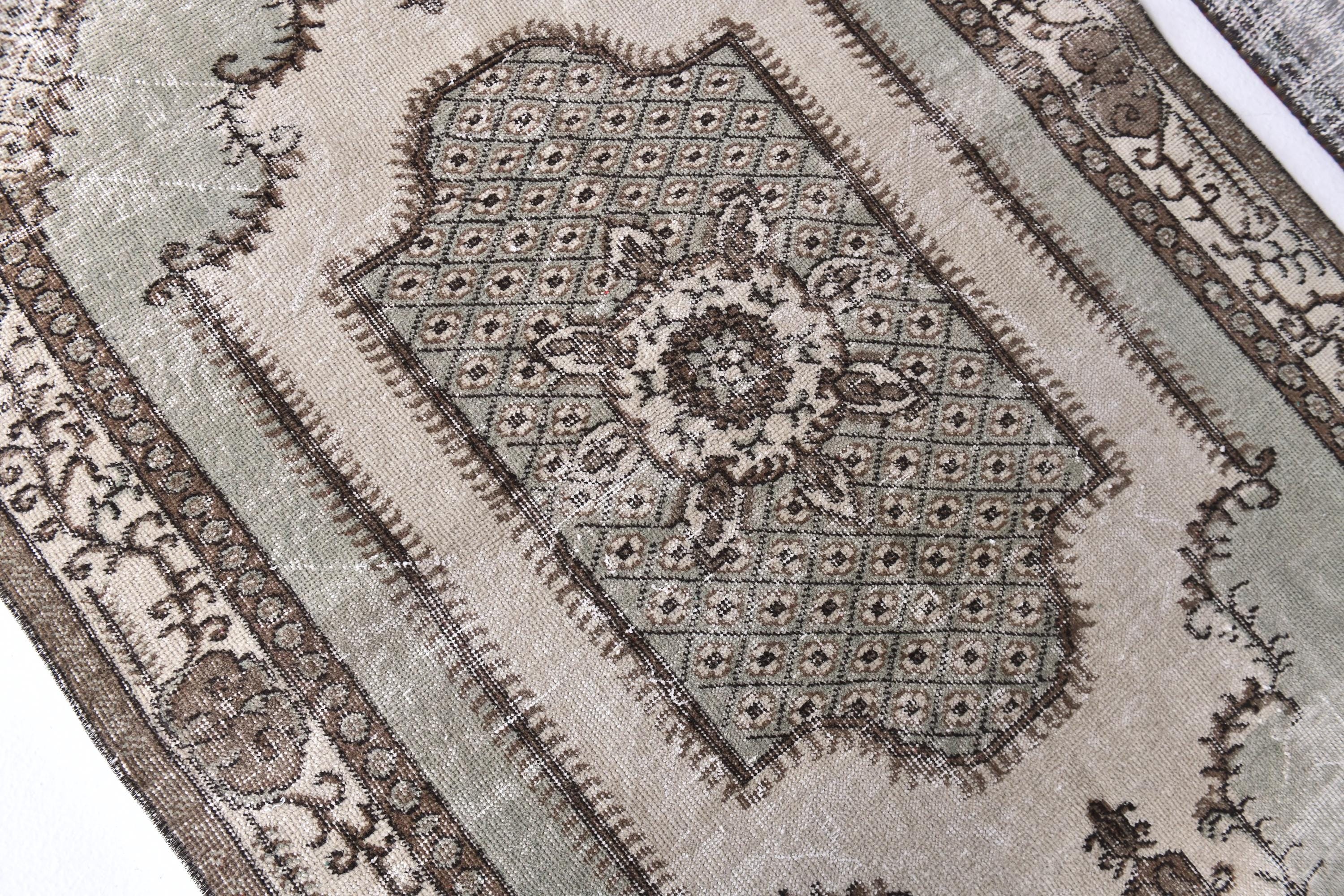 📜📌 A vintage handknotted Turkish wool rug photographed at an angle, featuring a muted sage green and warm beige color palette with a distressed, faded finish. The rug displays a traditional medallion center design surrounded by an intricate lattice diamond pattern and floral arabesques. The multi-layered border is decorated with scrolling vines and geometric motifs in shades of taupe and ivory.