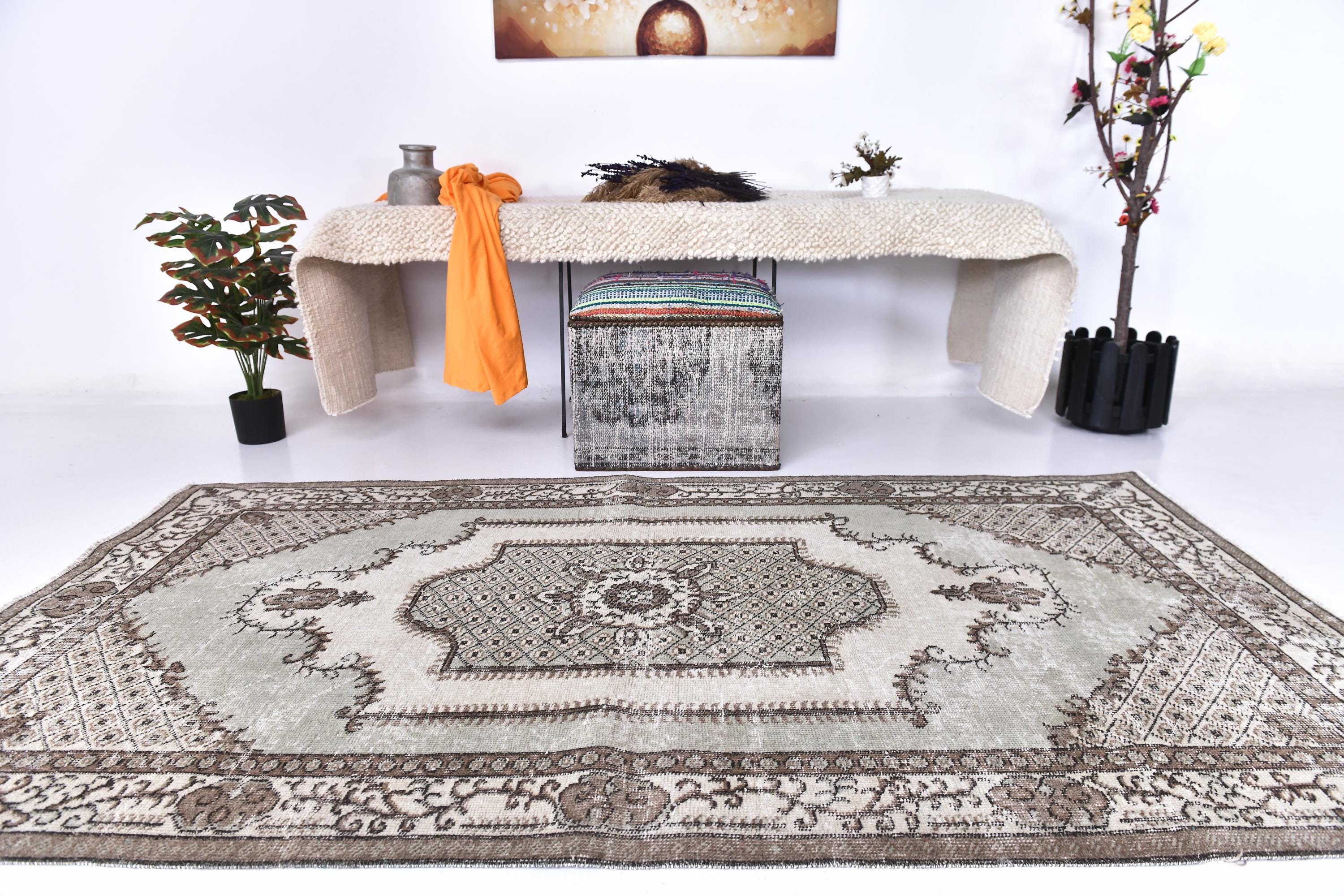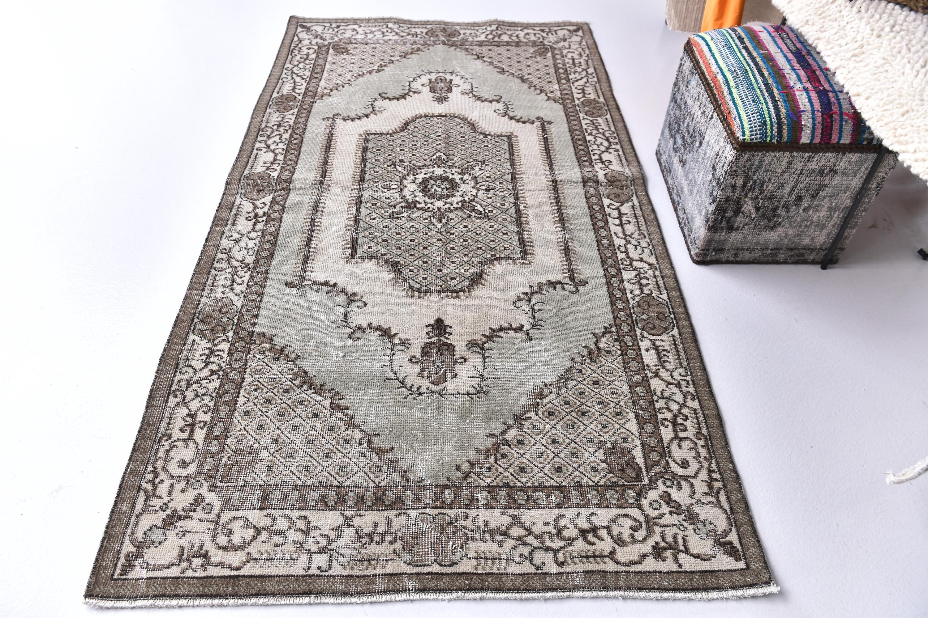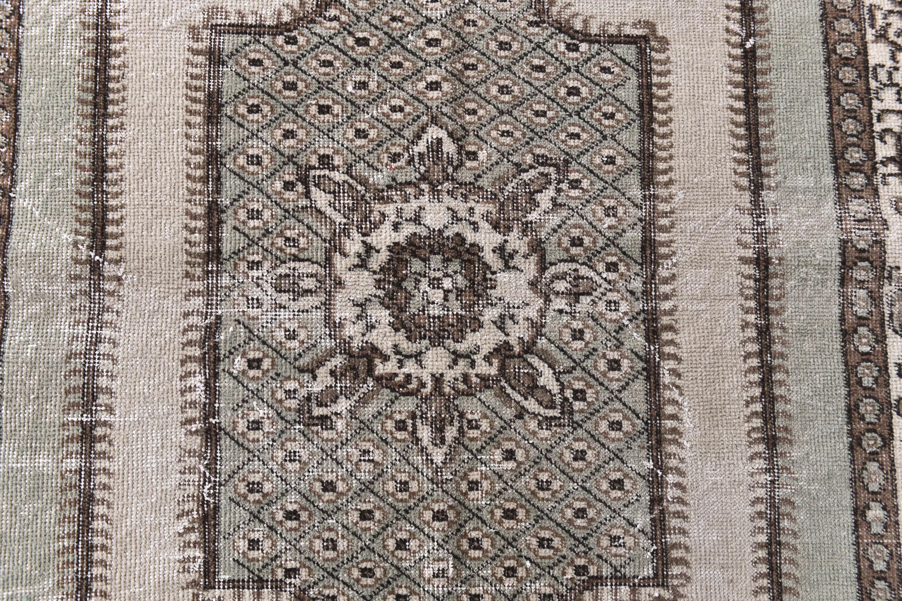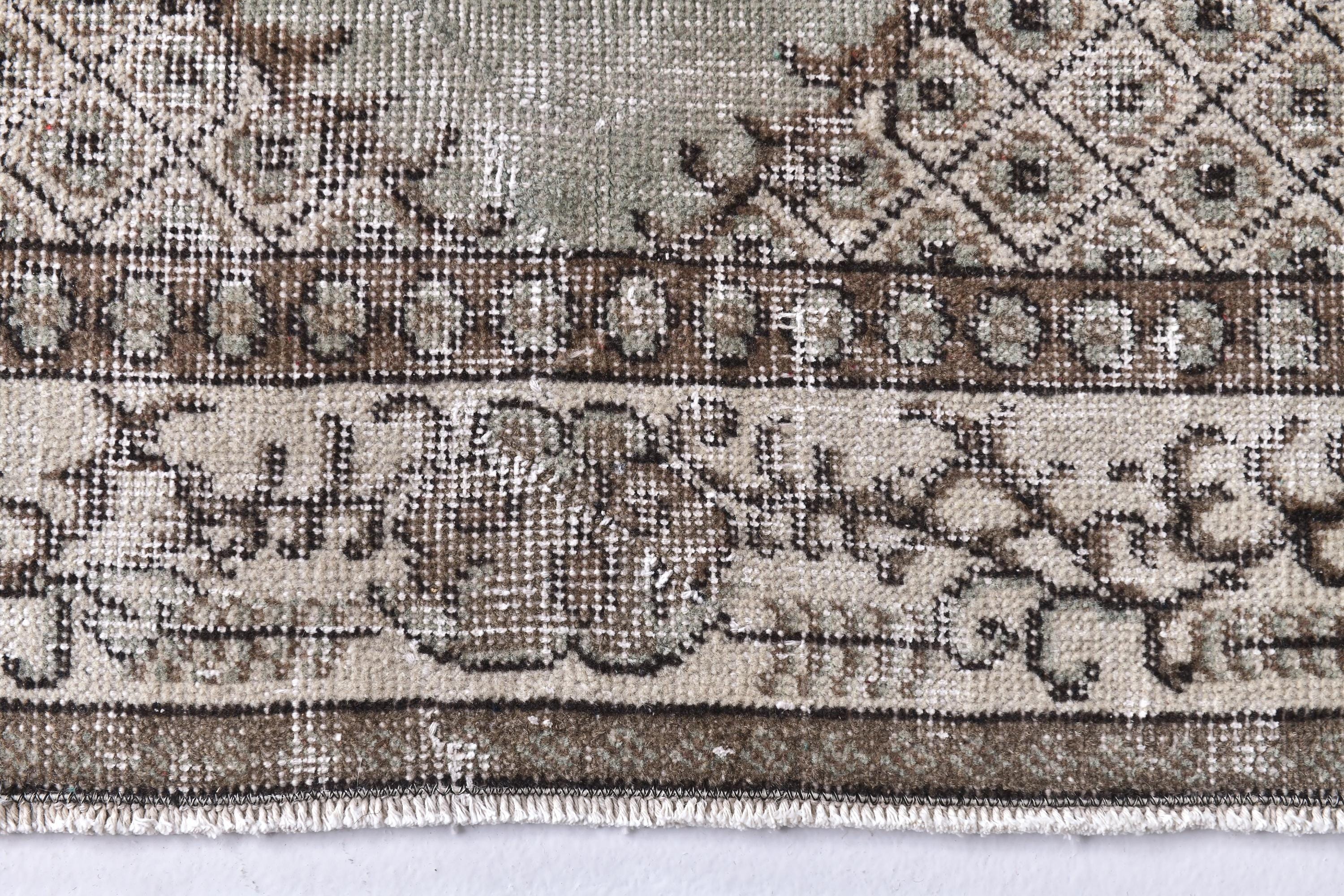 📜📌 A vintage handknotted Turkish wool rug photographed at an angle, featuring a muted sage green and warm beige color palette with a distressed, faded finish. The rug displays a traditional medallion center design surrounded by an intricate lattice diamond pattern and floral arabesques. The multi-layered border is decorated with scrolling vines and geometric motifs in shades of taupe and ivory.