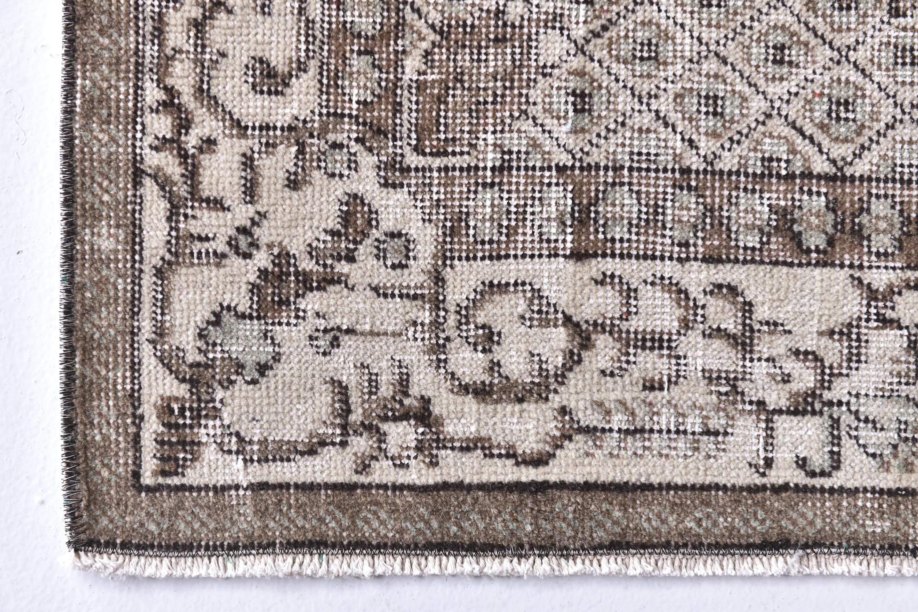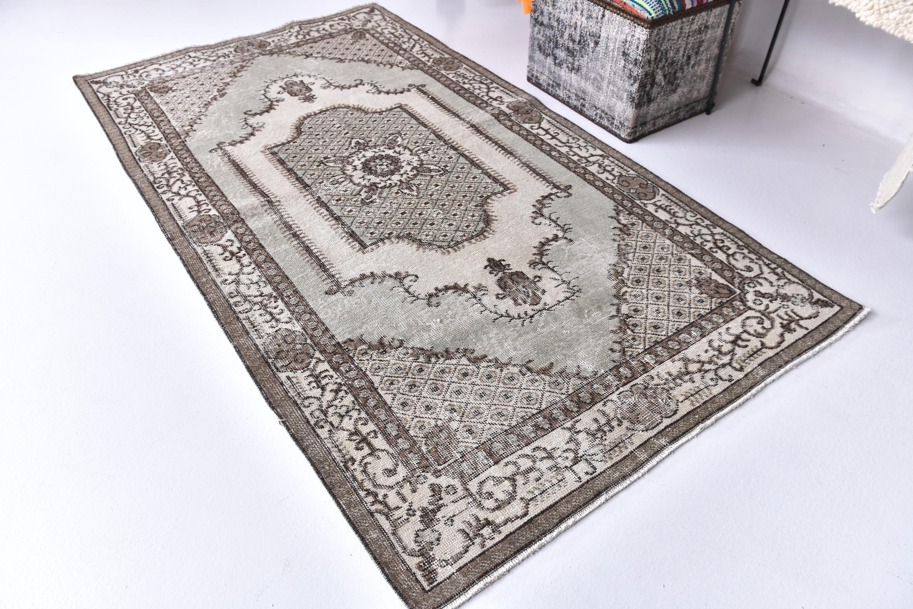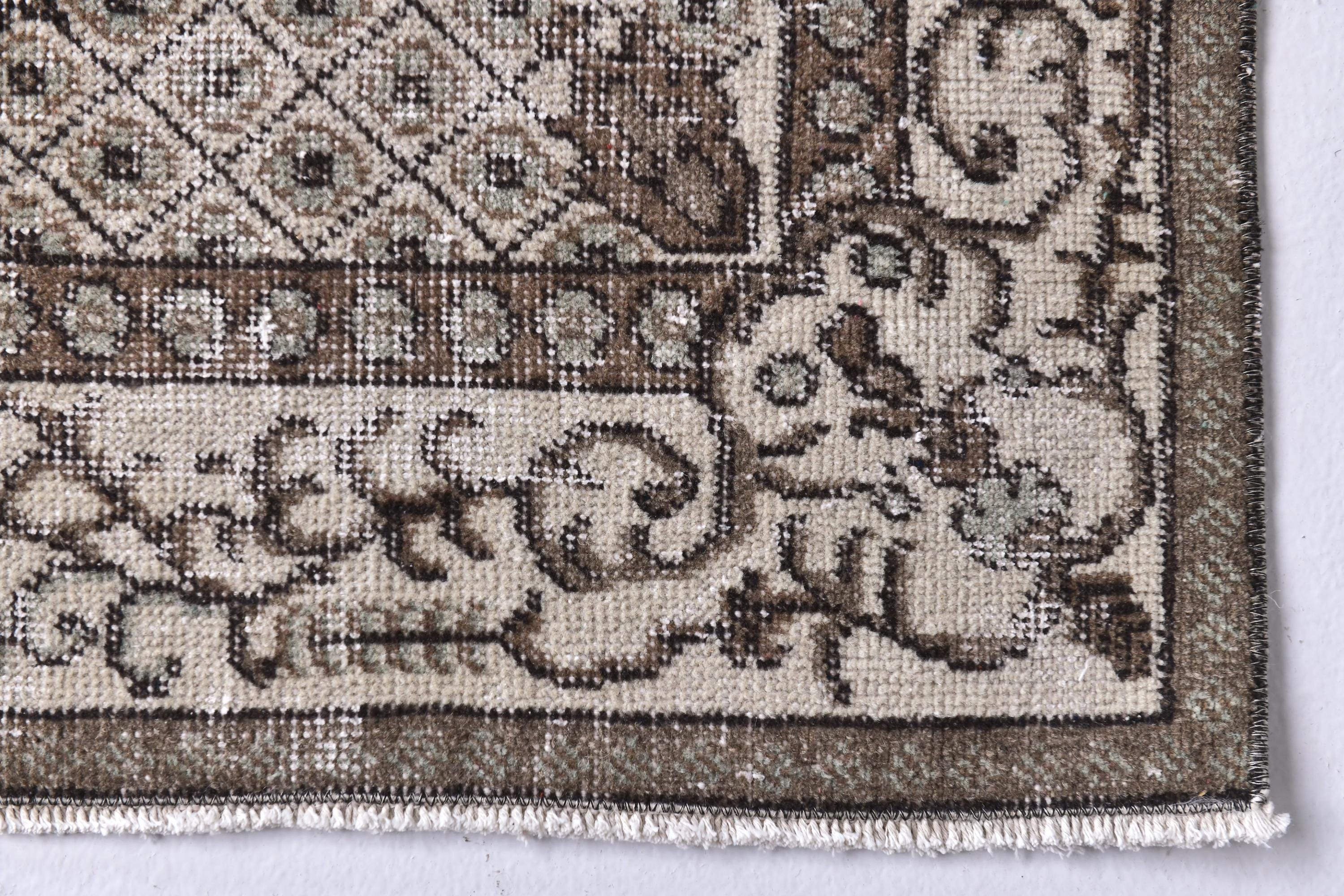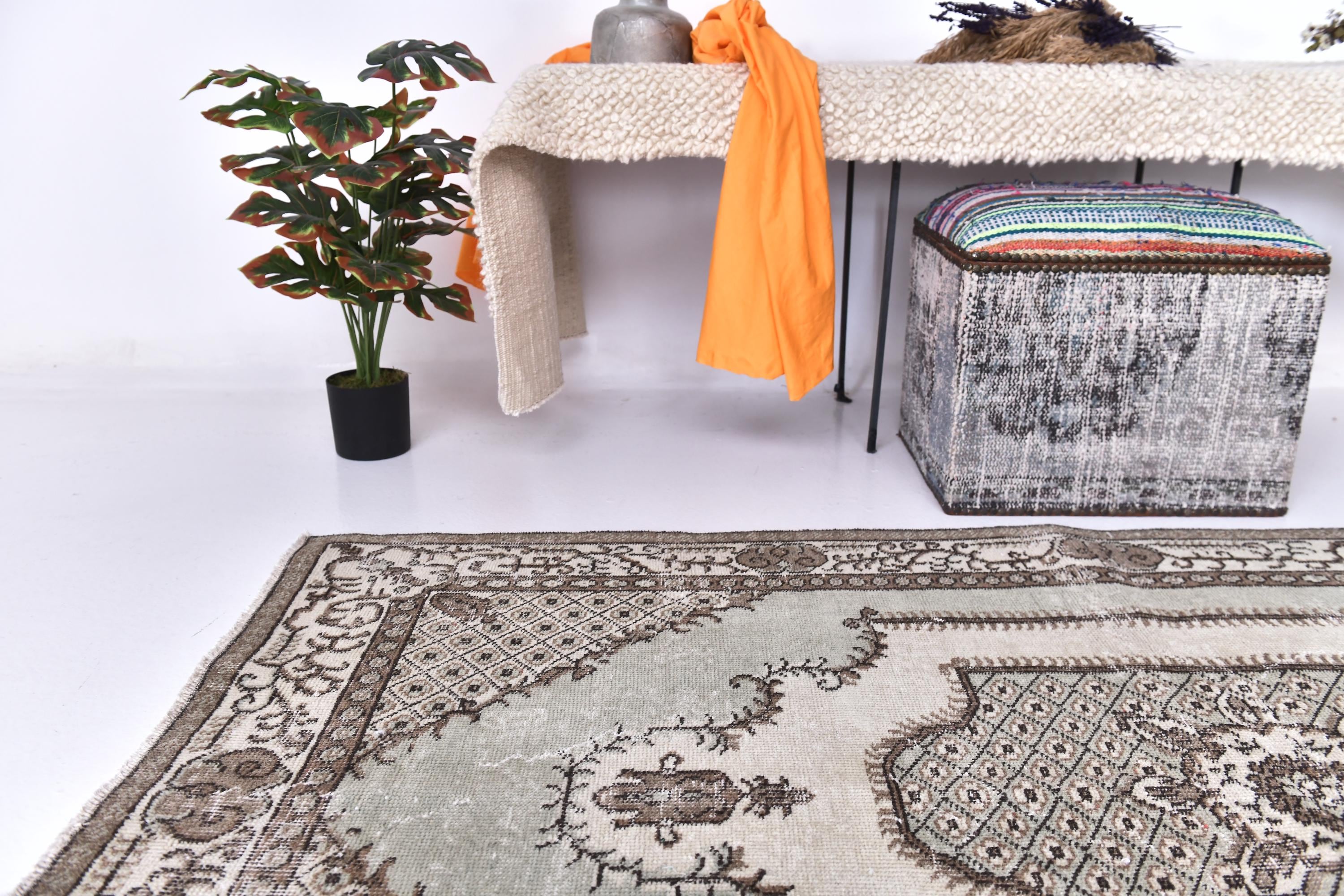 📜📌 A vintage handknotted Turkish wool rug photographed at an angle, featuring a muted sage green and warm beige color palette with a distressed, faded finish. The rug displays a traditional medallion center design surrounded by an intricate lattice diamond pattern and floral arabesques. The multi-layered border is decorated with scrolling vines and geometric motifs in shades of taupe and ivory.