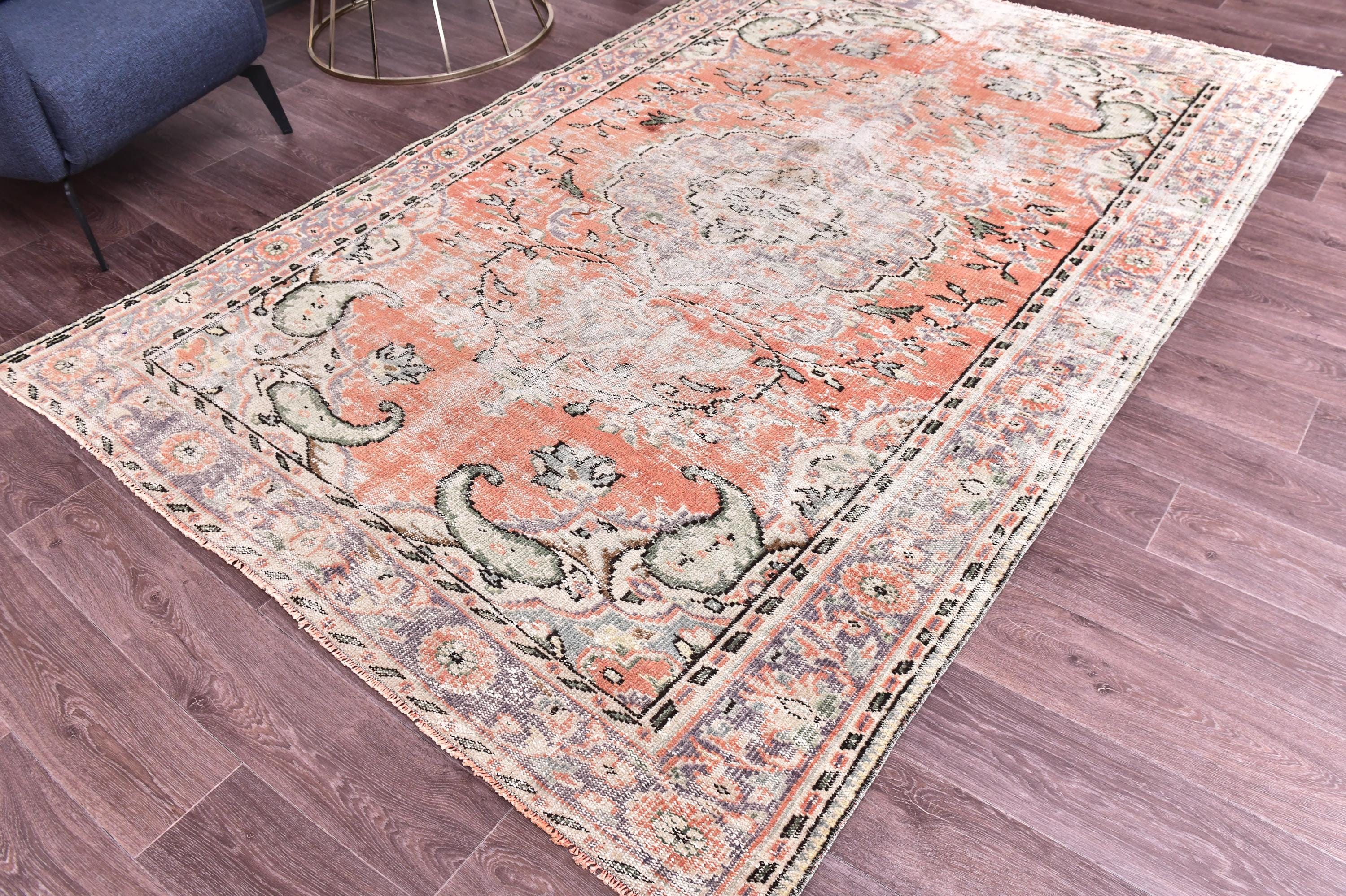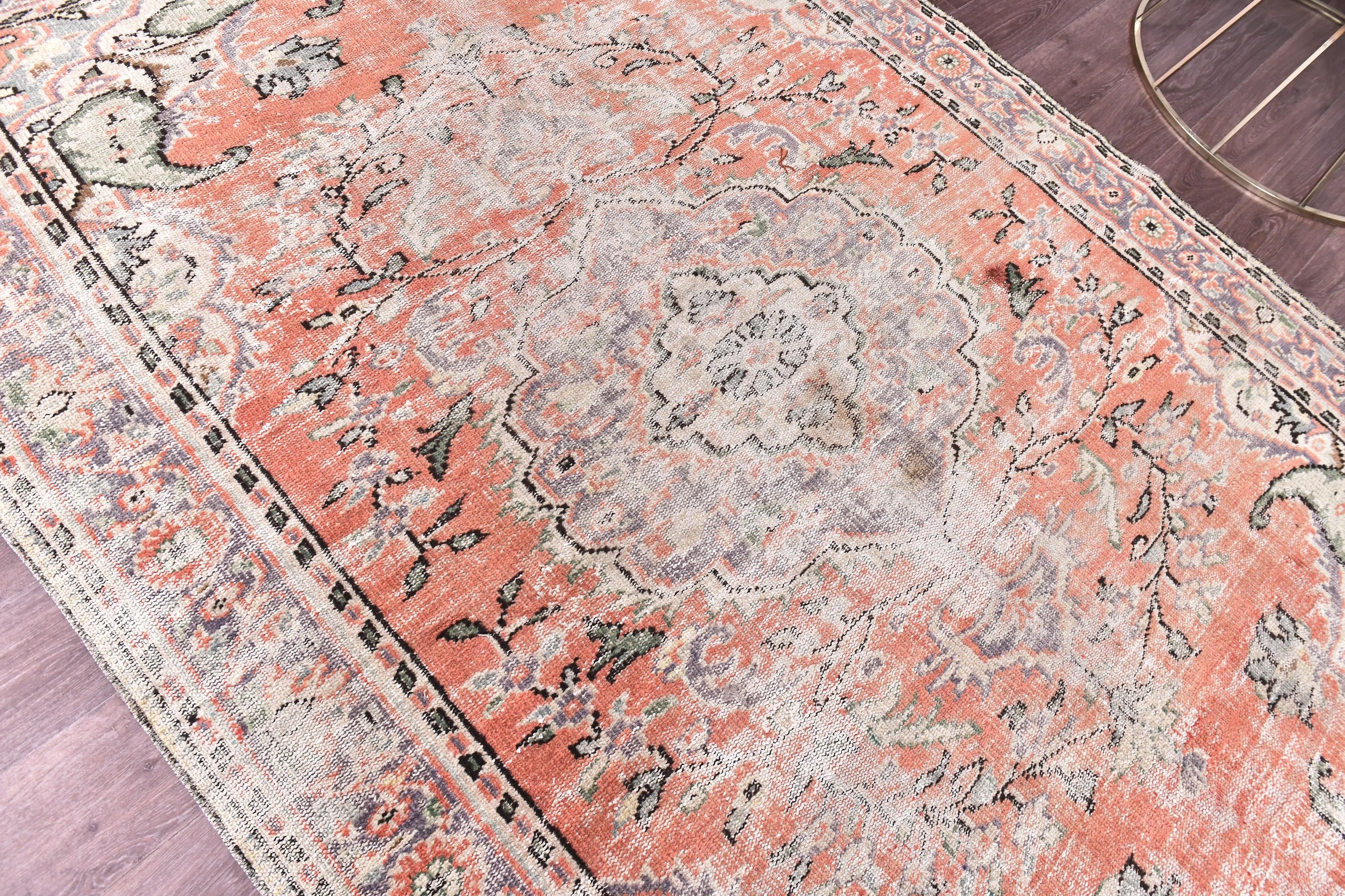 📜📌 A vintage handknotted Turkish wool area rug photographed flat on a dark hardwood floor next to a grey sofa. The rug features a warm terracotta and salmon-orange ground with a large central floral medallion rendered in muted ivory, sage green, and dusty lavender-gray. The medallion is flanked symmetrically by large curling arabesque floral sprays with broad acanthus-style leaves in olive green and cream, filling the open field. Scattered floral sprigs and vine tendrils cover the remaining field in subdued tones of pale pink and green