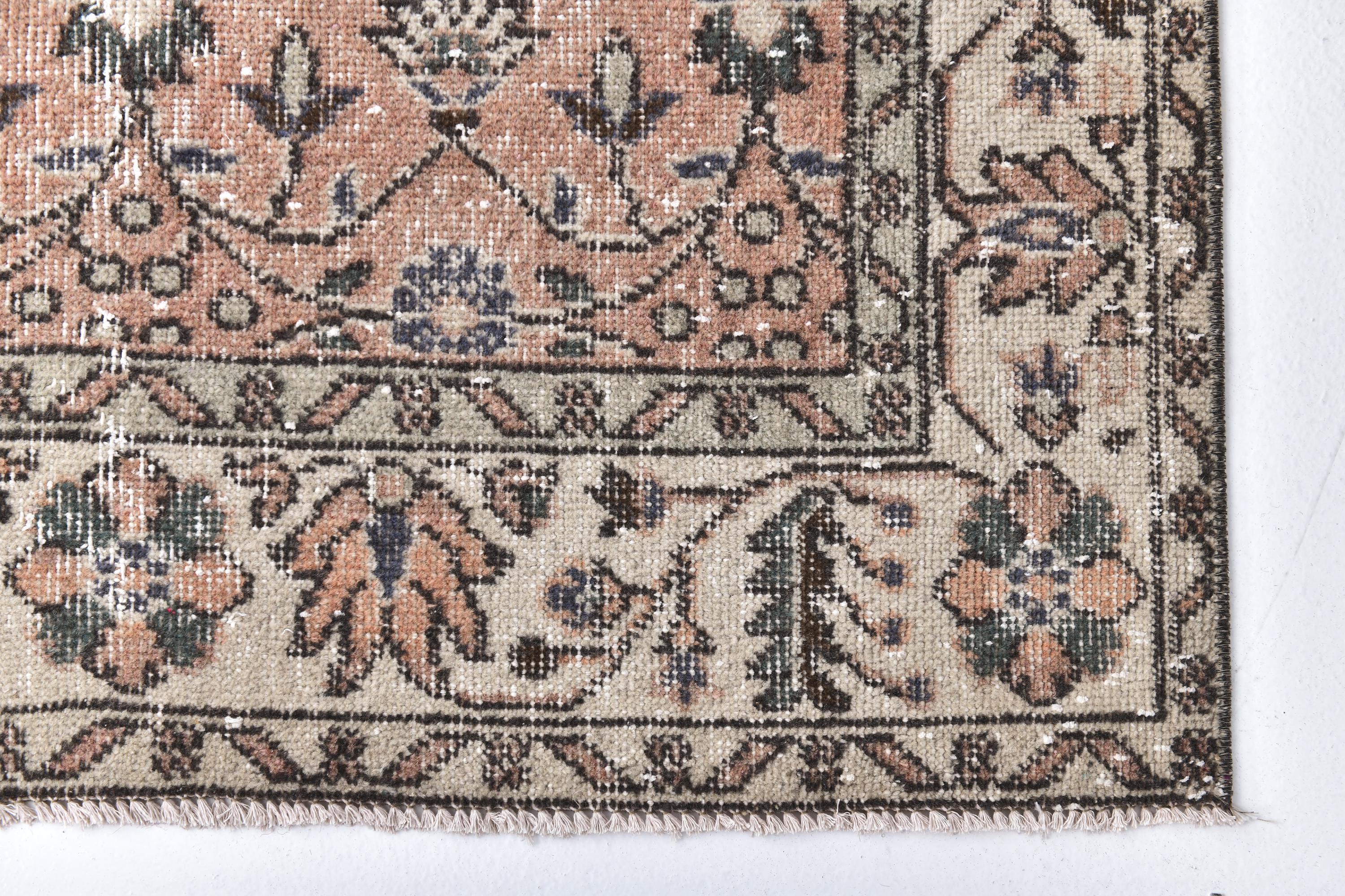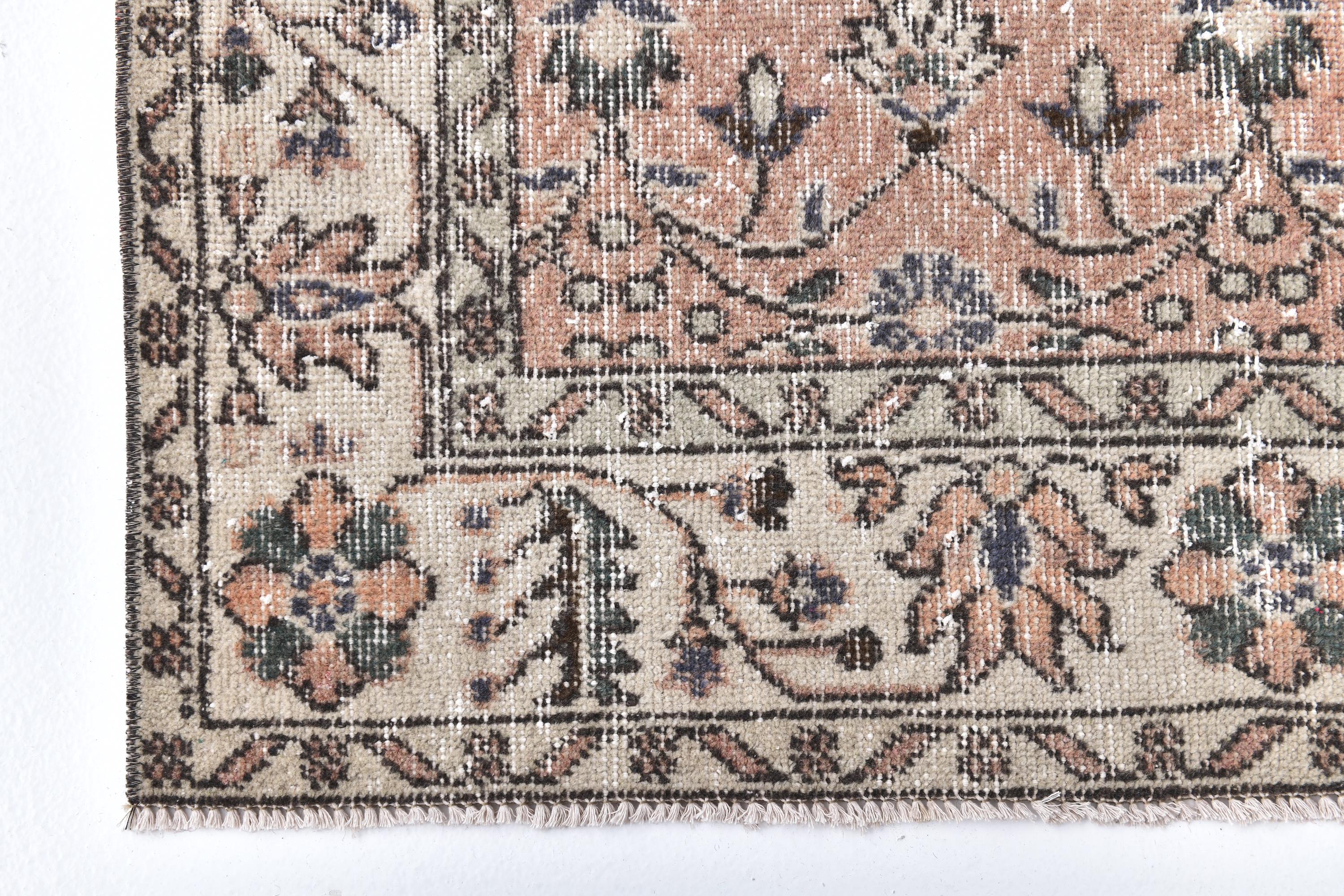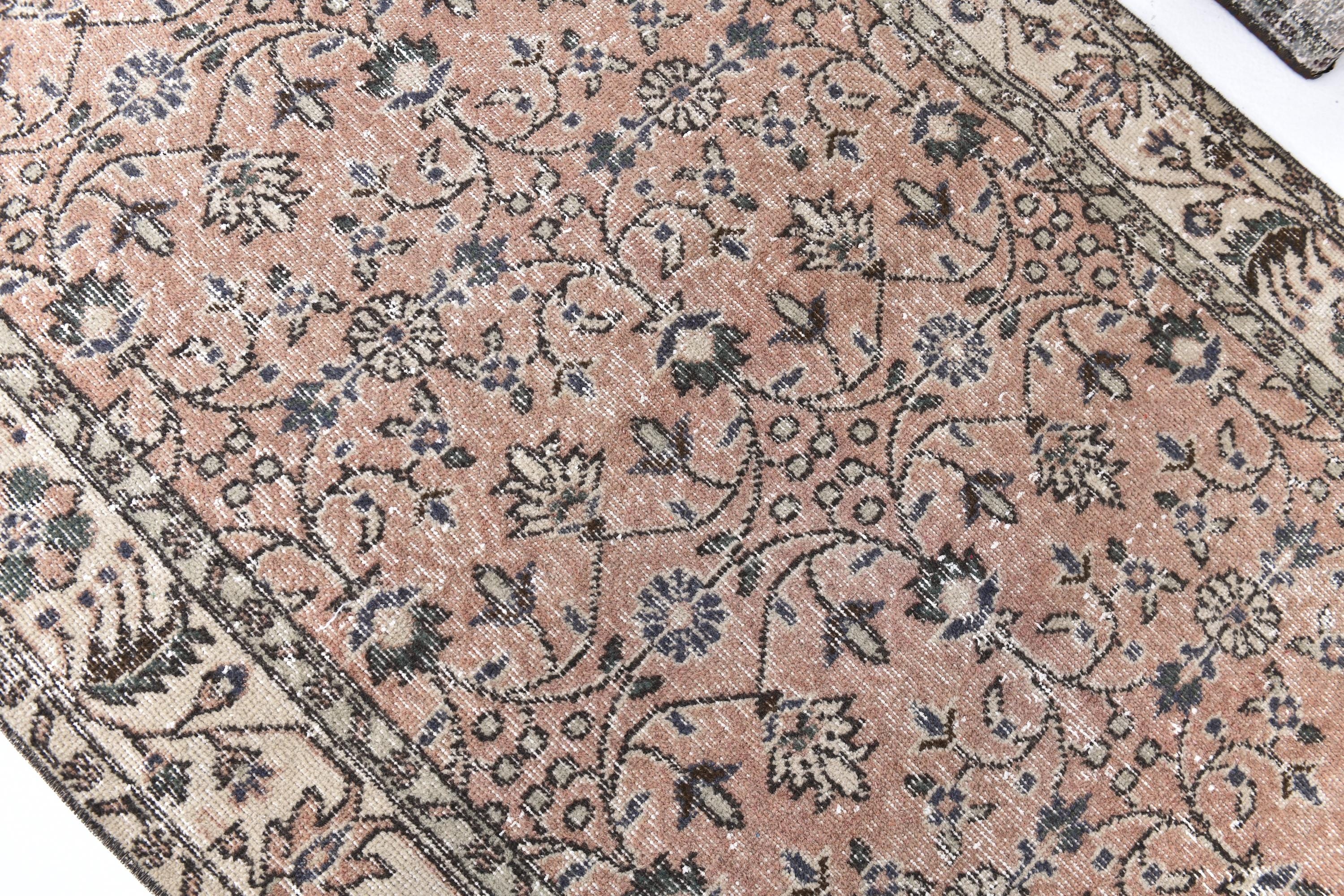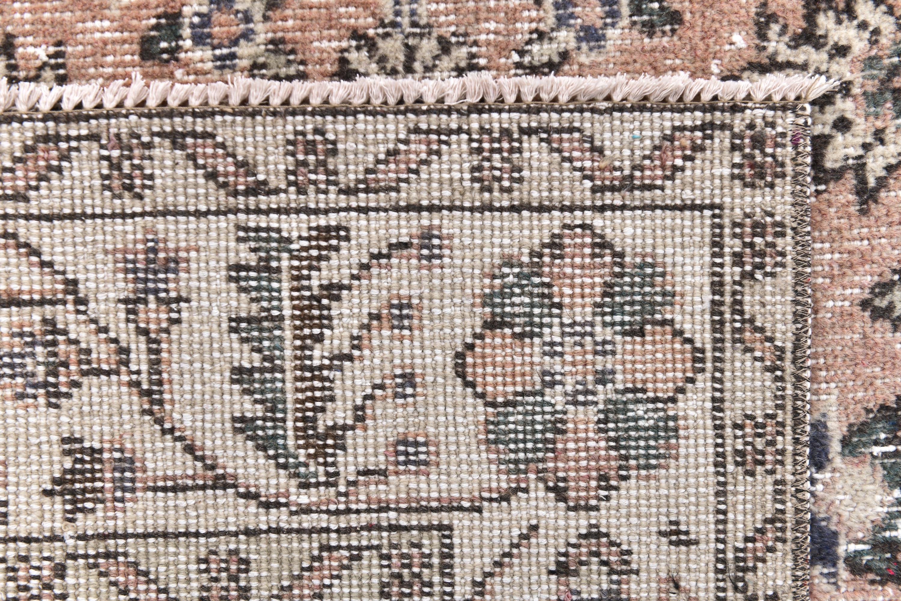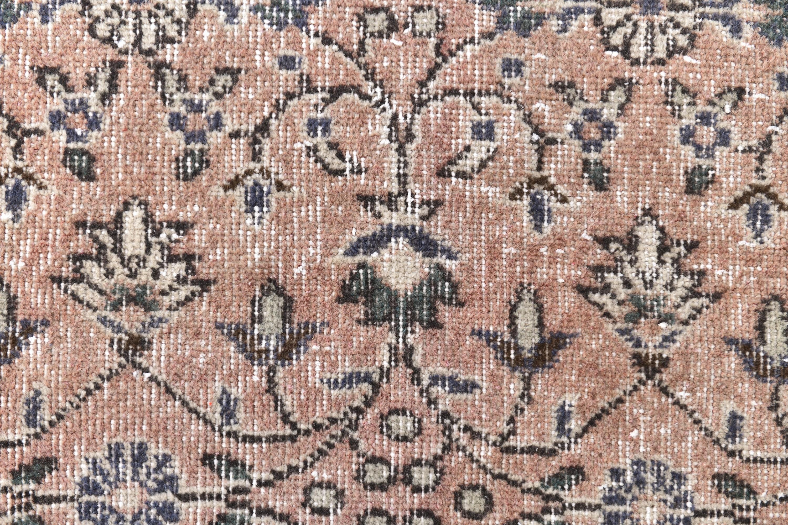 📜📌 Handmade Turkish wool rug with Salmon field filled with intricate blue and dark gray floral arabesque design, central botanical vine pattern, multi-line charcoal border with floral rosettes, distressed low-pile vintage appearance, light fringe ends