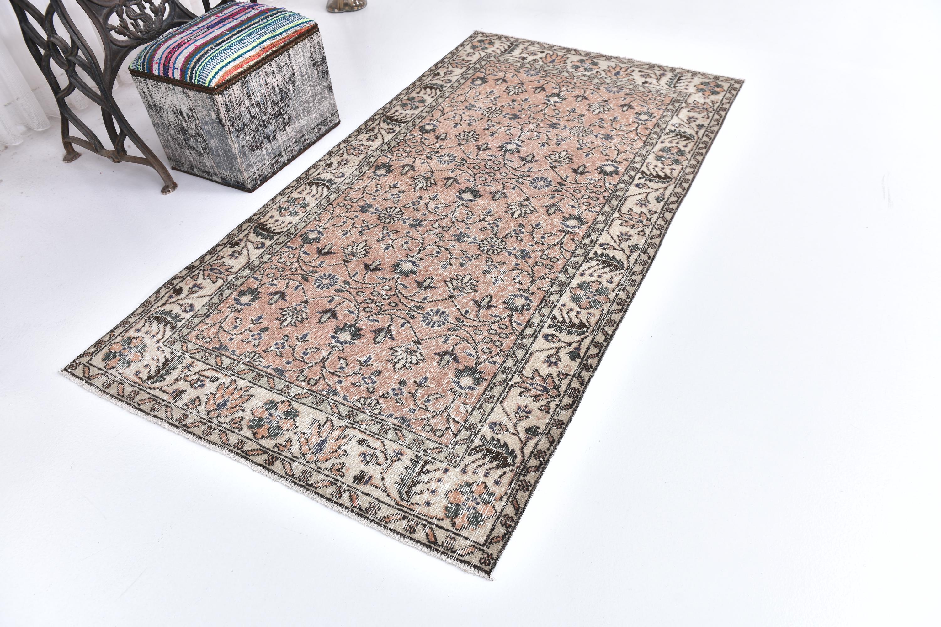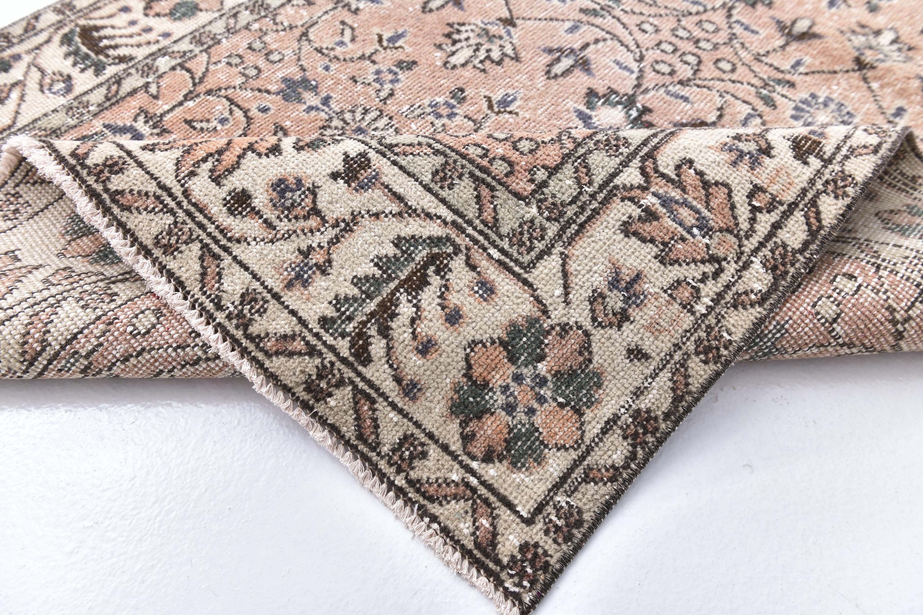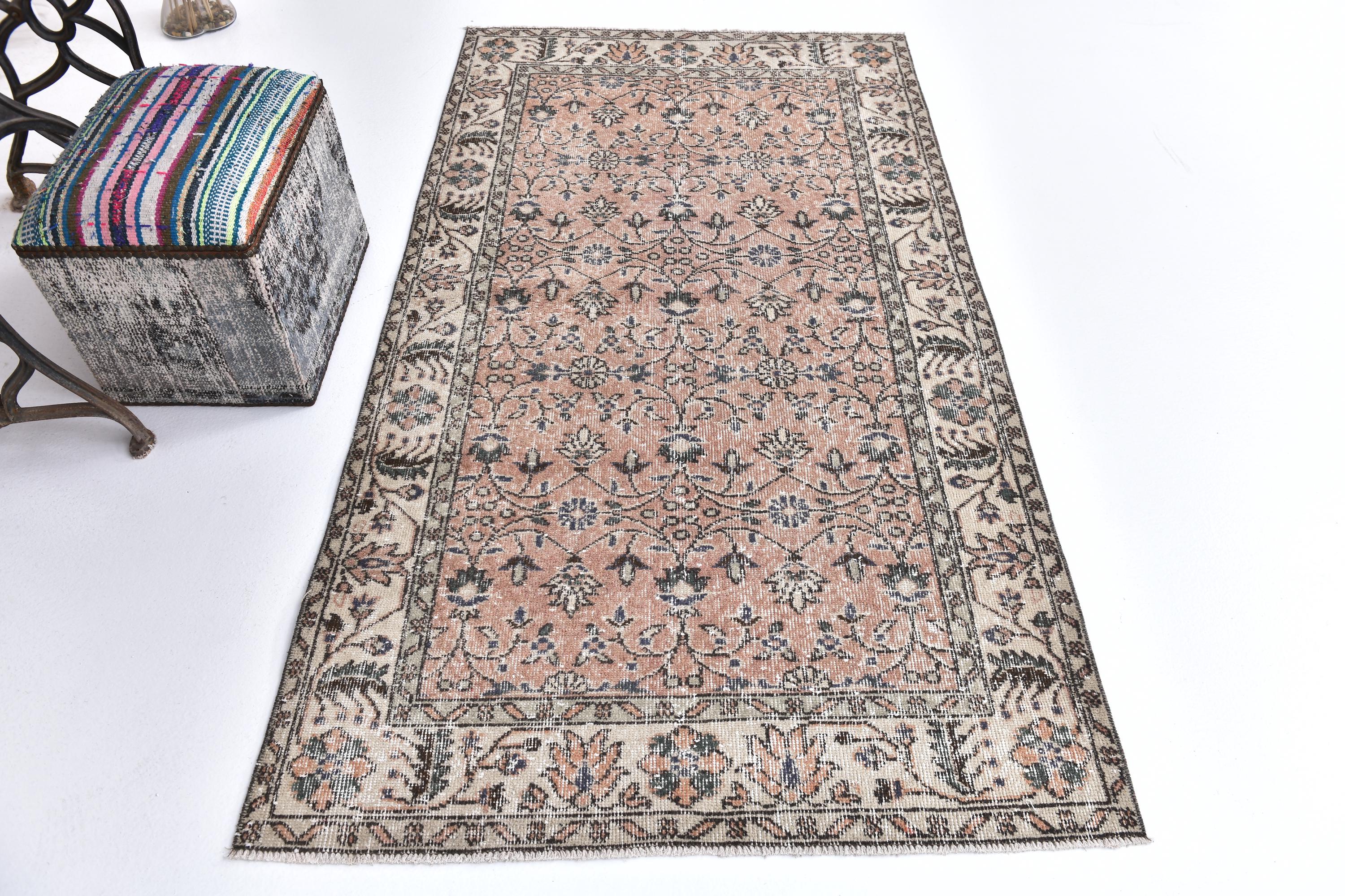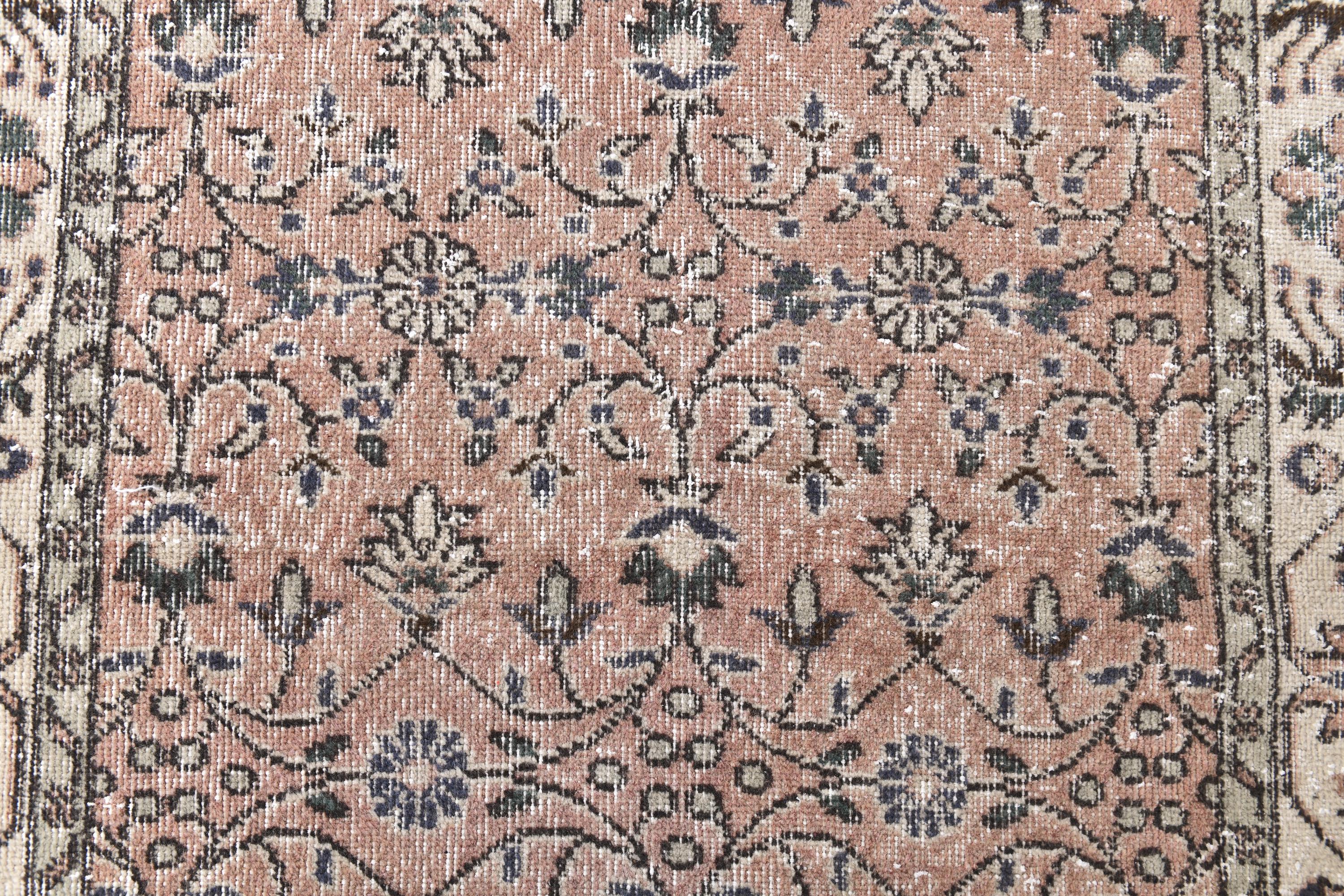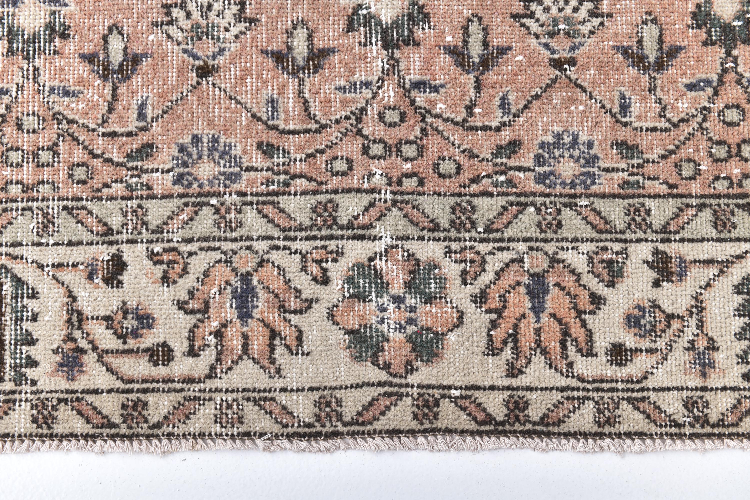 📜📌 Handmade Turkish wool rug with Salmon field filled with intricate blue and dark gray floral arabesque design, central botanical vine pattern, multi-line charcoal border with floral rosettes, distressed low-pile vintage appearance, light fringe ends