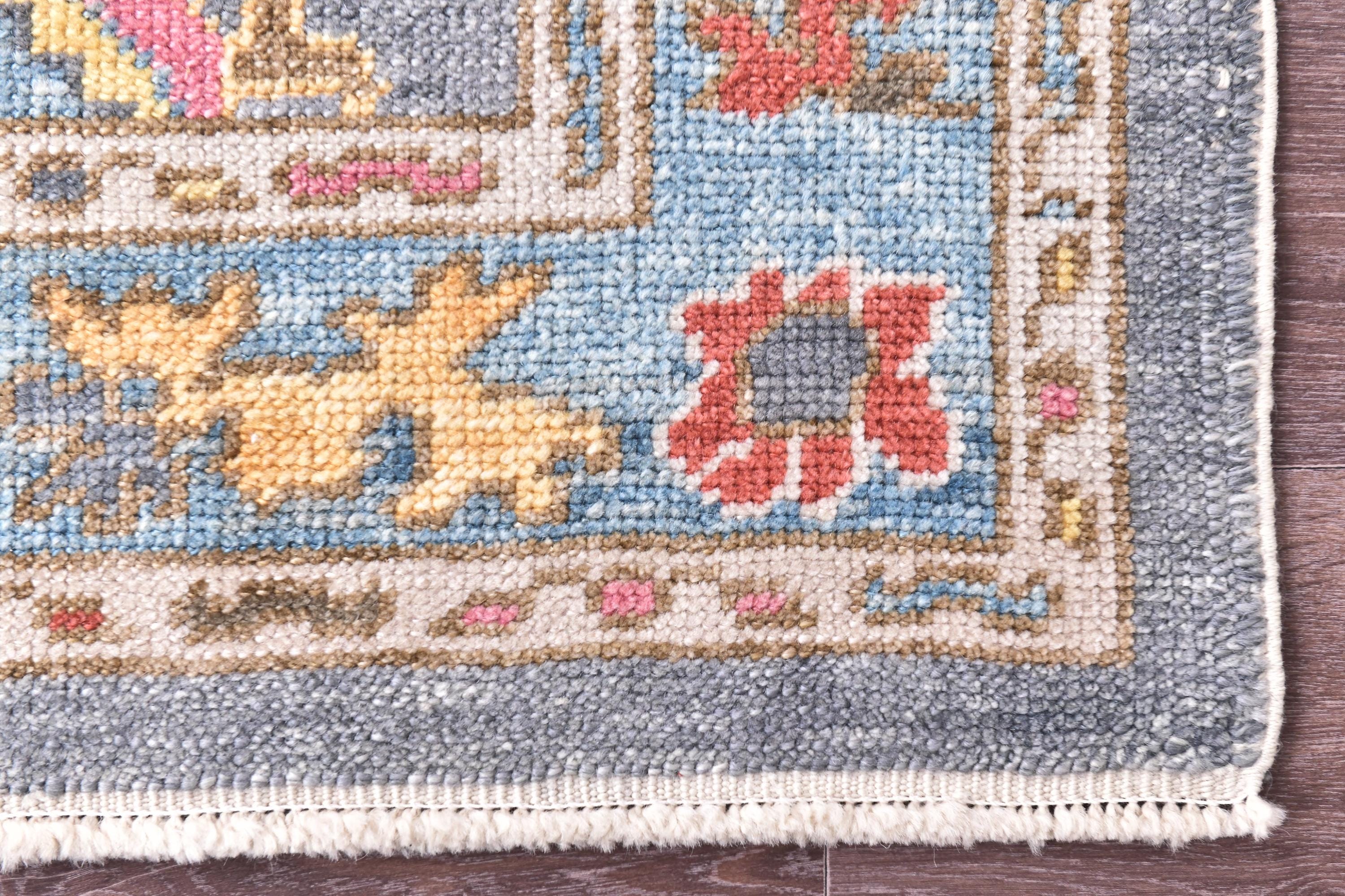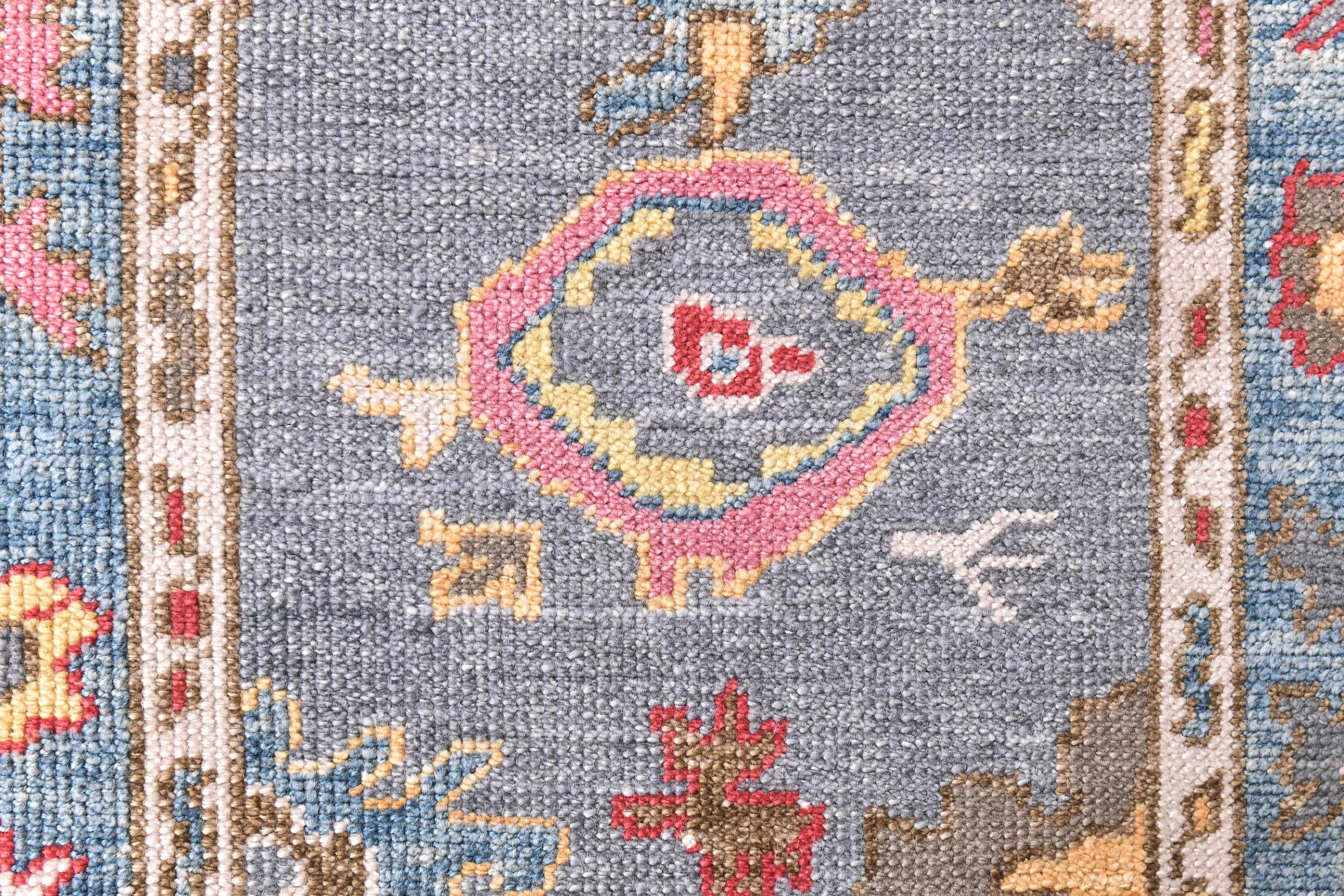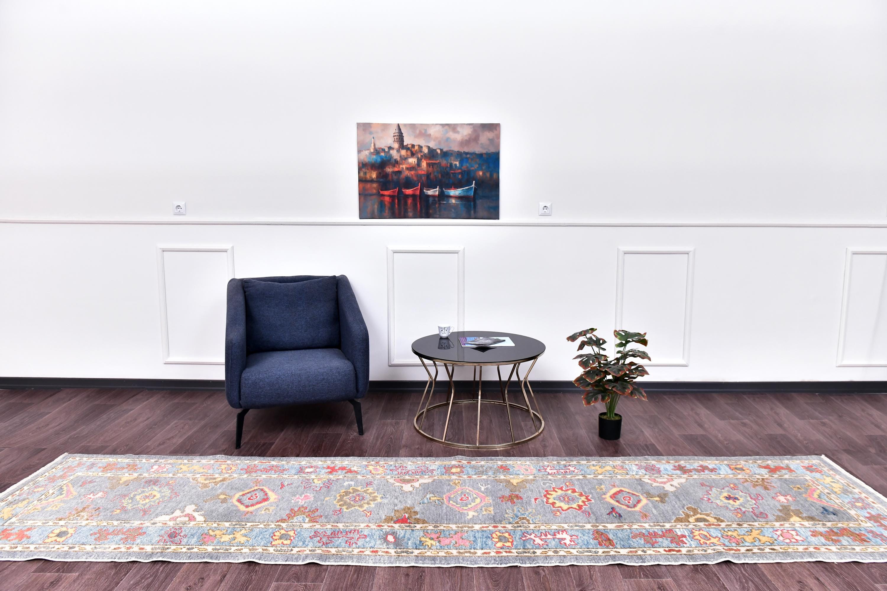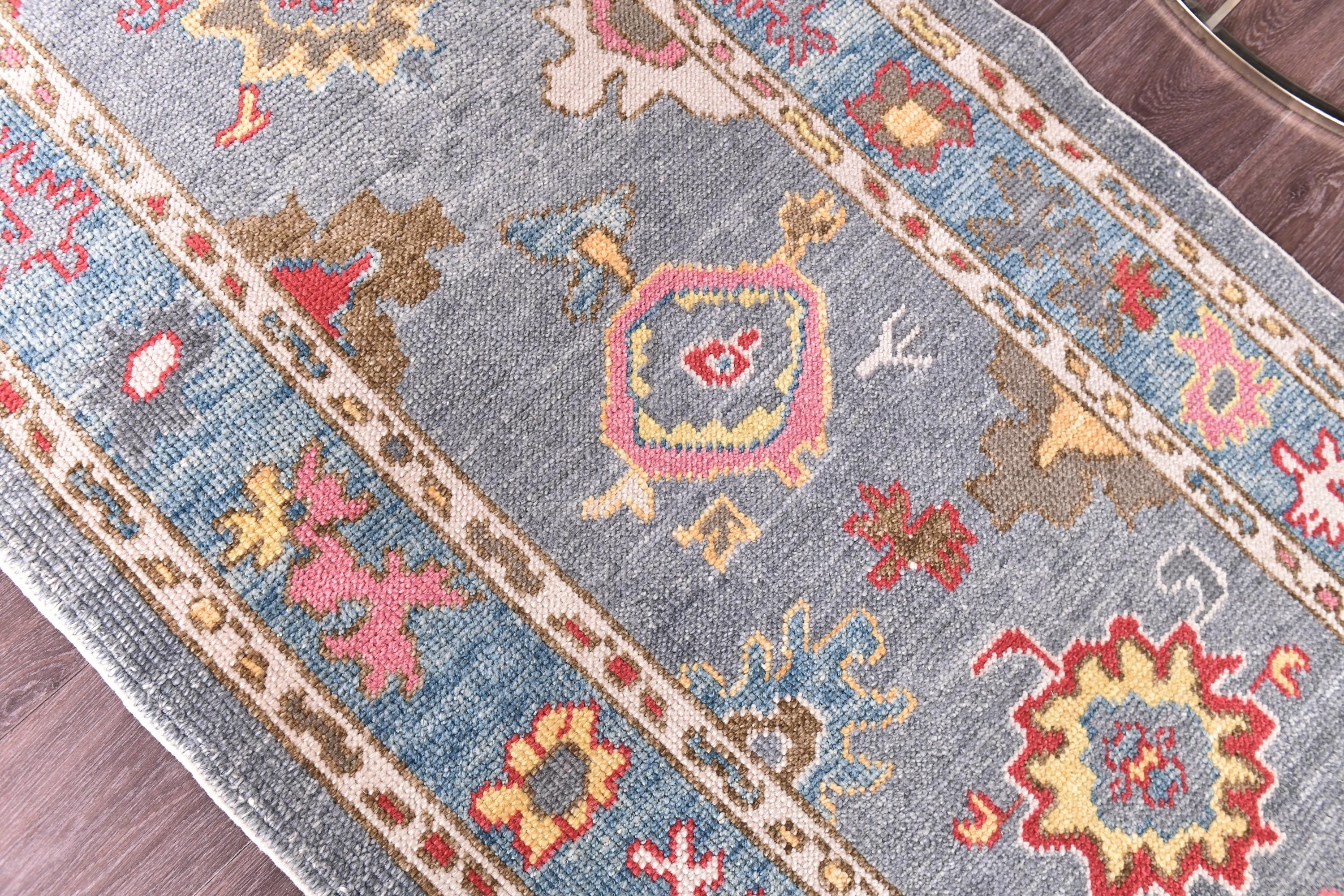 📜📌 Hand knotted Vintage Turkish Oushak runner rug with a steel blue and slate gray wool pile, featuring traditional floral medallion motifs in red, golden yellow, pink, and brown on an ivory bordered background. Long narrow hallway runner with vibrant multicolor geometric and botanical patterns in classic Anatolian style.