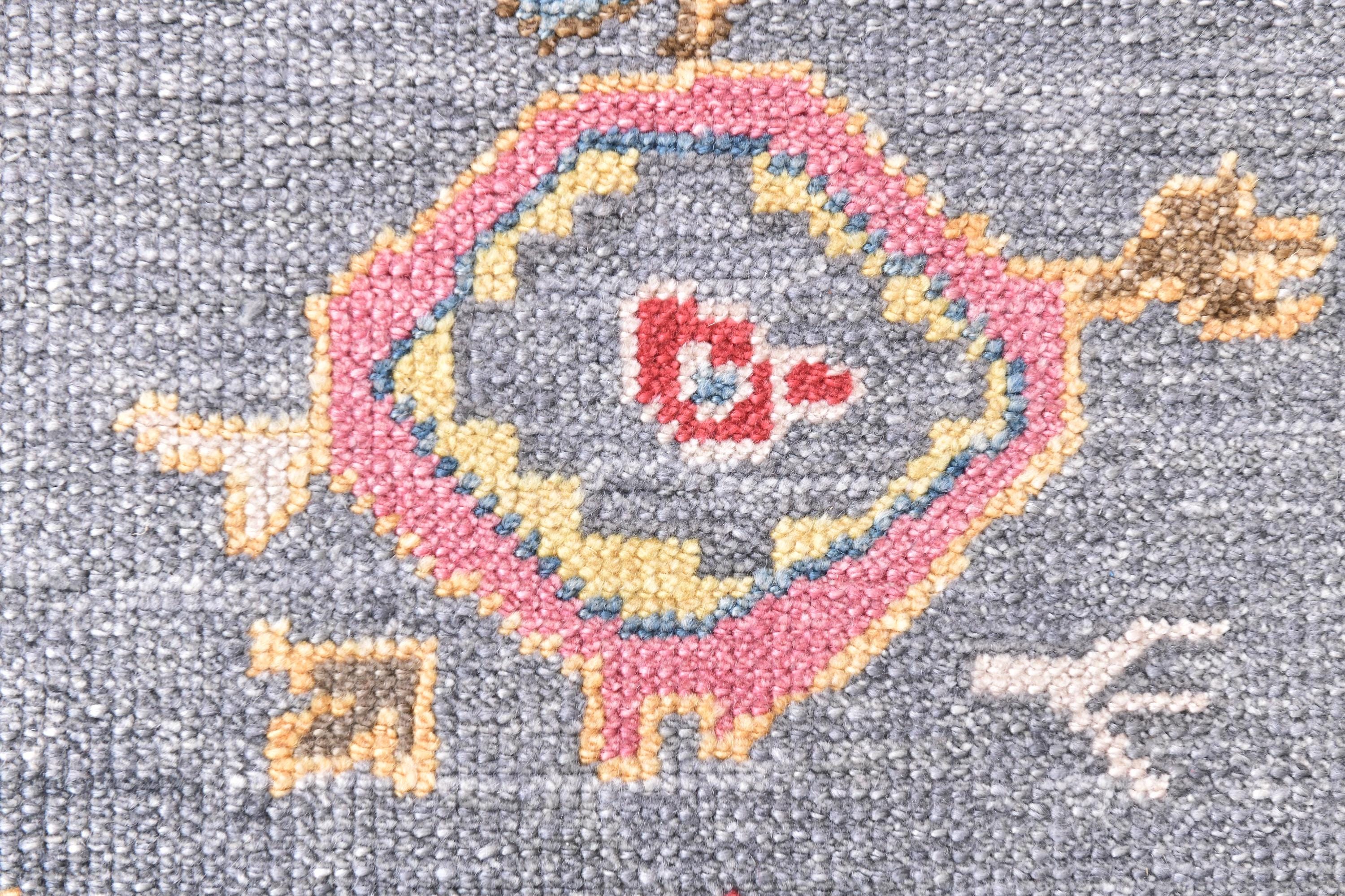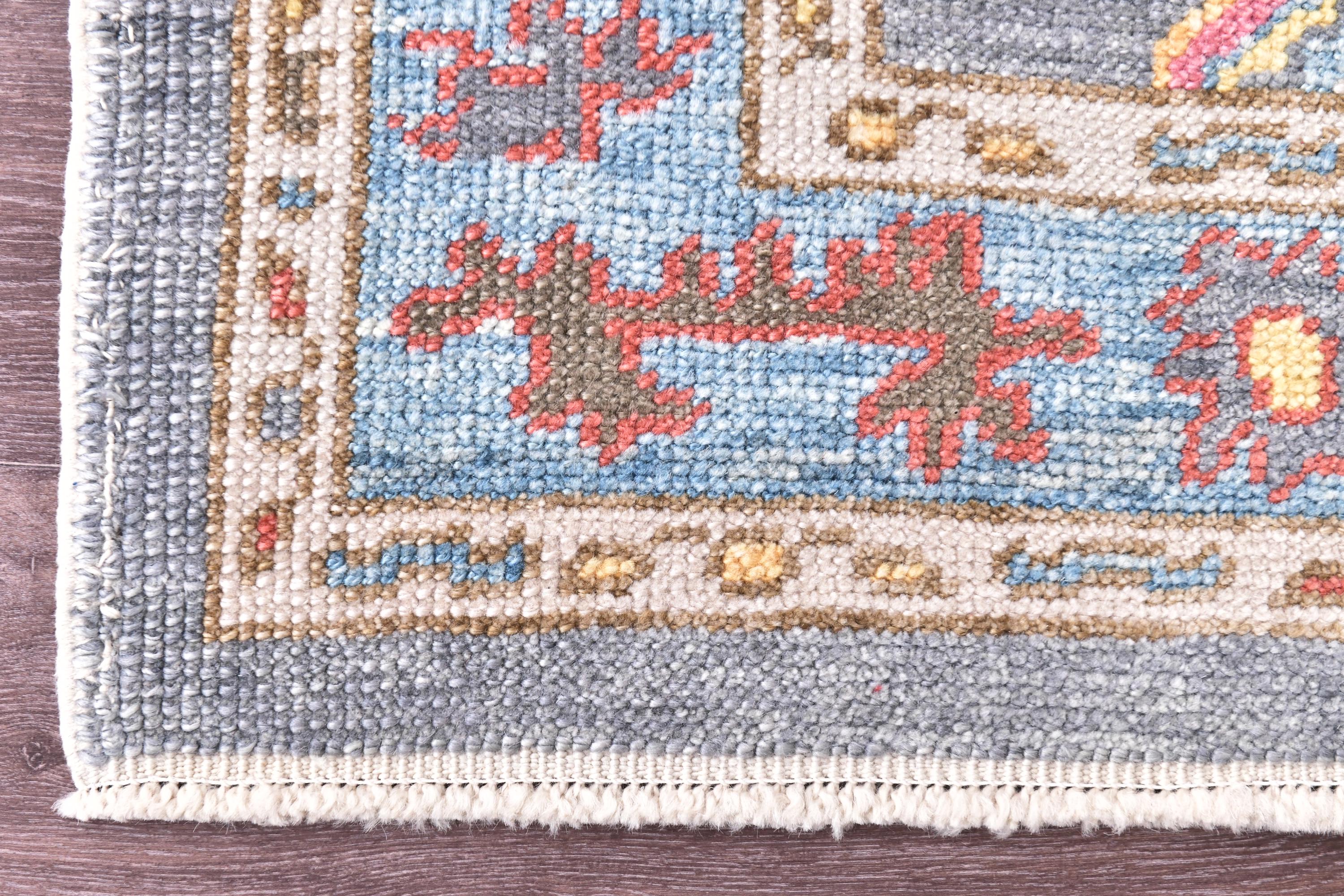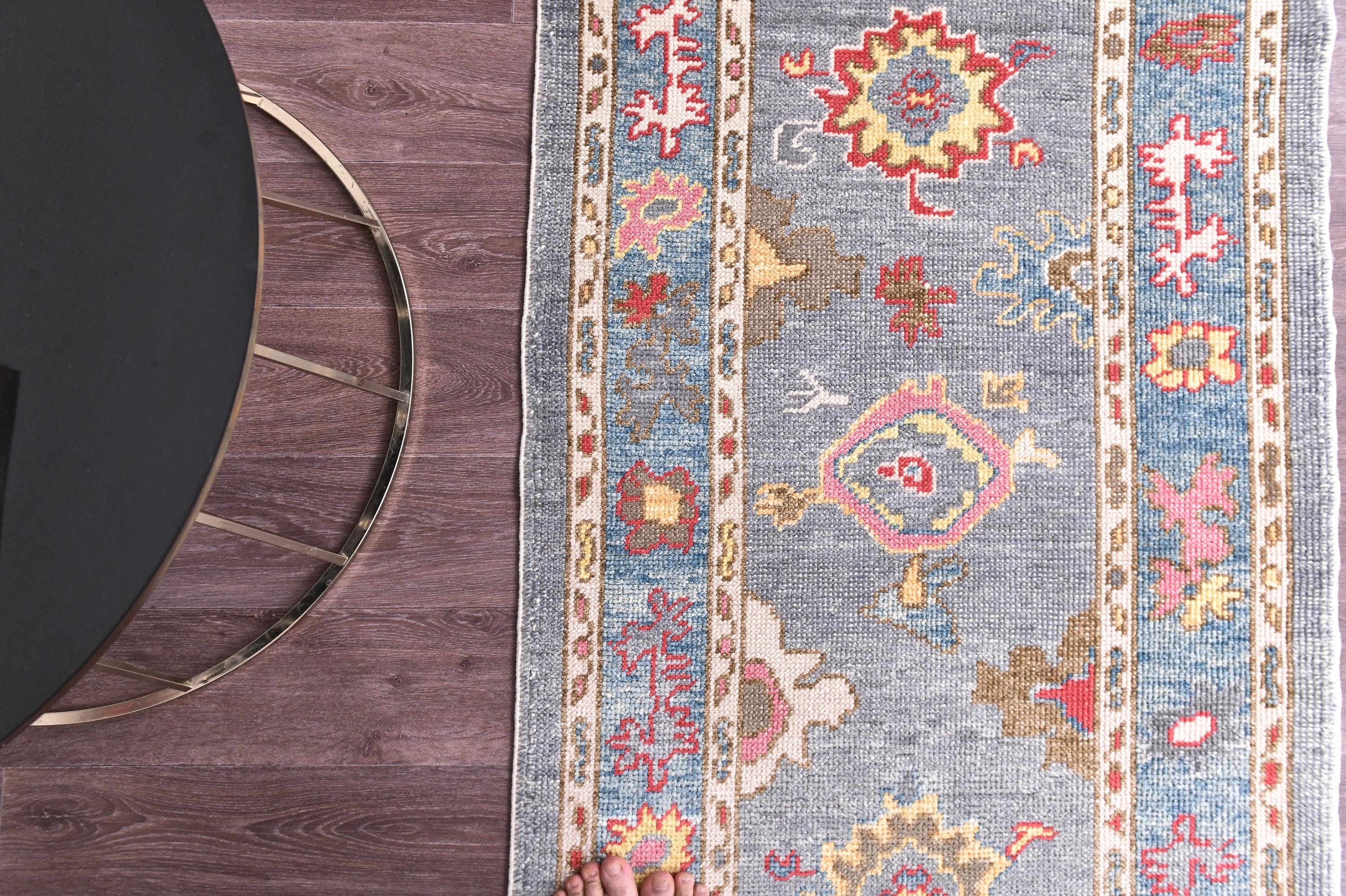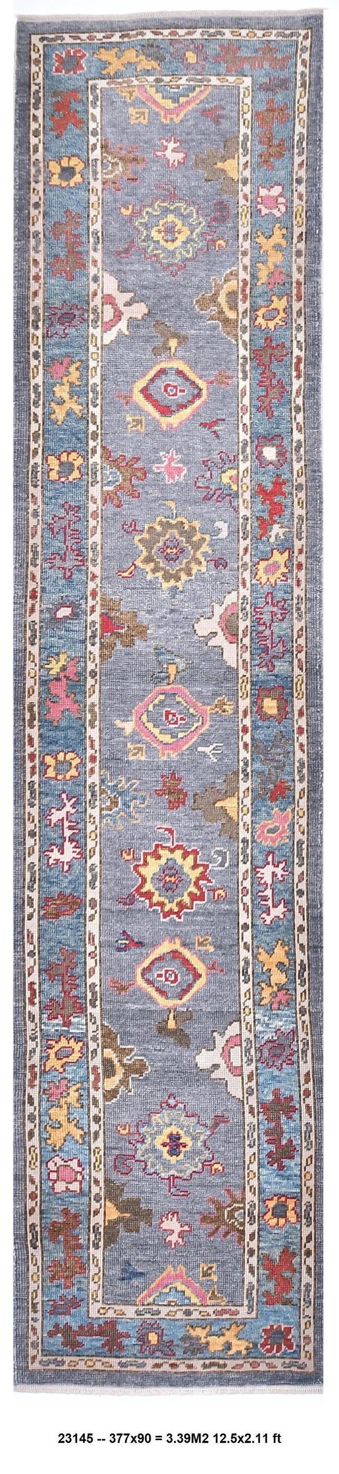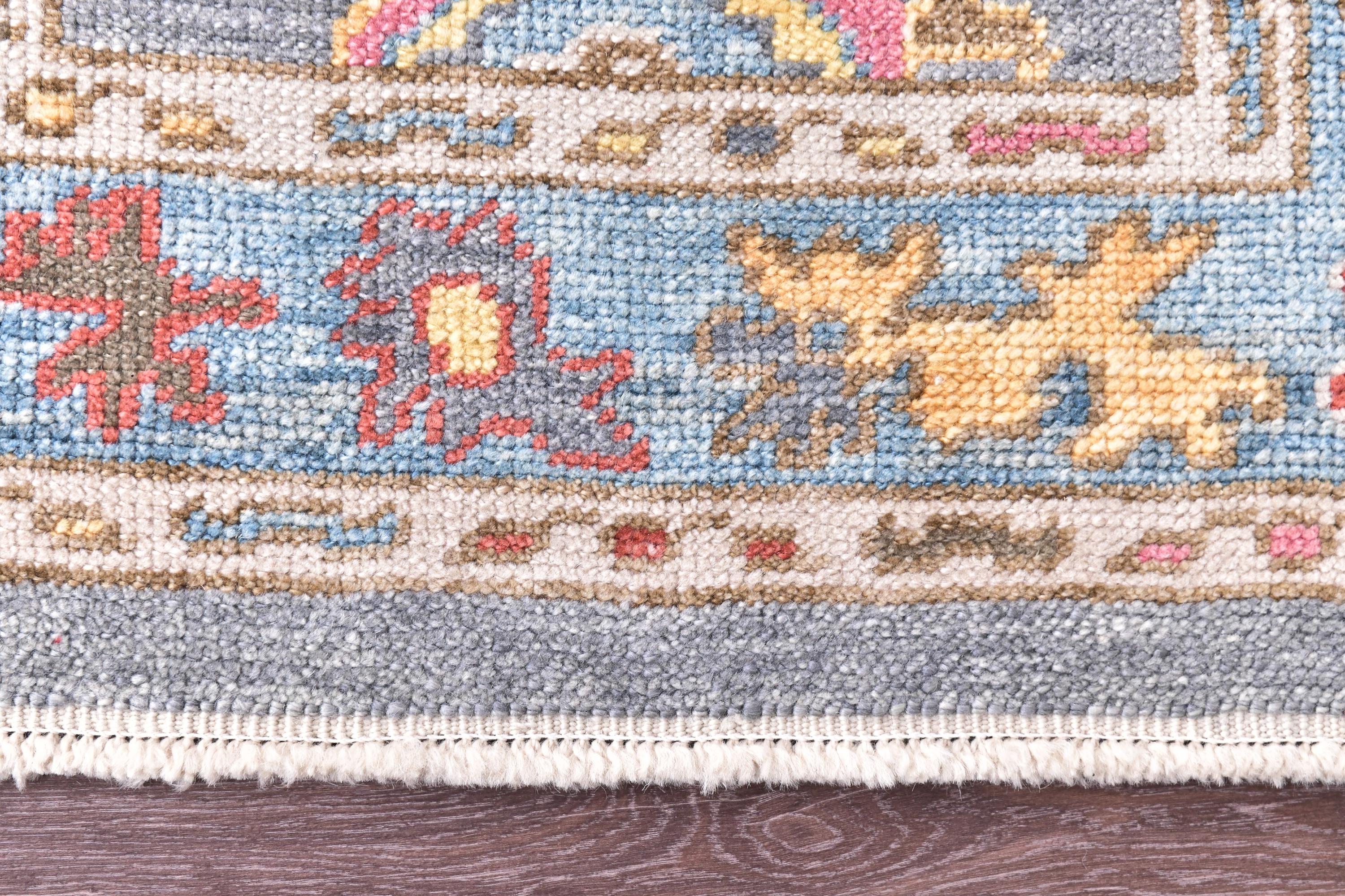 📜📌 Hand knotted Vintage Turkish Oushak runner rug with a steel blue and slate gray wool pile, featuring traditional floral medallion motifs in red, golden yellow, pink, and brown on an ivory bordered background. Long narrow hallway runner with vibrant multicolor geometric and botanical patterns in classic Anatolian style.
