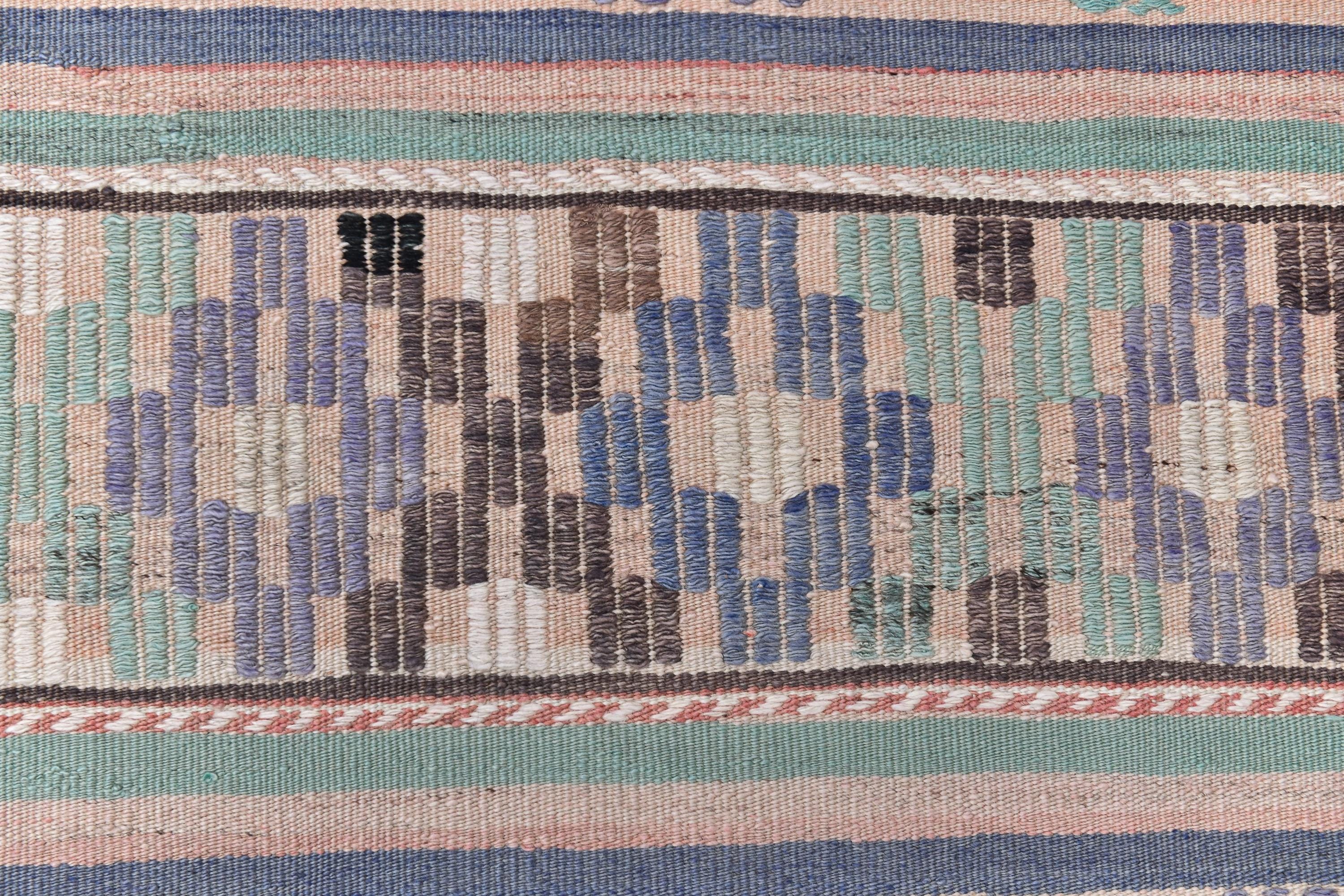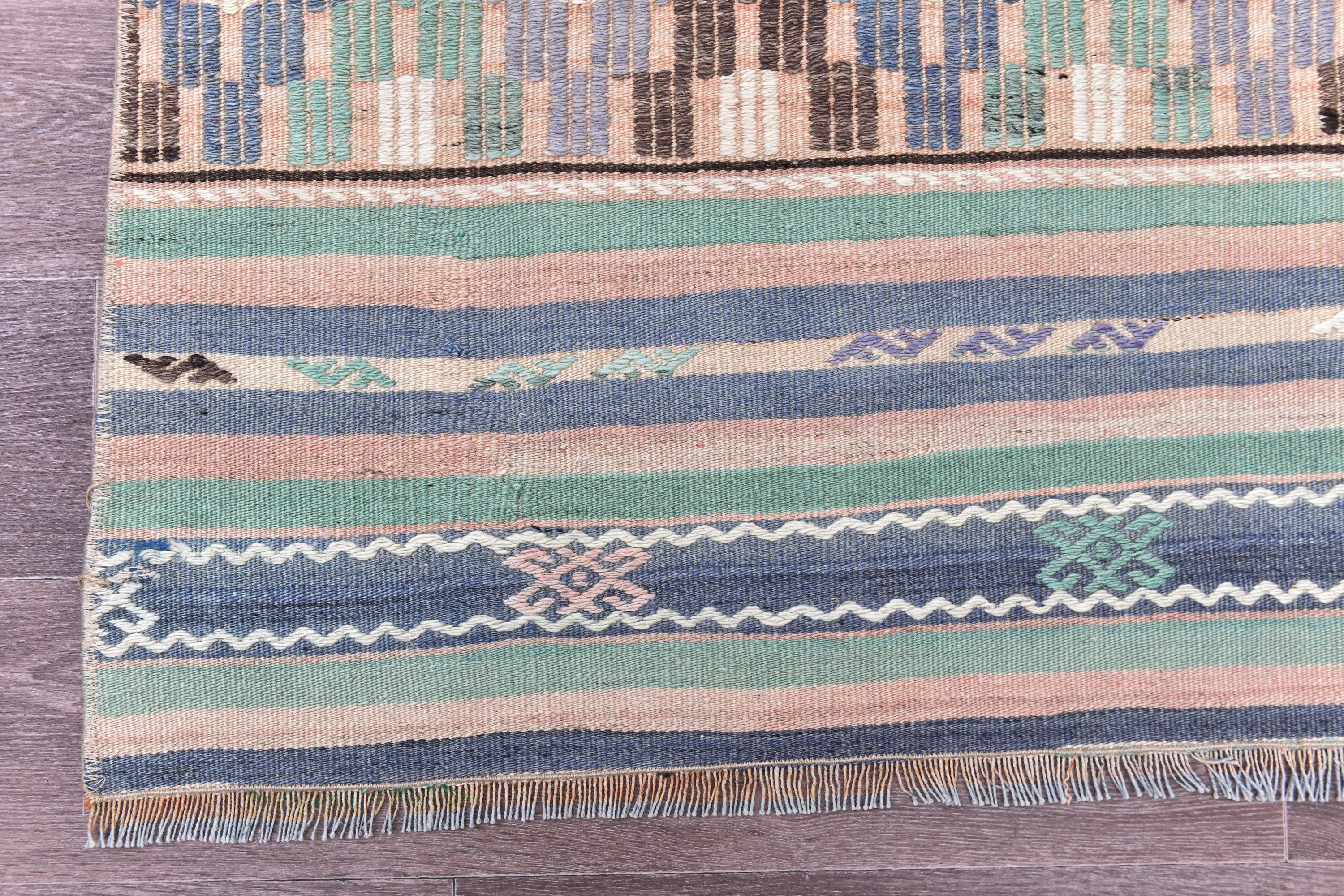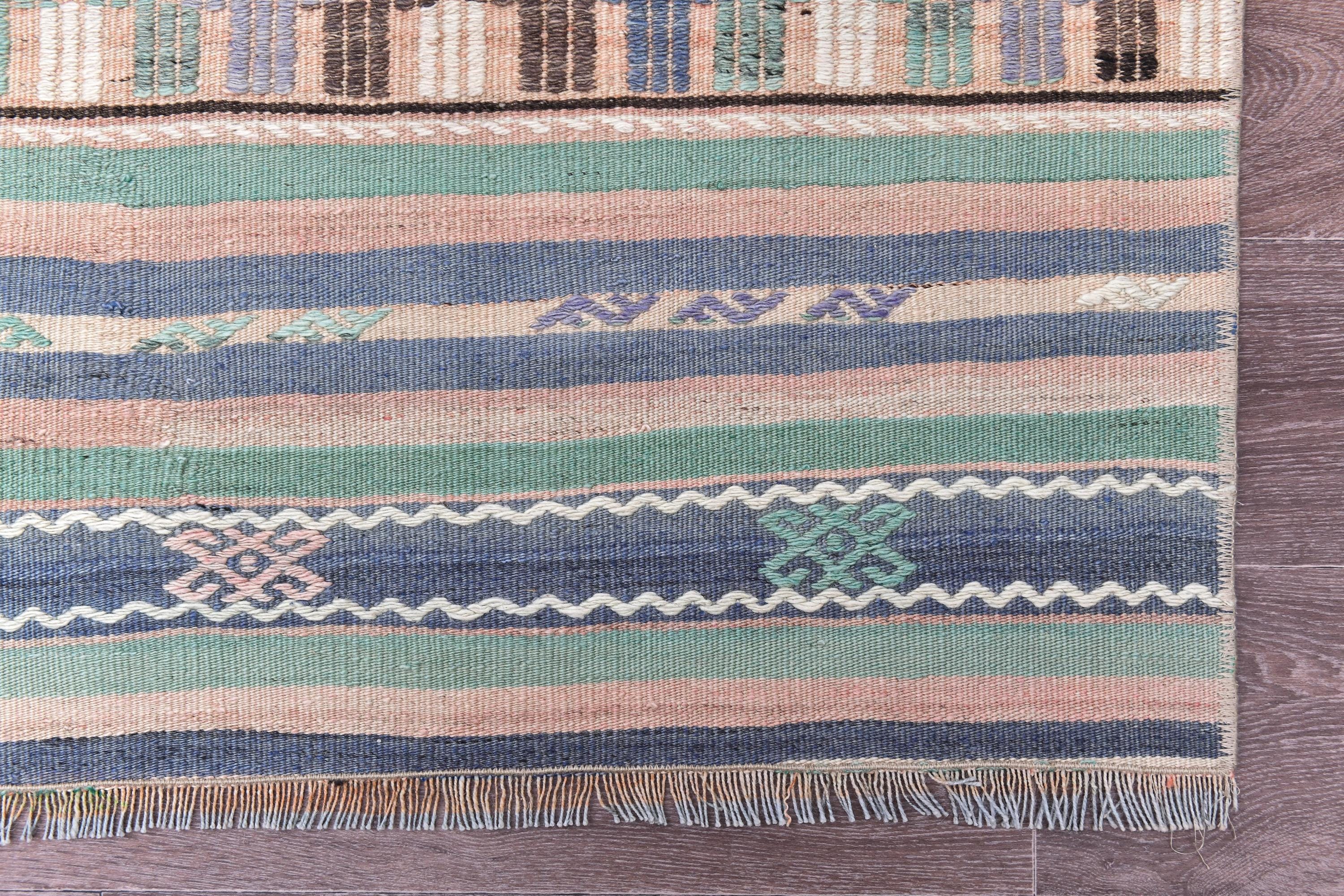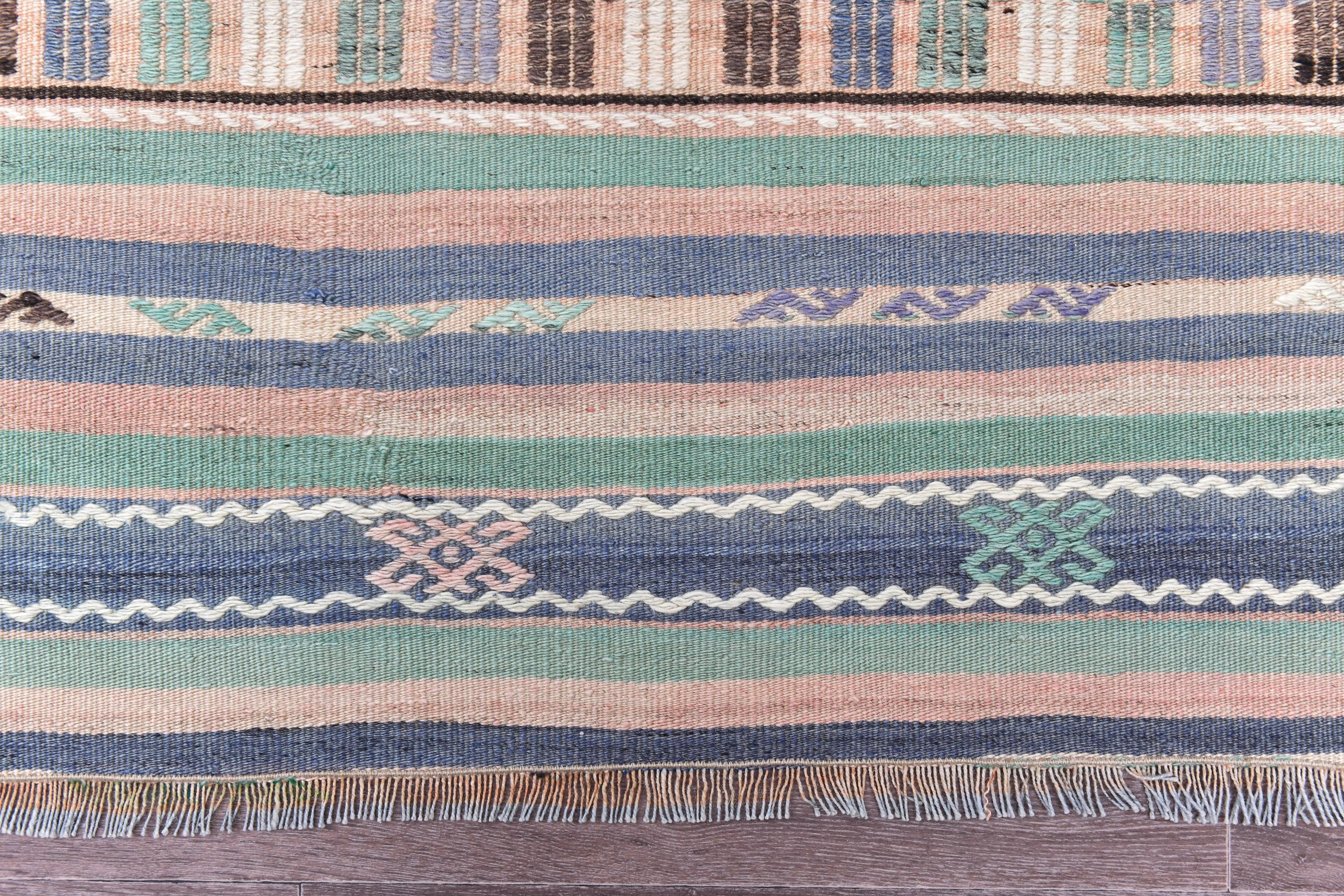 📜📌 Long handwoven Turkish kilim runner rug featuring alternating horizontal stripe bands in dusty blue, mint green, blush pink, and ivory, interspersed with geometric diamond and star motif panels in black, brown, and teal. Traditional flatweave wool construction with natural fringe ends and zigzag border details in classic Anatolian tribal style. Ideal for hallways and entryways.