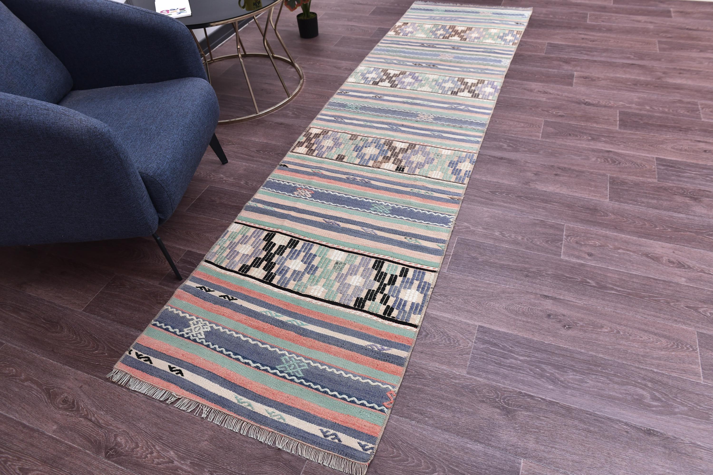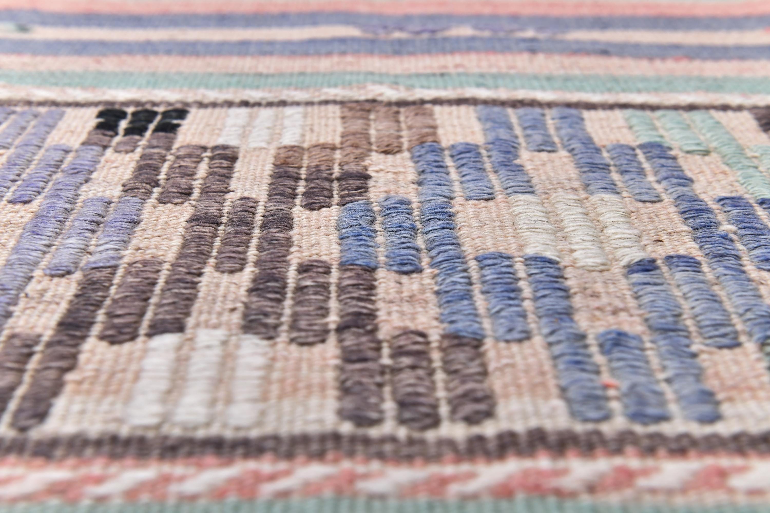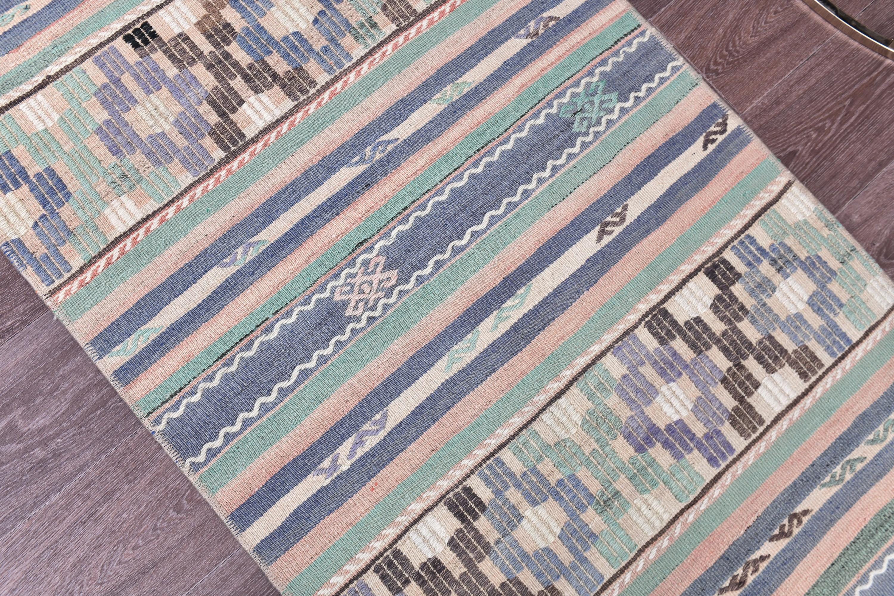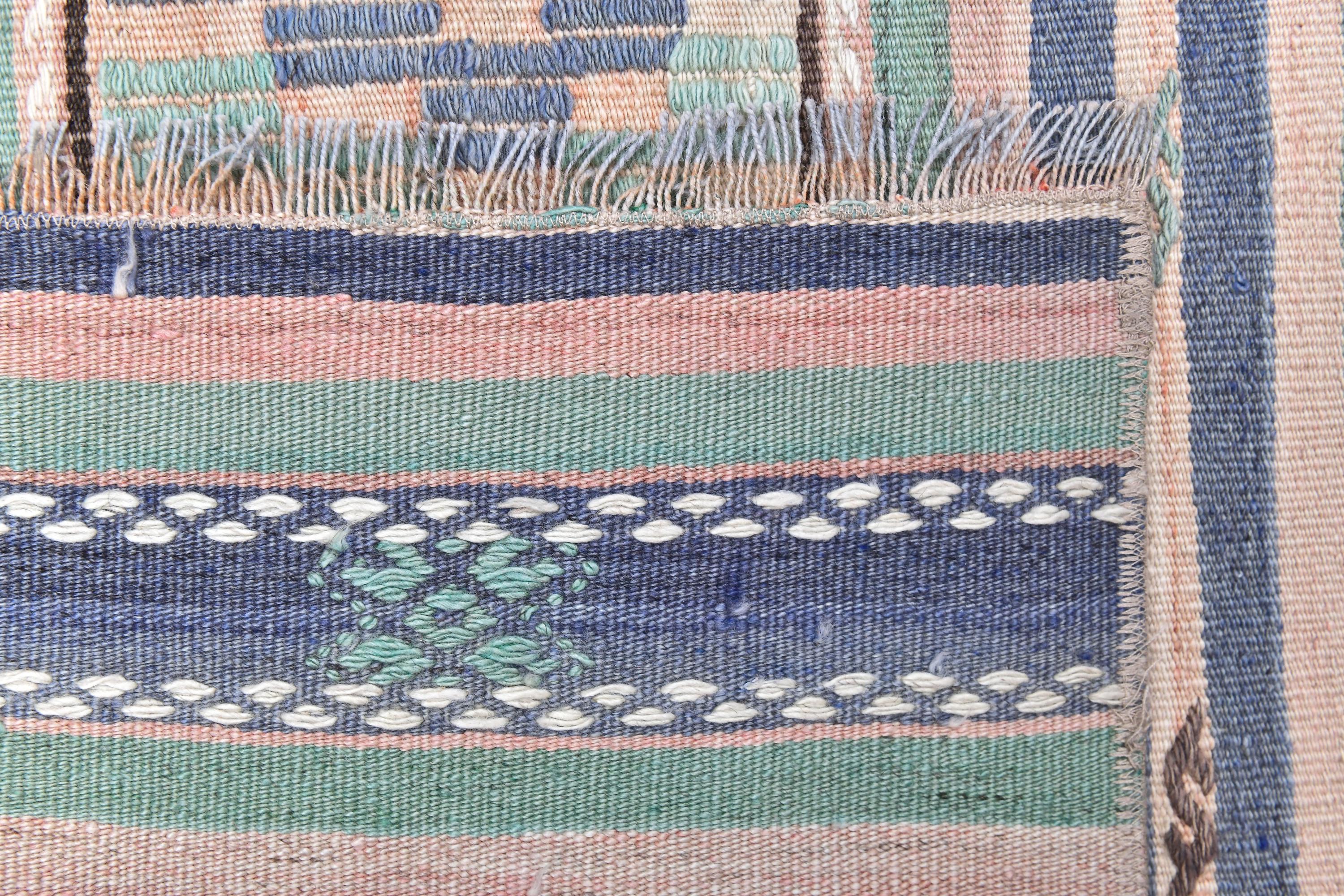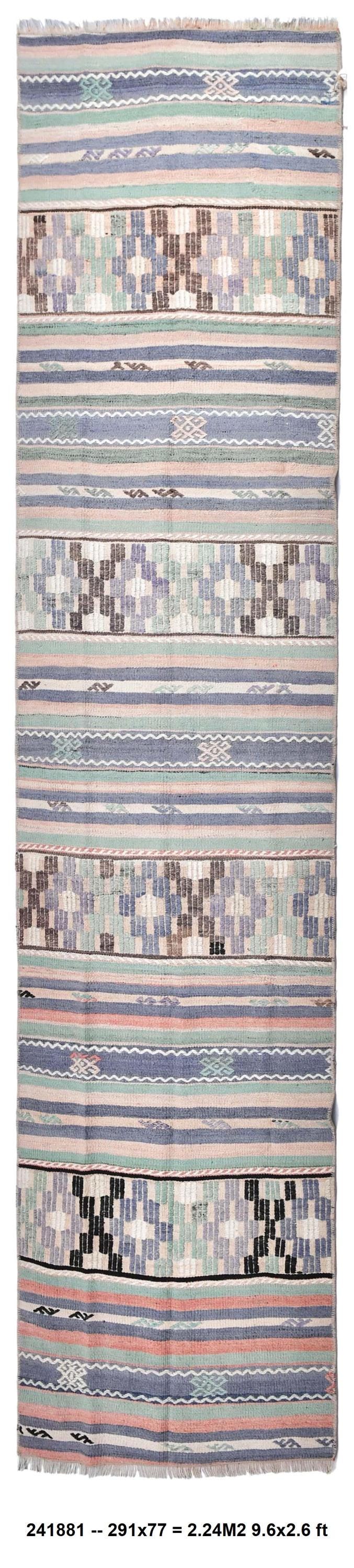 📜📌 Long handwoven Turkish kilim runner rug featuring alternating horizontal stripe bands in dusty blue, mint green, blush pink, and ivory, interspersed with geometric diamond and star motif panels in black, brown, and teal. Traditional flatweave wool construction with natural fringe ends and zigzag border details in classic Anatolian tribal style. Ideal for hallways and entryways.
