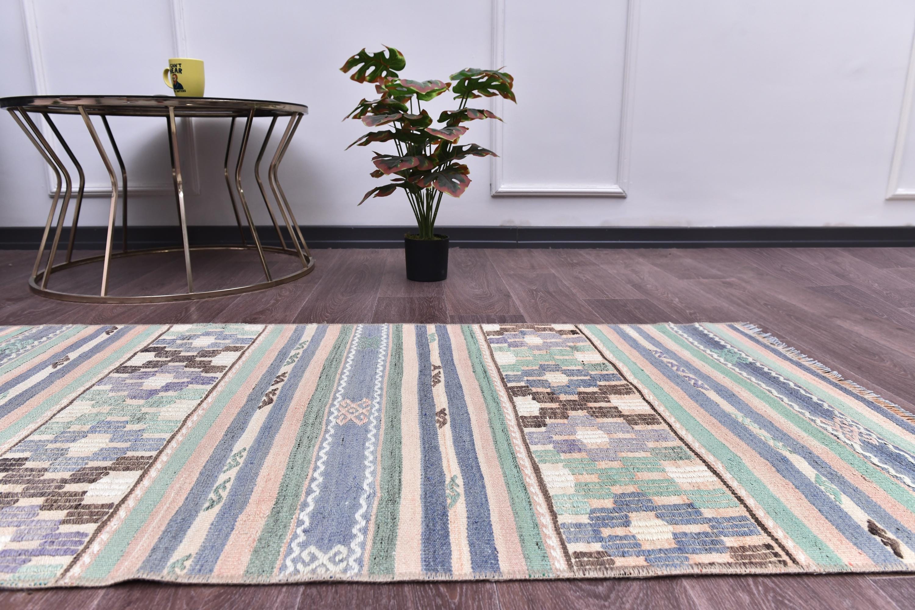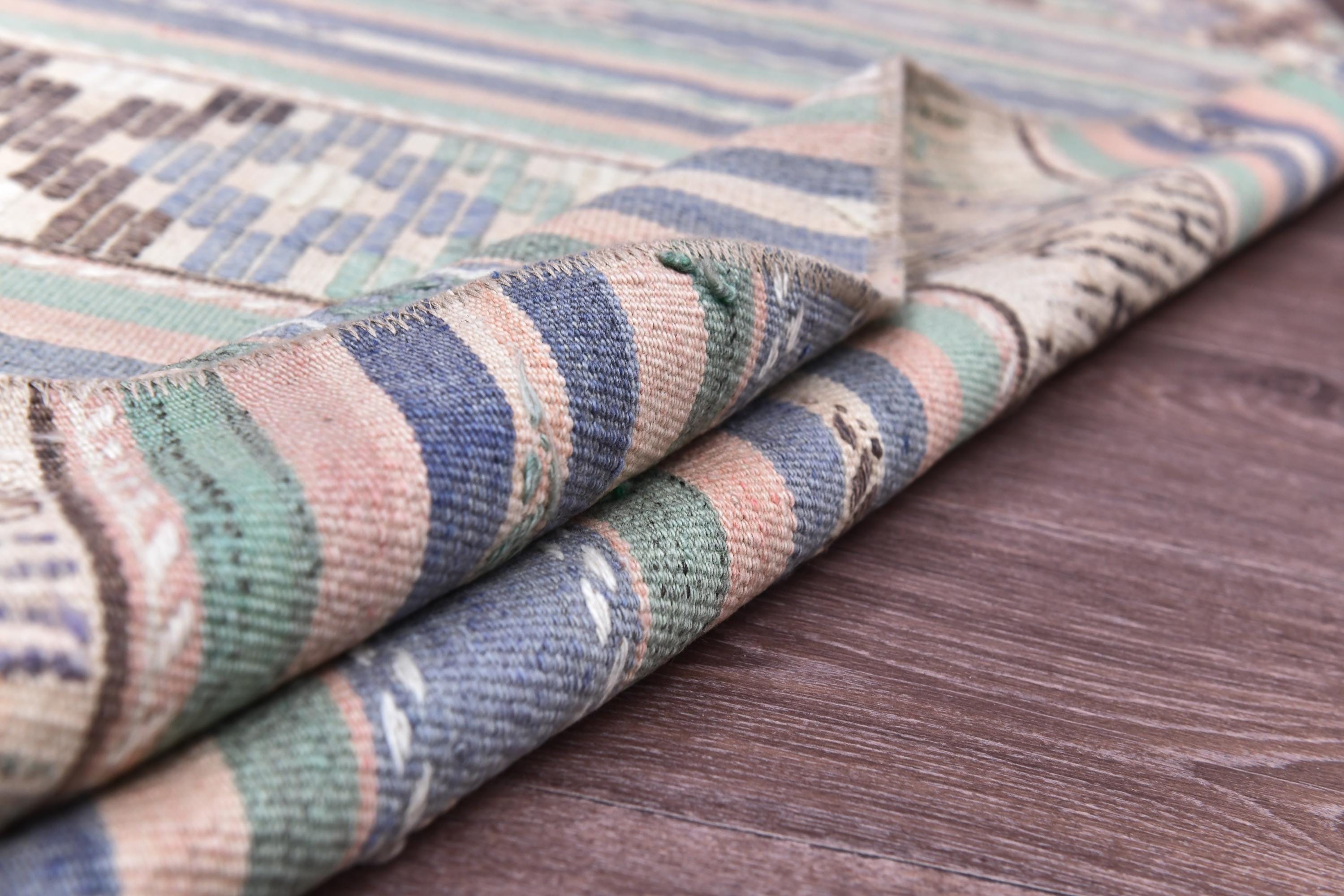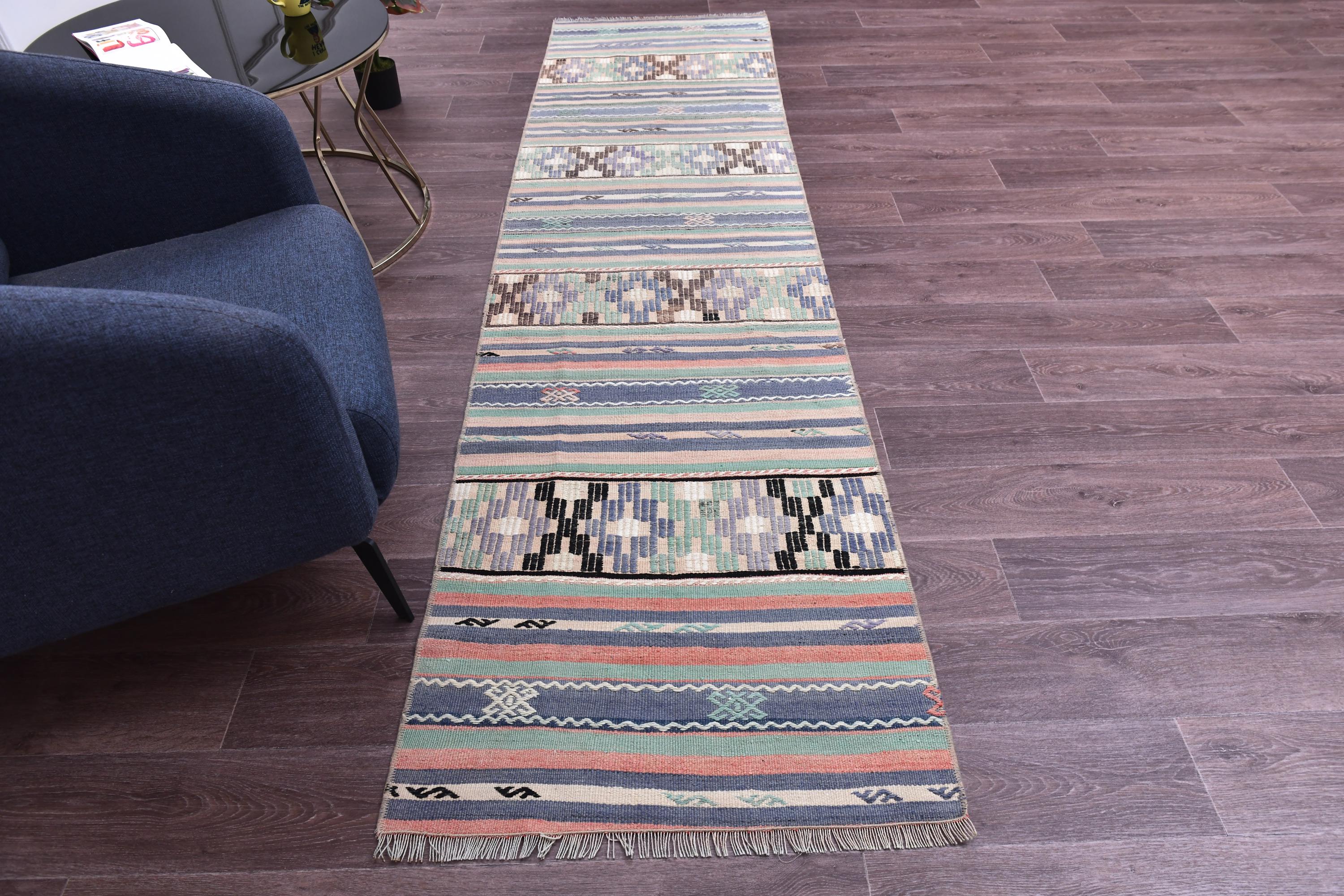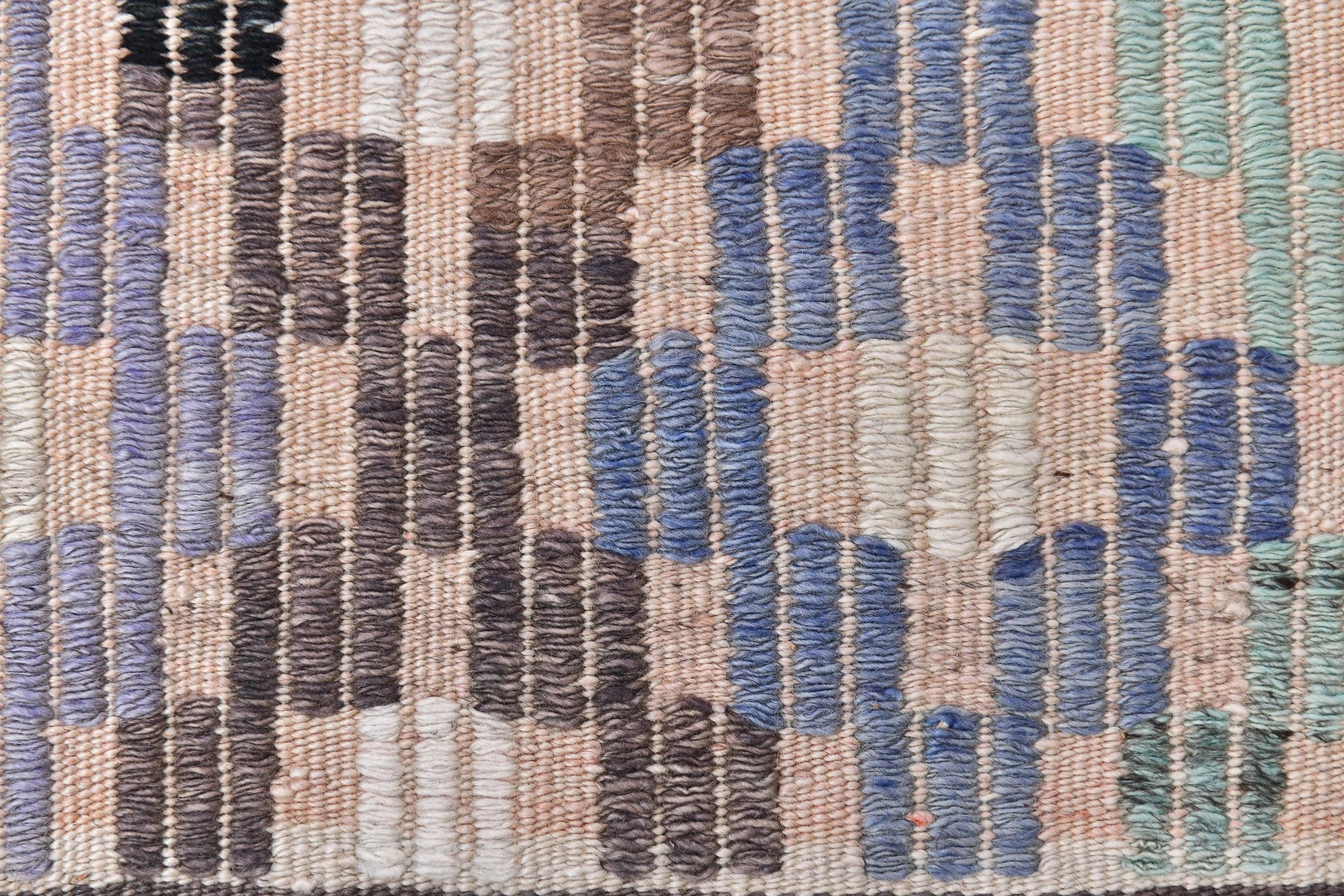 📜📌 Long handwoven Turkish kilim runner rug featuring alternating horizontal stripe bands in dusty blue, mint green, blush pink, and ivory, interspersed with geometric diamond and star motif panels in black, brown, and teal. Traditional flatweave wool construction with natural fringe ends and zigzag border details in classic Anatolian tribal style. Ideal for hallways and entryways.