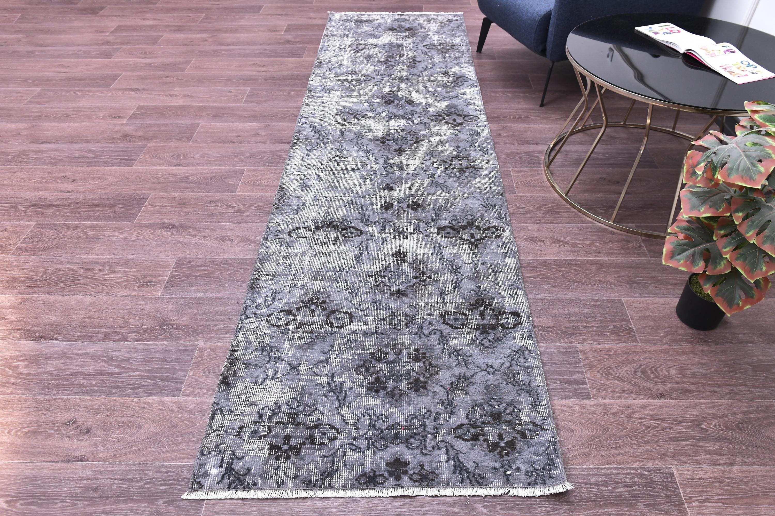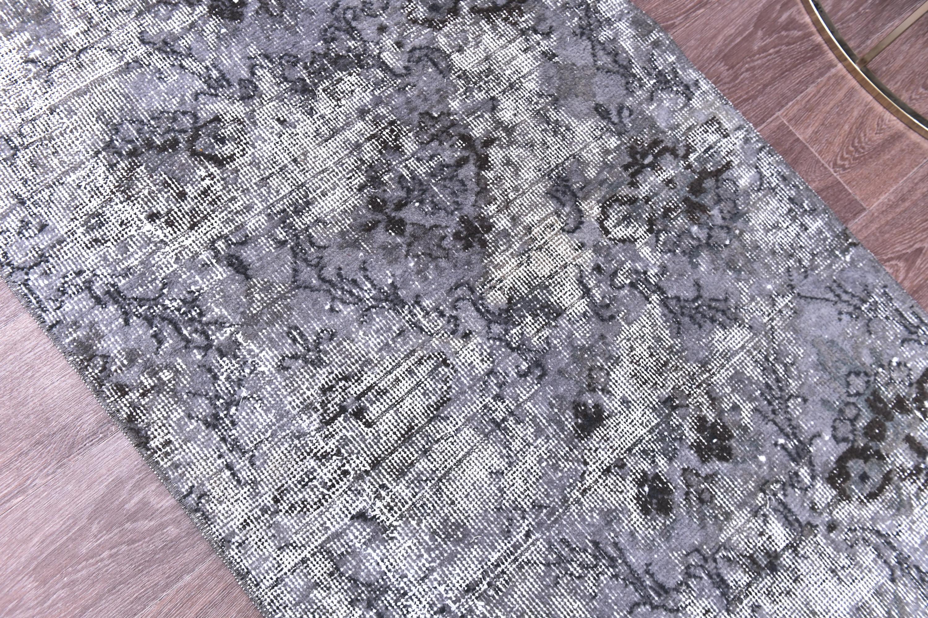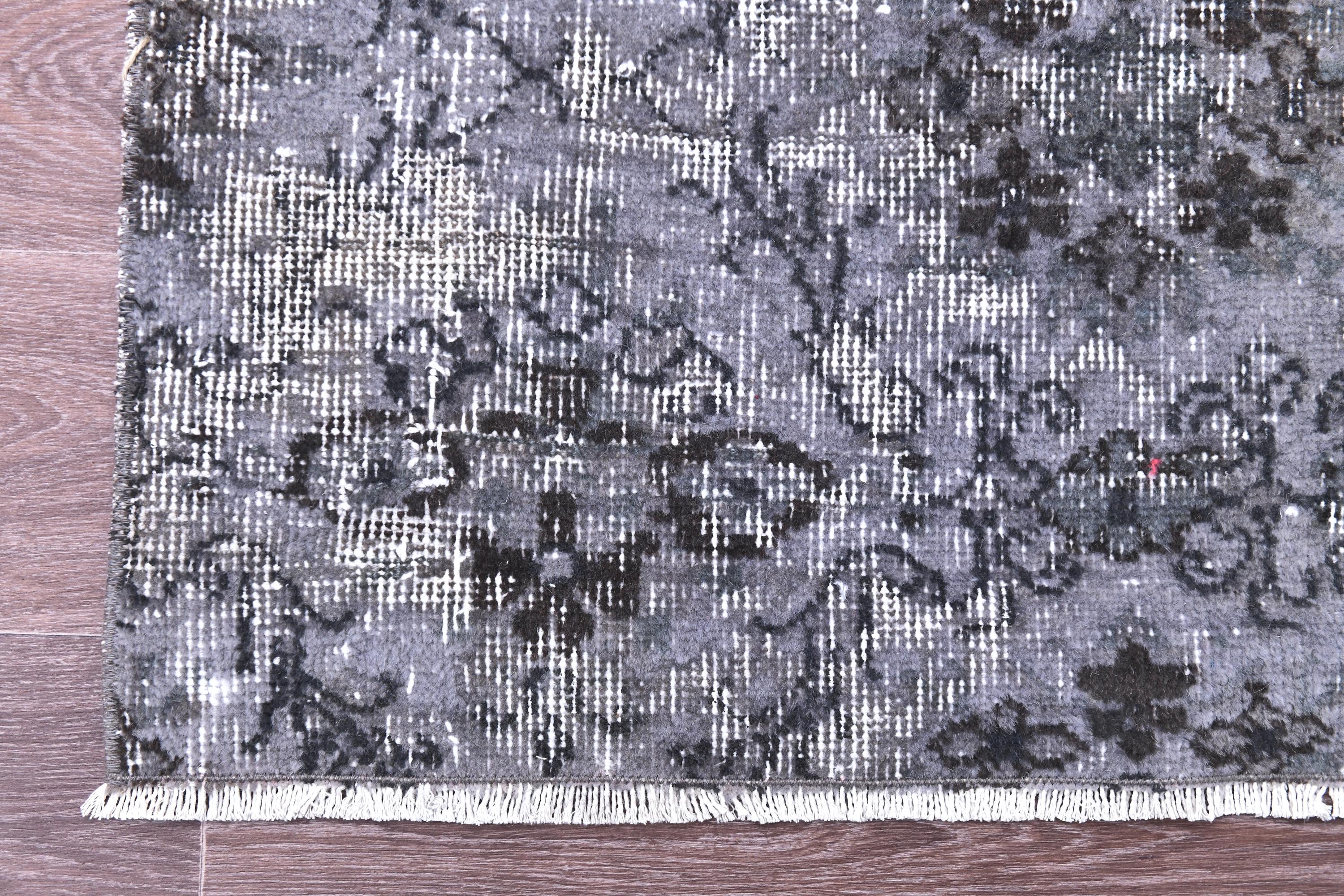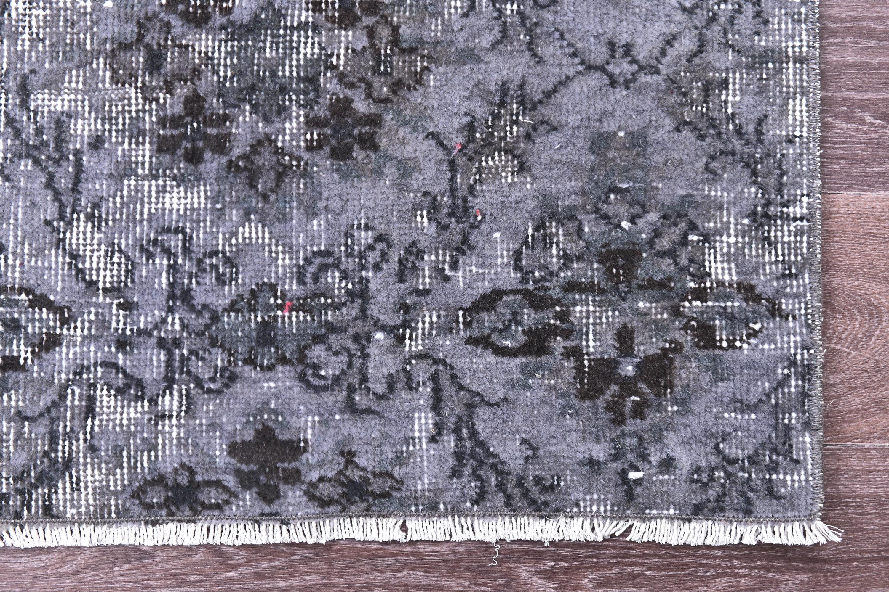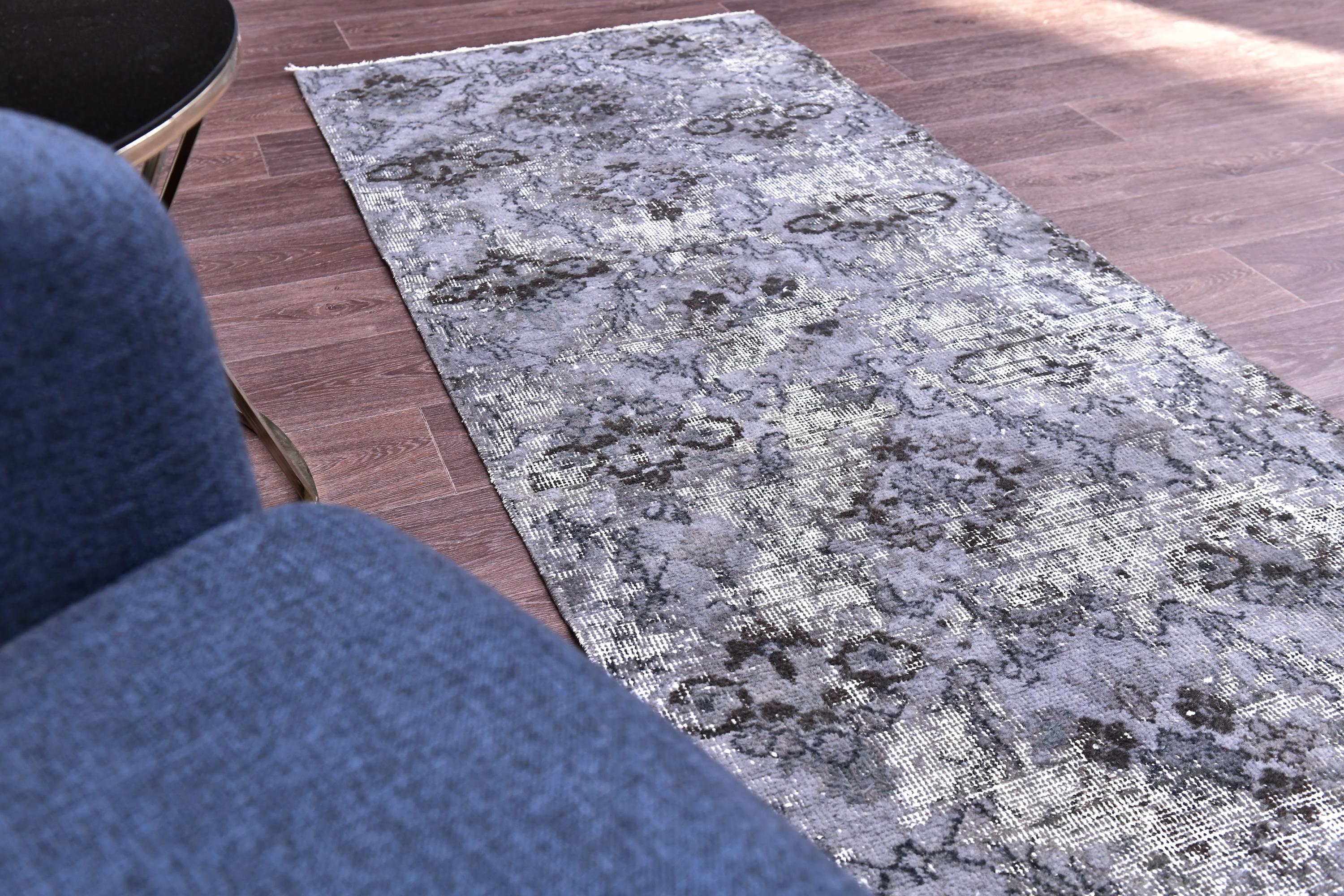 📜📌 A distressed vintage Turkish runner rug in dark charcoal and slate grey tones, featuring an abstract floral and vine pattern with a heavily worn, overdyed finish, displayed on hardwood flooring.
