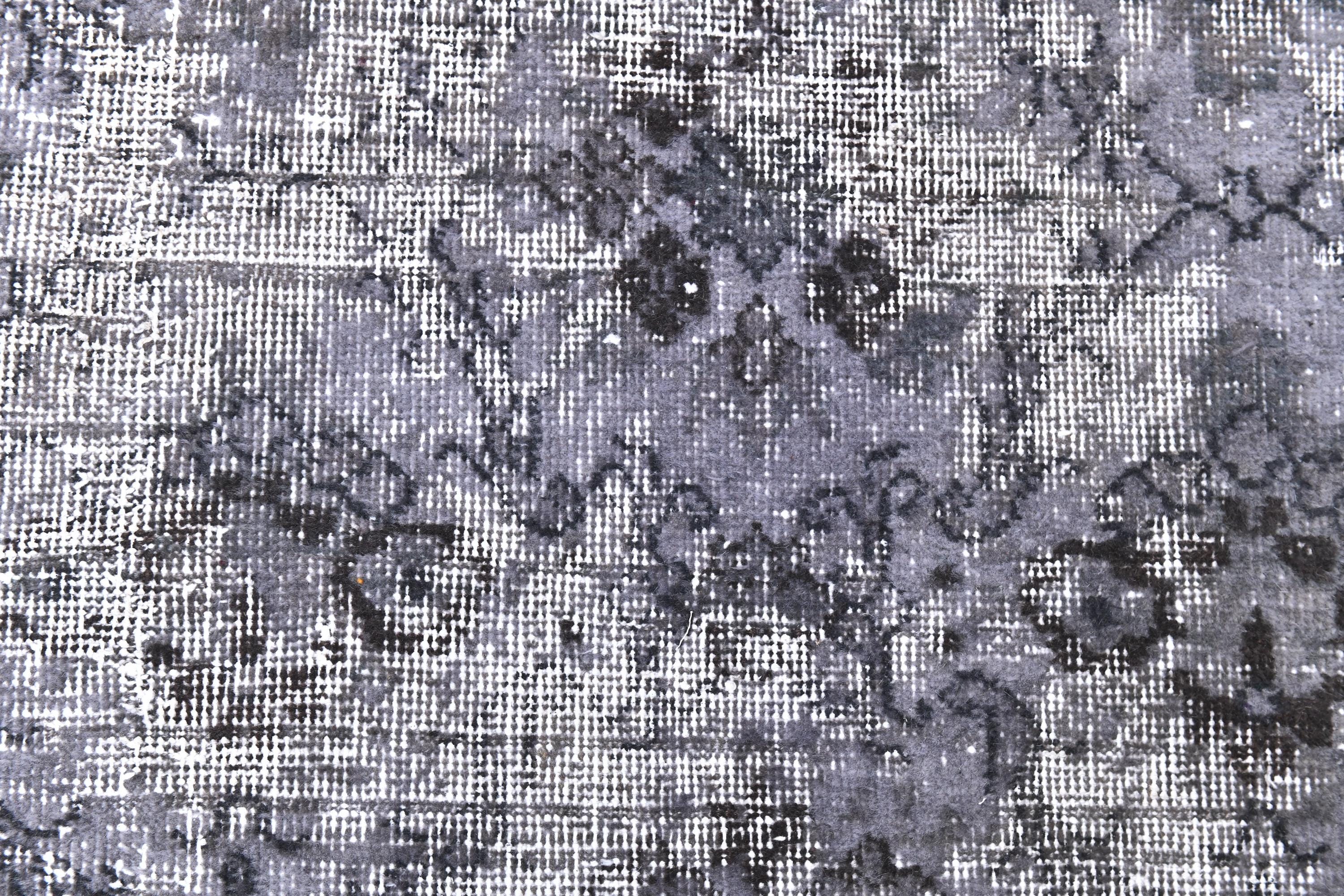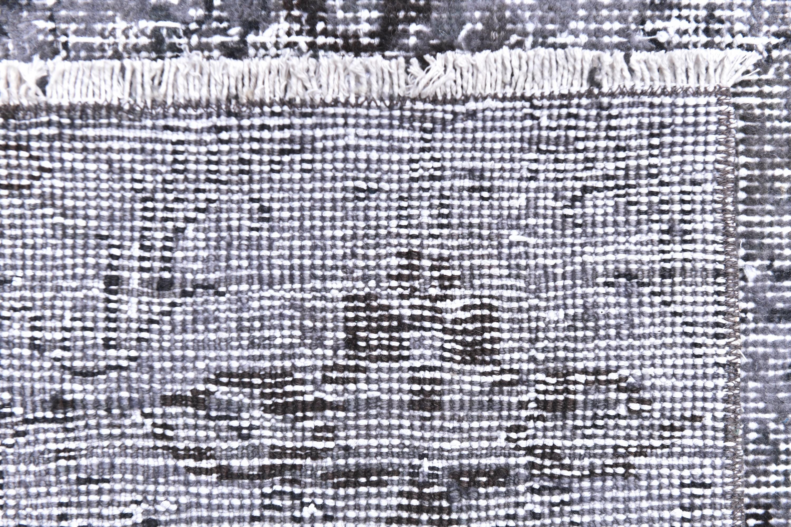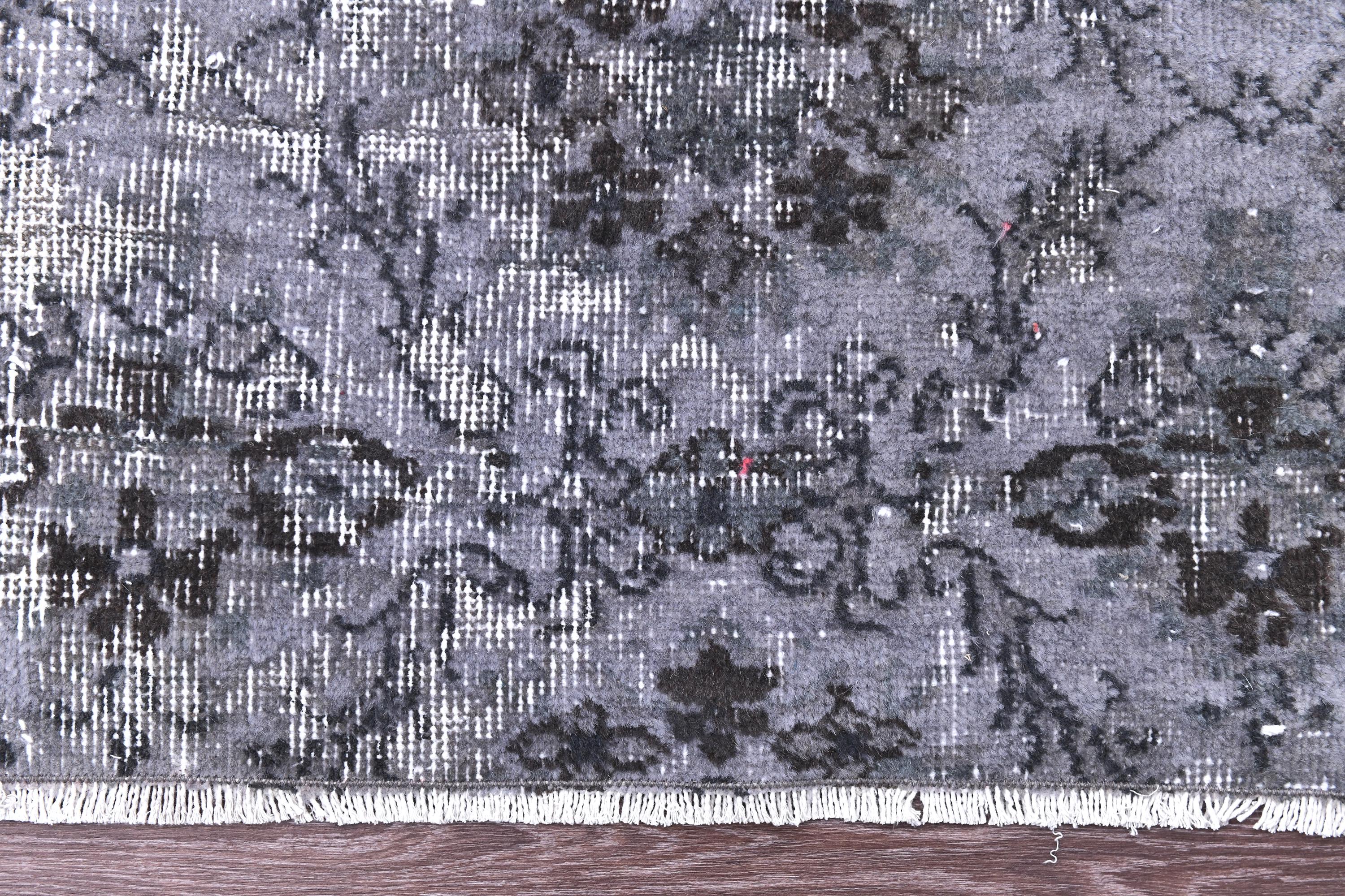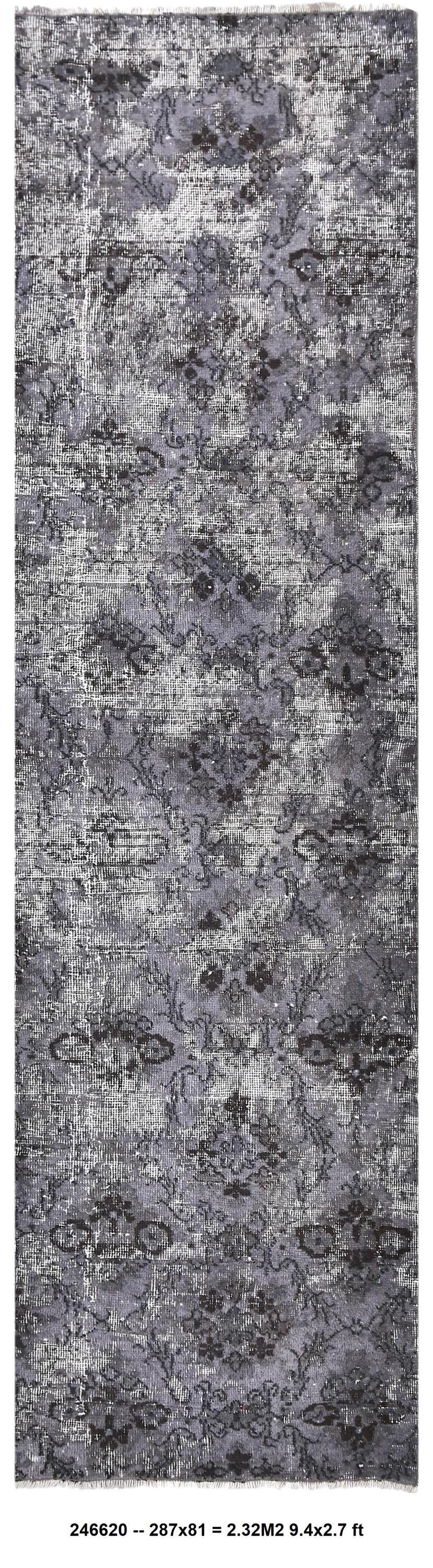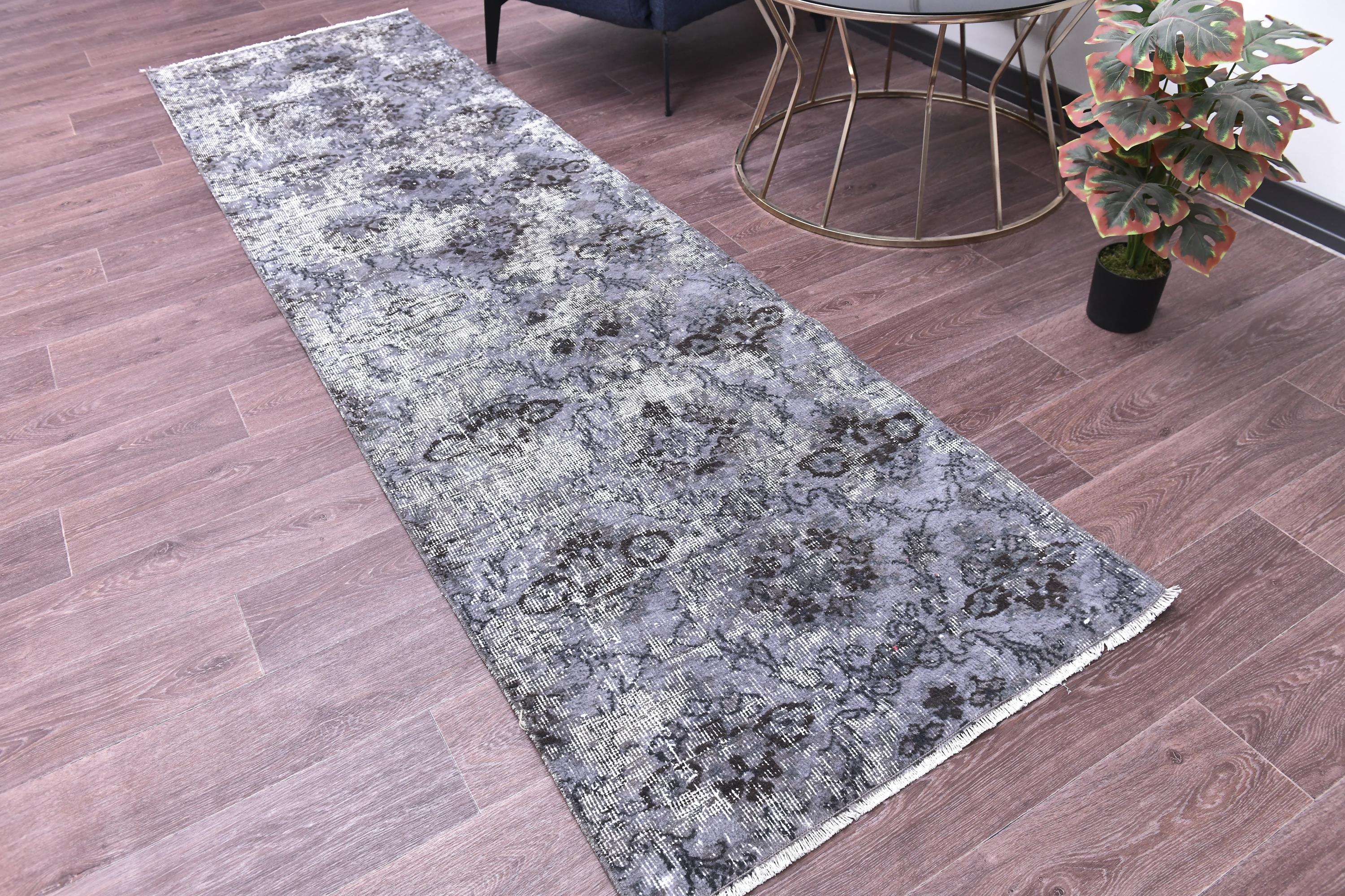 📜📌 A distressed vintage Turkish runner rug in dark charcoal and slate grey tones, featuring an abstract floral and vine pattern with a heavily worn, overdyed finish, displayed on hardwood flooring.