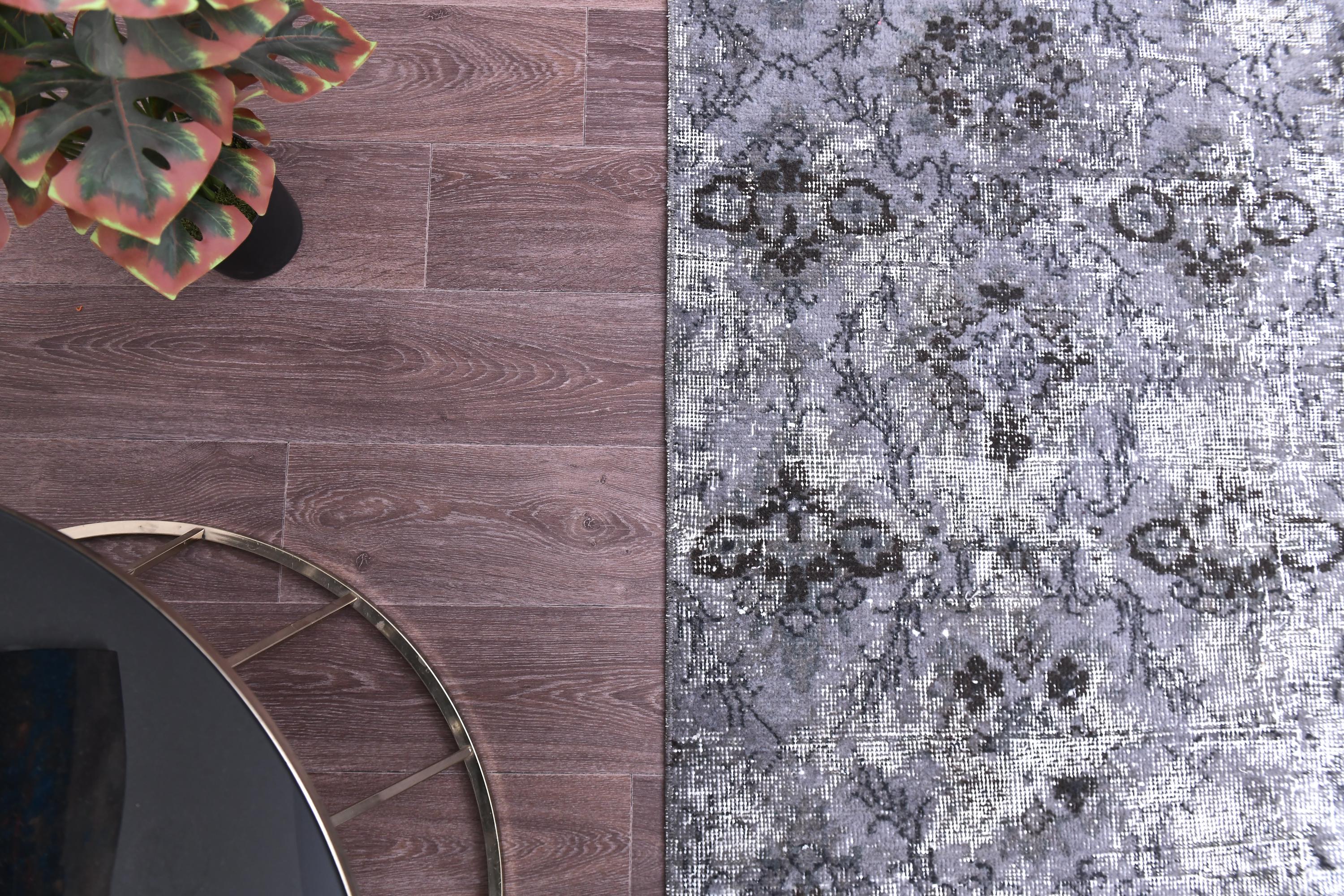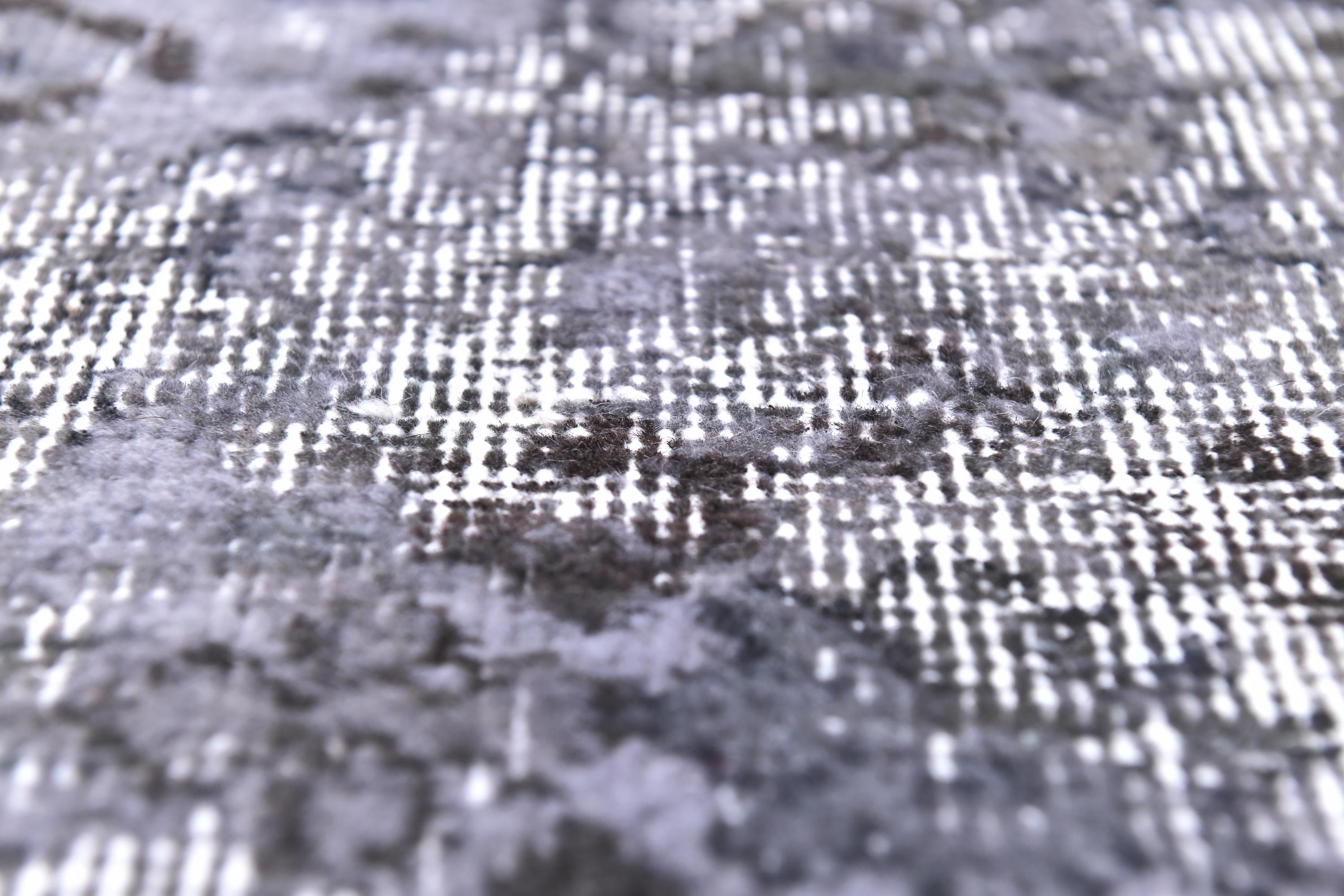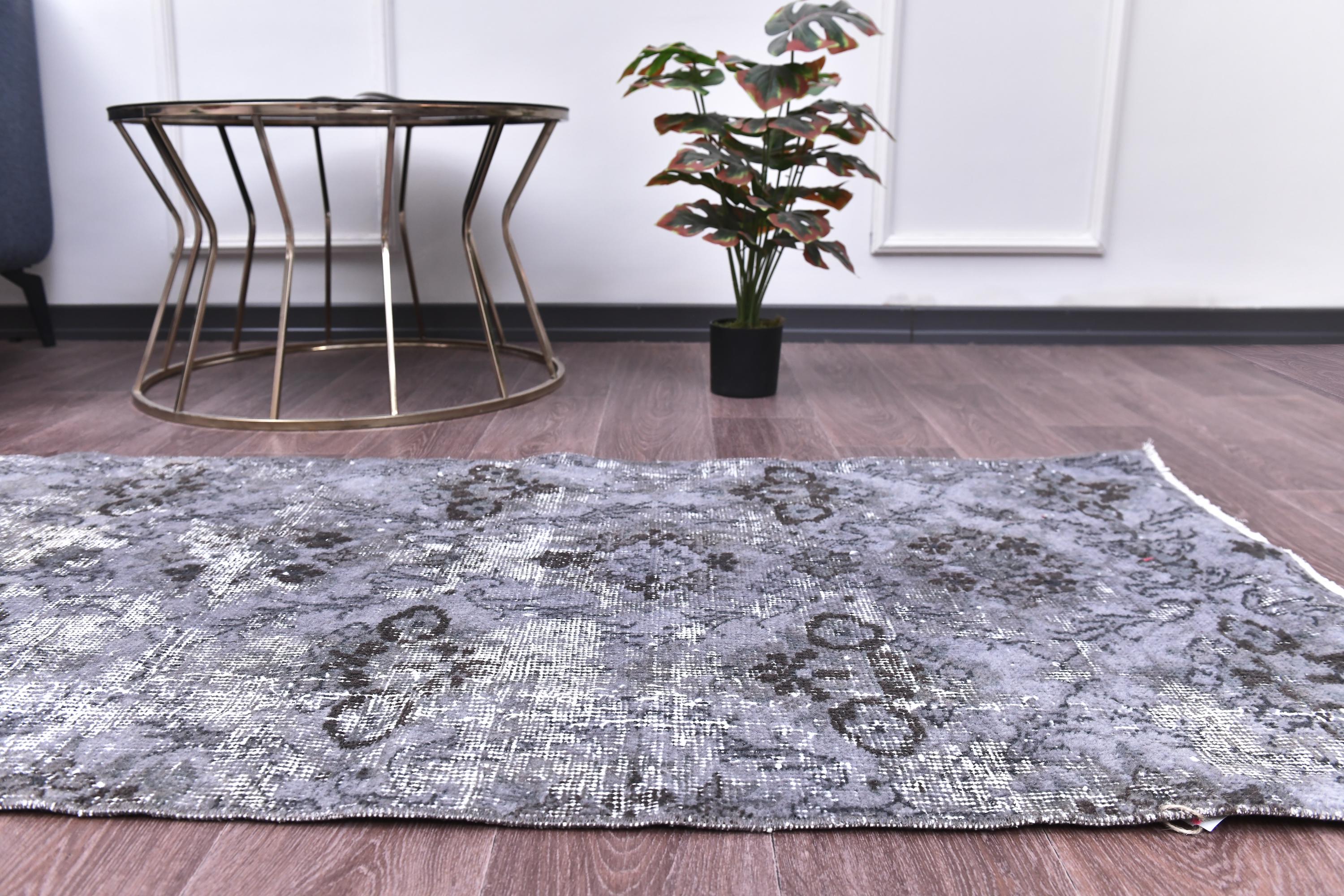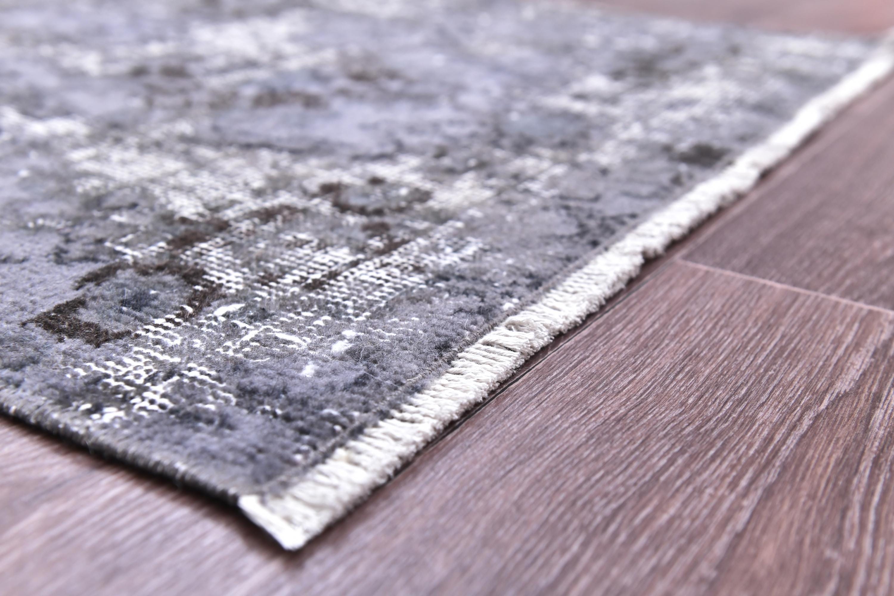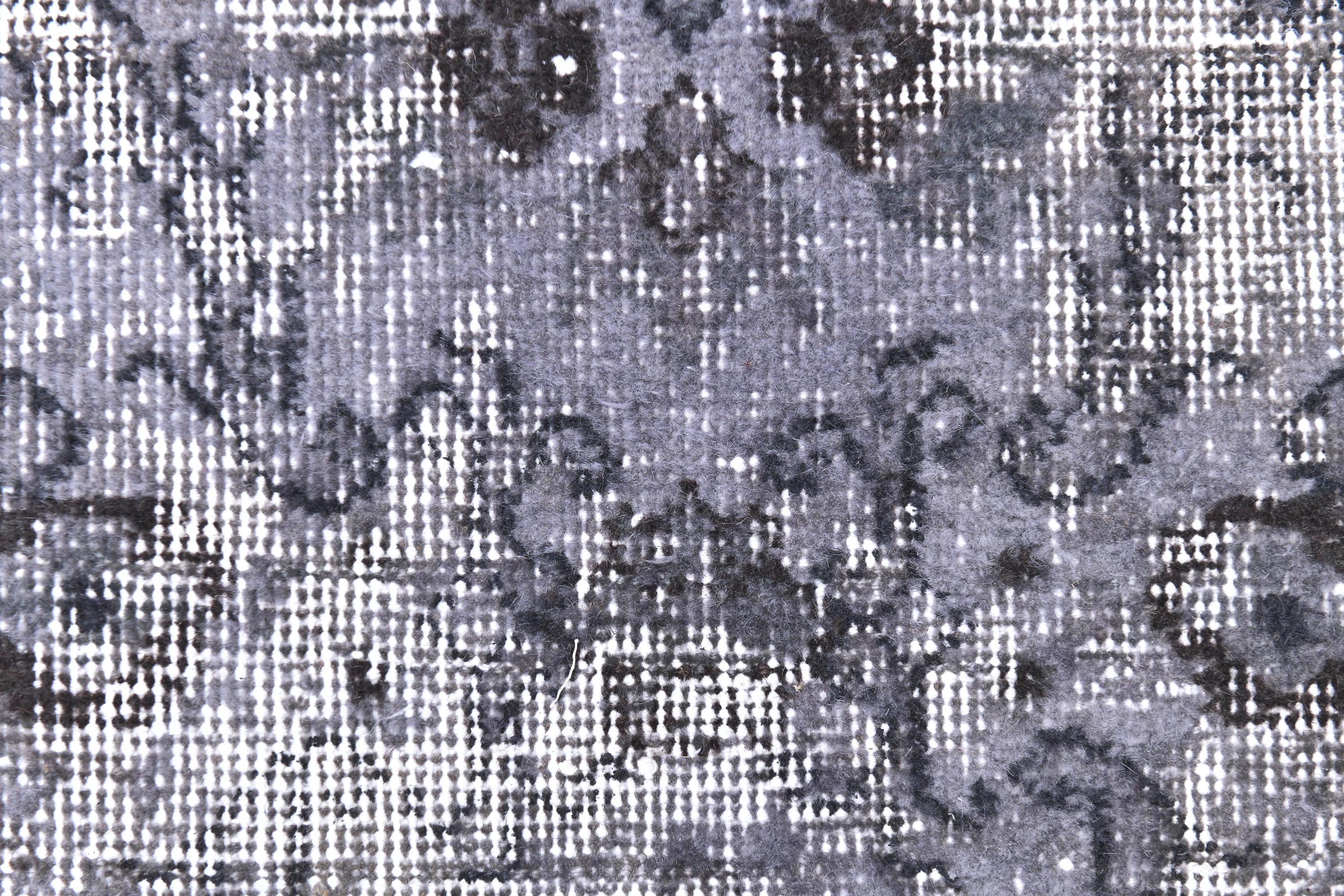 📜📌 A distressed vintage Turkish runner rug in dark charcoal and slate grey tones, featuring an abstract floral and vine pattern with a heavily worn, overdyed finish, displayed on hardwood flooring.