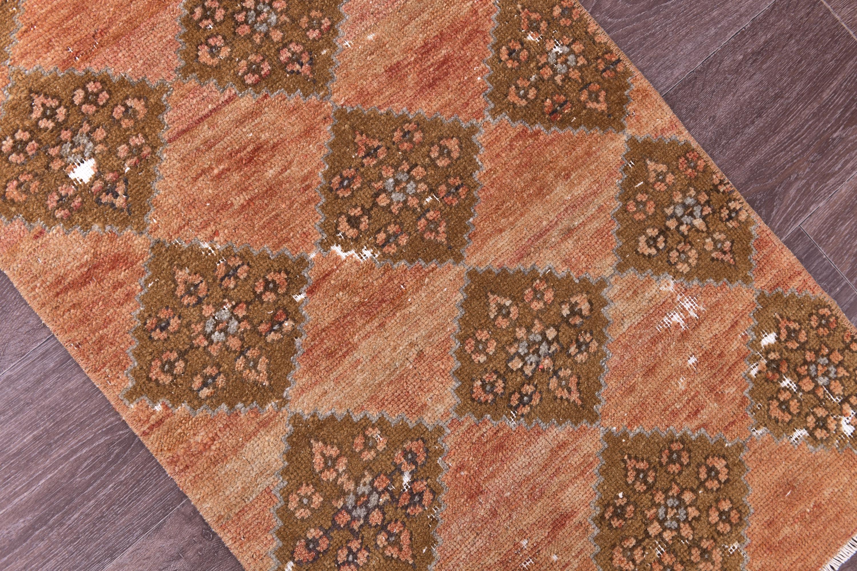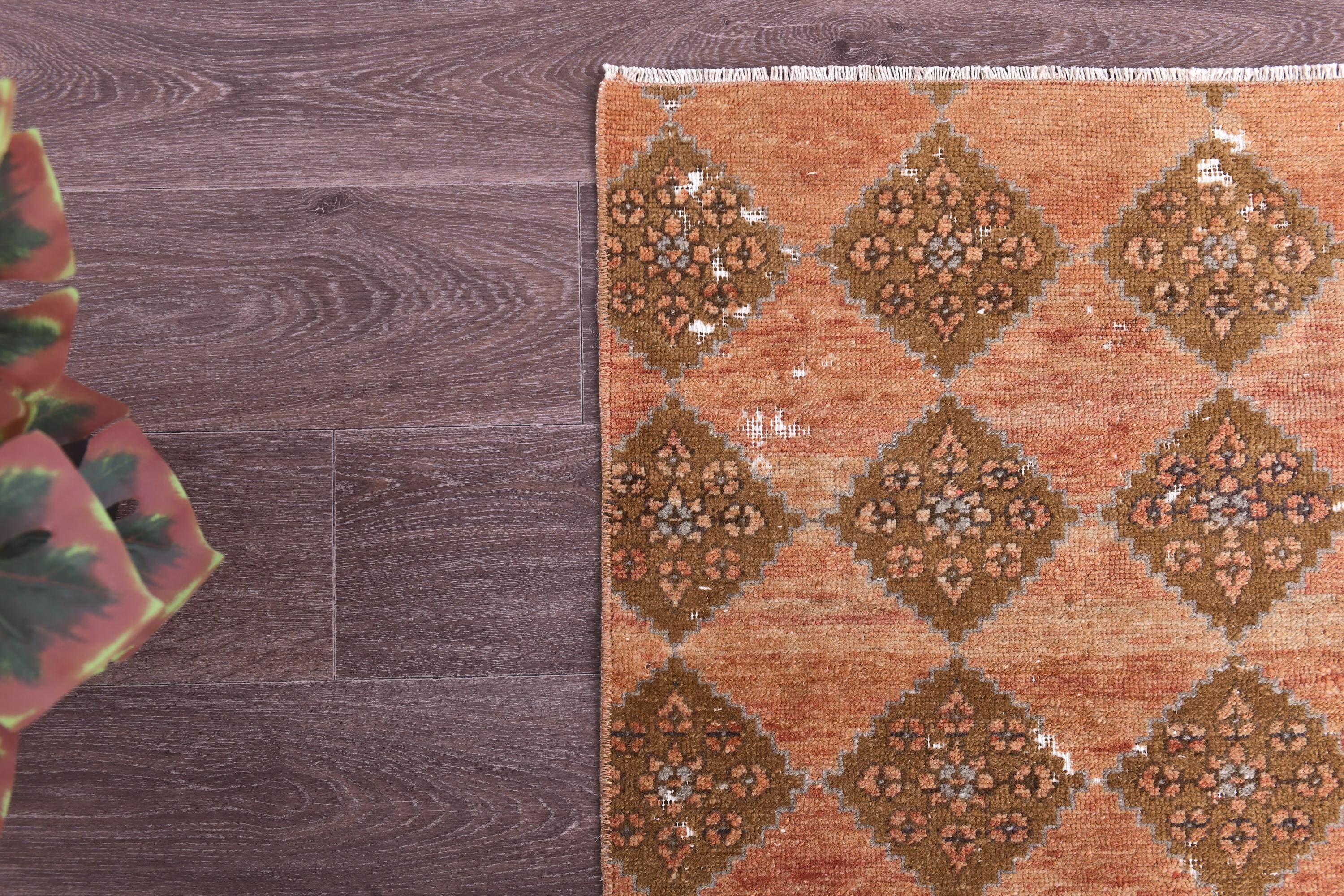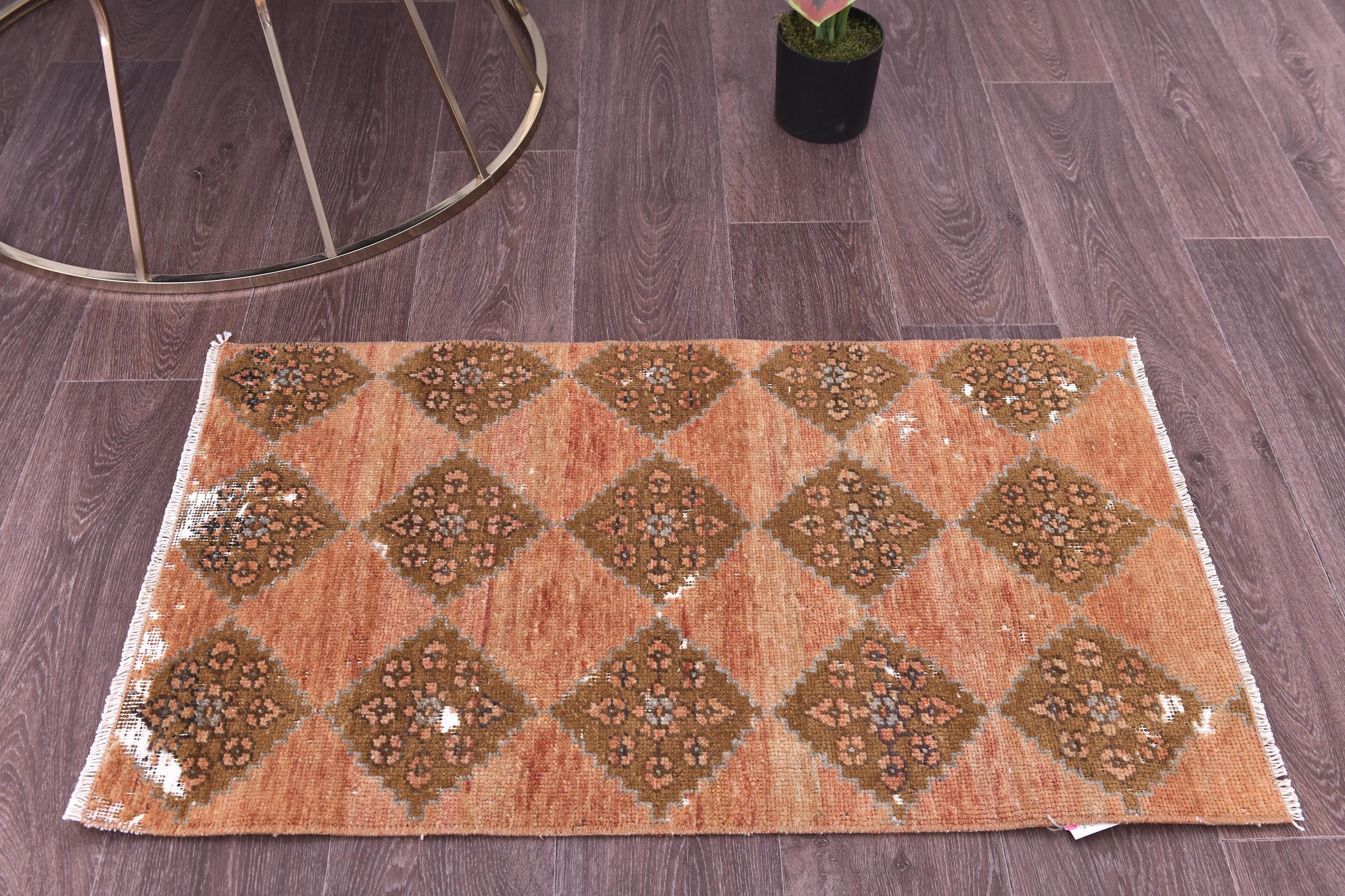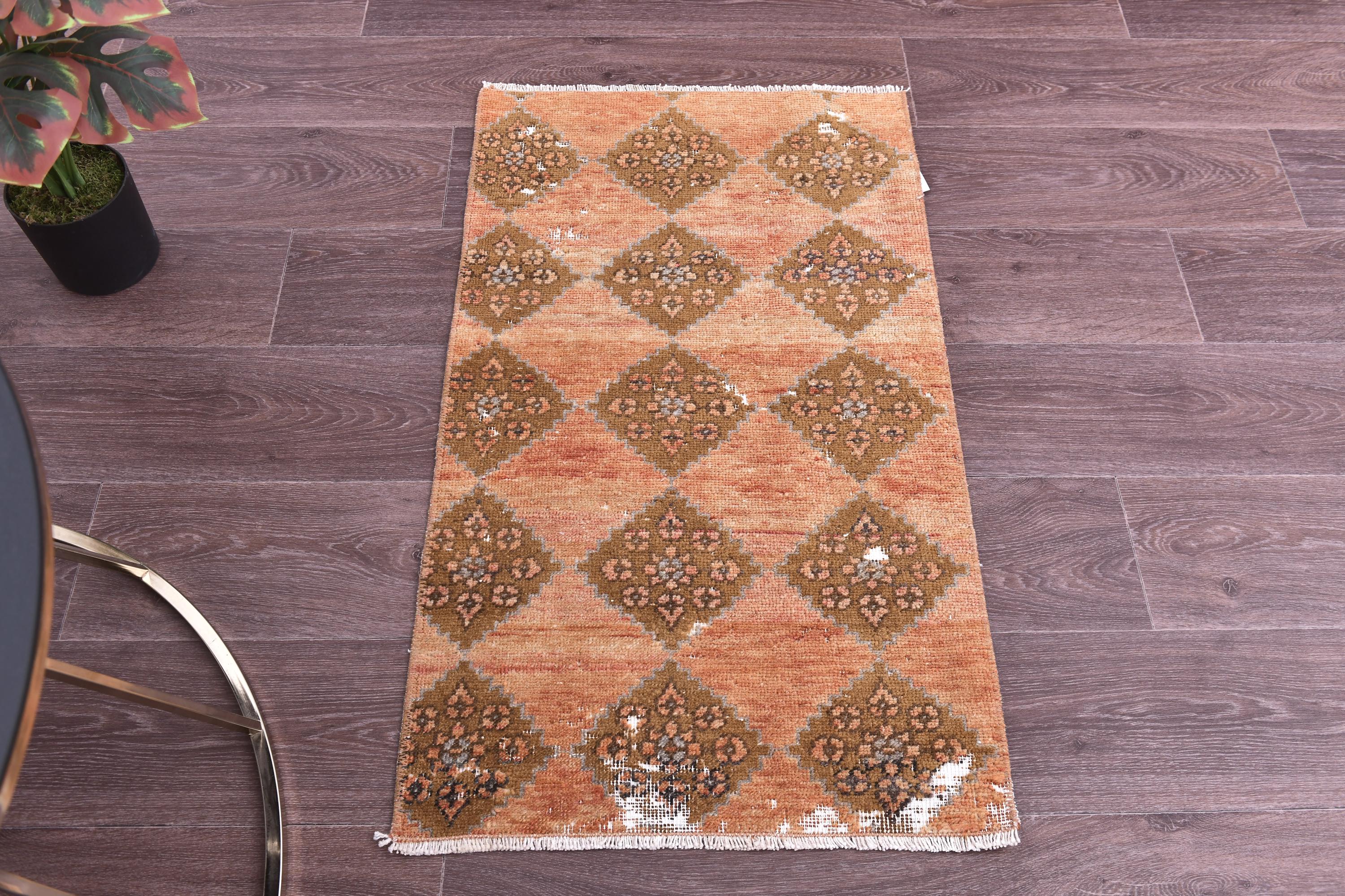 📜📌 Antique Turkish wool doormat displaying geometric diamond grid design in moss green and brown tones on faded terracotta orange field with visible age-related wear adding rustic character