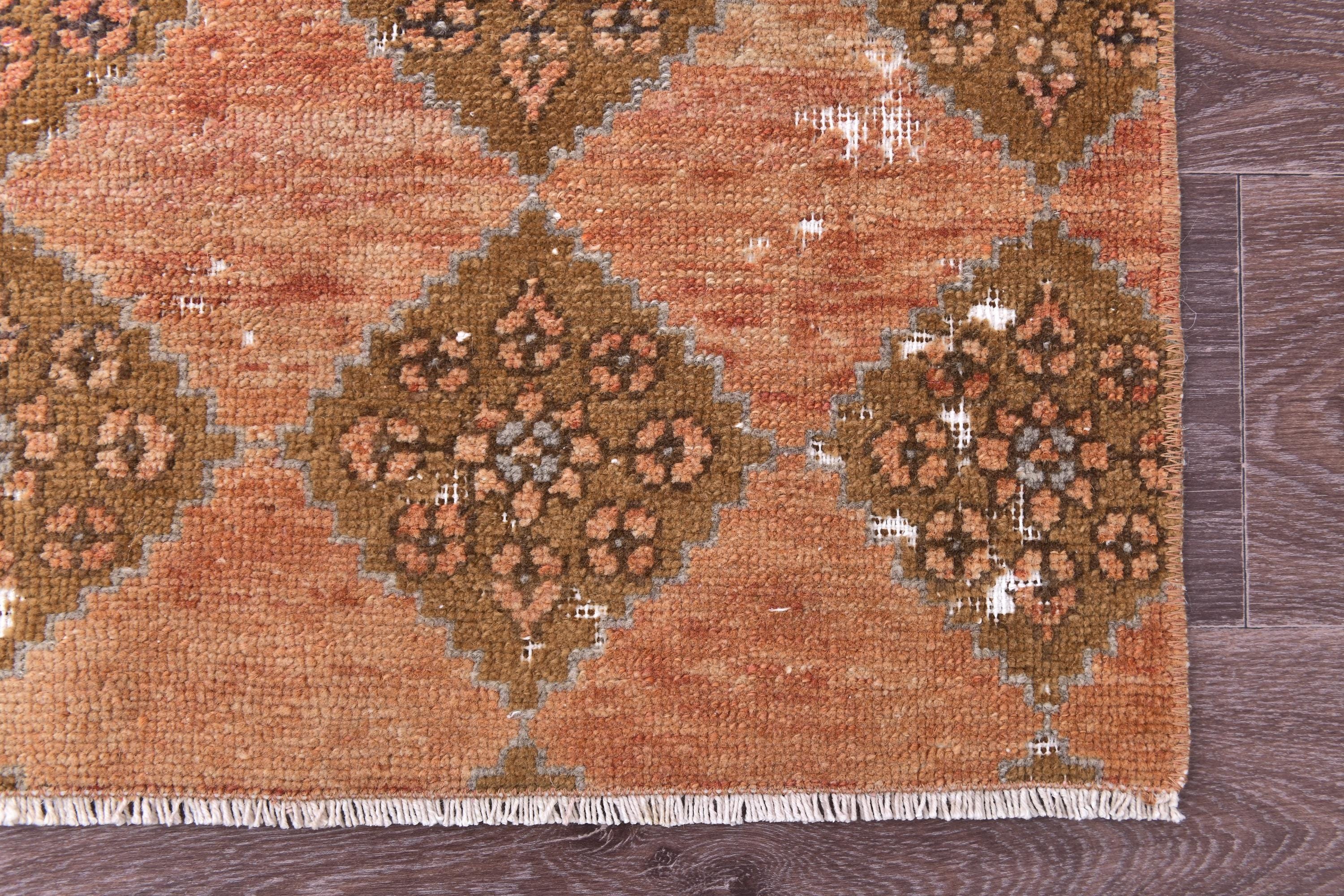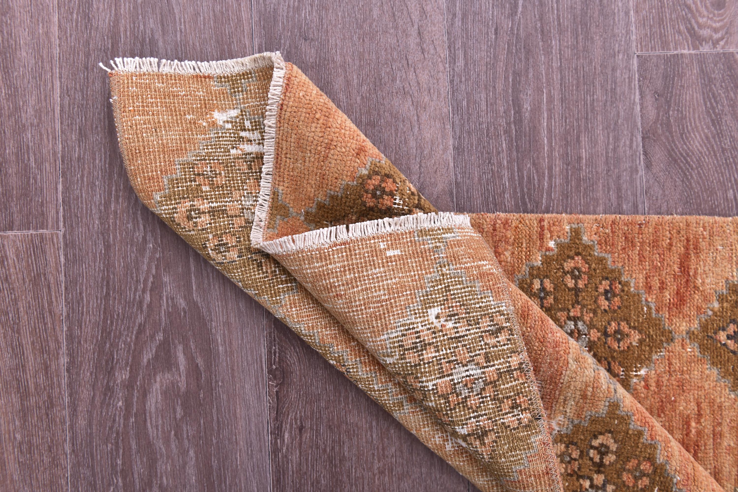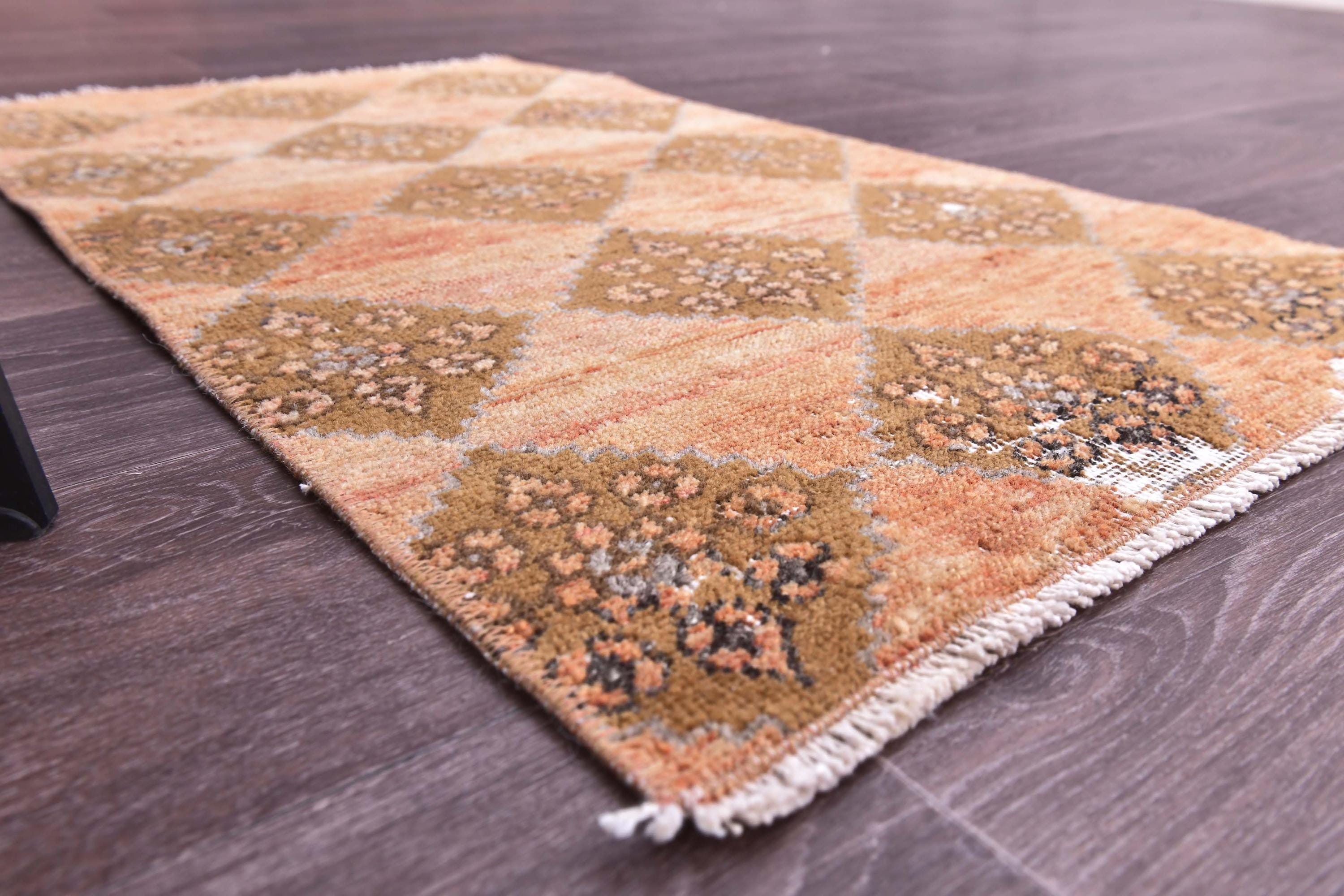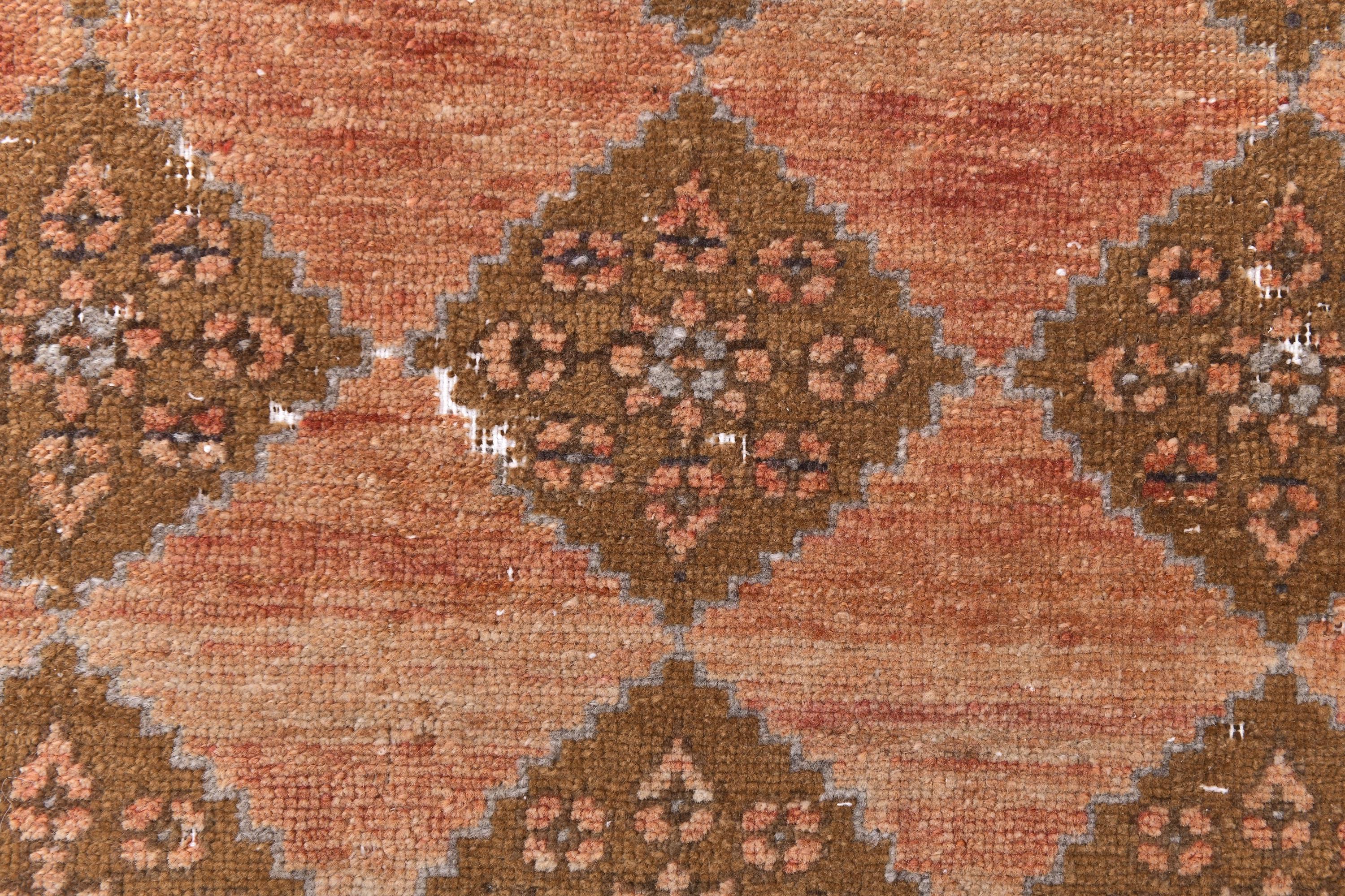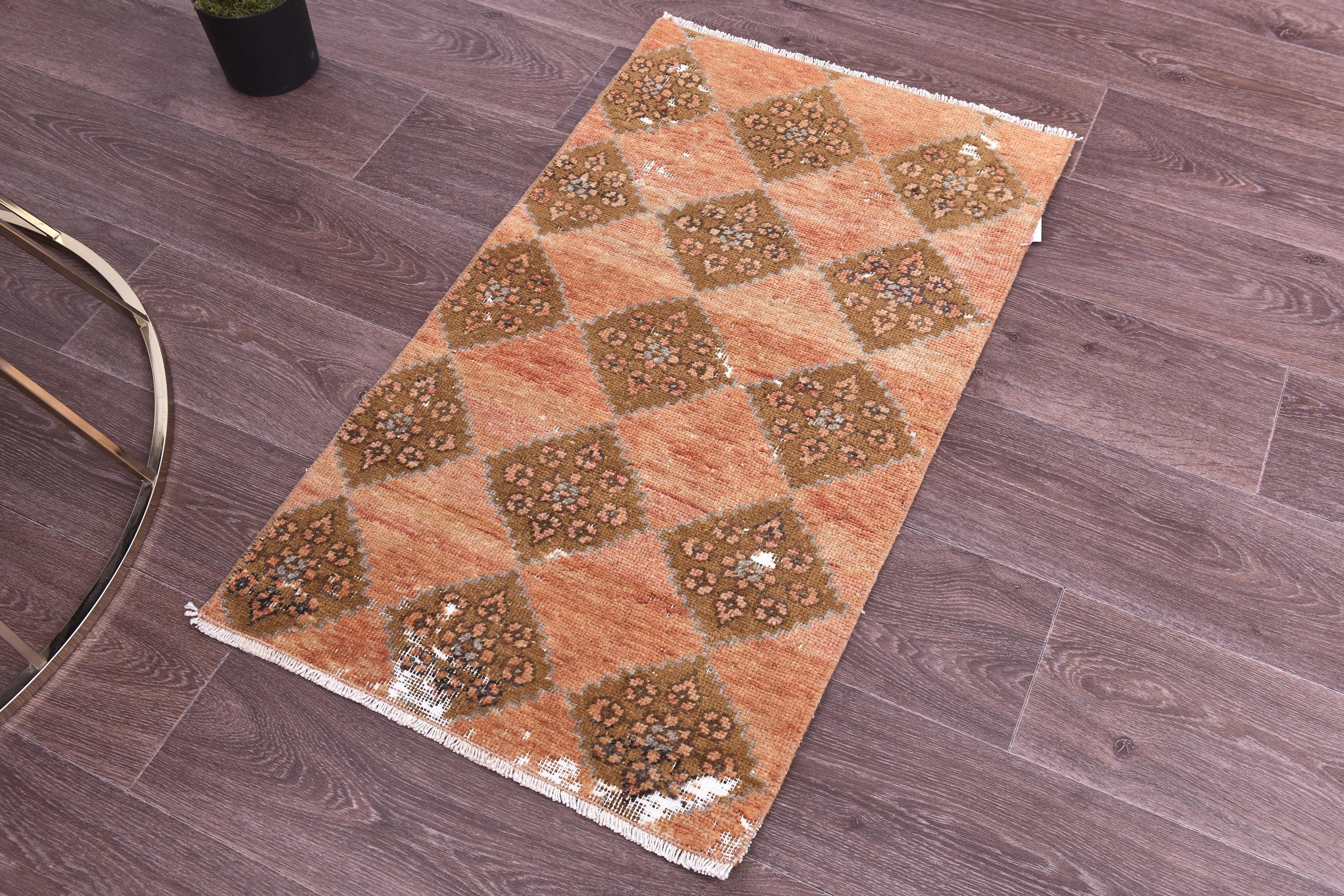 📜📌 Antique Turkish wool doormat displaying geometric diamond grid design in moss green and brown tones on faded terracotta orange field with visible age-related wear adding rustic character