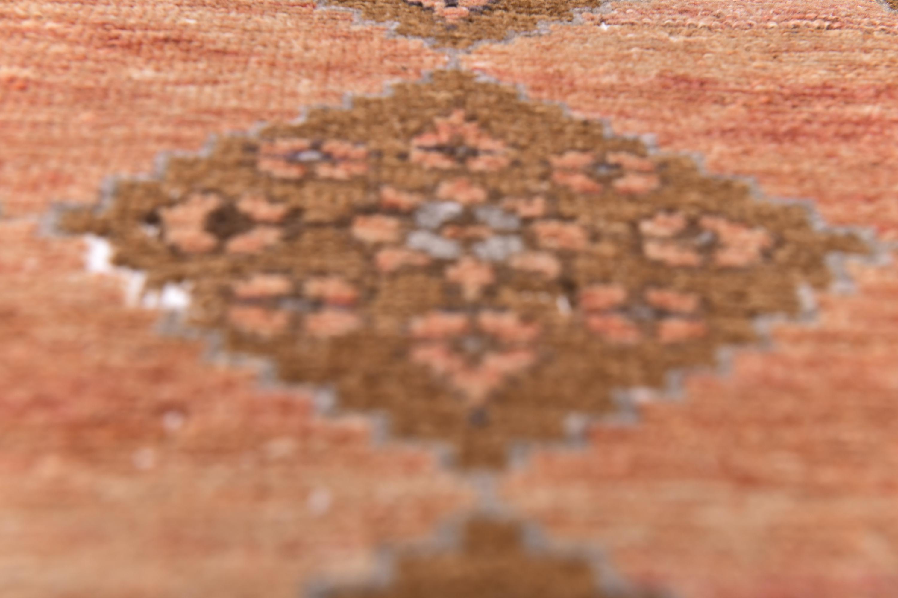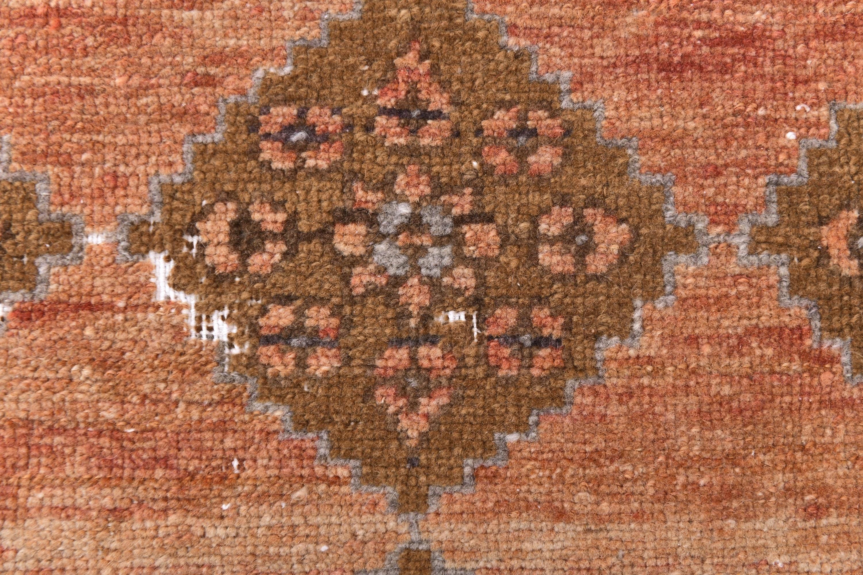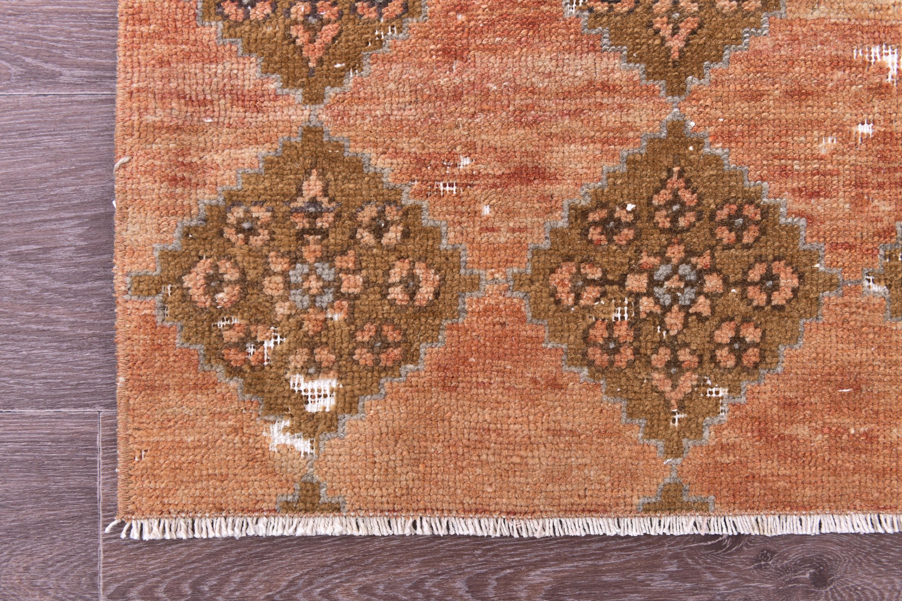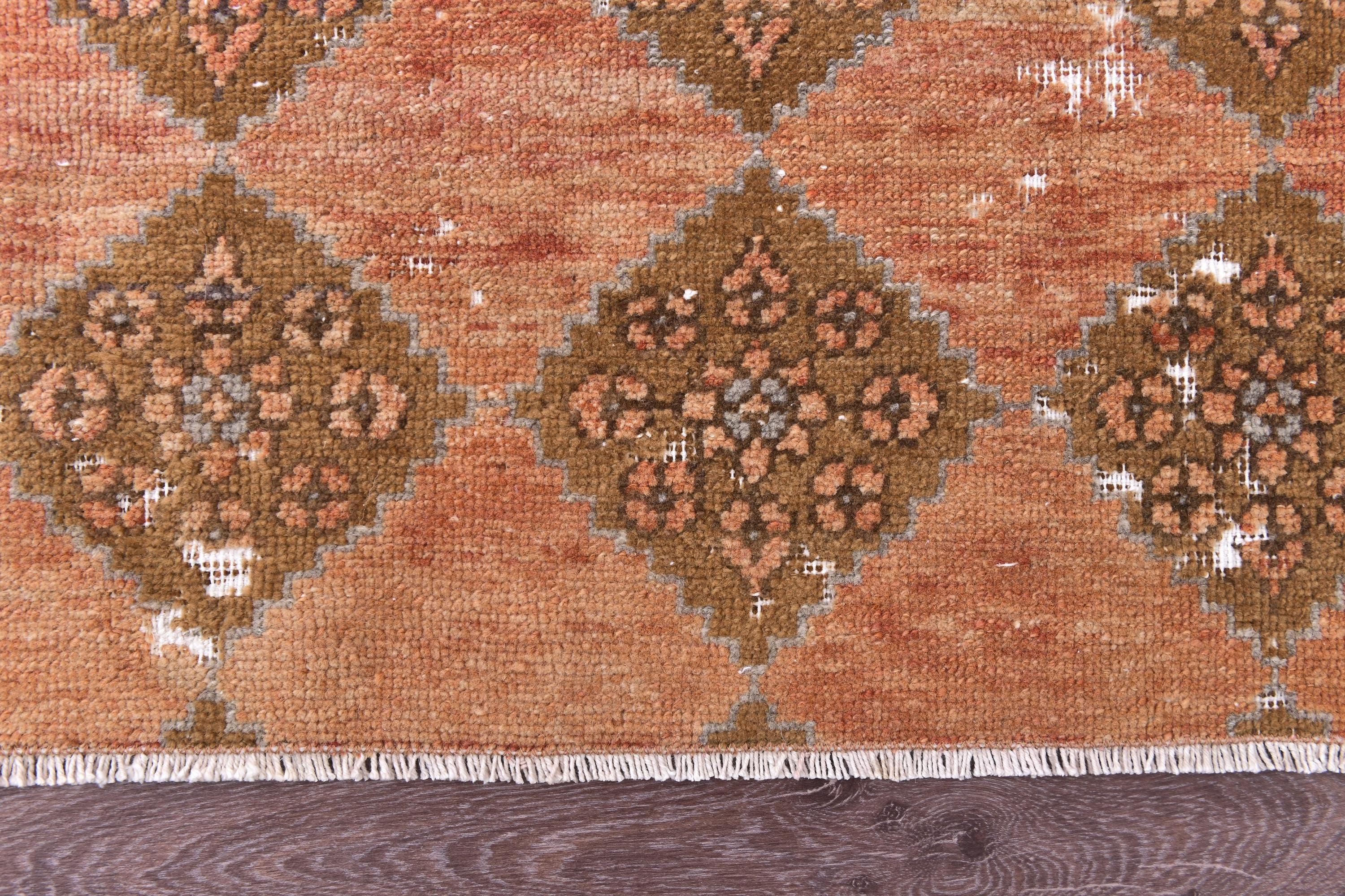 📜📌 Antique Turkish wool doormat displaying geometric diamond grid design in moss green and brown tones on faded terracotta orange field with visible age-related wear adding rustic character