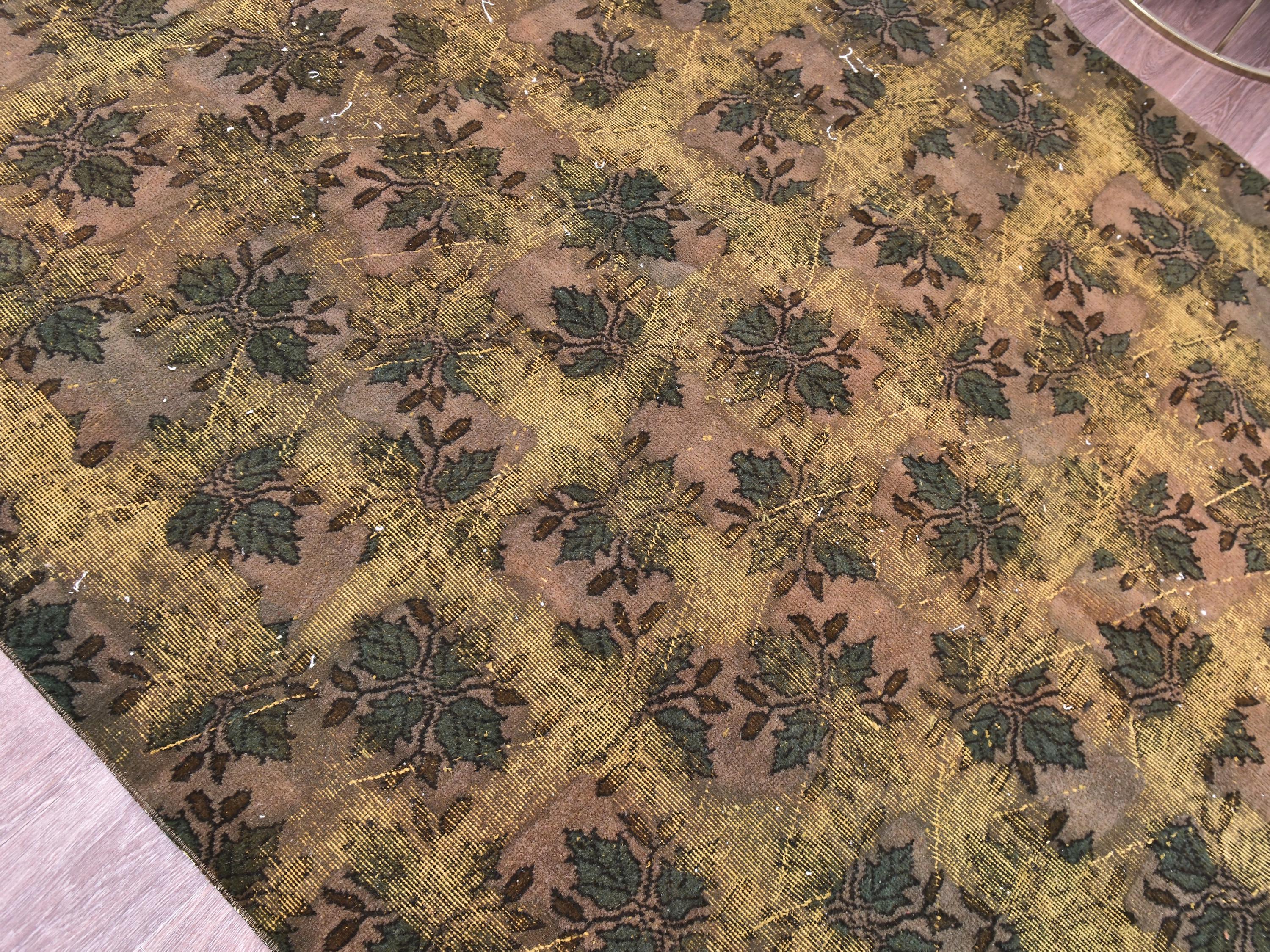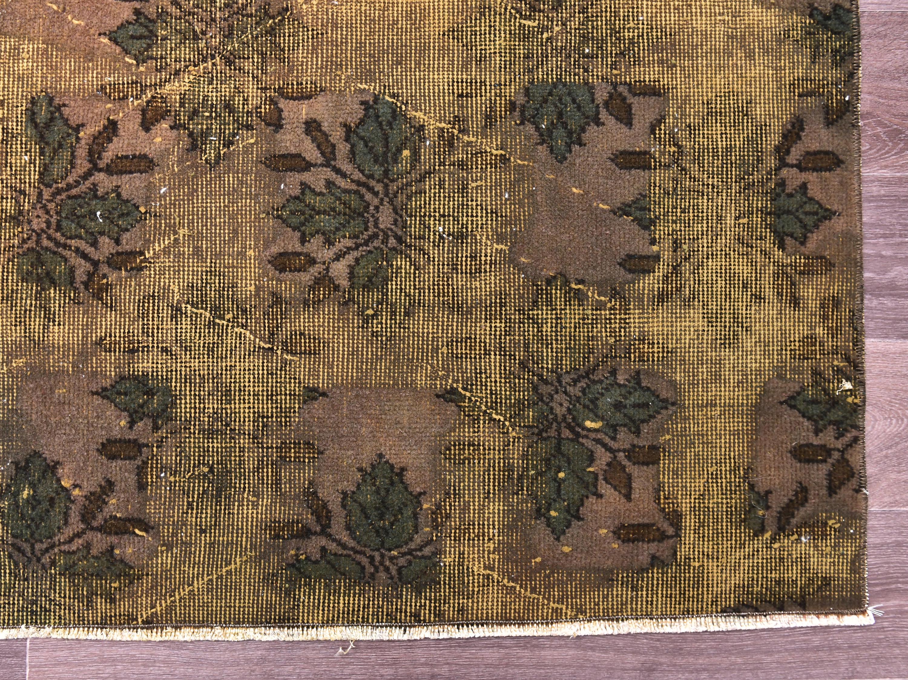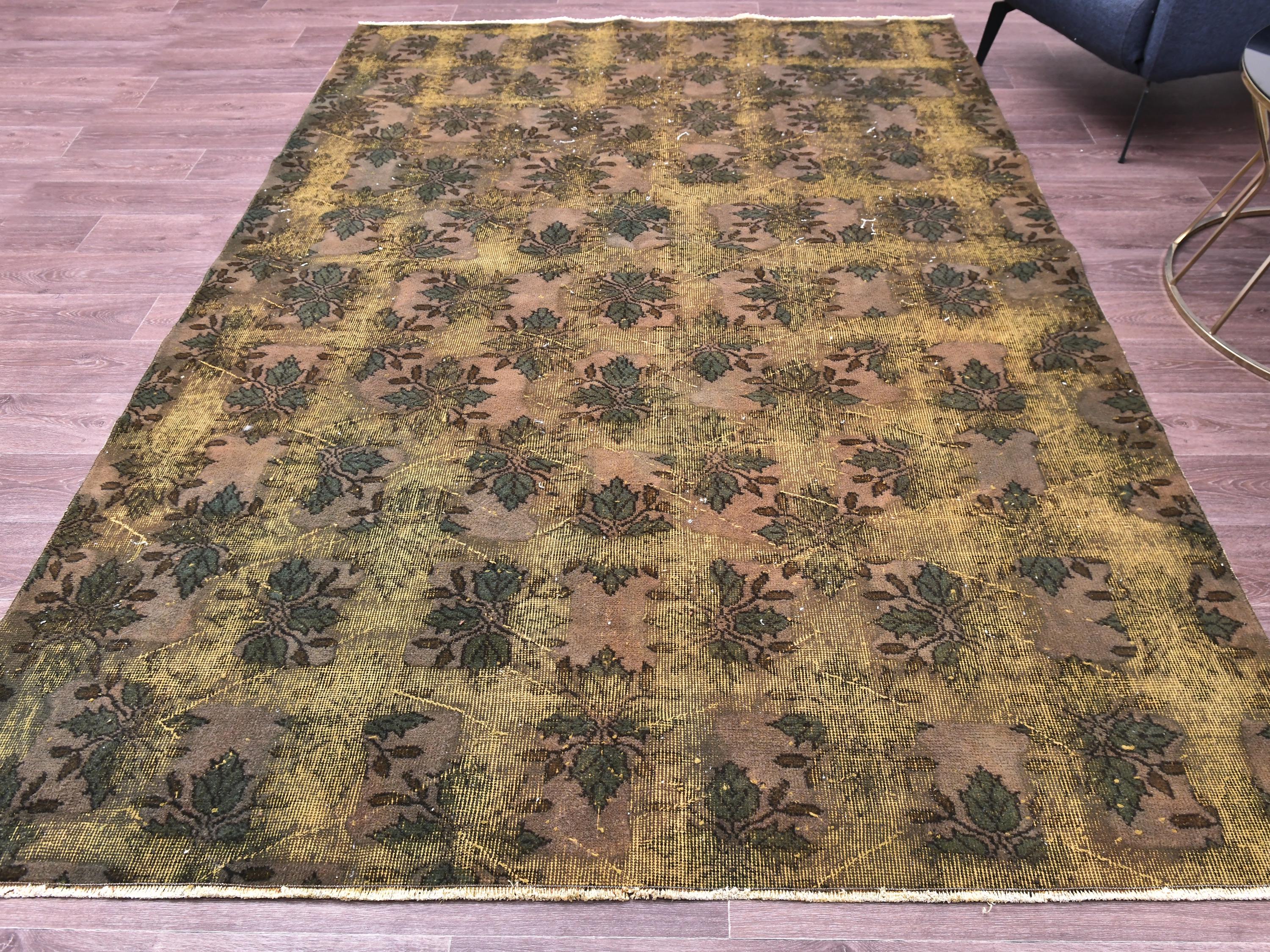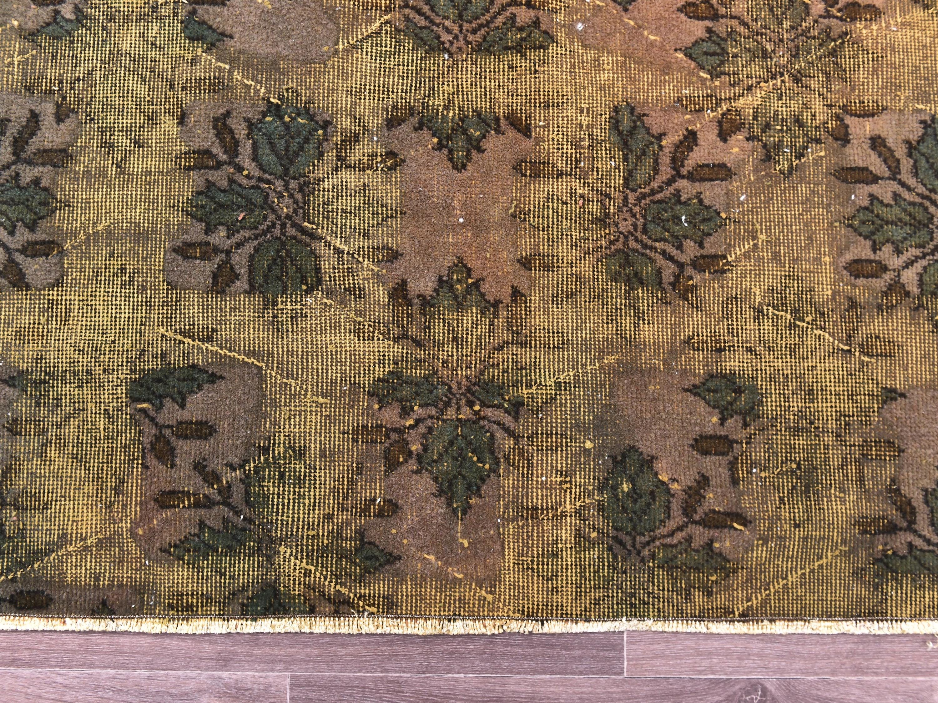 📜📌 Large vintage handknotted Turkish area rug with gold yellow overdyed background and dark green brown floral bouquet allover pattern, heavily distressed worn look
