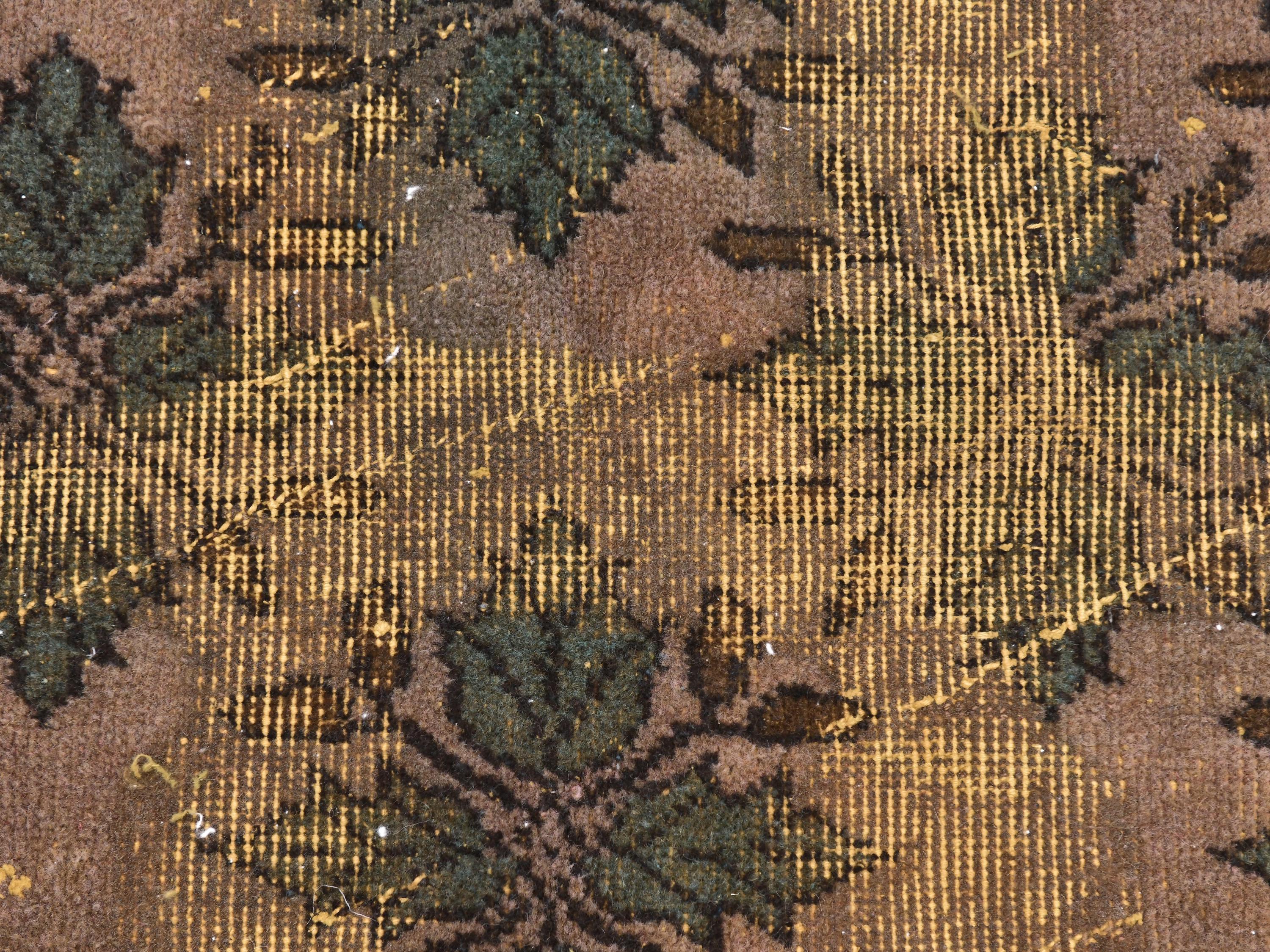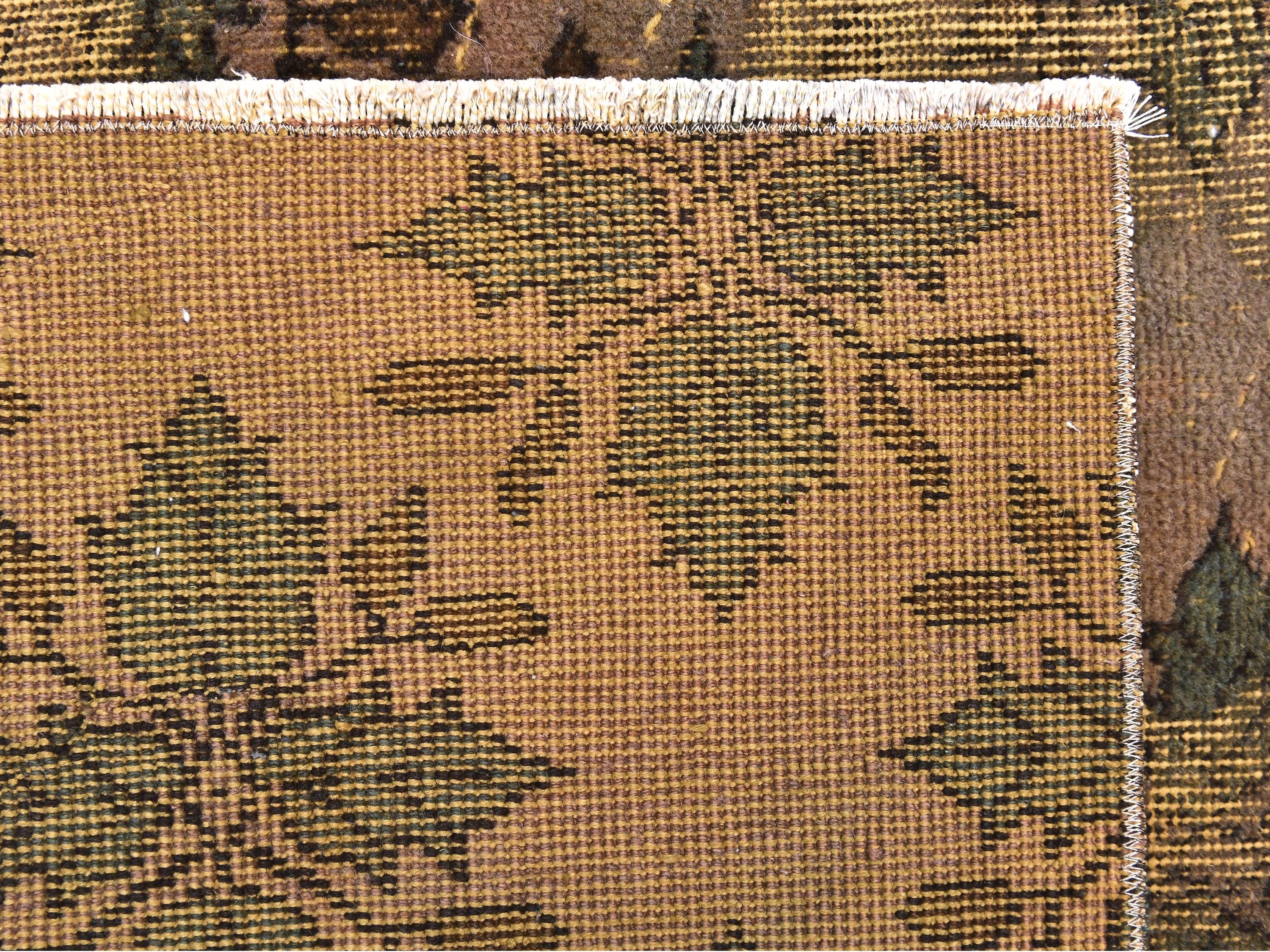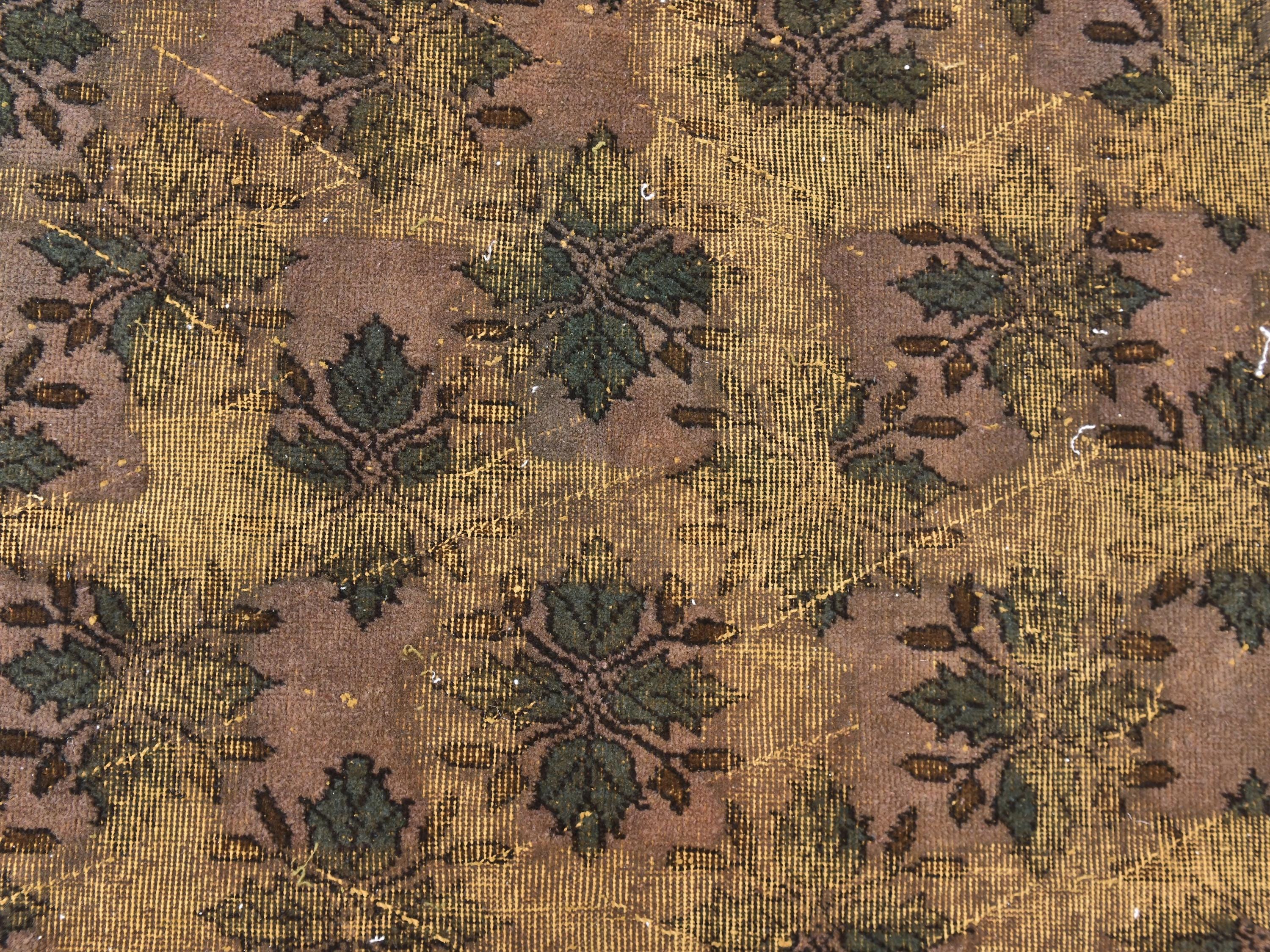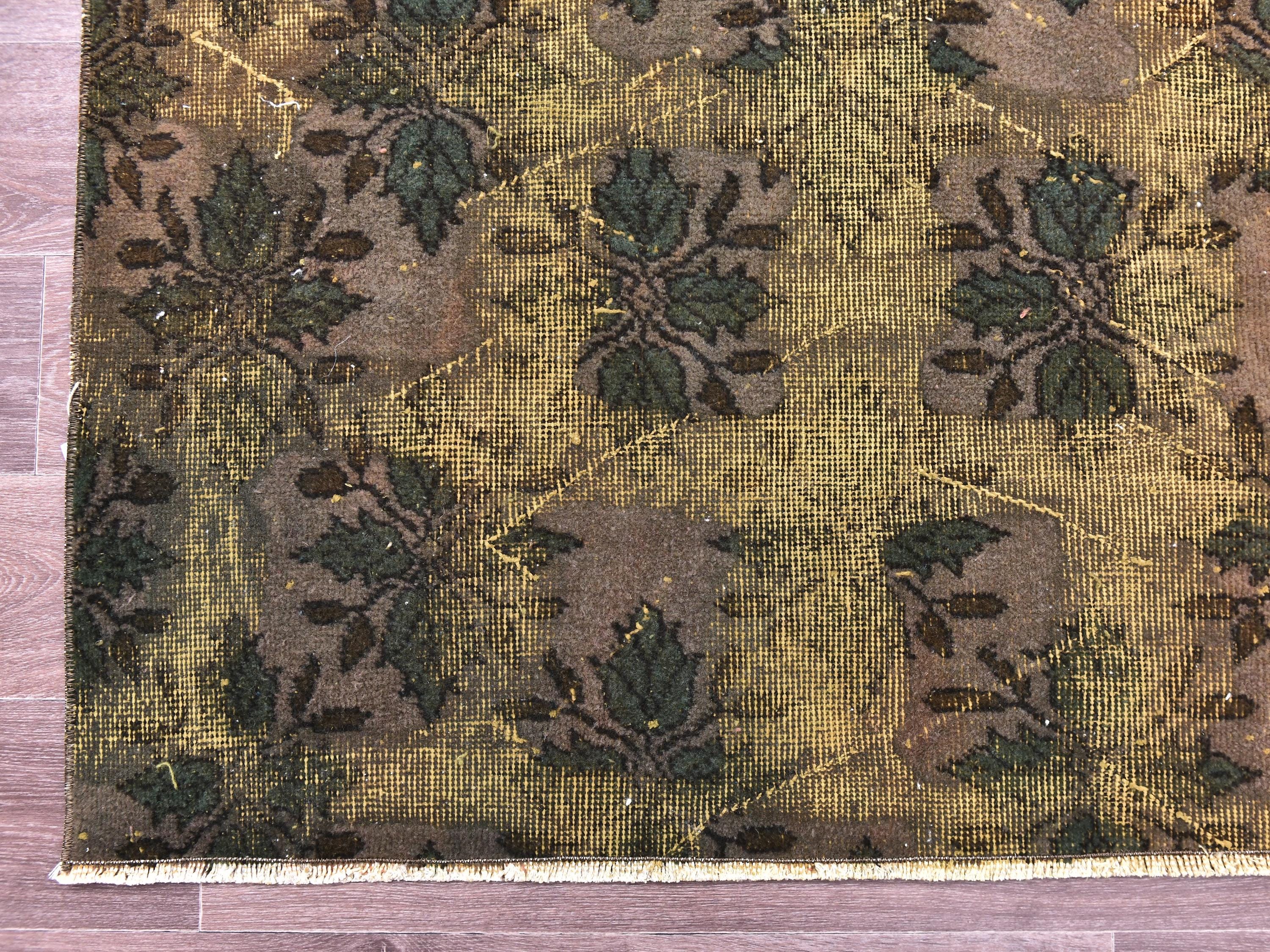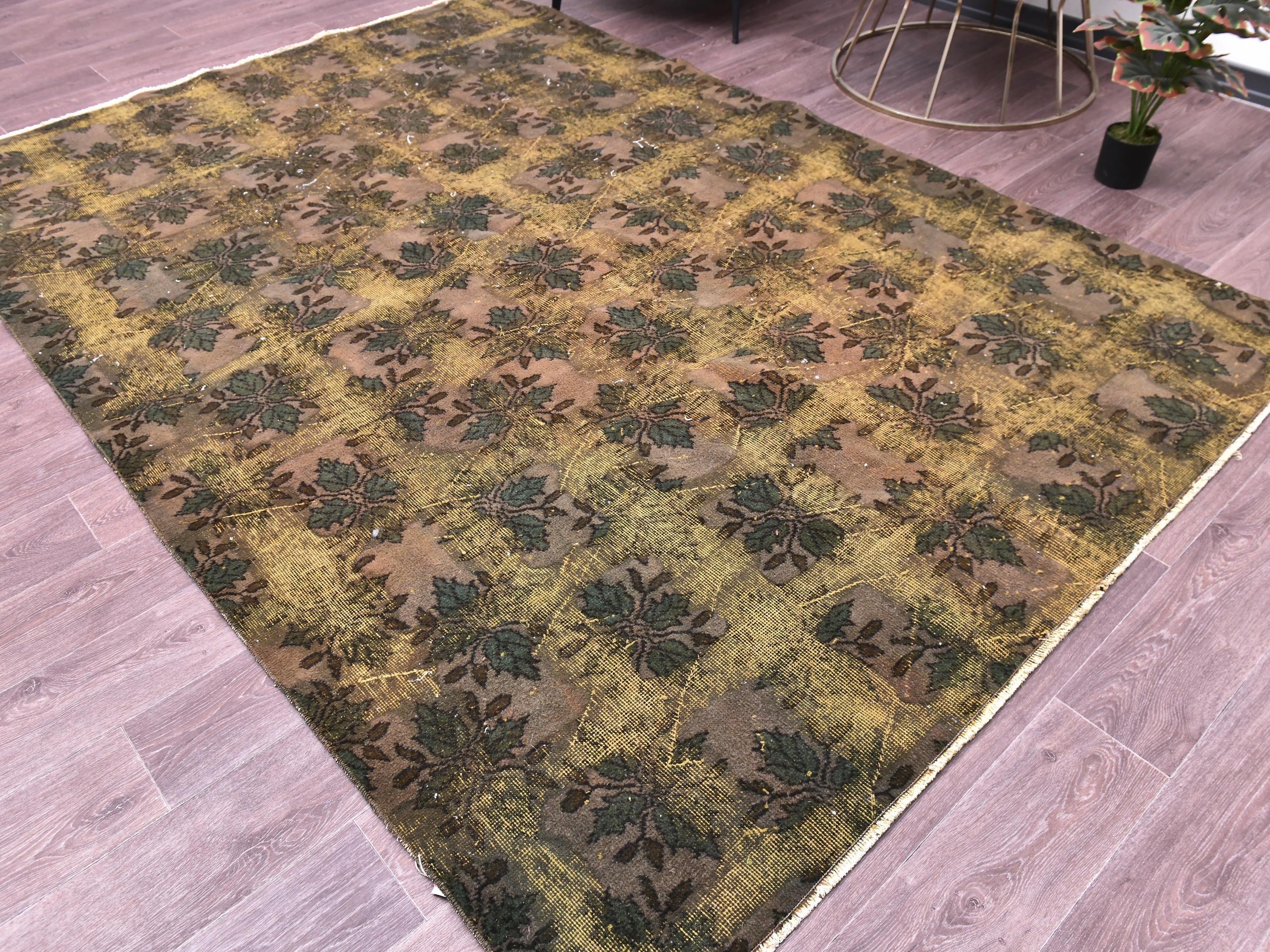 📜📌 Large vintage handknotted Turkish area rug with gold yellow overdyed background and dark green brown floral bouquet allover pattern, heavily distressed worn look
