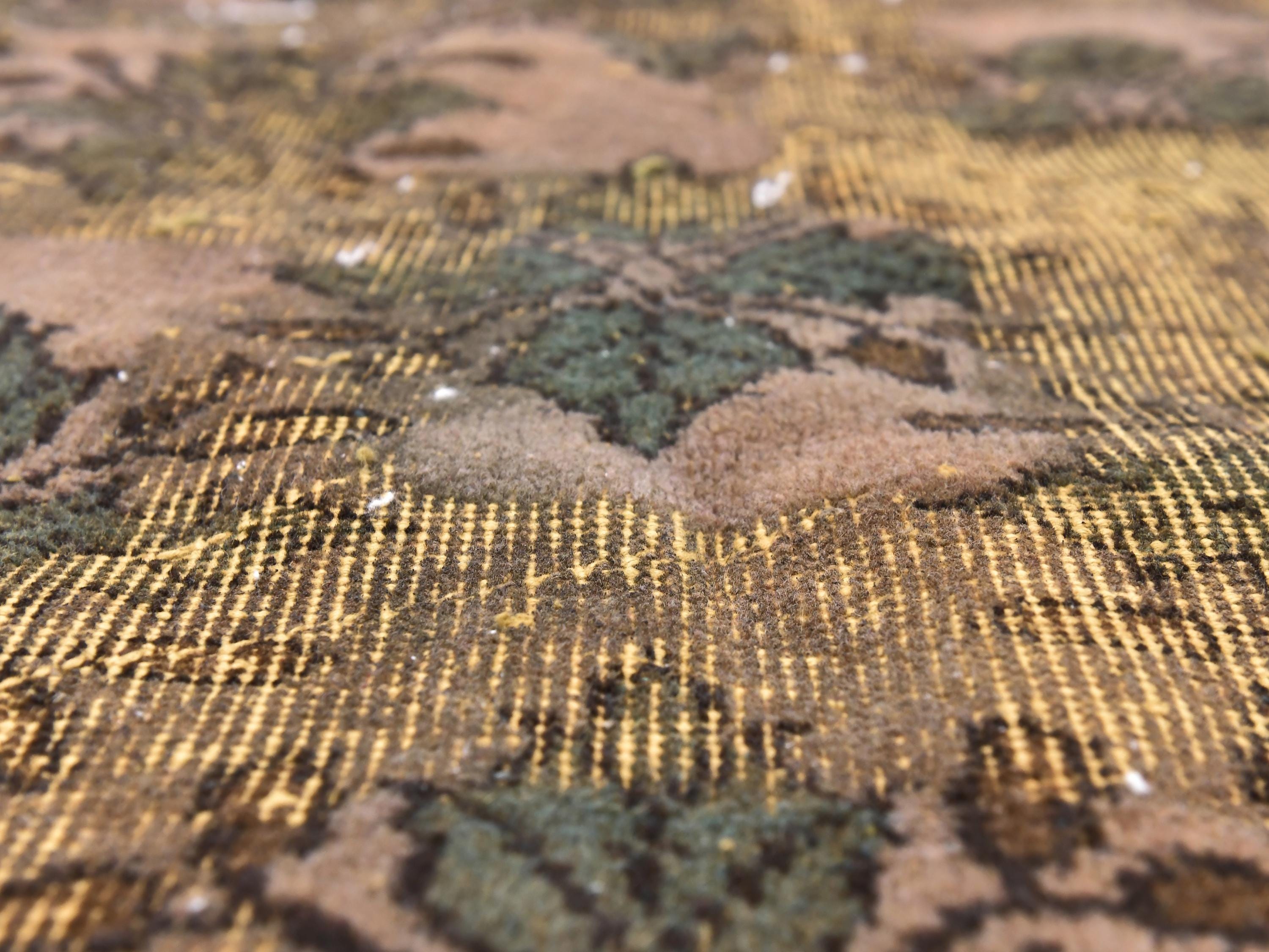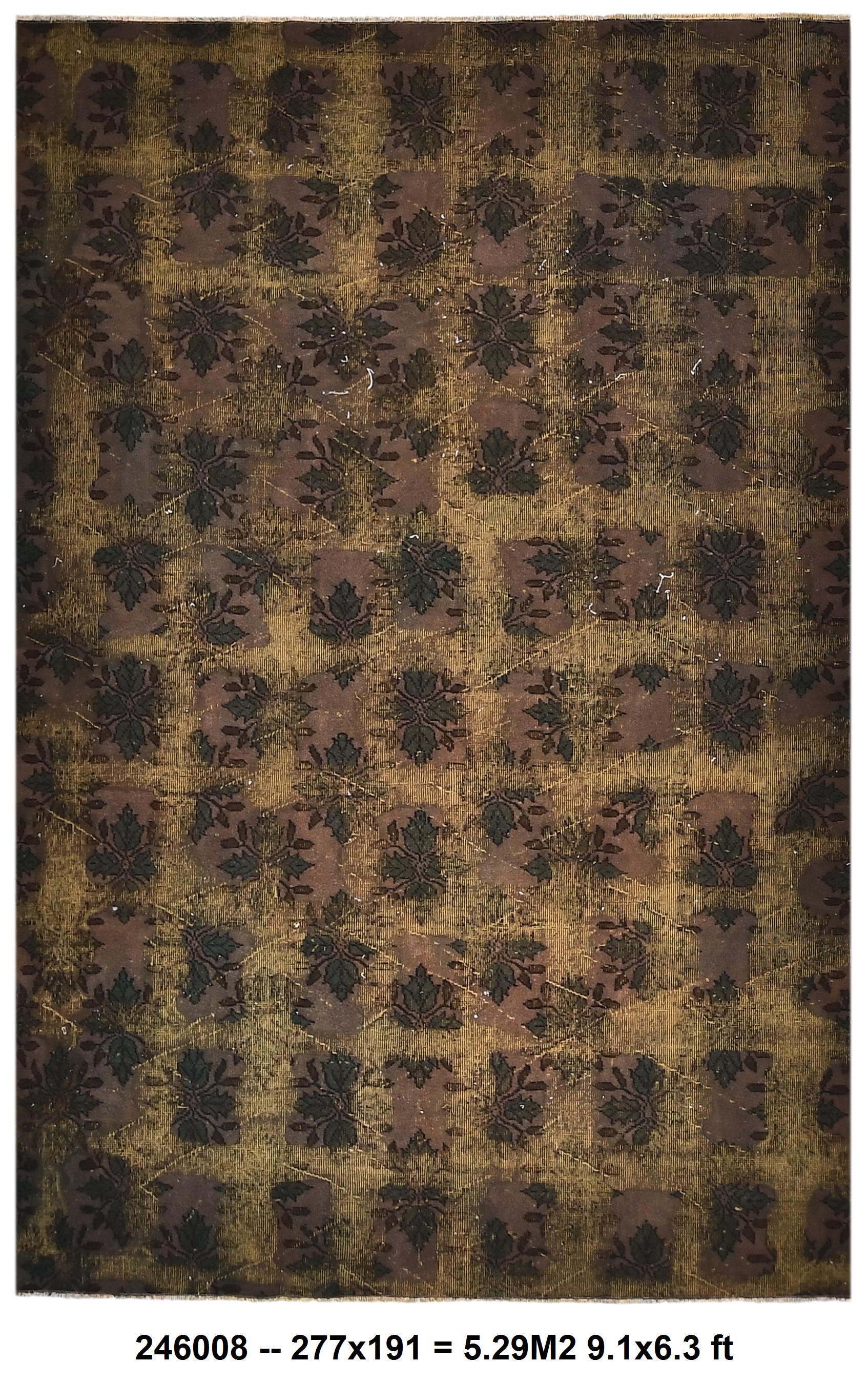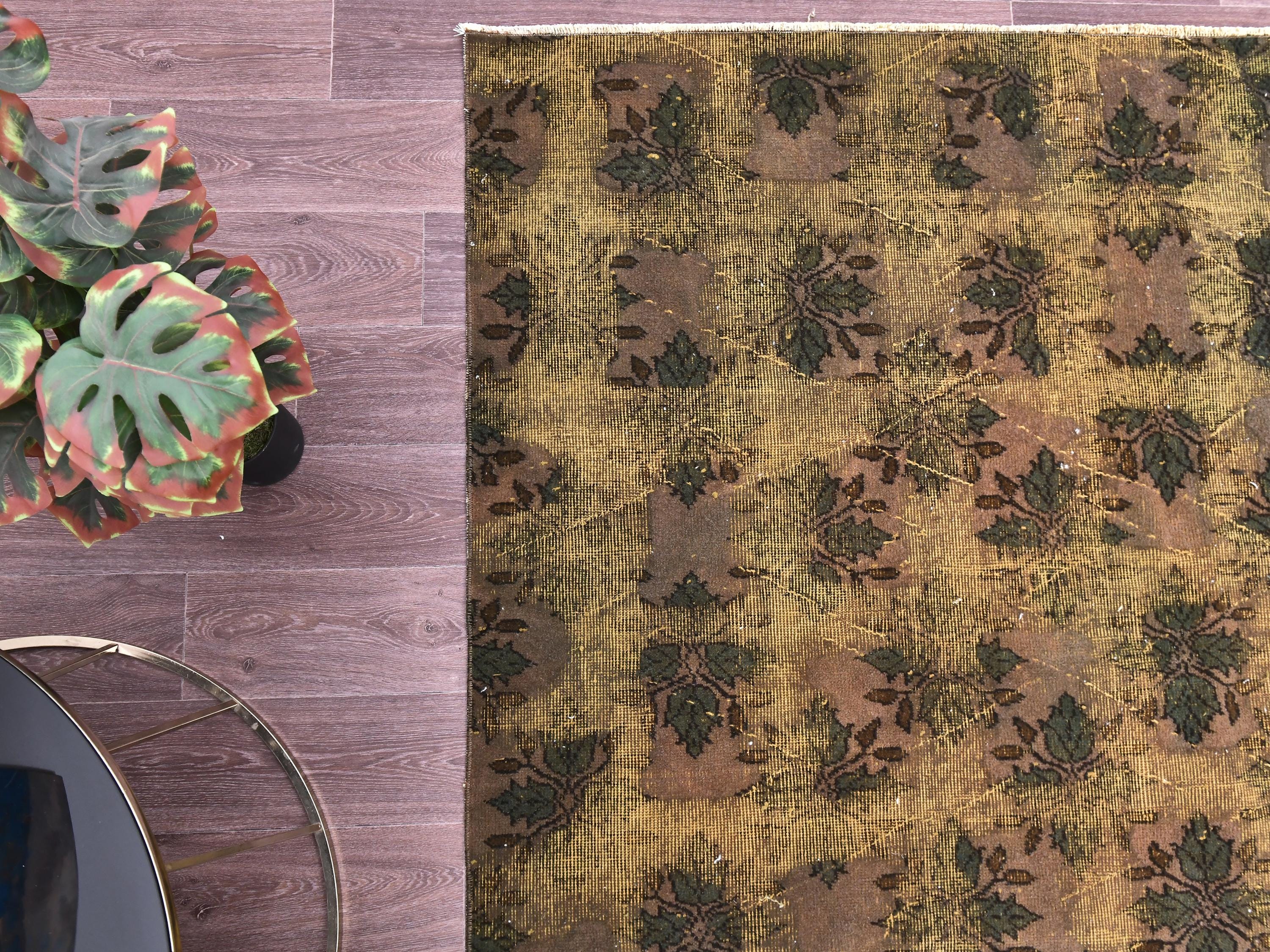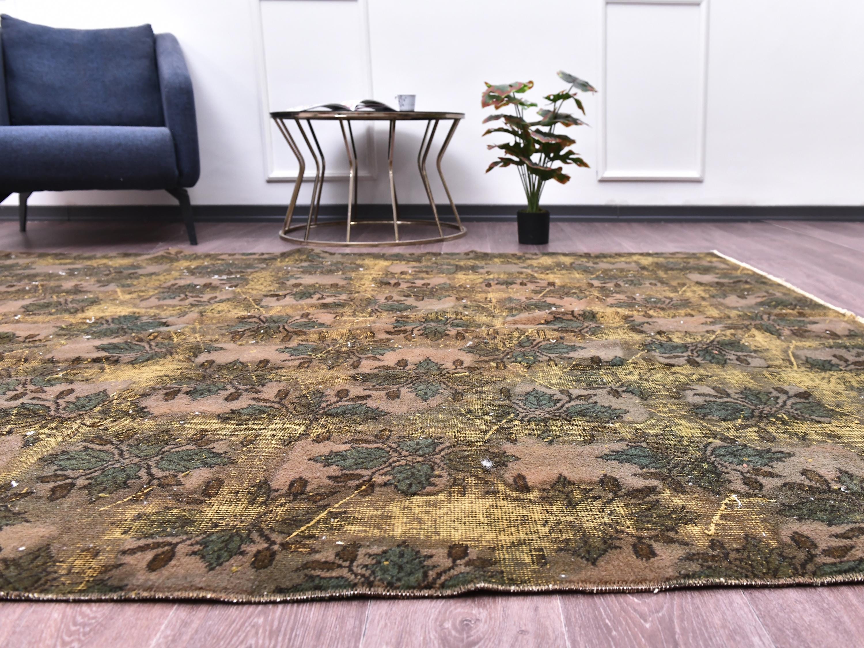 📜📌 Large vintage handknotted Turkish area rug with gold yellow overdyed background and dark green brown floral bouquet allover pattern, heavily distressed worn look