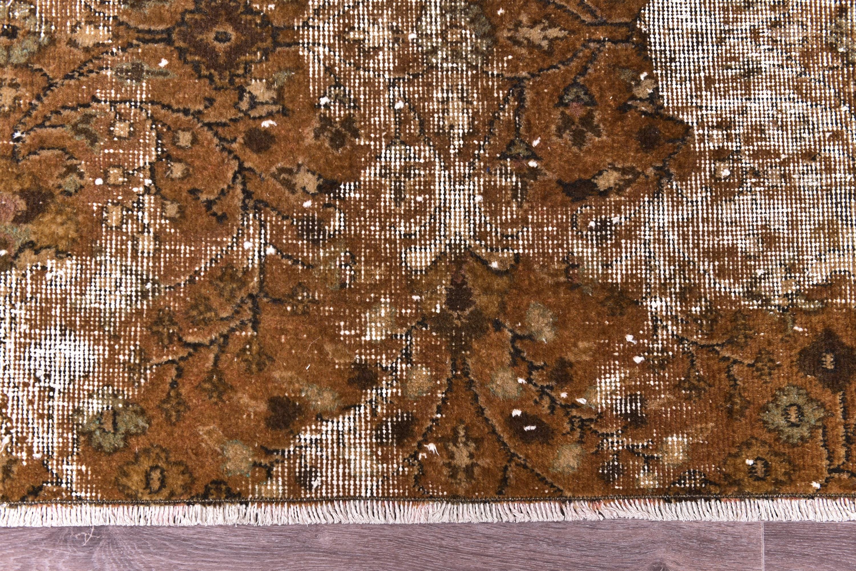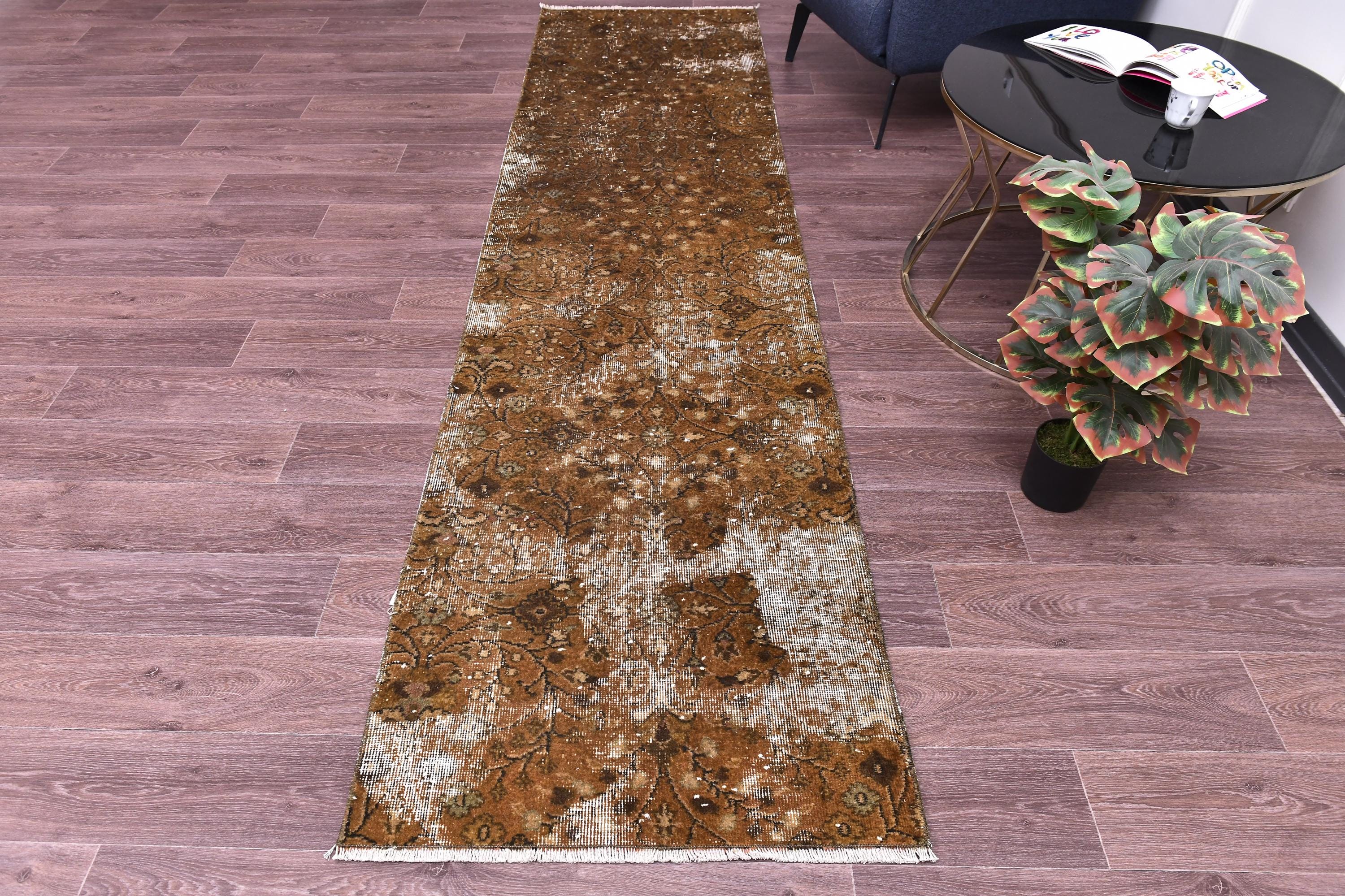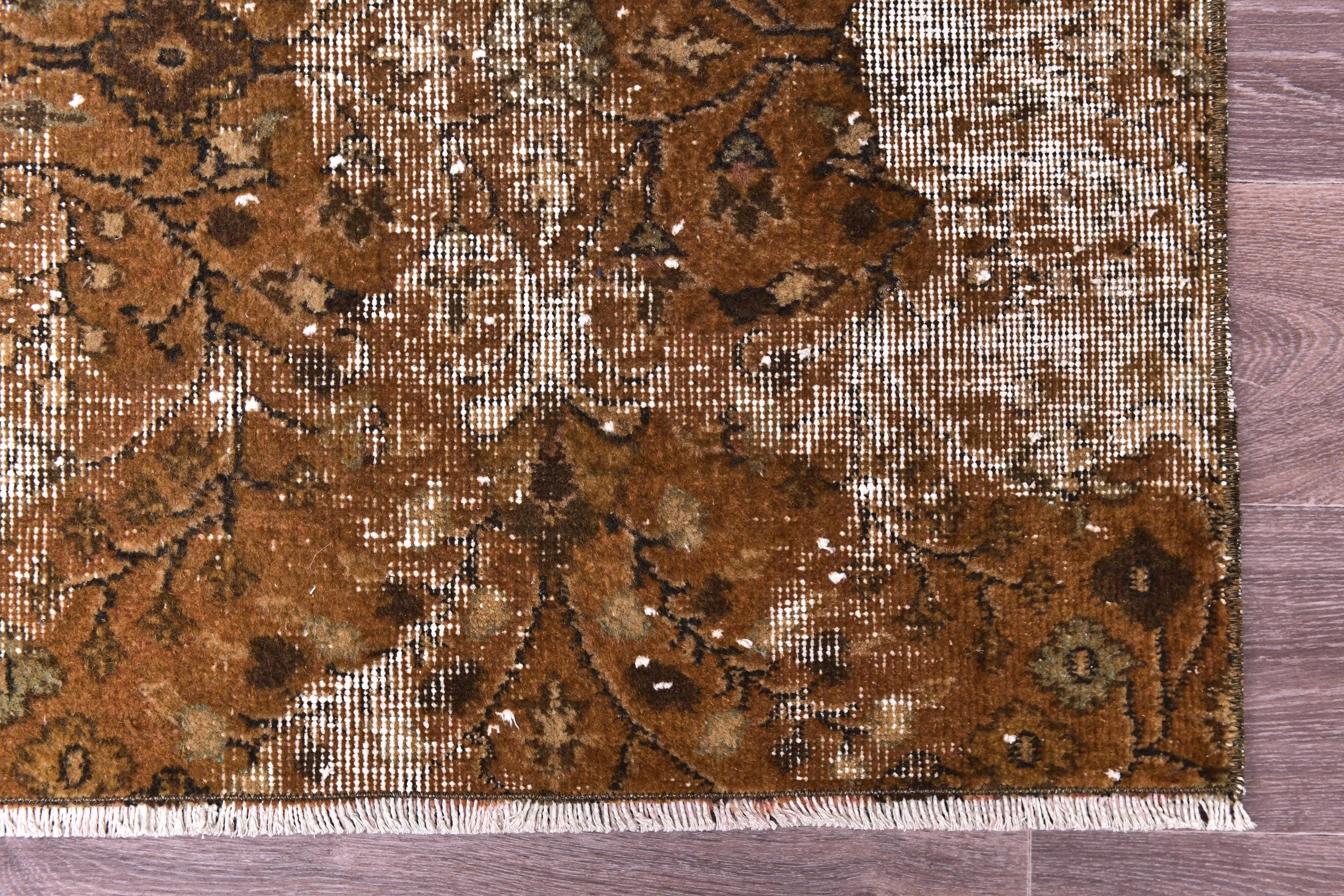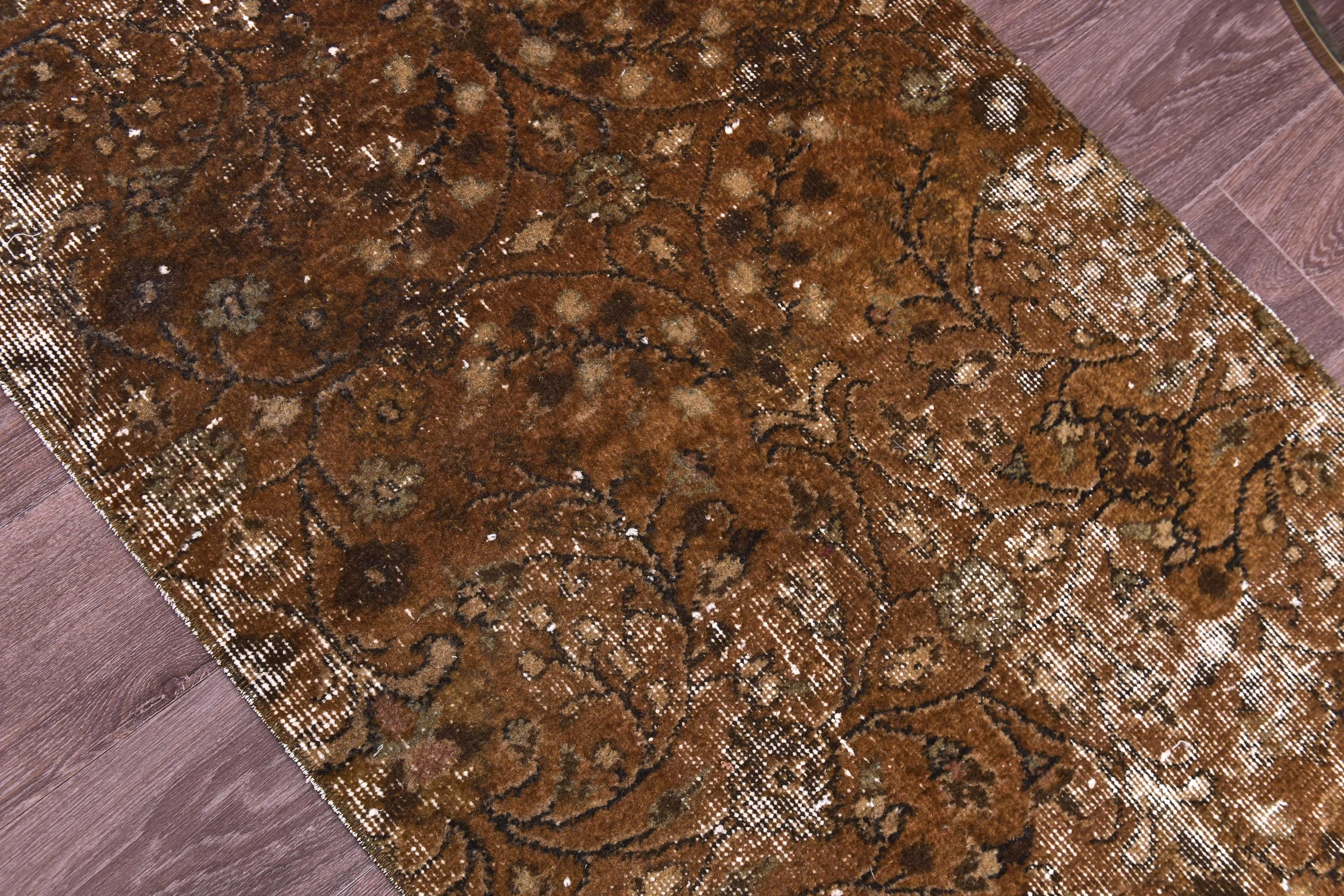 📜📌 Antique distressed Turkish runner rug in warm earthy brown tones with faded floral and botanical patterns, hand-knotted wool, vintage overdyed finish, displayed on hardwood floor.