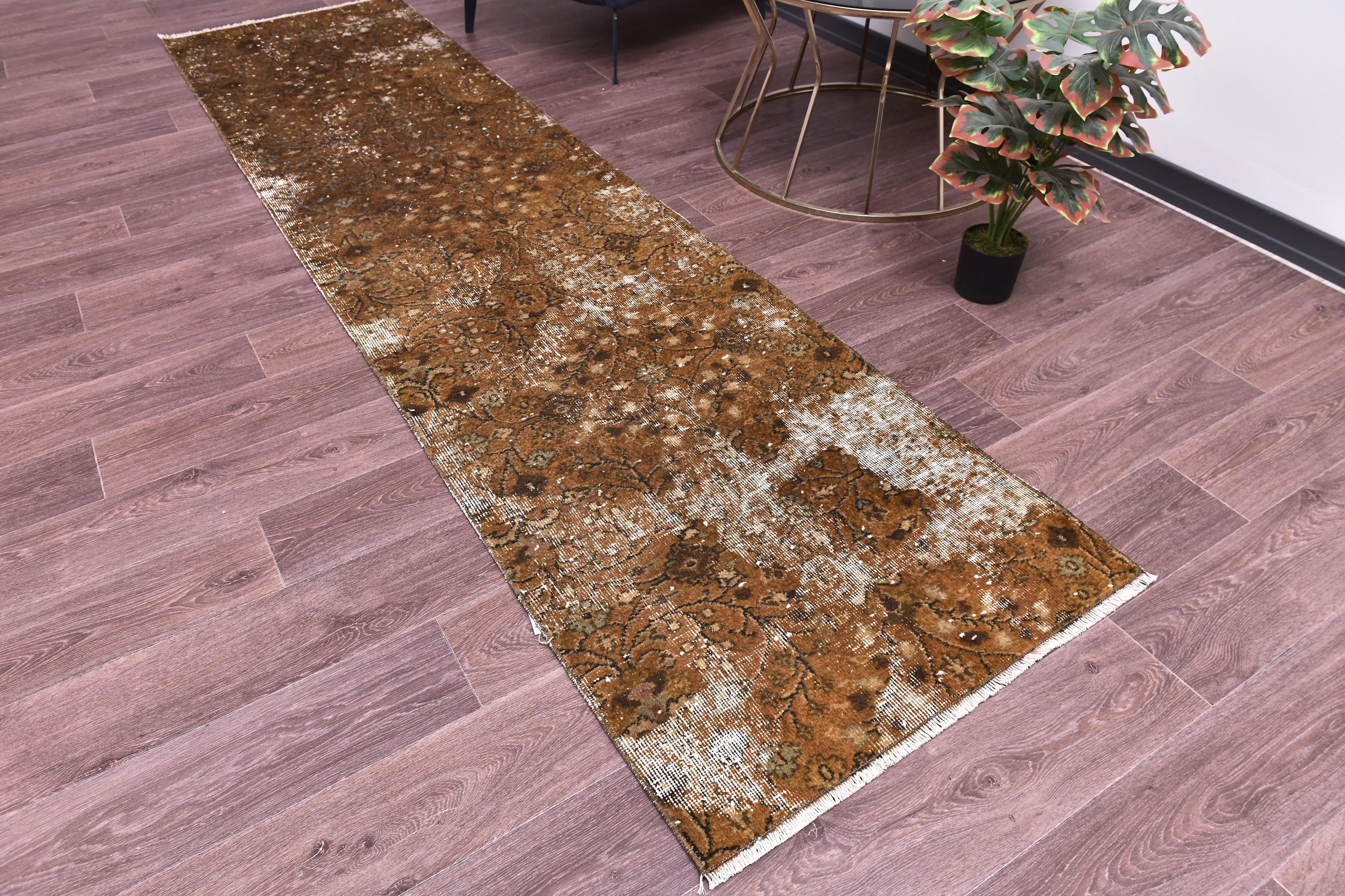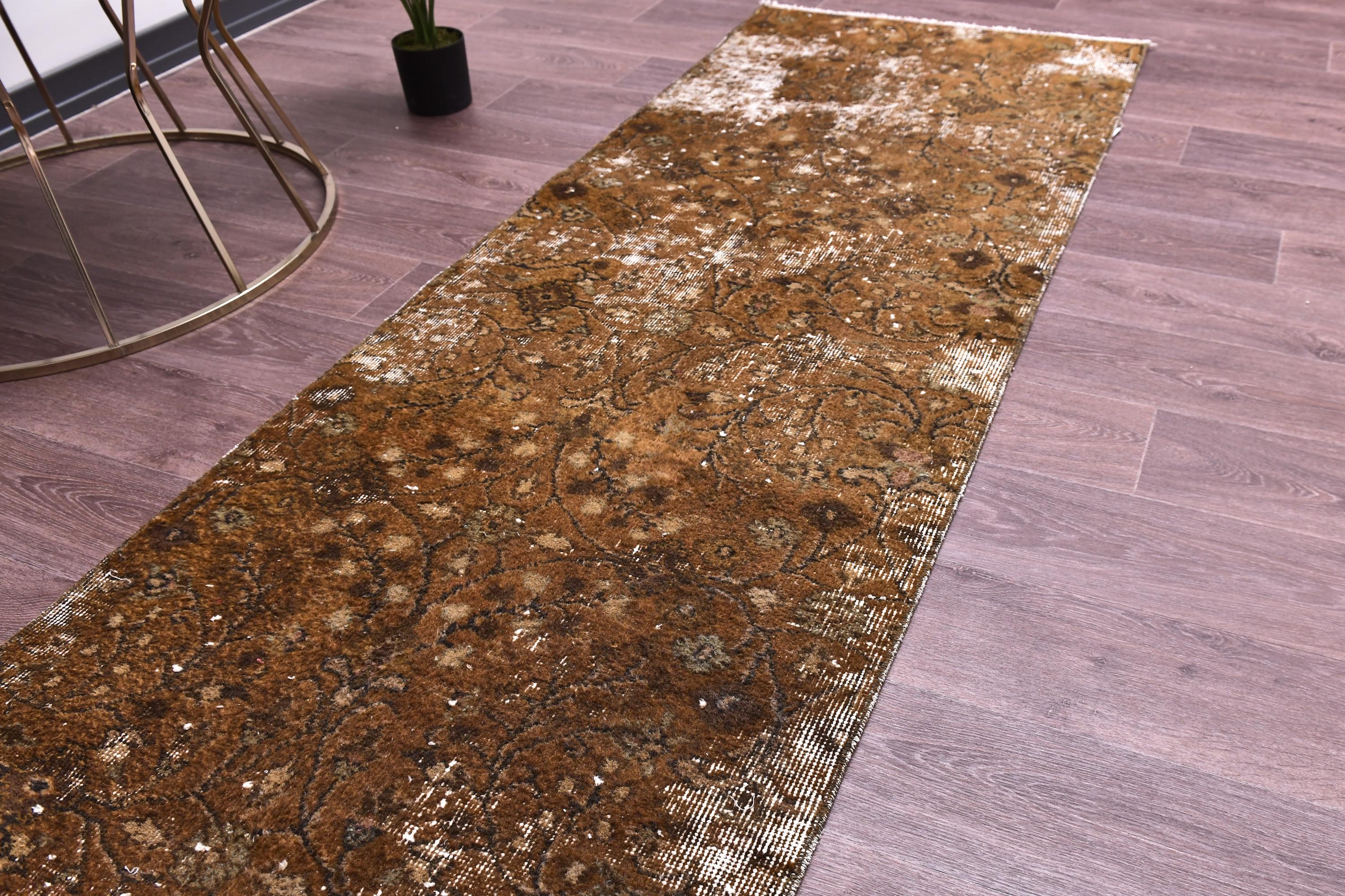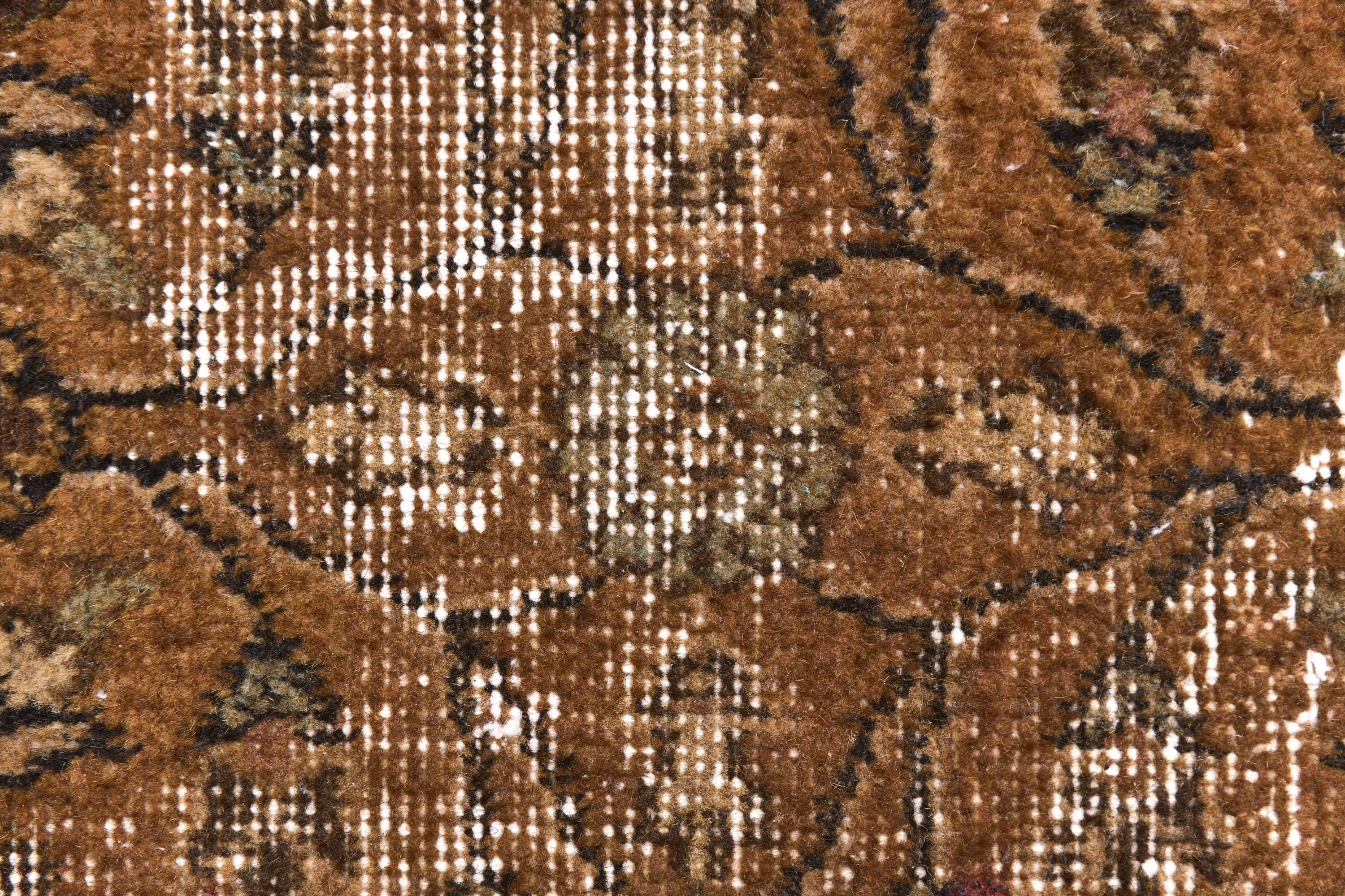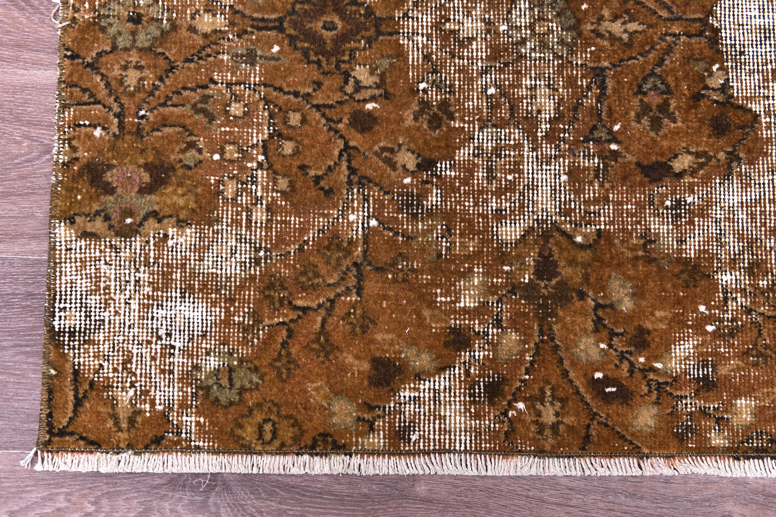 📜📌 Antique distressed Turkish runner rug in warm earthy brown tones with faded floral and botanical patterns, hand-knotted wool, vintage overdyed finish, displayed on hardwood floor.