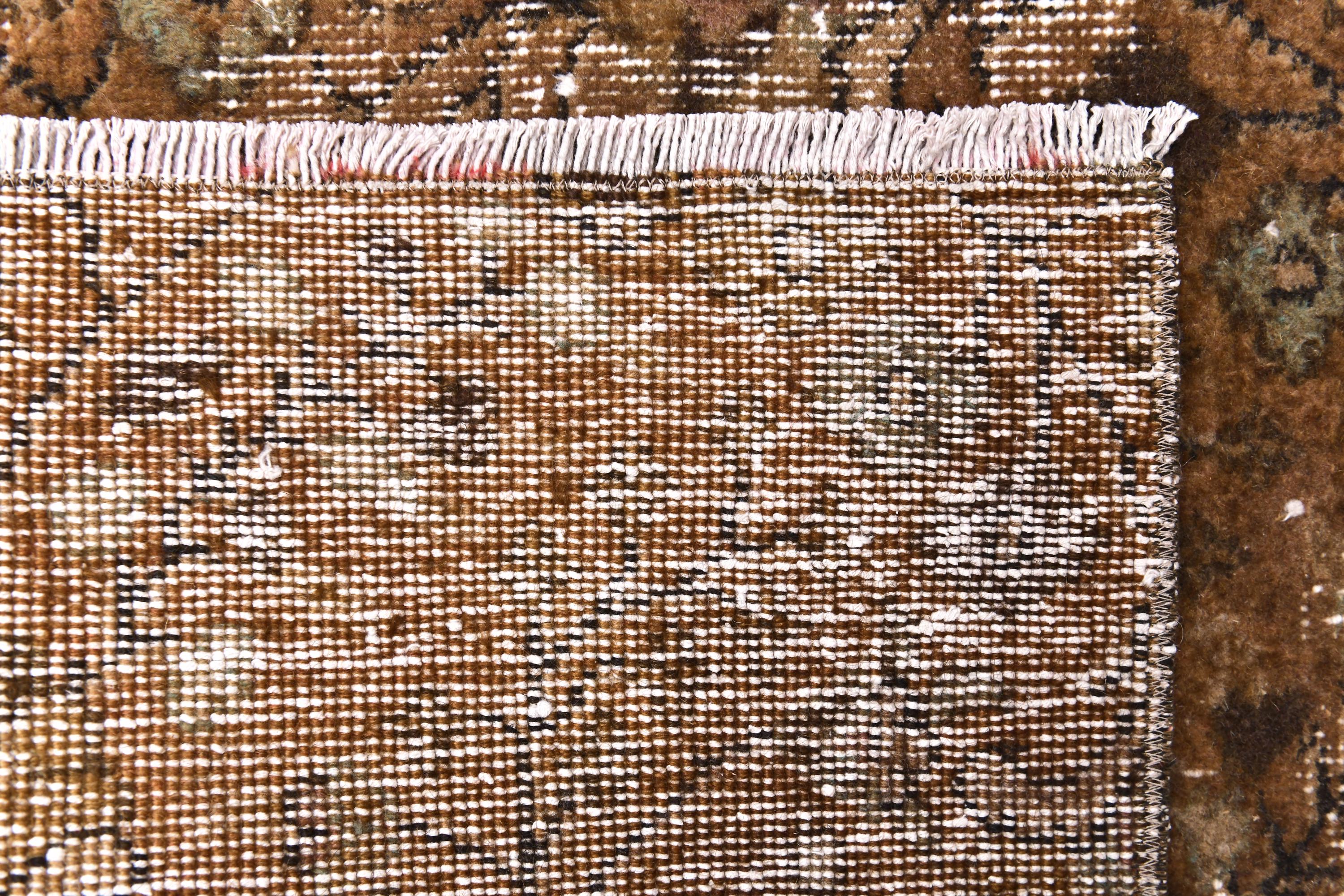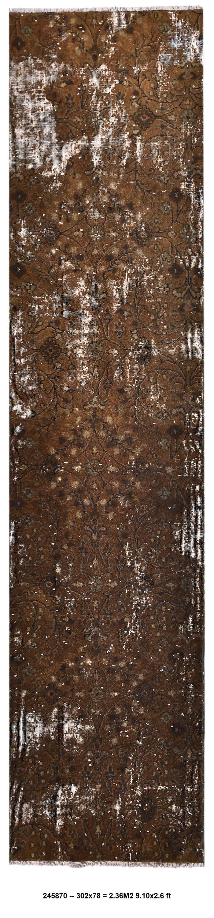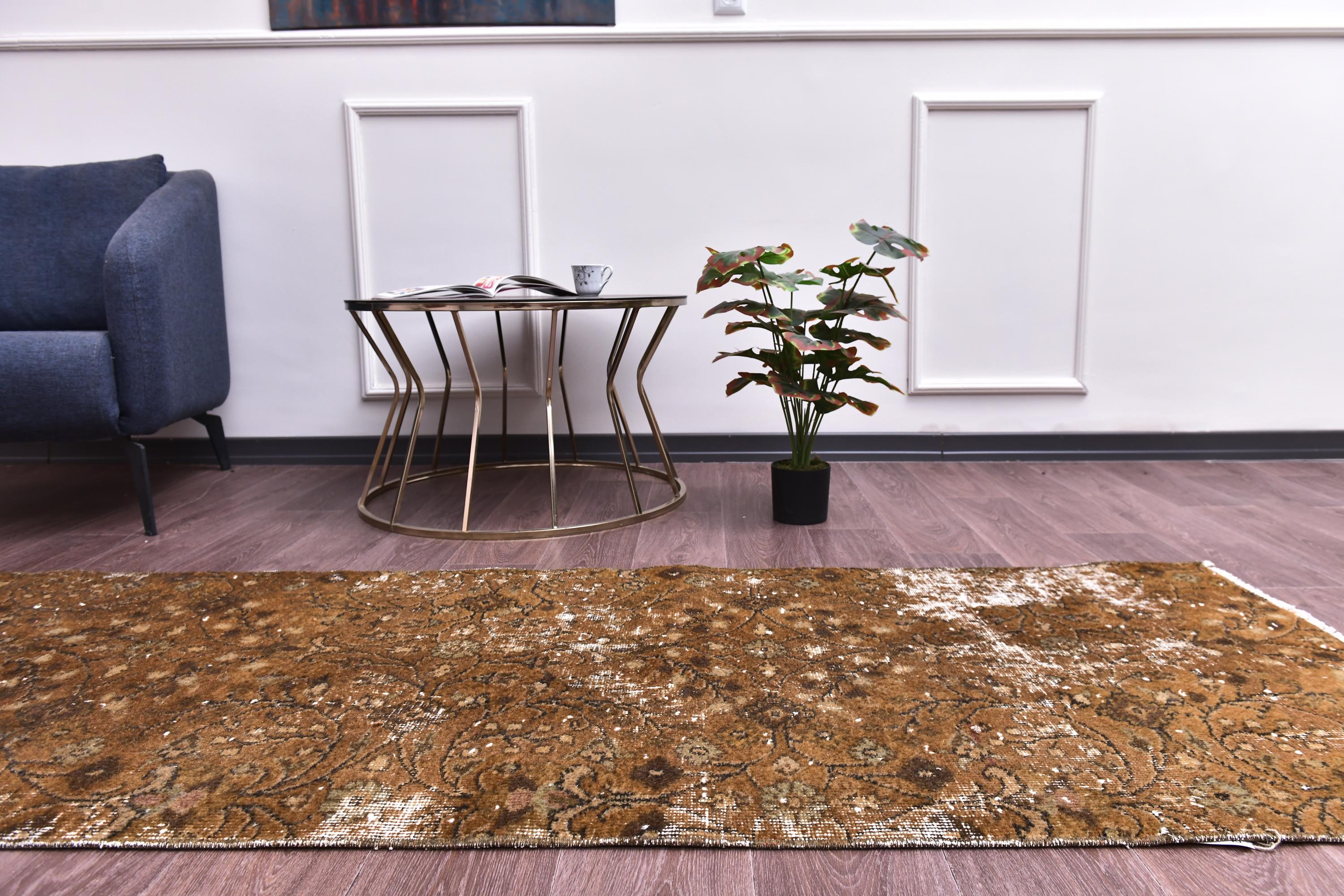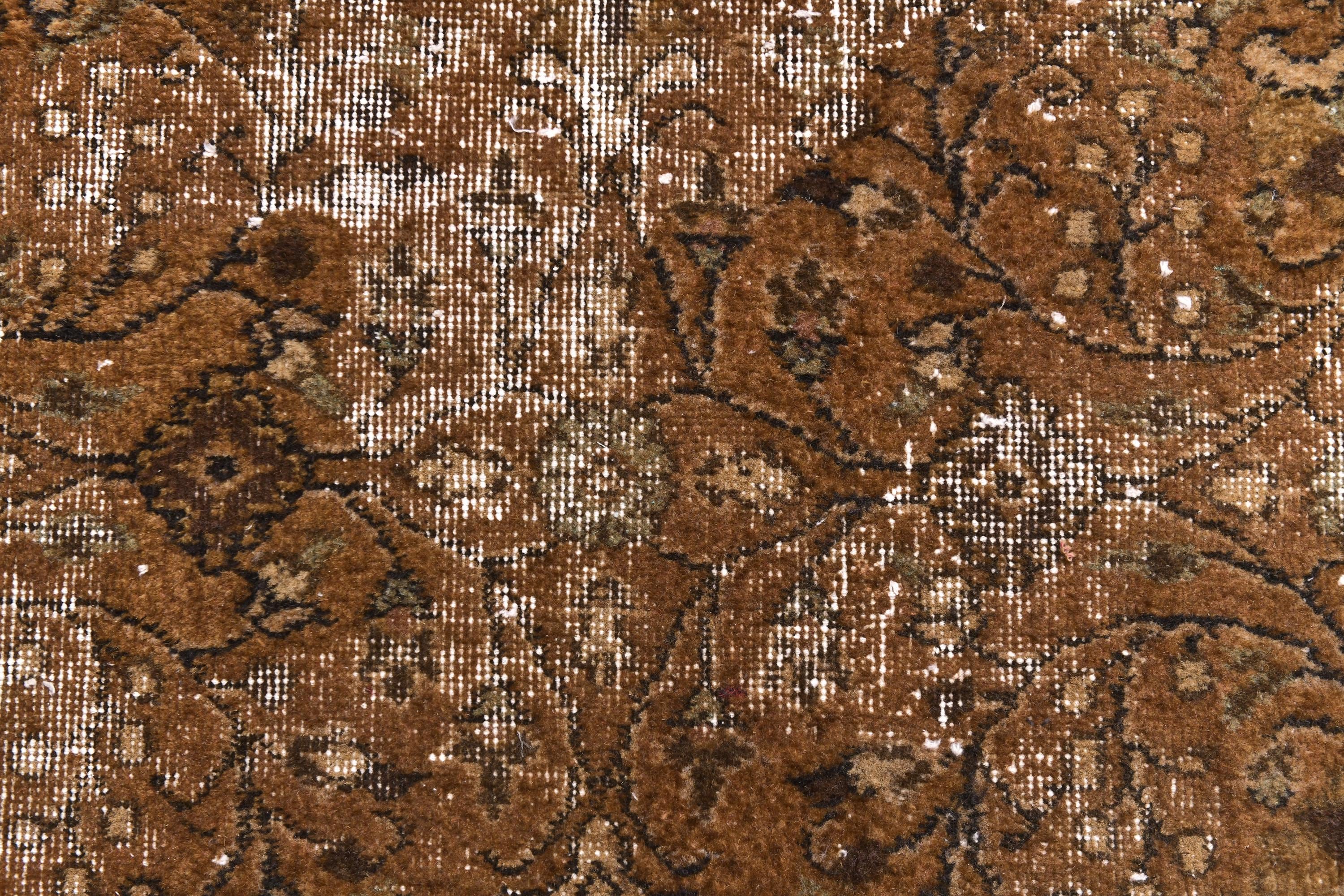 📜📌 Antique distressed Turkish runner rug in warm earthy brown tones with faded floral and botanical patterns, hand-knotted wool, vintage overdyed finish, displayed on hardwood floor.