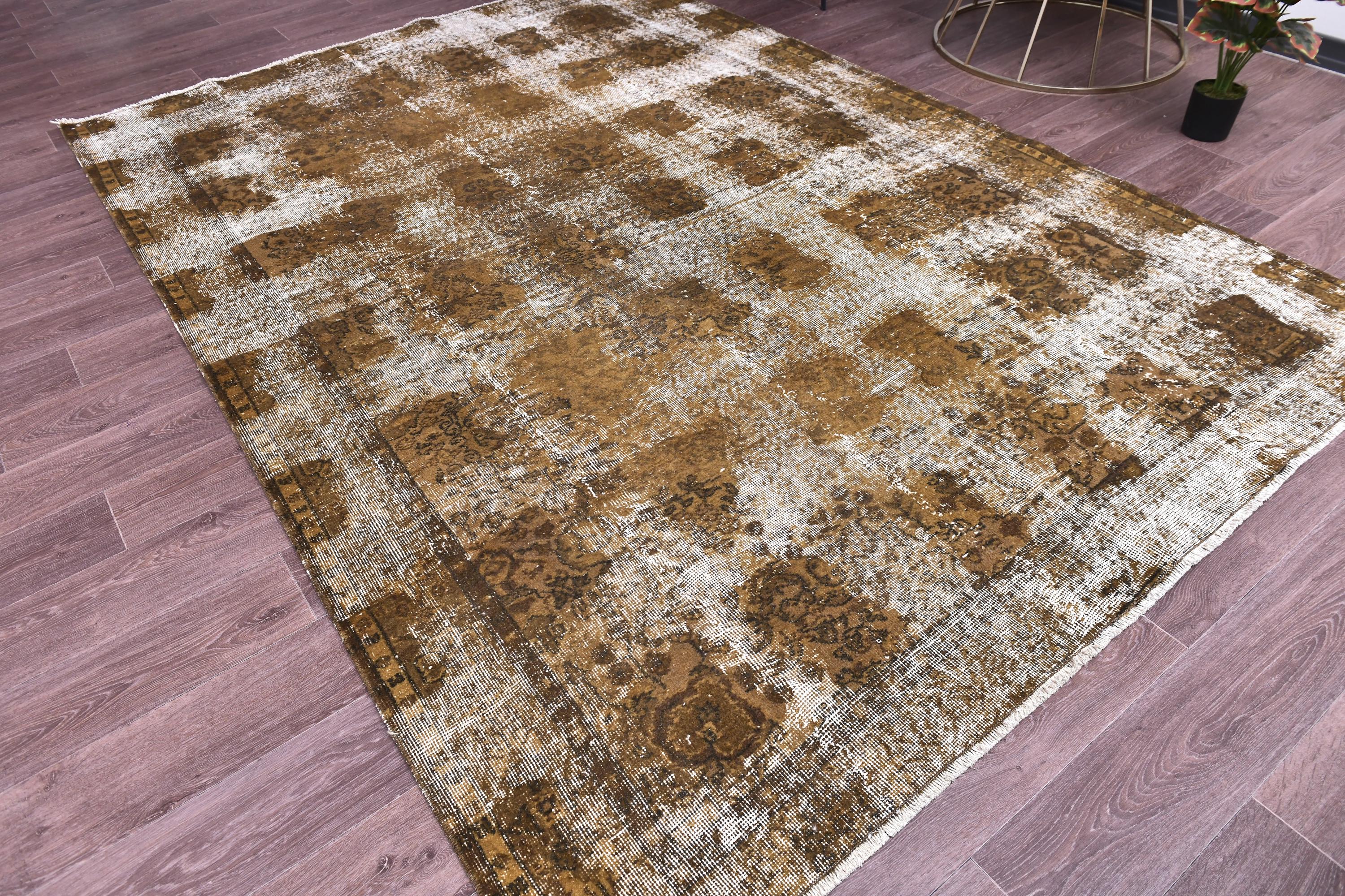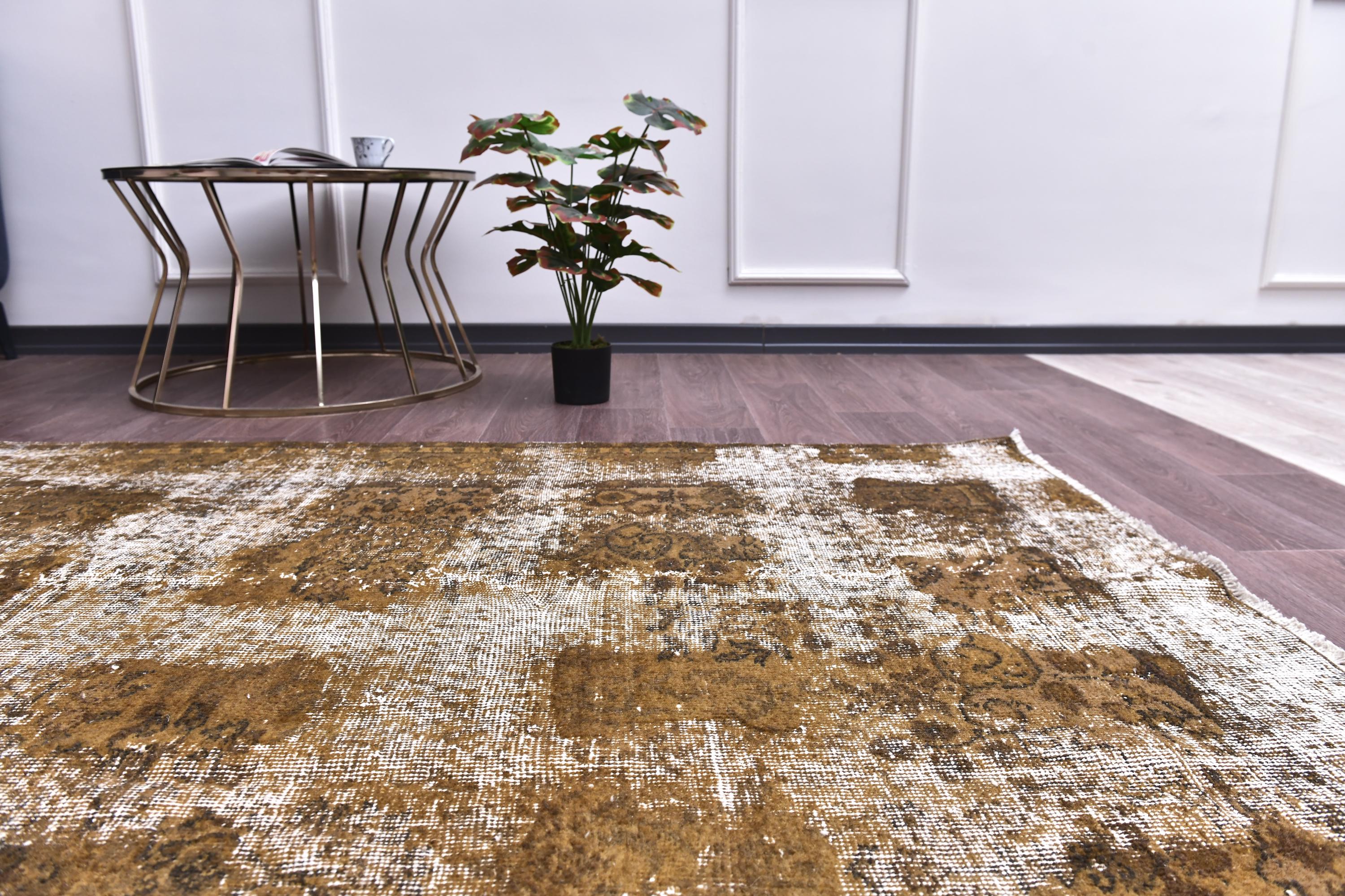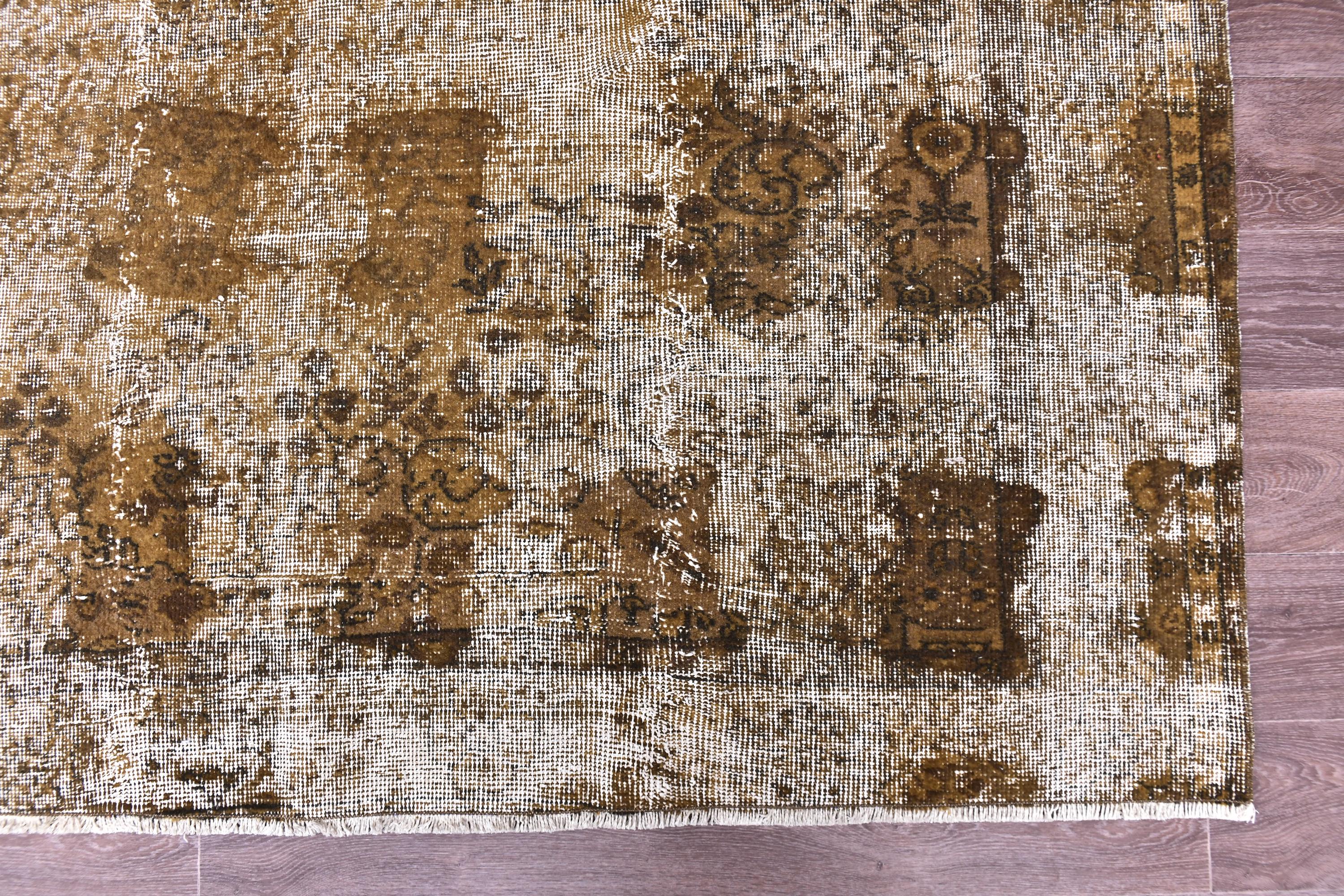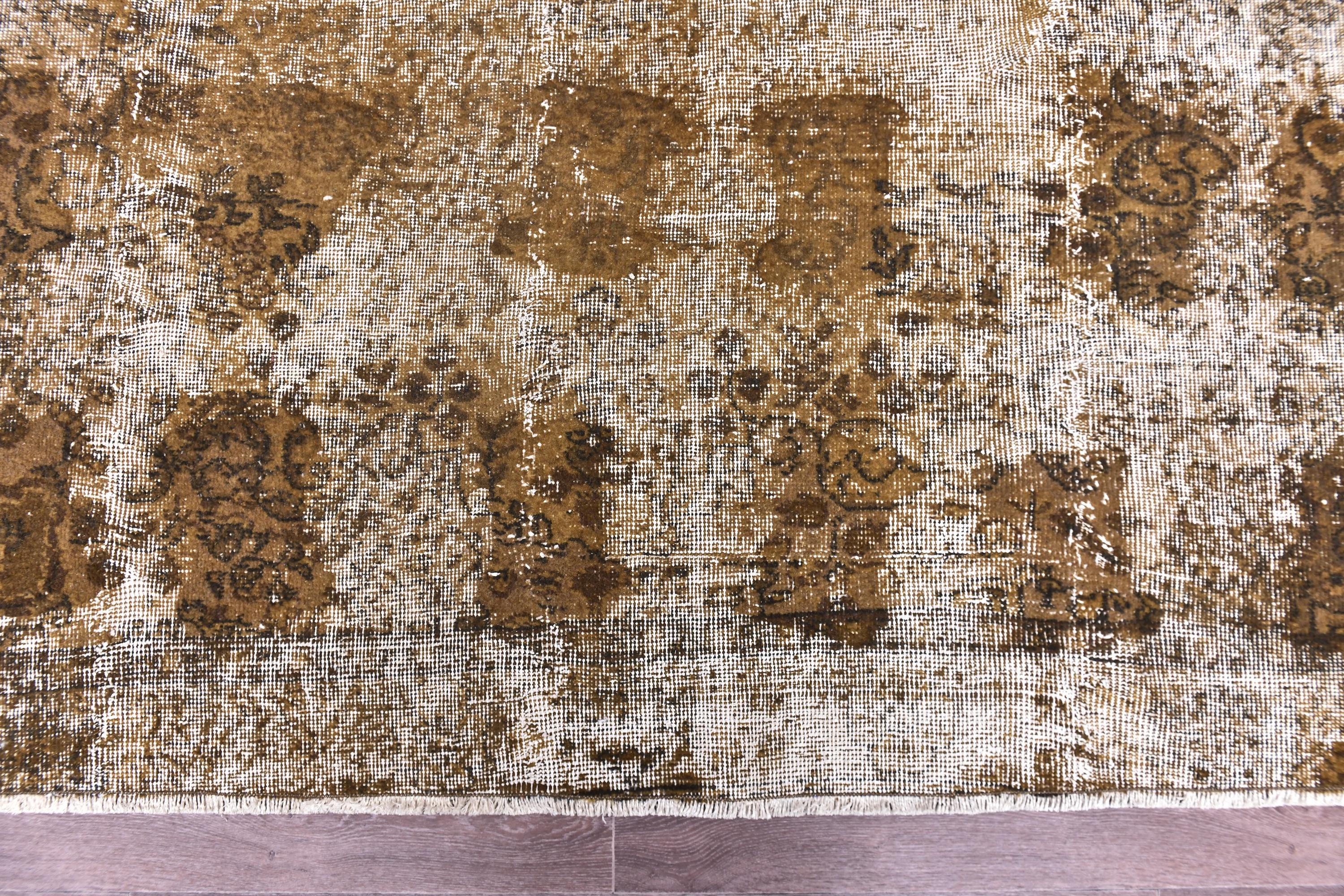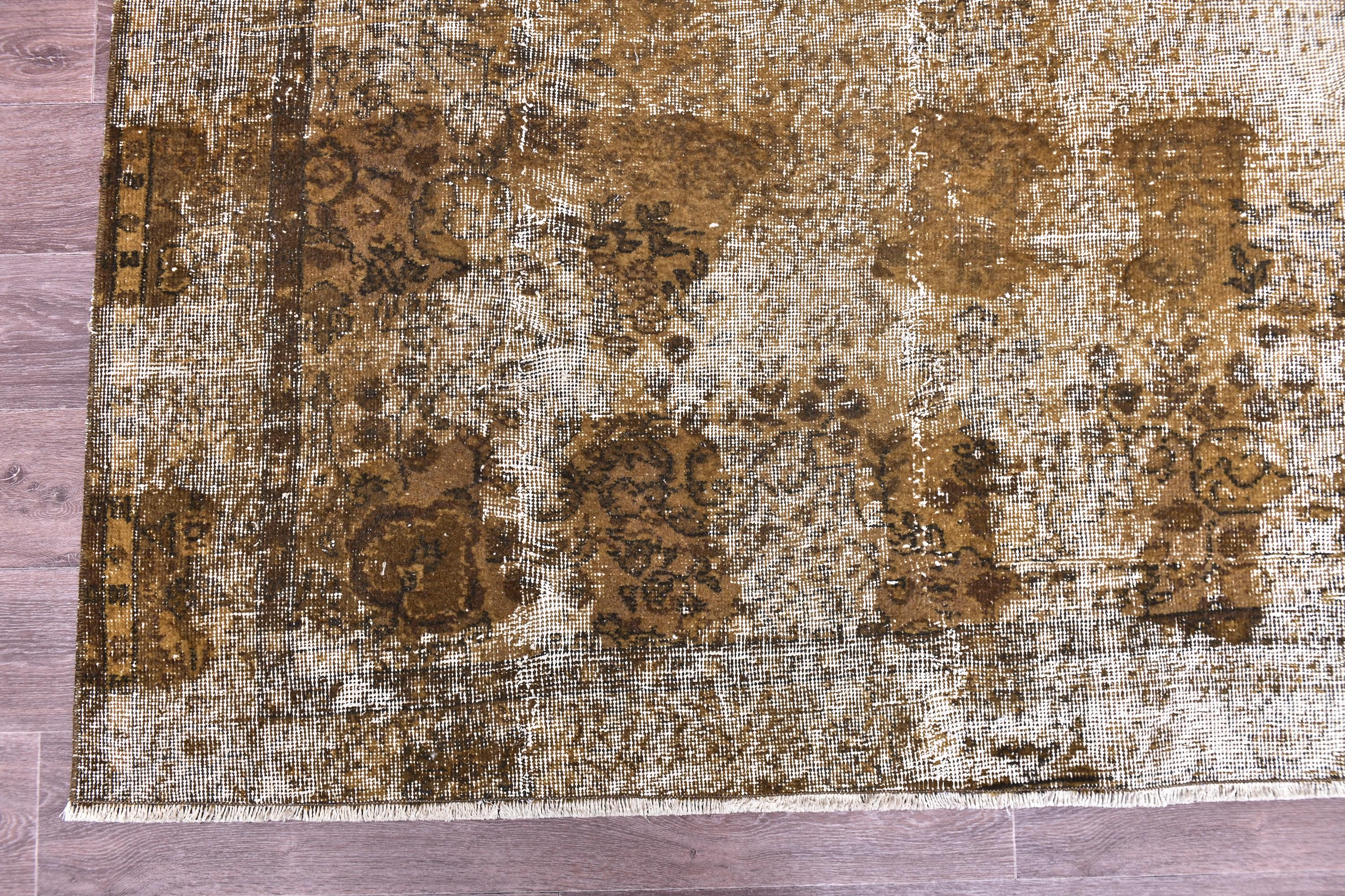 📜📌 Large vintage handknotted Turkish area rug with gold yellow overdyed background and dark green brown floral bouquet allover pattern, heavily distressed worn look