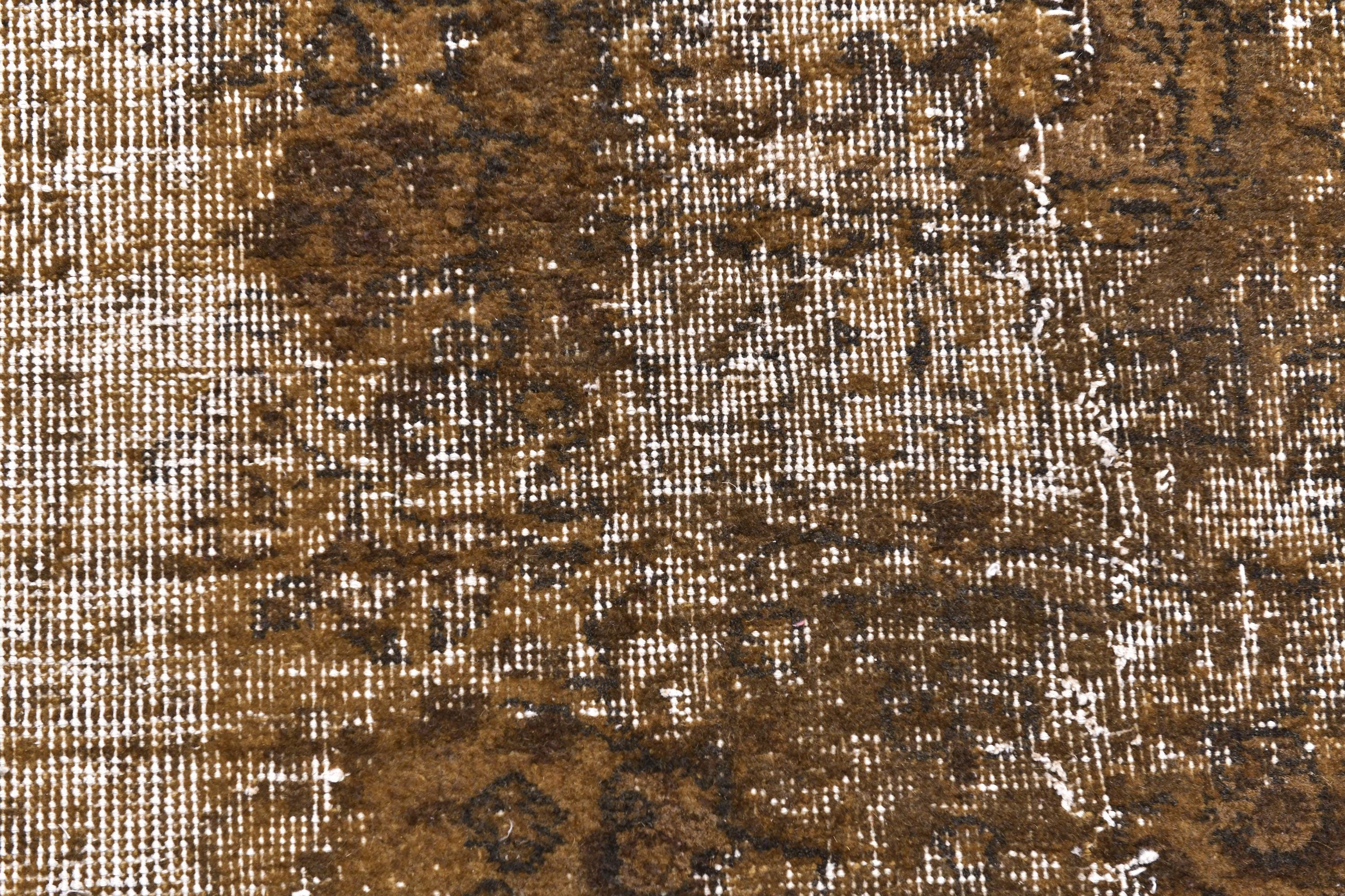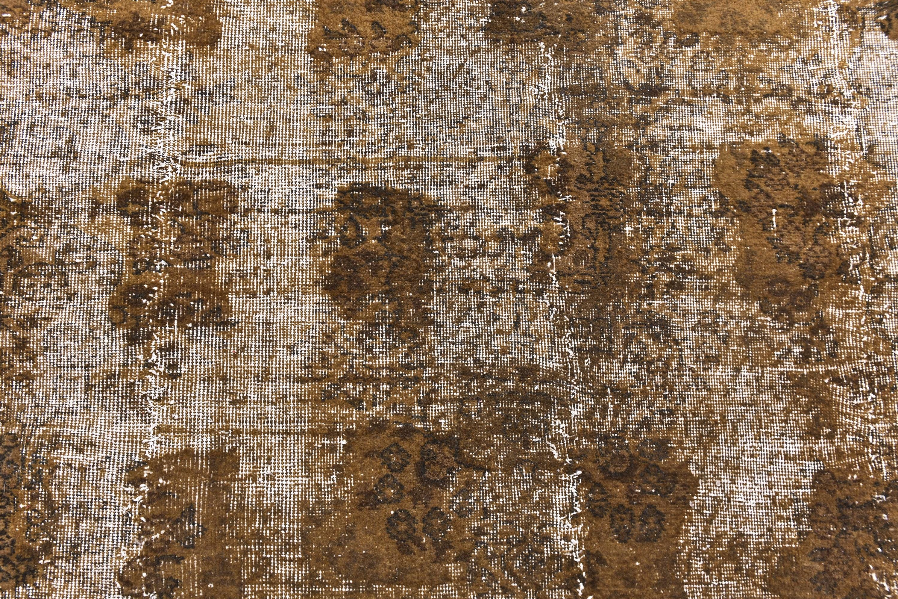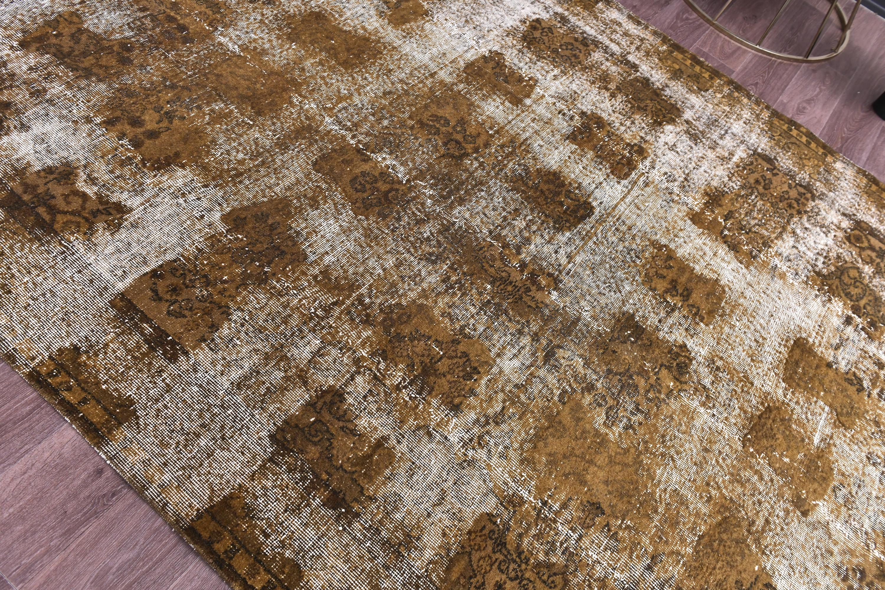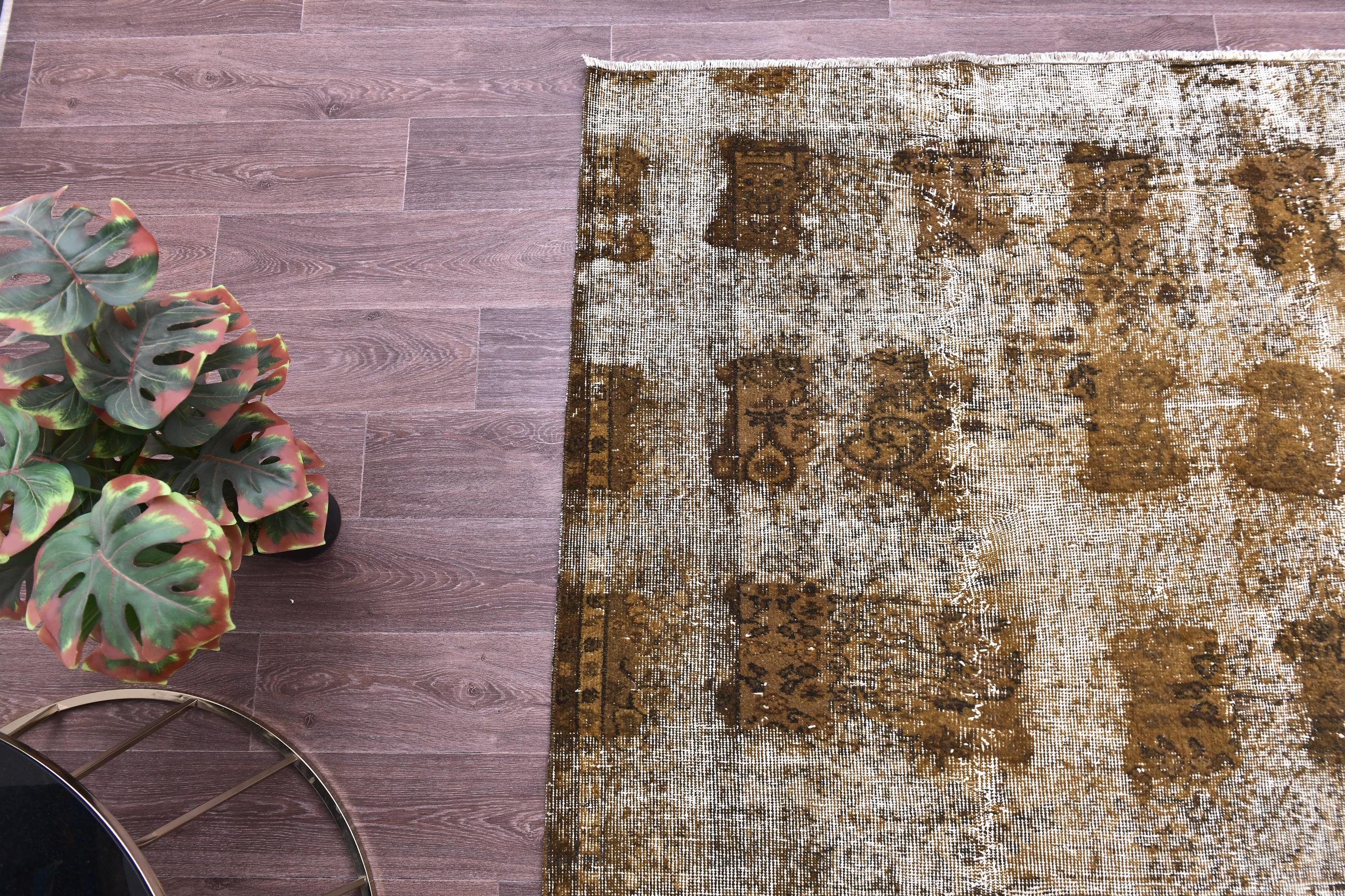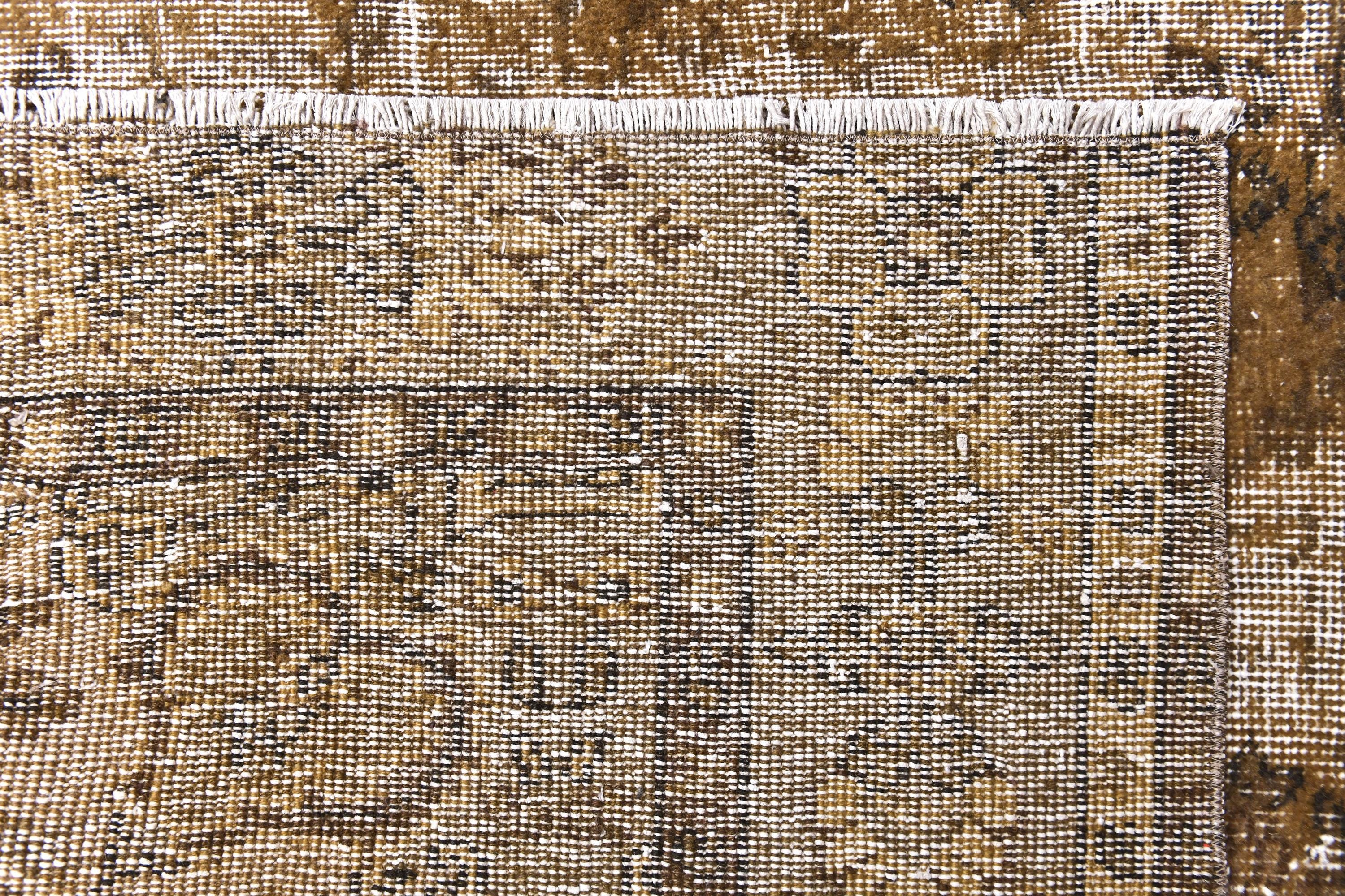 📜📌 Large vintage handknotted Turkish area rug with gold yellow overdyed background and dark green brown floral bouquet allover pattern, heavily distressed worn look