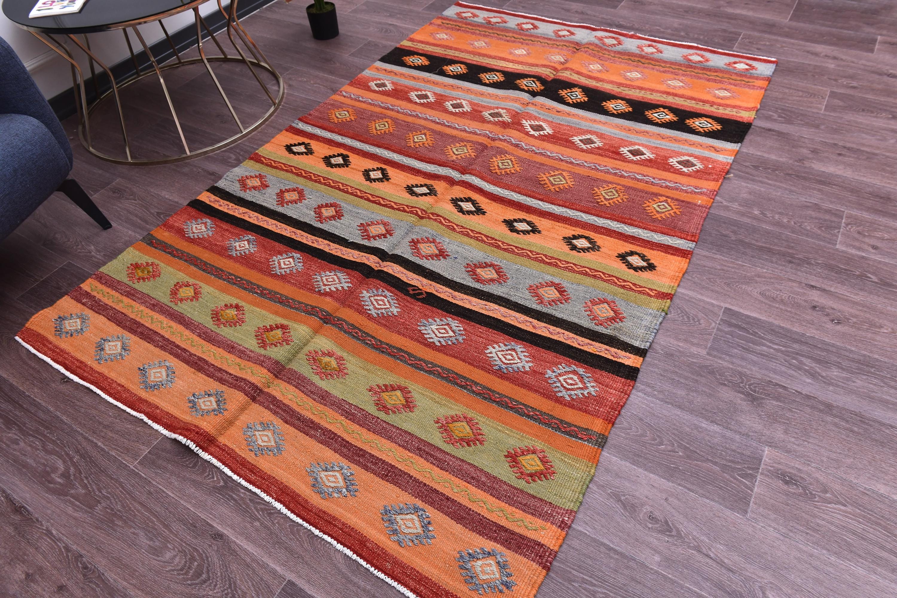 Colorful vintage kilim area rug with repeating geometric motifs and diamond shapes arranged in decorative horizontal bands. Features warm earth tones including terracotta, burnt orange, sage green, and coral red with traditional Turkish weaving technique and white fringe edges.