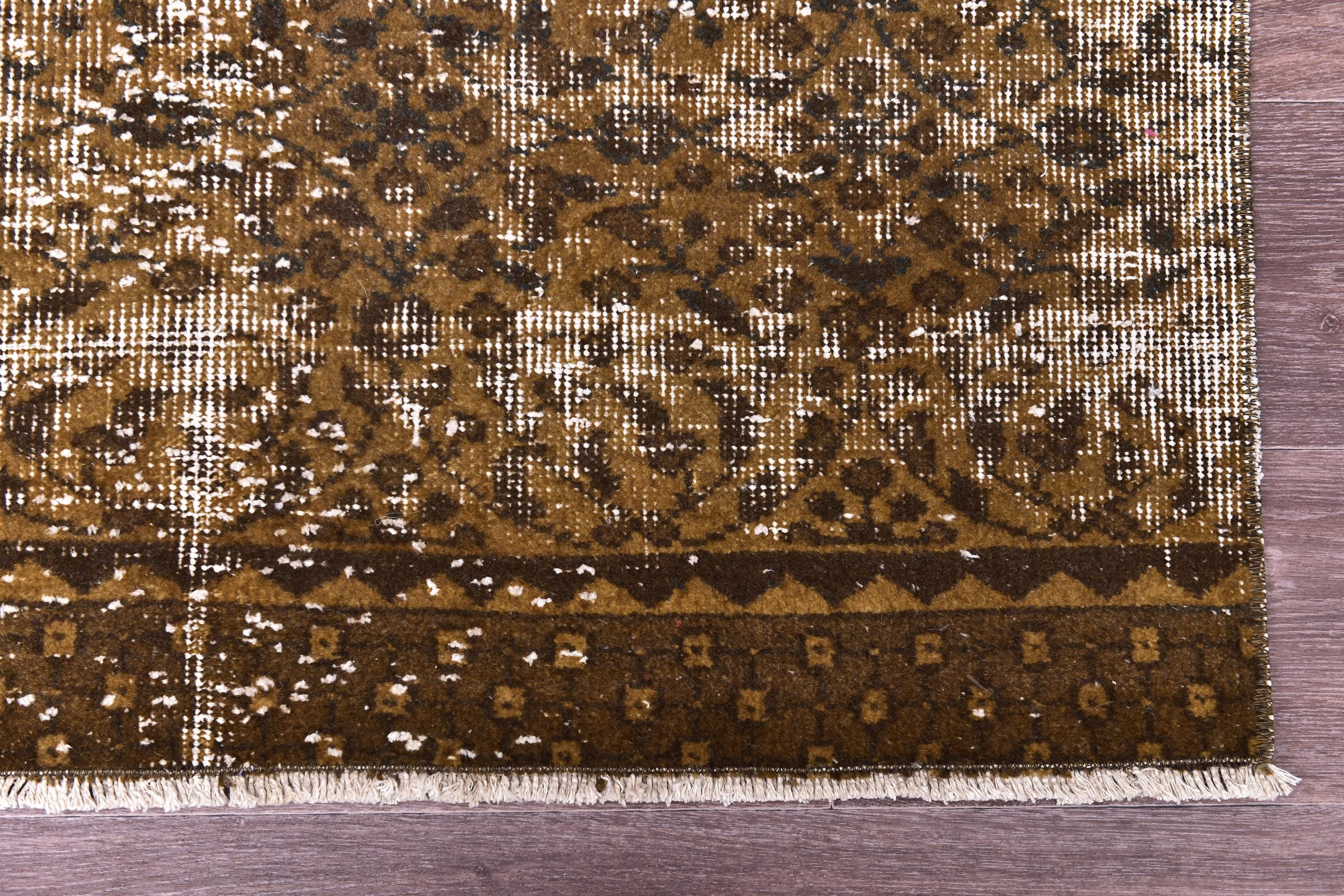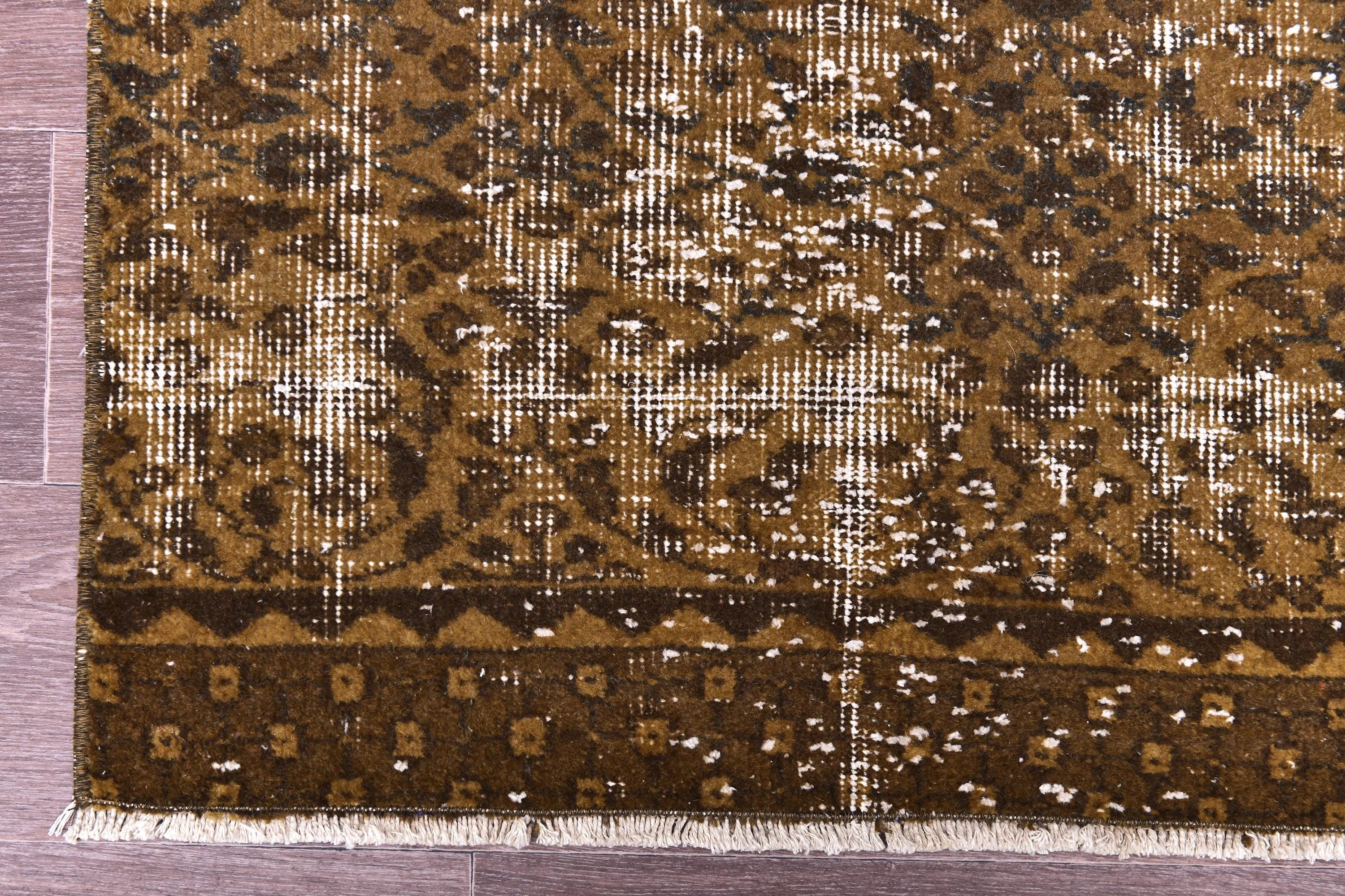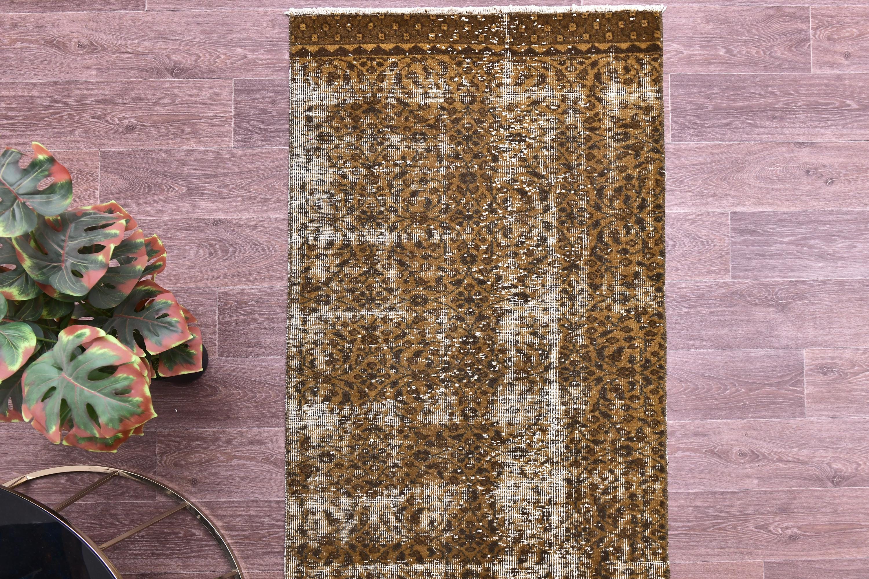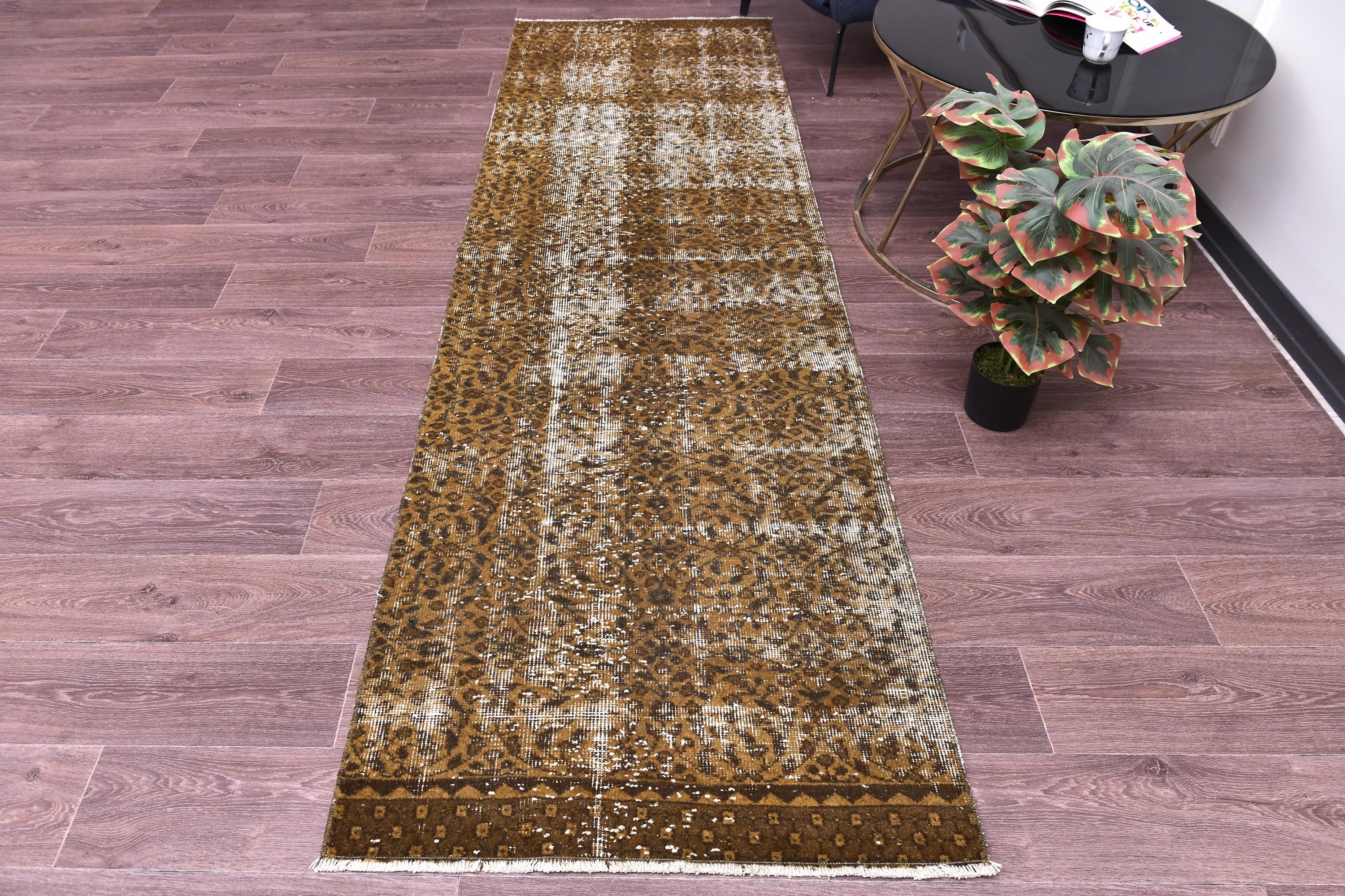 📜📌 Overdyed vintage Turkish runner rug in rich chocolate brown and gray tones with distressed weathered finish. This hand-knotted wool carpet features a faded traditional pattern beneath the overdye treatment, creating depth and texture. The low-profile pile and muted earthy palette make it perfect for modern, industrial, or bohemian hallway and entryway spaces.
