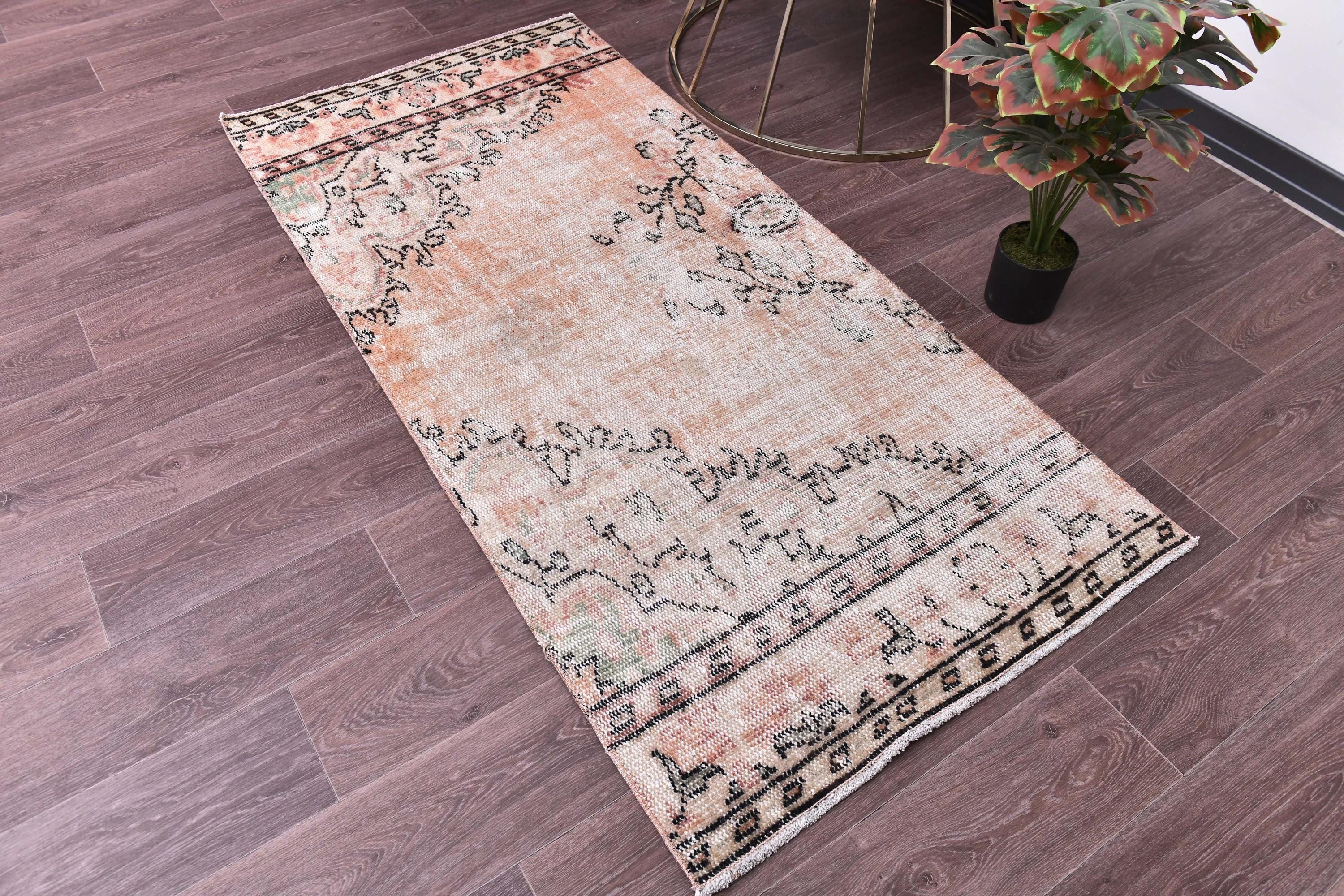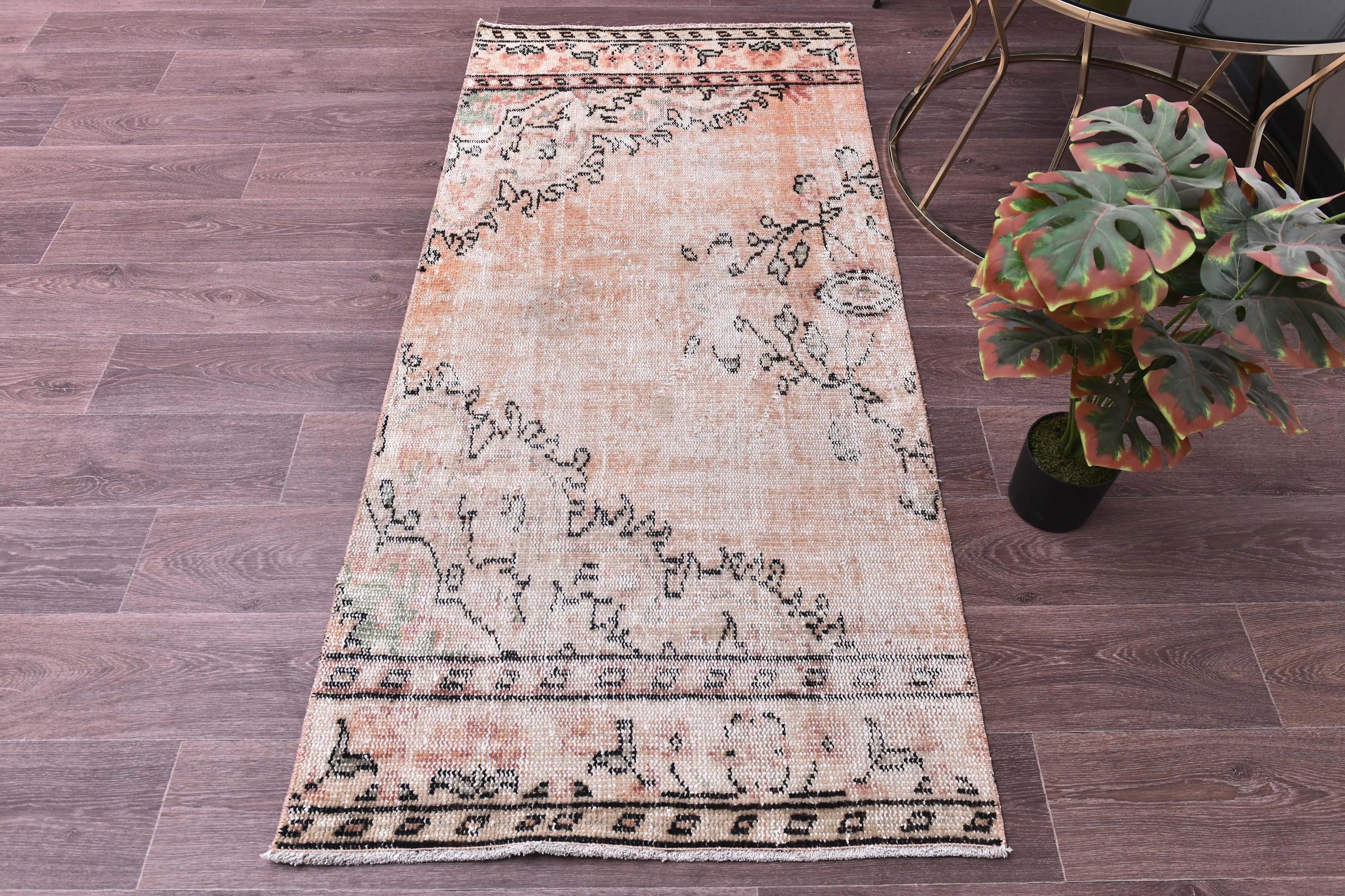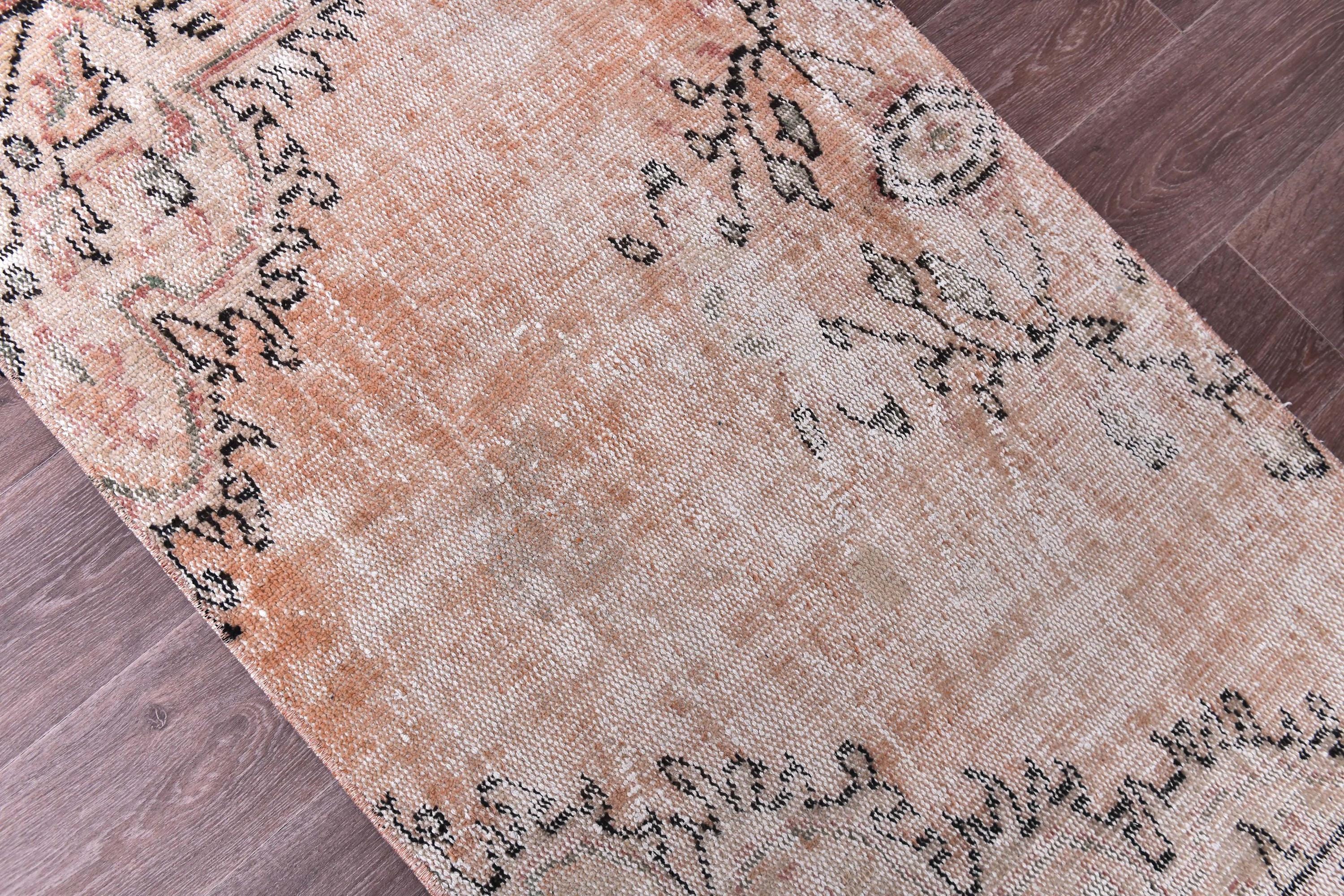📜📌 Handknotted vintage Turkish accent rug with a warm burnt orange and terracotta wool pile, featuring a large central medallion in slate blue-gray tones surrounded by flowing floral vines and botanical motifs in sage green and black. A wide geometric border in dark navy frames the design, giving this small runner a beautifully aged, distressed antique character.