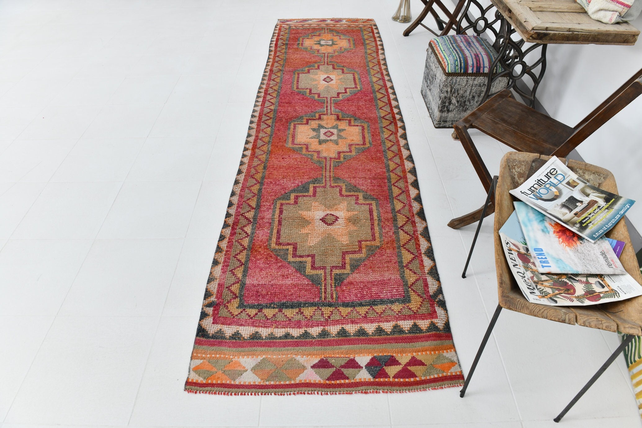 3x11 Rugs, 3x11 Herki Runner, 3x11 PERSIAN HERKI RUNNER Rug, 3x11, Wool Handmade Herki Shades Of Red & Pink Rug For Hallway Entrway Rugs