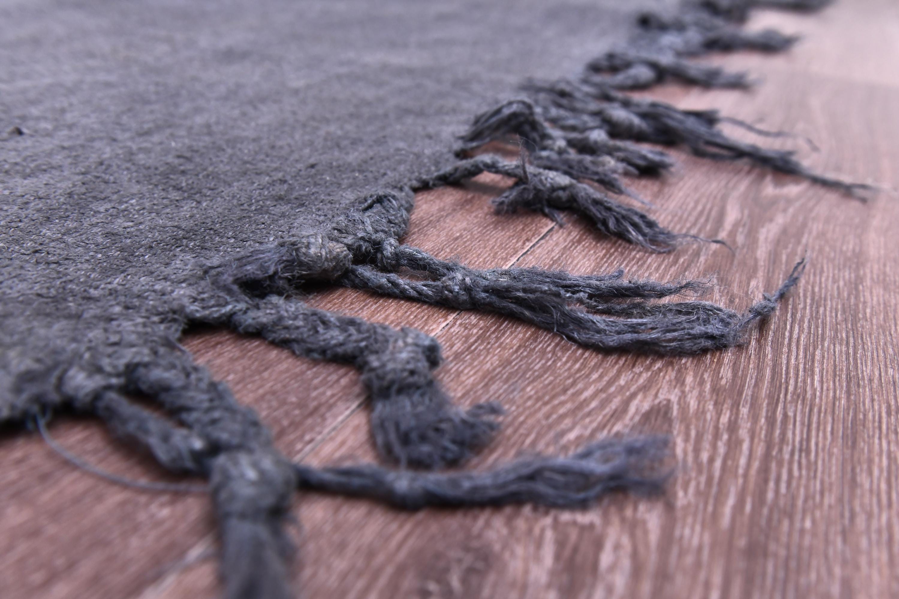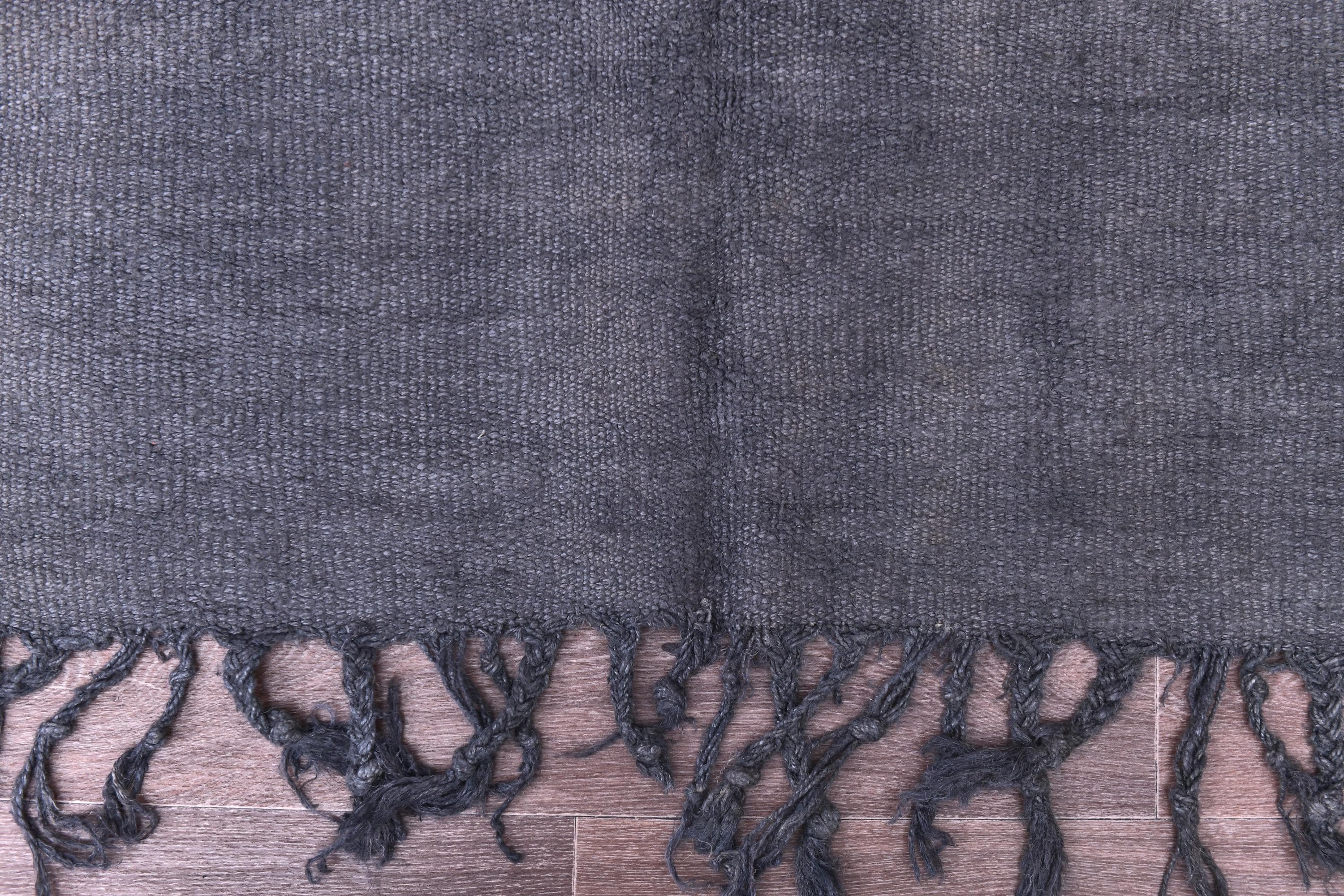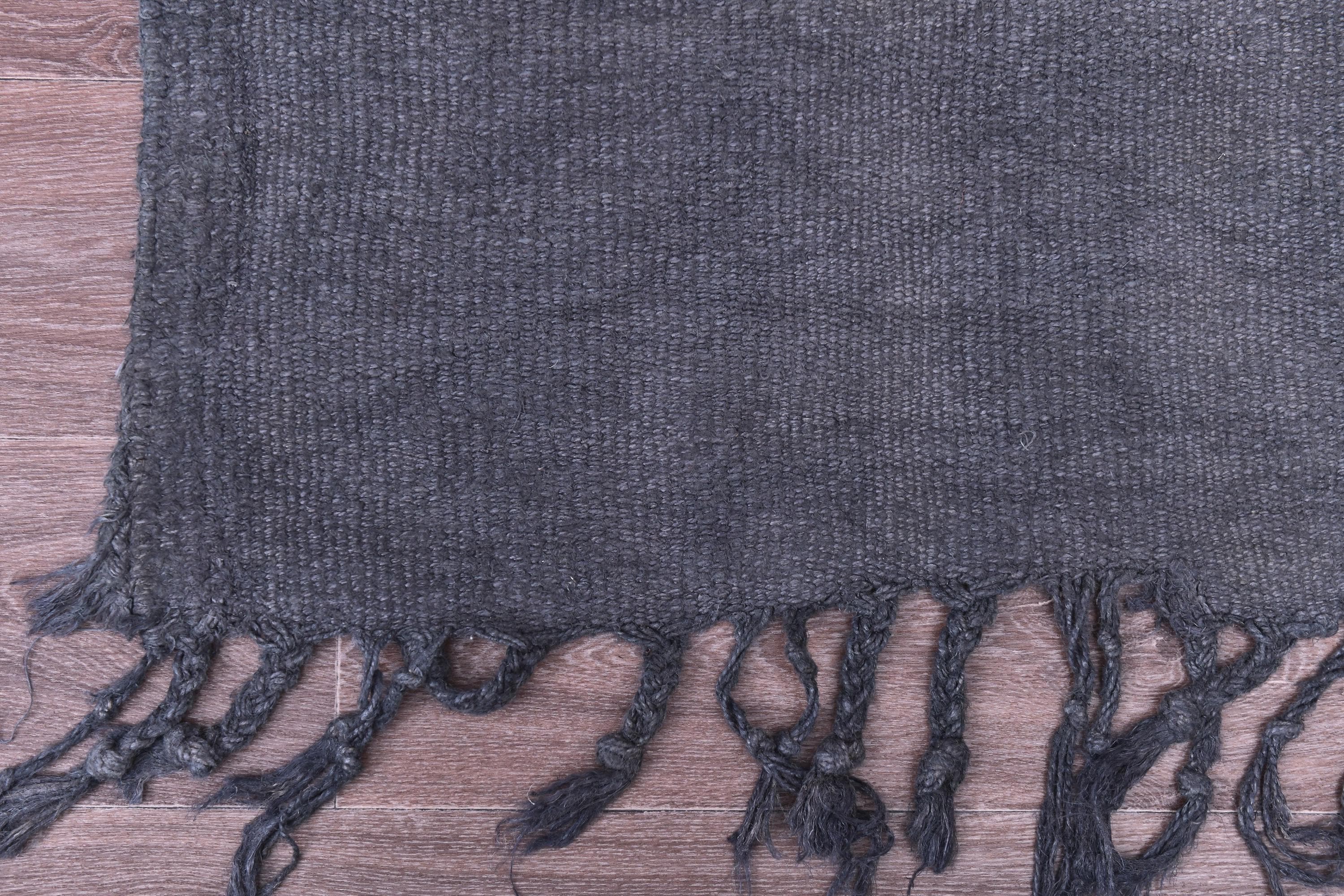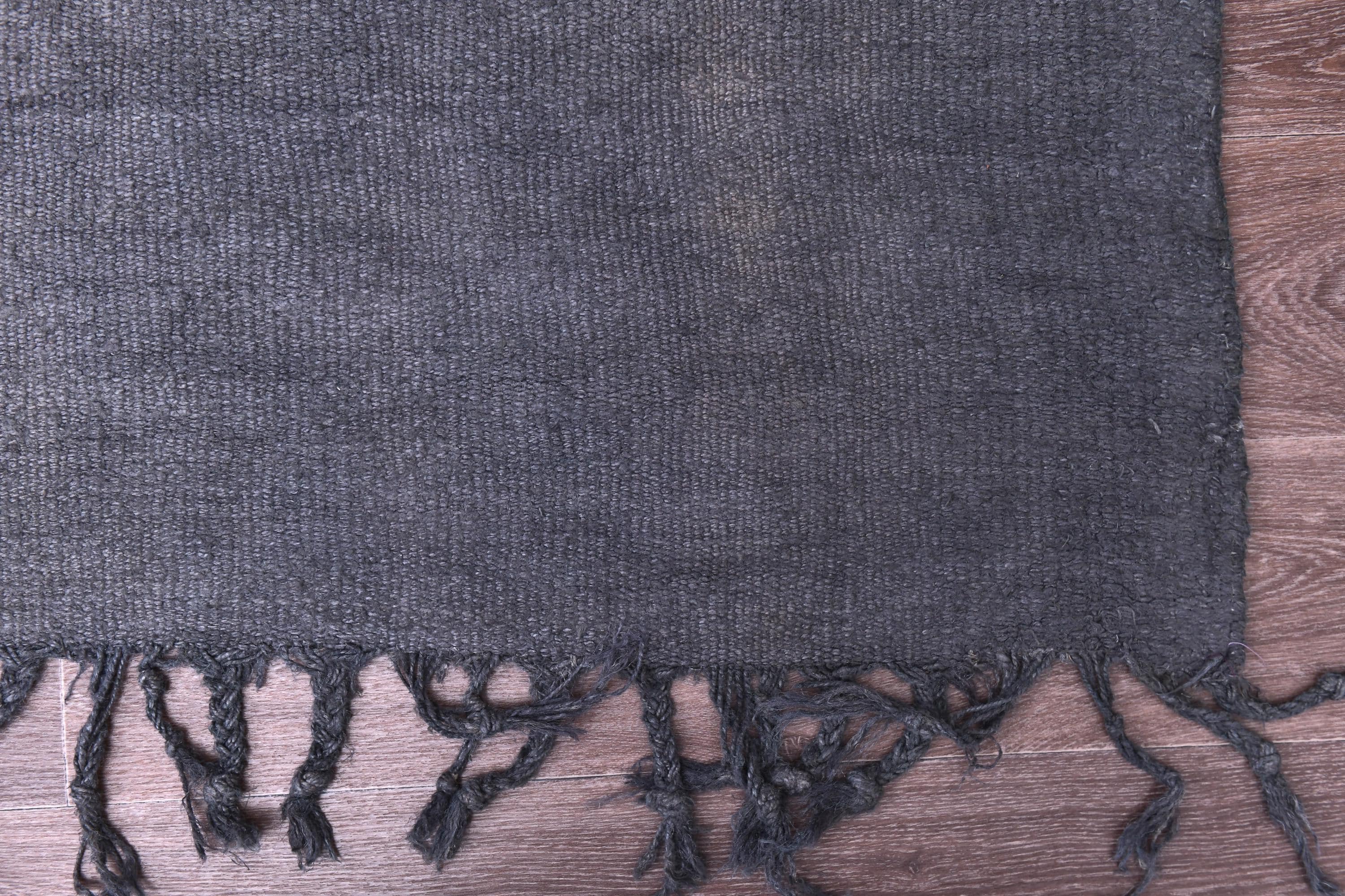 📜📌 Handwoven charcoal gray wool kilim rug with decorative knotted fringes on both ends, flat-weave texture, two-panel construction, displayed on hardwood floor