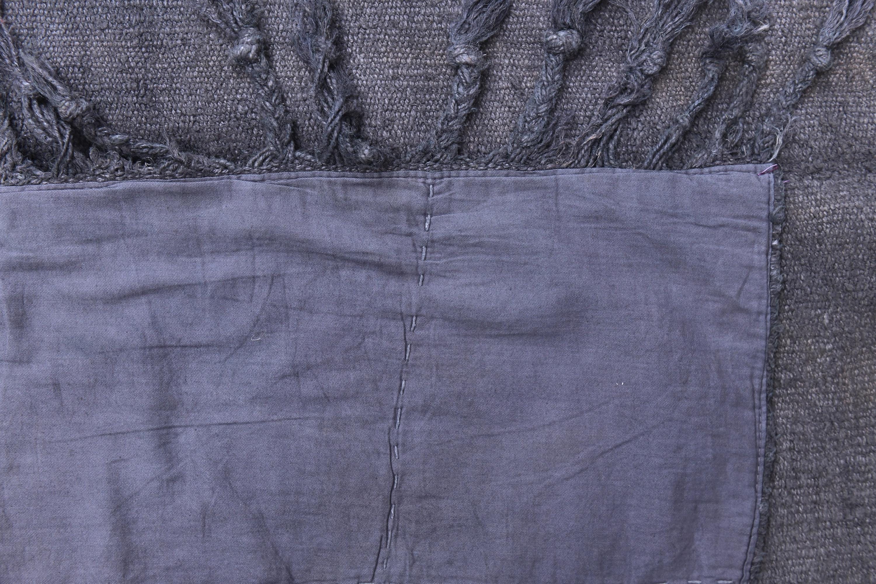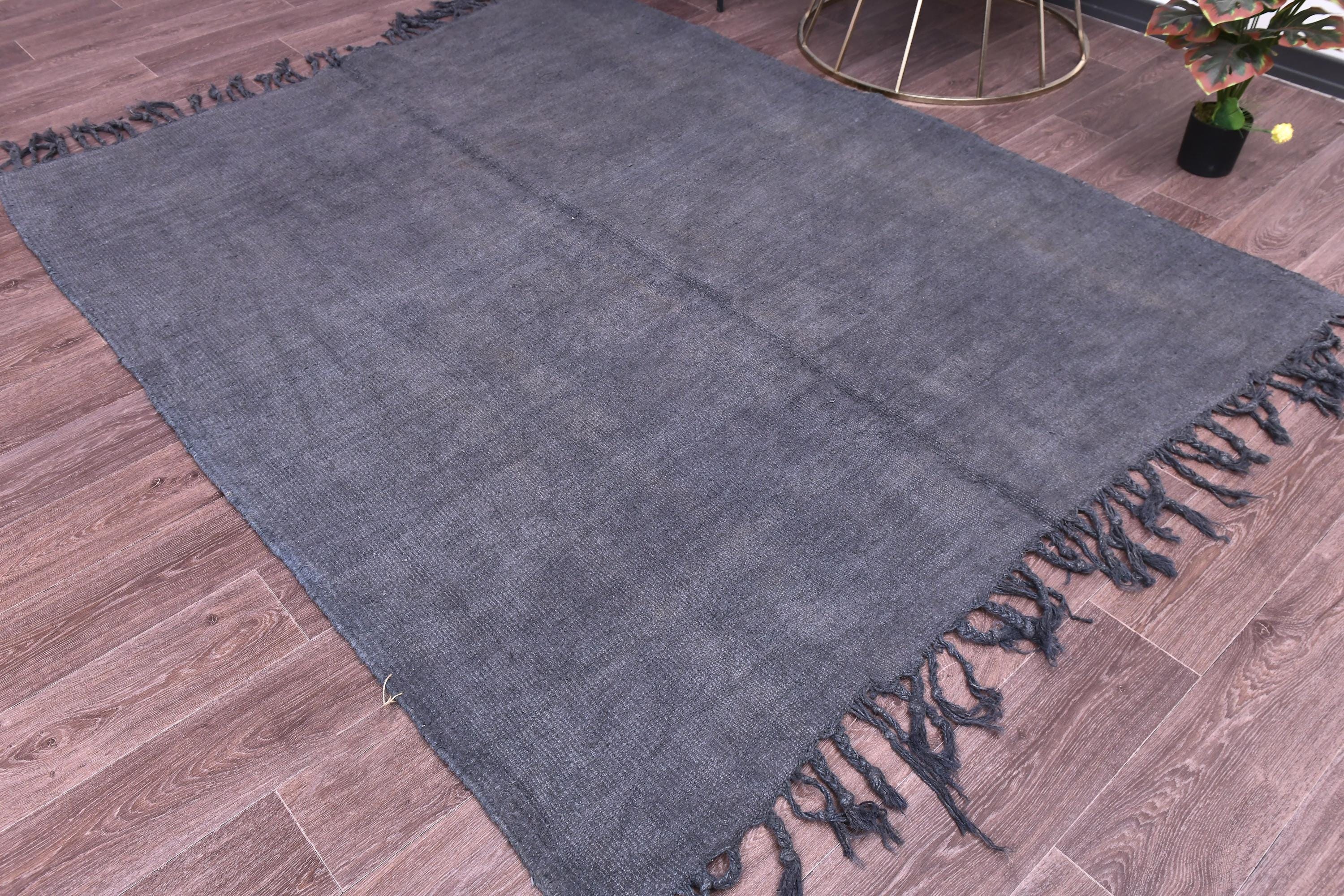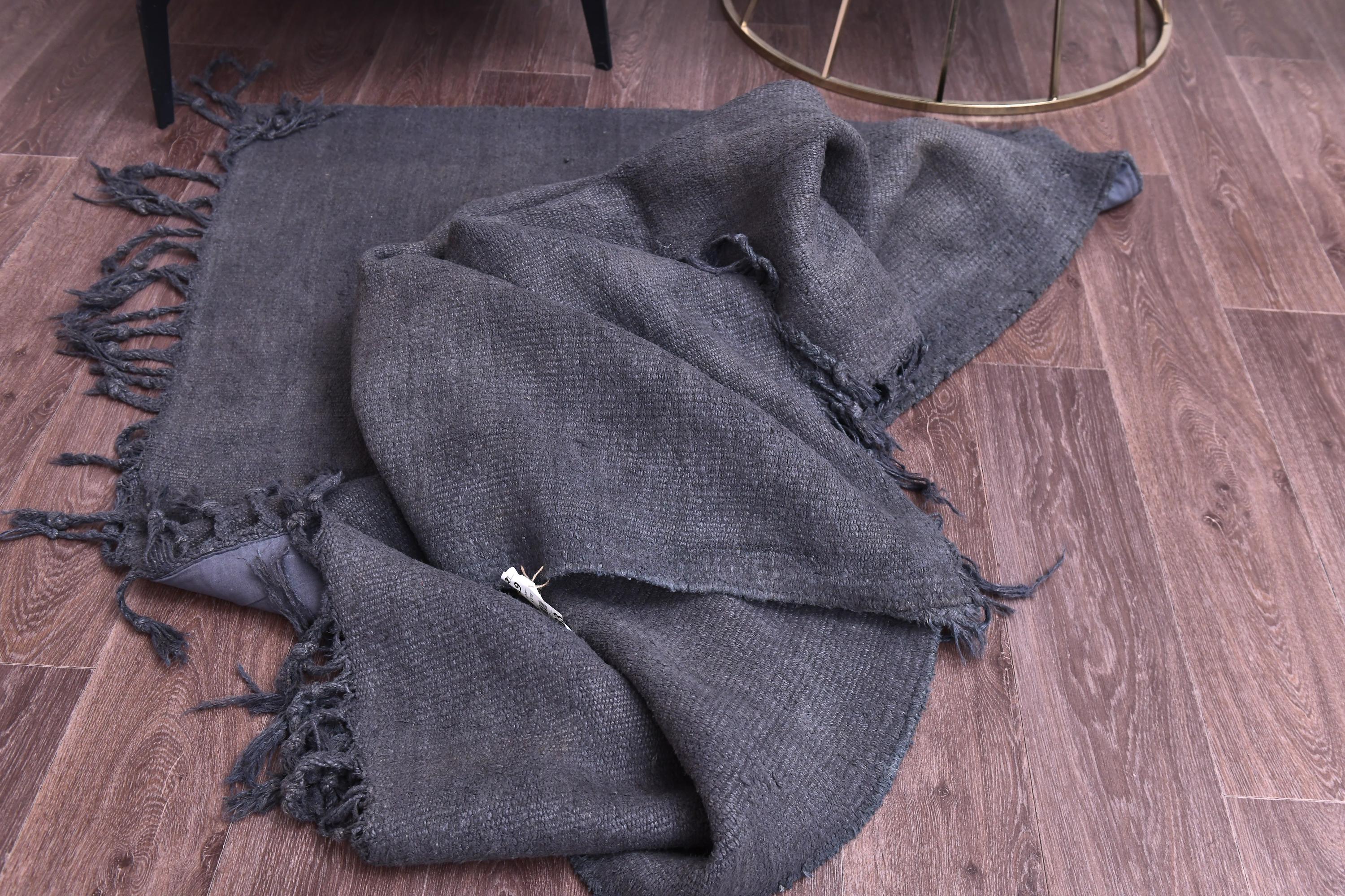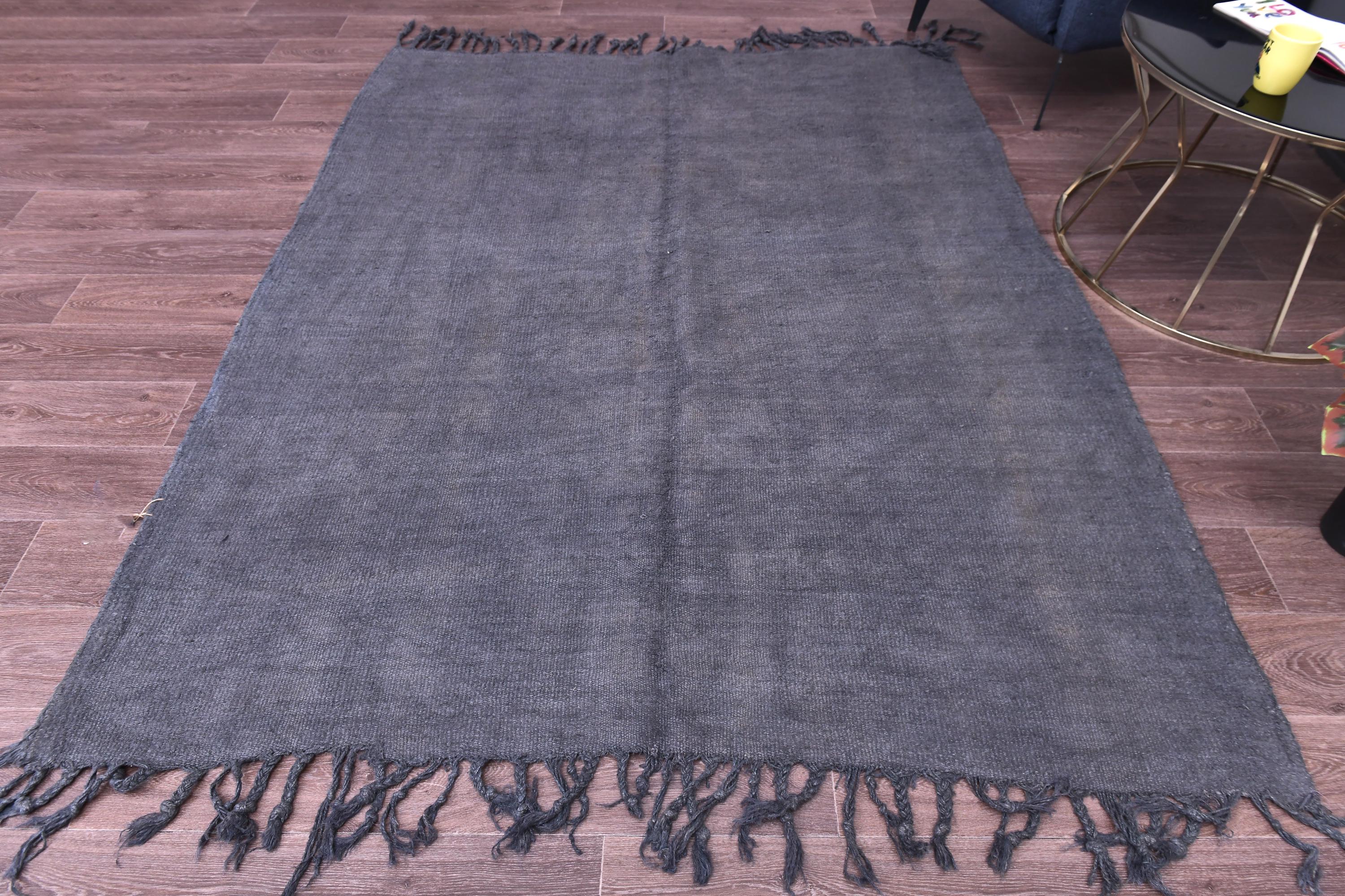 📜📌 Handwoven charcoal gray wool kilim rug with decorative knotted fringes on both ends, flat-weave texture, two-panel construction, displayed on hardwood floor